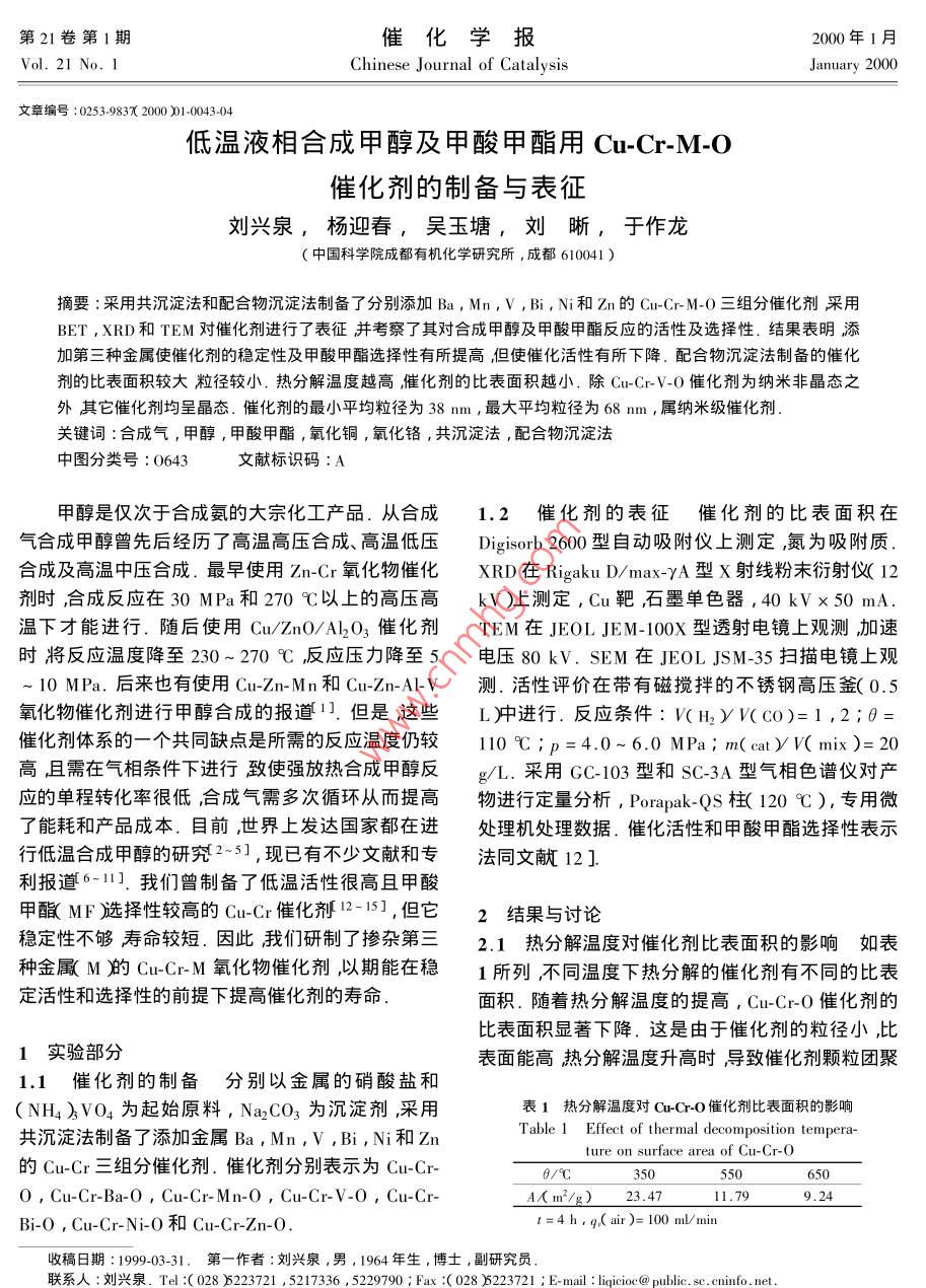 第21卷第1期催化學(xué)報(bào)2000年1月Vol. 21 No. 1Chinese Journal of CatalysisJanuary 2000文章編號(hào):02539837200001-0043-04低溫液相合成甲醇及甲酸甲酯用Cu-Cr-M-O催化劑的制備與表征劉興泉,楊迎春,吳玉塘,劉晰,于作龍(中國科學(xué)院成都有機(jī)化學(xué)研究所,成都610041)摘要:采用共沉淀法和配合物沉淀法制備了分別添加Ba,Mn,V,Bi,Ni和Zmn的 Cu-Cr-M-O三組分催化劑采用BET,ⅹRD和TEM對(duì)催化劑進(jìn)行了表征并考察了其對(duì)合成甲醇及甲酸甲酯反應(yīng)的活性及選擇性.結(jié)果表明添加第三種金屬使催化劑的穩(wěn)定性及甲酸甲酯選擇性有所提高但使催化活性有所下降.配合物沉淀法制備的催化劑的比表面積較大粒徑較小,熱分解溫度越高催化劑的比表面積越小.除Cu-CrV-O催化劑為納米非晶態(tài)之外其它催化劑均呈晶態(tài).催化劑的最小平均粒徑為38mm,最大平均粒徑為68mm,屬納米級(jí)催化劑關(guān)鍵詞:合成氣,甲醇,甲酸甲酯,氧化銅,氧化鉻,共沉淀法,配合物沉淀法中圖分類號(hào):0643文獻(xiàn)標(biāo)識(shí)碼:A甲醇是僅次于合成氨的大宗化工產(chǎn)品.從合成2催化劑的表征催化劑的比表面積在氣合成甲醇曾先后經(jīng)歷了高溫高壓合成、高溫低壓 Divisor2600型自動(dòng)吸附儀上測定,氮為吸附質(zhì)合成及高溫中壓合成.最早使用ZnCr氧化物催化XRD在 Rigaku d/max-yA型X射線粉末衍射儀12劑時(shí)合成反應(yīng)在30MPa和270℃以上的高壓高kV)上測定,Cu靶石墨單色器,40kV×50mA溫下才能進(jìn)行.隨后使用Cu/ZmnO/Al2O3催化劑TEM在 JEOL JEM-100X型透射電鏡上觀測加速時(shí)將反應(yīng)溫度降至230~270℃反應(yīng)壓力降至5電壓80kV.SEM在 JEOL JSM-35掃描電鏡上觀0MPa.后來也有使用Cu-Zn-Mn和Cu-Zn-AV測.活性評(píng)價(jià)在帶有磁攪拌的不銹鋼高壓釜(0.5氧化物催化劑進(jìn)行甲醇合成的報(bào)道1].但是這些L)進(jìn)行.反應(yīng)條件:WH2yWco)=1,2;0=催化劑體系的一個(gè)共同缺點(diǎn)是所需的反應(yīng)溫度仍較10℃;p=4.0~6.0MPa;m(cat)W(mix)=20高且需在氣相條件下進(jìn)行政使強(qiáng)放熱合成甲醇反g/L.采用GC-103型和SC-3A型氣相色譜儀對(duì)產(chǎn)應(yīng)的單程轉(zhuǎn)化率很低合成氣需多次循環(huán)從而提高物進(jìn)行定量分析, Porapak-Qs柱(120℃),專用微了能耗和產(chǎn)品成本.目前,世界上發(fā)達(dá)國家都在進(jìn)處理機(jī)處理數(shù)據(jù).催化活性和甲酸甲酯選擇性表示行低溫合成甲醇的研究25],現(xiàn)已有不少文獻(xiàn)和專法同文獻(xiàn)12]利報(bào)道6-11.我們曾制備了低溫活性很高且甲酸甲酯MF選擇性較高的CuCr催化劑2-151,但它2結(jié)果與討論穩(wěn)定性不夠壽命較短.因此我們研制了摻雜第三2,1熱分解溫度對(duì)催化劑比表面積的影響如表種金屬M(fèi)的 Cu-Cr-M氧化物催化劑以期能在穩(wěn)1所列不同溫度下熱分解的催化劑有不同的比表定活性和選擇性的前提下提高催化劑的壽命面積.隨著熱分解溫度的提高,Cu-CrO催化劑的比表面積顯著下降.這是由于催化劑的粒徑小比實(shí)驗(yàn)部分表面能高熱分解溫度升高時(shí)導(dǎo)致催化劑顆粒團(tuán)聚1.1催化劑的制備分別以金屬的硝酸鹽和(NH4)VO4為起始原料,Na2CO3為沉淀劑采用表1熱分解溫度對(duì) Cu-Cr-O催化劑比表面積的影響共沉淀法制備了添加金屬Ba,Mn,V,Bi,Ni和ZnTable 1 Effect of thermal decomposition tempera的Cu-Cr三組分催化劑.催化劑分別表示為Cu-Crture on surface area of Cu- Cr-O0/℃0, Cu-Cr-Ba-O, Cu- Cr-Mn-0, Cu-Cr-V-O, Cu-Cr-23.479.24Bi-O Cu-Cr-Ni-OFn Cu-Cr-Zn-0I=4 h, g (air )=100 ml/收稿日期:199031.第一作者:劉興泉,男,1964年生,博士,副研究員44催化學(xué)報(bào)第21卷長大因而比表面積下降.但是當(dāng)溫度高于550℃時(shí)比表面積隨溫度升高而下降的幅度減小.這是△ CuRa4口CuO由于在較高溫度下催化劑的粒徑較大表面漸漸趨v Mn. oo CuMnO于穩(wěn)定所致表2是摻雜第三種金屬后催化劑的比表面積由Cu-Cr-V-O的數(shù)據(jù)可知共沉淀法制備的催化劑的比表面積小于配合物法制備的催化劑的比表面積.摻雜第三種金屬后催化劑的比表面積與CuCrO的比表面積接近或略有降低(參見表1).這表明第三種金屬的加入并不會(huì)使催化劑的粒徑明顯增15202530354045505560大.可以認(rèn)為第三種金屬與Cu及Cr處在非常緊20()密的位置體相形成了均勻的體系.但ⅹRD結(jié)果證實(shí)它們?nèi)杂邢嗟姆蛛x表明M的添加并未對(duì)Cu-Cro: AcRoo CuBi, O,O催化劑的結(jié)構(gòu)產(chǎn)生較大的影響表2Cu-(rMO催化劑的比表面積Table 2 Surface area of cu- Cr-M-0Cu-Cr-V-O complex precipitation 59.97coprecipitation23.80(1)Cu-Cr-Mn-0coprecipitationMACu-Cr-Ba-0coprecipitation17.4716.53Cu-Cr-Bi-O14.65圖1CuCr-MO催化劑的ⅹRD譜2.2XRD表征結(jié)果圖1XRD結(jié)果表明,Cu-CrFig 1 XRD patterns of Cu-Cr-M-0 catalystBaO中以晶態(tài) AcRo4和CuO為主,另有微量的(1 Cu-Cr-Ba-0, ( 2)Cu-Cr-Bi-0(3)Cu-Cr-V-0, (4) Cu-Cr-Mn-OCu2O和CnCO2; Cu-Cr-Mn-O中不僅有晶態(tài)CuO,不同.配合物沉淀法制備的CuCr-V-0的粒度非常CuCn2O4及Mn2O3,而且有微量的MnCr2O4和小近乎呈非晶態(tài),且分布比較均勻而共沉淀法制CuMn2O4,配合物法制備的Cu-Cr-V-0呈非晶態(tài)納備的 Cu-Cr-\-0呈球形顆粒,分布均勻但粒徑較米顆粒在2θ=15°~70°范圍內(nèi)無明顯的衍射峰.大平均粒徑約65mm.總之這些催化劑都屬納米Cu-CrBi-O呈良好的晶態(tài)結(jié)構(gòu)以CuO,CuBi2O4和粉體,因而其活性和穩(wěn)定性都有所變化和提高.Bi2O