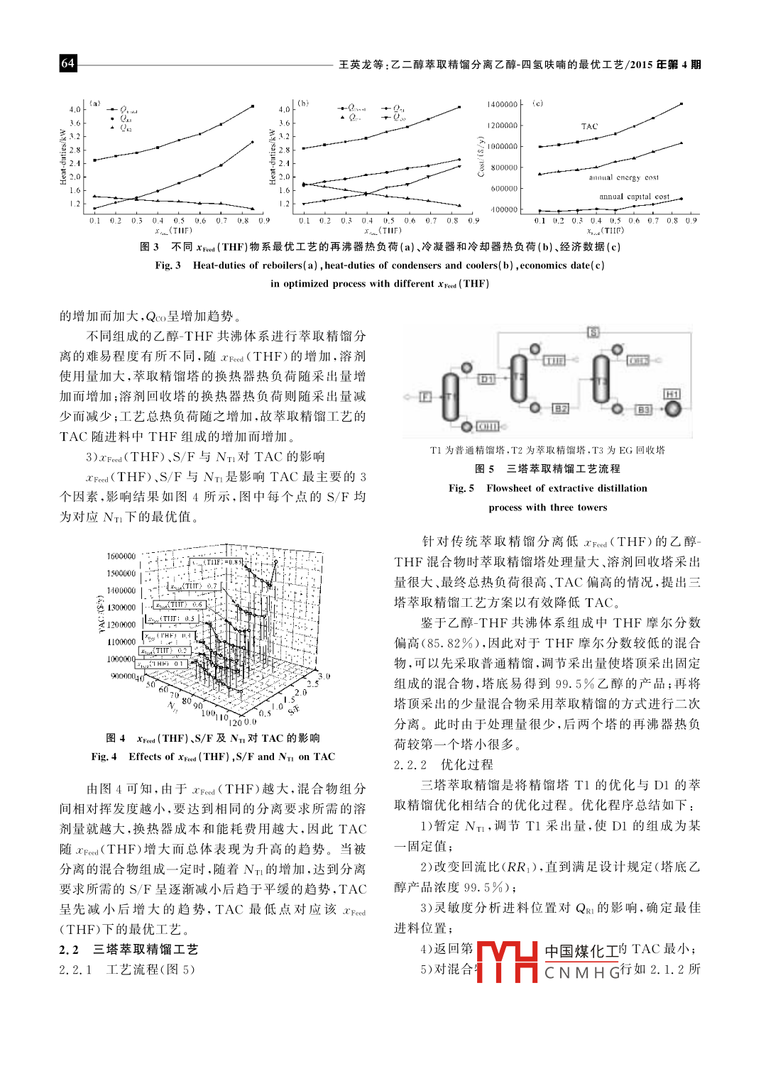 62開發(fā)應(yīng)用www.hxyswgo.cm2015,o.32N.04化學(xué)與生物工程doi:10.3969/j.isn.1672-5425.2015.04.016乙二醇萃取精餾分離乙醇-四氫呋喃的最優(yōu)工藝王英龍,張青,馬羽紅,李鑫,劉興振(青島科技大學(xué)化工學(xué)院,山東青島266042)摘要:對乙二醇萃取精餾分離醇-四氯呋喃共沸體系的工芑基于年度總費(fèi)用最小進(jìn)行了優(yōu)化設(shè)計(jì)。采用設(shè)計(jì)規(guī)定與序貫迭代優(yōu)化程序考察了雙塔萃取精餾工芑與三塔萃取精餾工芑的經(jīng)濟(jì)性。結(jié)果表明,最優(yōu)方案與原料組成有關(guān)當(dāng)四氫呋喃摩爾分欻小于37%時(shí),采用三塔萃取精餾工藝最優(yōu);當(dāng)四氫呋喃摩爾分?jǐn)?shù)大于37%時(shí),采用雙塔萃取精餾工藝最優(yōu)。關(guān)鍵詞:乙醇-四氫呋喃;萃取精餾;優(yōu)化設(shè)計(jì);年度總貲用中圖分類號:TQ028.13文獻(xiàn)標(biāo)識碼:A文章編號:1672-5425(2015)04-0062-05乙醇和四氫呋喃(THF)是化工和制藥行業(yè)中重要的溶劑,一些制藥企業(yè)在生產(chǎn)過程中產(chǎn)生含乙醇0.8THF的廢液,從環(huán)保和經(jīng)濟(jì)的角度出發(fā),都要求對廢20.6液進(jìn)行回收利用。由于二者的混合物形成最低共沸物,普通精餾難以高效分離。常用的共沸物分離方法包括萃取精餾、變壓精餾、共沸精餾等,萃取精餾具有0可控性較好的優(yōu)勢,多用于乙醇-THF共沸體系的分離3。近年來,國內(nèi)外出現(xiàn)了三塔萃取精餾分離共沸id molar fraction x of THF物的研究3,指出了三塔萃取精餾工藝操作能耗低的圖11atm下的乙醇IHF共沸體系yx曲線優(yōu)勢,而采用三塔萃取精餾工藝分離乙醇-THF共沸Fig. 1 y-x Curve for ethanol-THF azeotropic system at 1 atm體系的研究未見報(bào)道。鑒于此,作者基于傳統(tǒng)雙塔萃取精餾工藝,研究了(THF摩爾分?jǐn)?shù)),利用該物性方法所得共沸數(shù)據(jù)與文乙醇-THF共沸體系的三塔萃取精餾工藝。在 Aspen獻(xiàn)值較吻合。Plus平臺上,以年度總費(fèi)用( total annual cost,TAC利用 Aspen Plus中的 Flash2模塊考察乙二醇最小化為目標(biāo),對乙二醇萃取精餾分離乙醇THF共(EG)、二甲基亞砜(DMSO)、二甲基甲酰胺(DMF)及沸體系的工藝進(jìn)行了優(yōu)化得到乙醇THF共沸體系N甲基吡咯烷酮(NMP)對乙醇THF共沸體系氣液不同原料組成時(shí)雙塔或三塔萃取精餾工藝的最優(yōu)方平衡的影響。結(jié)果發(fā)現(xiàn),4種溶劑均能有效破除乙醇案THF的共沸現(xiàn)象,它們對乙醇-THF氣液平衡的影響大小順序?yàn)镈MF>EG>DMSO>NMP。雖然DMF1萃取精餾工藝使得乙醇-THF共沸體系相對揮發(fā)度提高效果最明1.1萃取劑的確定顯,選擇性最高,但平衡的氣相中易出現(xiàn)含量相對較多基于 UNIQUAC物性方法考察乙醇THF共沸的DMF組分,而不利于萃取精餾的實(shí)施。因此,選擇體系的熱力學(xué)性質(zhì)。1atm下的乙醇THF共沸體系EG作為分離乙醇THF共沸體系的萃取劑的yx曲線如圖1所示1.2費(fèi)用模型由圖1可知,在1atm下,共沸體系組成為85.82%按 Turton等10的計(jì)算方法,以TAC最小化作為基金項(xiàng)目:國家自然科學(xué)基金資助項(xiàng)目(21306093),山東省高等學(xué)??萍加?jì)劃項(xiàng)目(J3LD16)收稿日期:2014-12-16TH中國煤化工作者簡介:王英龍(1978—),男,山東泰安人,博士,副教授,研究方向:化工過程系統(tǒng)CNMHG王英龍等:乙二醇萃取精餾分離乙醉四氫呋喃的最優(yōu)工藝/2015年驟4用一目標(biāo)函數(shù)確定最優(yōu)設(shè)計(jì)。TAC為年設(shè)備投資和操作成本的總和,設(shè)備投資主要是精餾系統(tǒng)的主設(shè)備,包括塔和換熱器;操作成本包括冷凝器與再沸器操作使用的冷卻水和蒸汽,公用工程價(jià)格由成本估計(jì)軟件CAPCOST獲得。與汽耗成本相比,電力成本可以忽略。操作時(shí)間按每年8000h計(jì)。表1列出了設(shè)備及能耗的相關(guān)計(jì)算公式以及由 CAPCOST獲取的公用T1為萃取精餾塔,T2為EG回收塔,D1為產(chǎn)品THF,D2為產(chǎn)品乙醇,Bl為乙醇EG混合物,B2為回收EG,H1為冷卻器工程價(jià)格。圖2雙塔萃取精餾工藝流程費(fèi)用模型Fig. 2 Flowsheet of extractive distillationTab. 1Model of costprocess with two towers分項(xiàng)成本計(jì)算基礎(chǔ)要進(jìn)行T1塔的優(yōu)化。優(yōu)化程序總結(jié)如下精餾塔成本塔徑(m):ID= Aspen tray sizing1)暫定萃取精餾塔的總理論塔板數(shù)(Nn),靈敏=17640(ID)1.06(L)0.802塔高(m):L=1.2×0.61X(NT-2)度分析確定進(jìn)料位置(NF);傳熱系數(shù)(Kc)=0.852kW·K-1·m2)暫定溶劑/進(jìn)料比(S/F);傳熱溫差(△Tc)=對數(shù)平均溫差冷凝器成本=7296(Ac)0.653)改變回流比(RR1)直至達(dá)到產(chǎn)品設(shè)計(jì)規(guī)定4)返回第2步,改變S的值直至Qm最小KC×△Tc5)返回第1步,改變Nn直至TAC最小傳熱系數(shù)(KR)=0.568kW·K再沸器成本=7296(AR)0傳熱溫差(△TR)=蒸汽溫度一塔底溫度2.1.3優(yōu)化結(jié)果1)優(yōu)化的工藝參數(shù)采用雙塔萃取精餾工藝優(yōu)化步驟,分別進(jìn)行THF傳熱系數(shù)(K()=0.852kW·K-1·m-2摩爾分?jǐn)?shù)為10%、20%、30%、40%、50%、60%、70%溶劑冷卻器成本傳熱溫差(△Tc)=對數(shù)平均溫及85%的乙醇THF共沸體系的雙塔萃取精餾分離工Aco藝的優(yōu)化,結(jié)果如表2所示。Kco×△TcoLP蒸汽(433K):$7.72/GJ表2優(yōu)化的工藝參數(shù)操作成本公用工程價(jià)格×8×3.6×QHP蒸汽(527K):$9.88/G1Tab 2Optimal processing parameters冷卻水CW(303~313K):$0.354/GJ總設(shè)備投資r Fee (THF) RR回