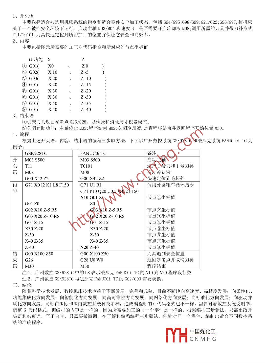 數(shù)控車床的工藝與編程李永松/江西交通職業(yè)技術學院【摘要】本文闡述了不同的數(shù)控系統(tǒng)車床在工藝分析存在的共同點,但在編程三步驟上的開頭語和結(jié)束語存在系統(tǒng)格式的不同,在編程三步驟的內(nèi)容上存在不同的數(shù)控系統(tǒng)格式(如G71)不同,不同的數(shù)控系統(tǒng)只要在程序做一些微調(diào),就可以編出適合不同數(shù)控系統(tǒng)的準確程序?!娟P鍵詞】圖元;節(jié)點;編程三步驟工藝分析1、圖紙分析①分析圖形的基本尺寸(特別是最大直徑和長度),決定毛坯下料和數(shù)控車床最大回轉(zhuǎn)直徑;根據(jù)尺寸基準,確認加工基準面;同時在標題欄中確認零件材料。②分析圖紙形狀公差、位置公差和表面粗糙度,選擇能滿足加工精度要求的機床,并計算出精加工速度F值。2、主軸轉(zhuǎn)速S和切削速度F值計算①如果對杋床使用很熟練,根據(jù)經(jīng)驗選擇主軸轉(zhuǎn)速S和切削速度F,根據(jù)杋床性能、被加工材料的種類和硬度、切削狀態(tài)、進給量、切深等選擇使用的切削速度。如下表格:其中f為每轉(zhuǎn)進給量:αp為切深(切削的厚度)輕切削般切削重切削被切削材料p0.5~1.0m05~0.3mm/0.2~0.5m/4~0.8m/優(yōu)質(zhì)碳素鋼45#60-23070-22080-180合金鋼100220100-23070220最適合的加工條件的選定是在這些因素的基礎上選定的。有規(guī)則的、穩(wěn)定的磨損達到壽命才是理想的條件3、合理選擇刀具①根據(jù)零件輪廓,退刀槽,螺紋,特殊形狀的曲線,選擇所對應的外圓車刀,切槽刀或切斷刀,螺紋刀,特殊形狀車刀或仿形車刀。②根據(jù)加工順序分為:粗車時,要選強度高、耐用度好的刀具,以便滿足粗車時大背吃刀量、大進給量的要求精車時,要選精度高、耐用度好的刀具,以保證加工精度的要求,③根據(jù)刀具的結(jié)構選擇整體車刀或機夾刀,但為減少換刀時間和方便對刀,應盡量采用機夾刀和機夾刀片。4、工藝步驟數(shù)控車床是一次裝夾,連續(xù)自動加工完成所有車削工序,需在加工零件圖紙中,建立編程坐標系,分解零件圖紙組成的圖元,如直線、斜直線、圓弧、橢圓、曲線、螺紋、退刀槽、倒圓、倒角等等,在所對應的圖元標出加工的G代碼(Goo0丶G0I\G02G03),如圖1。根據(jù)基準,分析加工順序,確定工藝方案,安排零件加工的先后順序坐標原點G(1Z+圖圖標出各圖元的節(jié)點(過度點)序號,計算出各節(jié)點的在編程坐標中的坐標值,如圖2:Z①(0(10③④(中國煤化工CNMHG⑧(40、編程三步驟為了使編程出現(xiàn)各種問題,通常選擇編程三步驟:開頭語;內(nèi)容;結(jié)束語。開頭語主要選擇適合被選用機床系統(tǒng)的指令和適合零件安全加工狀態(tài),包括G94/G95;G98/G99;G21/G22;G96/G97,使機床處于一個被控安全環(huán)境下運行。啟動主軸M03/MO4和速度S;是否需要開啟冷卻液M08;調(diào)用所需的刀具并帶刀補形式T1l/T0101;刀具快速定位到所需加工的位置并保證它安全和高效率。2、內(nèi)容主要包括圖元所需要的加工G代碼指令和所對應的節(jié)點坐標值G功能XZ①G01(X0ZO②G02(X10G03(X2Z-10④G0l(X20、Z-15⑤G01(X30、Z-20⑥G0(X30Z-30⑦G01(X40Z-35))))))-40、結(jié)束語①機床刀具返回參考點G26/G28,以檢驗和消除尺寸積累誤差。②關閉輔助功能:主軸停止M05;程序結(jié)束M02;關閉冷卻液,是否程序結(jié)束并返回程序開始位置M30,4、編程根據(jù)上述開頭語、內(nèi)容、結(jié)束語的編程三步驟方法,下面以廣州數(shù)控系統(tǒng)GSK928TC和法那克系統(tǒng) FANUC Oi tC為例子GSK928TCFANUCOi TC備注開MO3S500M03S500啟動主軸頭T11T0101選擇1號刀和1號刀補語MOM08啟動冷卻液G00 X42 ZG00X42Z2快速定位到毛坯外內(nèi)G71X012K1L8F150G71U1R1調(diào)用外圓粗車循環(huán)指令G71P10020U0.5W0.2F150N10 GO1 XO節(jié)點①坐標值G01Z0G02 X10Z-5RG03X10Z-5R5節(jié)點②坐標值G03X20Z-10RG02X20Z-10R5節(jié)點③坐標值Go1Z-15G01Z-15節(jié)點④坐標值X30Z20X30Z20節(jié)點⑤坐標值Z-30Z-30節(jié)點⑥坐標值X40Z-35X40Z-35節(jié)點⑦坐標值N20Z-40節(jié)點⑧坐標值結(jié)G00X100Z50G00X100Z50刀具退到安全位置束G26G28 UO WO返回參考點并取消刀補語M30M30程序結(jié)束注1:廣州數(shù)控GSK928TC中的L8表示法那克FANU0iTC的N10到N20程序段行數(shù)注2:廣州數(shù)控GSK928TC與法那克FANC0iTC的G02/G03需要調(diào)換結(jié)論隨著科學技術發(fā)展,數(shù)控機床技術也趨于不斷發(fā)展、完善和成熟,目前不斷地向高速度、高精度發(fā)展;向柔性化、功能集成化方向發(fā)展;向智能化方向發(fā)展;向高可靠性方向發(fā)展;向網(wǎng)絡化方向發(fā)展;向標準化方向發(fā)展;向驅(qū)動并聯(lián)化方向發(fā)展;同時在國際和國內(nèi)數(shù)控系統(tǒng)種類多樣,造成編程時的G代碼格式也不一樣,需要對著數(shù)控系統(tǒng)說明書調(diào)整G代碼格式,但編程的內(nèi)容是一樣的,因為所需要加工的同一個零件是一樣的。根據(jù)編程三步驟法,只需更改開頭語和結(jié)束語,至于內(nèi)容,只需要做微調(diào),在了解和熟悉編程三步驟法,能針對同一個零件,編制岀適合不同數(shù)控系統(tǒng)的準確程序中國煤化工CNMHG