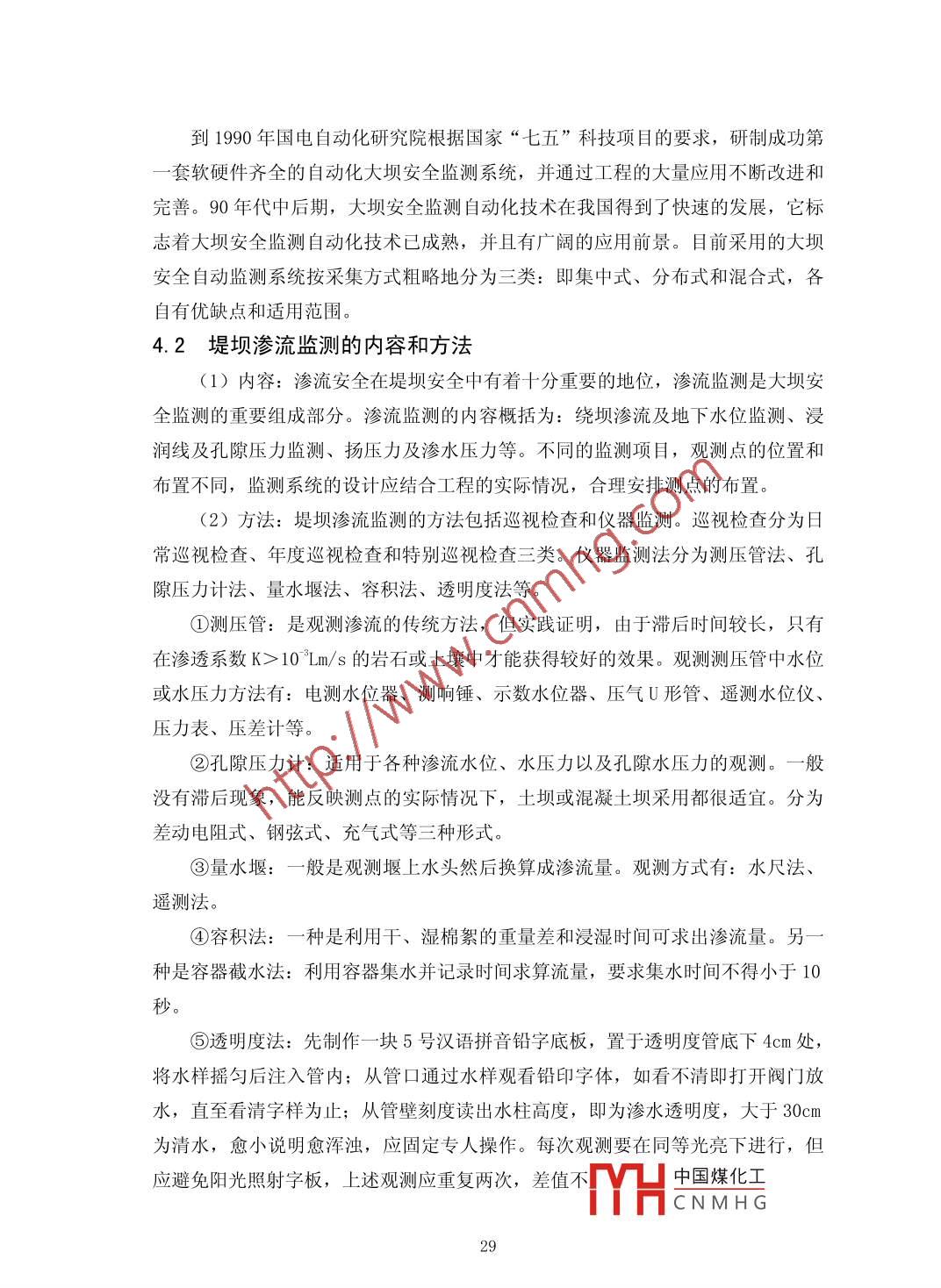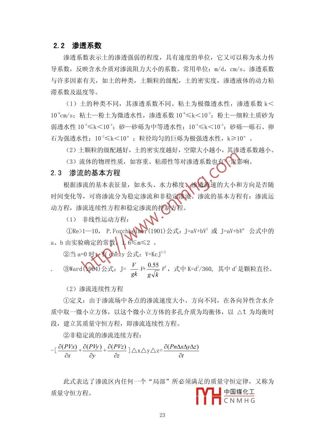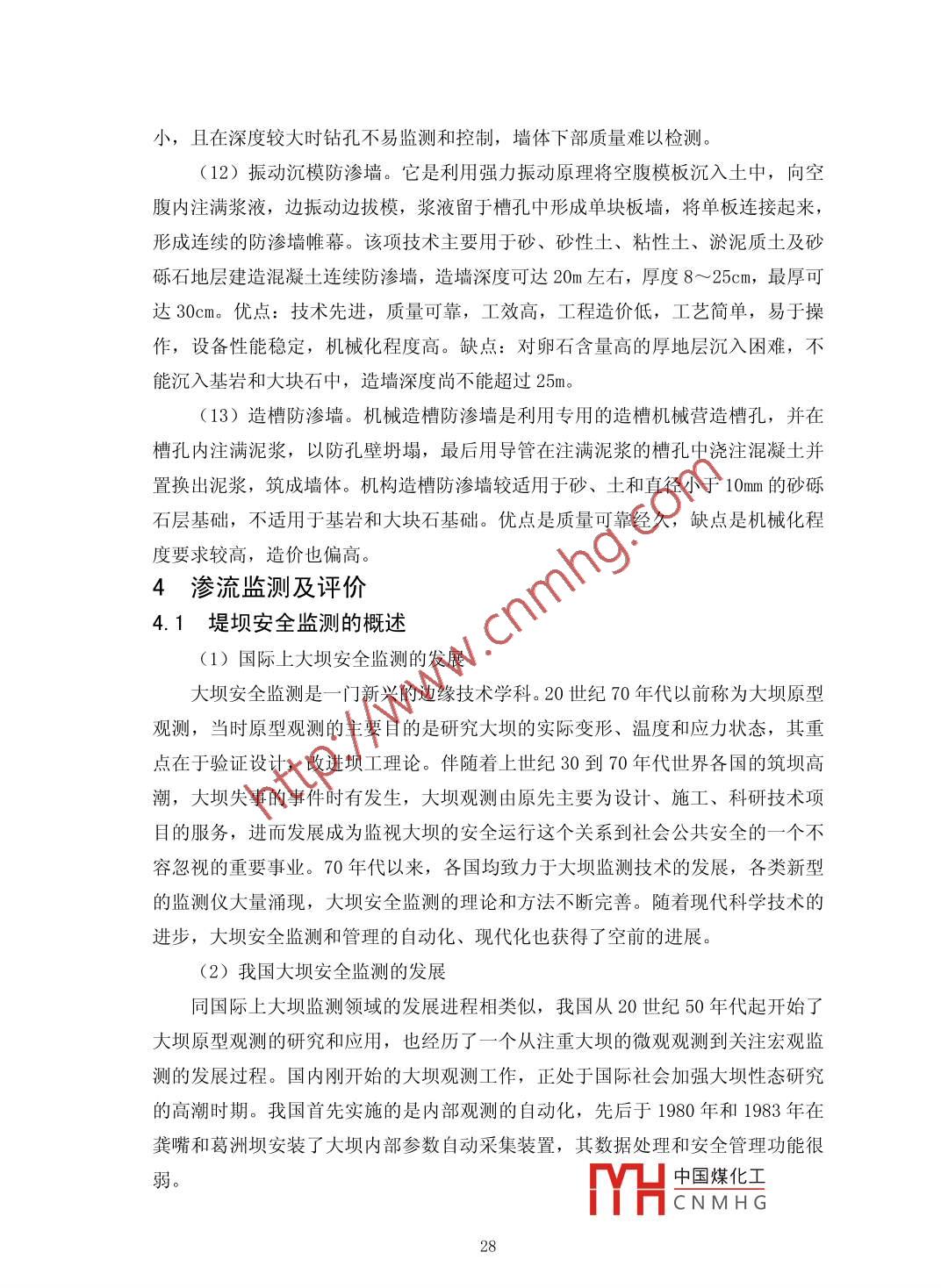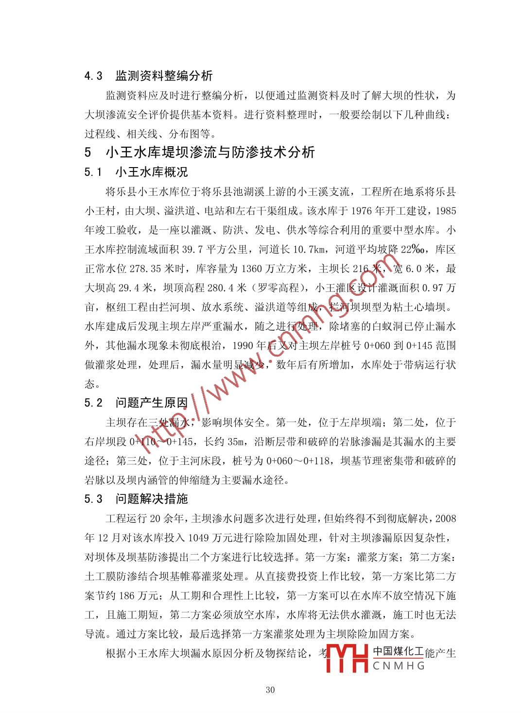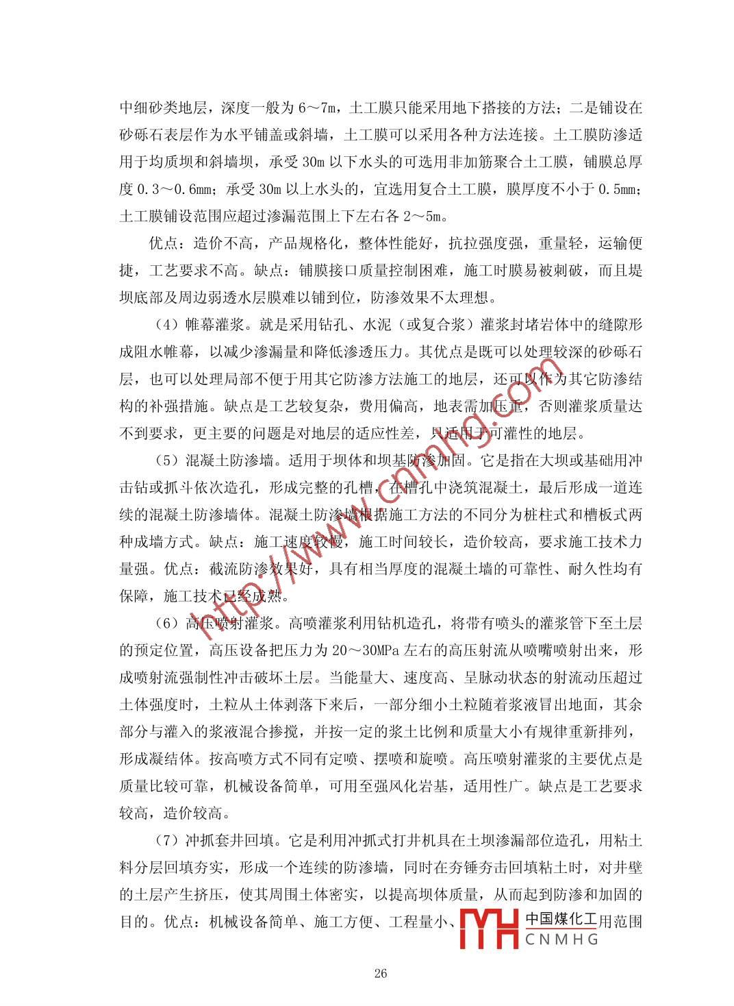 堤壩滲流分析邱長開福建省將樂縣水利工作站福建三明市353300摘要:堤壩滲流分析與防滲技術(shù)處理是堤壩除險加固的重要。滲透破壞在堤壩工程中非常普遍,要做好滲透破壞的除險加固工作,就要摸清險情,對癥下藥。首先要了解滲透破壞的類型并進(jìn)行成因分析,然后根據(jù)滲流控制原則和具體的工程地質(zhì)條件,選擇經(jīng)濟(jì)合理的除險措施,最后按所選的防滲技術(shù)進(jìn)行精心施工,達(dá)到根除滲透破壞的目的。本文概述了堤壩滲流的危害、理論發(fā)展、主要計算方法、滲流分析的基礎(chǔ)理論以及具體的防滲加固措施,并對不同的防滲處理方法的利弊作簡要分析探討,最后以莆田市近幾年來水庫土石壩防滲除險加固為實例,具體分析大壩滲流產(chǎn)生原因和采取防滲措施以及工程處理后的實際效果,總結(jié)土石壩防滲處理方法選擇的一般性規(guī)律,供后期同類水庫堤壩除險加固參考。關(guān)鍵詞:堤壩;滲流理論;防滲加固措施Abstract: the dam seepage analysis and seepage control technology is an important dykereinforcement. Seepage in dam construction is very common, to do a good job in seepagereinforcement work, will be out of danger, an antidote against the disease. We must first understandthe type of seepage failure and cause analysis, and then according to the principles and specificengineering geological conditions of seepage control, selection of rational treatment, anti-seepagetechnique by the selected carefully construction, seepage failure to eradicate.This paper summarizes the measures for strengthening the basic theory analysis of damseepage hazards, theory development, the main calculation method, seepage and seepage of concrete,and the advantages and disadvantages of different anti-seepage processing method are brieflydiscussed, and finally to Putian city in recent years the reservoir dam anti-seepage reinforcement asan example, the analysis of dam seepage generated the reason and the actual effect of antiseepagemeasure and engineering treatment, summed up the general law of seepage prevention treatmentmethod of choice, for later similar reservoir dam reinforcement reference.Keywords: dam; seepage theory of seepage prevention and reinforcement measures;中圖分類號: 0357. 3文獻(xiàn)標(biāo)識碼: A文章編號: 2095-2104 (2013)引言:中國煤化工MHCNMH G19只要堤壩的臨水側(cè)和背水側(cè)存在水頭差,堤壩就會產(chǎn)生滲流,滲流分正常滲流和有害滲流,有害滲流產(chǎn)生滲透破壞,據(jù)統(tǒng)計,由滲透破壞造成的險情約占堤壩險情總數(shù)的60%以上,是堤壩工程中最普遍且難以治愈的心腹之患。關(guān)于堤壩的滲流問題,中國學(xué)者主要集中于滲透破壞模式和土顆粒組成之間的相互關(guān)系。在滲透穩(wěn)定分析中,有限元滲流計算結(jié)果應(yīng)結(jié)合滲流比降與土體抗?jié)B特性之間的關(guān)系進(jìn)行分析。對于堤壩的滲流控制,應(yīng)遵循“前堵、中截、后排”的原則。在堤壩除險加固工程中,防滲處理方案的選擇,具體取決于防滲技術(shù)的功能性、可實施性、經(jīng)濟(jì)性、環(huán)境和安全性。因此,為了保證堤壩運行安全,對堤壩滲流進(jìn)行安全檢測并進(jìn)行認(rèn)真細(xì)致的分析,然后選擇經(jīng)濟(jì)合理的防滲措施尤為重要。1堤壩滲流概述1.1堤壩滲流的危害堤壩以及水庫有部分建造在軟土地基上,尤其是土石壩的筑壩土與壩基土滲透系數(shù)較大,必須進(jìn)行滲流分析和采取正確的防滲措施,否則會造成壩身、壩基滲漏過大,危及工程的安全。滲流產(chǎn)生的危害主要有:①堤壩滲流過大,損失水庫蓄水量。一般來說,水庫壩身、壩基透水性比較強(qiáng)。如果防滲不當(dāng),堤壩擋水后,由于上、下游水位差的作用,滲水將從上游經(jīng)壩體和壩基的顆粒孔隙向下游滲透,應(yīng)有的蓄水量減少,工程效益降低,甚至導(dǎo)致水庫無法蓄水的現(xiàn)象,并引發(fā)水庫周圍土地沼澤化,污染環(huán)境。②浸潤線過高,影響壩體穩(wěn)定。嚴(yán)重的壩身和壩基滲漏,常會導(dǎo)致壩身浸潤線抬高,使下游壩坡出現(xiàn)散浸現(xiàn)象,降低壩體的抗剪強(qiáng)度,甚至造成壩體滑坡。③滲透比降超臨界,產(chǎn)生滲透破壞。在壩身或壩基發(fā)生滲流時,若滲流的滲透坡降大于臨界坡降,將誘使土體發(fā)生管涌、流土、接觸沖刷、接觸流失等滲透變形,甚至產(chǎn)生集中滲漏,導(dǎo)致垮壩失事。1.2 堤壩滲流理論的發(fā)展隨著我國水利水電工程建設(shè)的迅速發(fā)展,水工建筑物的安全性越來越受到重視。而滲流作用對堤壩的影響不容忽視,所以對滲流理論進(jìn)行研究并采取正確的防滲處理措施就顯得越來越重要。滲流是一門與水力學(xué)和巖土力學(xué)有著密切關(guān)系的學(xué)科,隨著近代科學(xué)技術(shù)的不斷發(fā)展,滲流在基本理論試驗手段、設(shè)計方法和應(yīng)用等方面都得到了極大發(fā)展,逐漸成為一門專門的學(xué)科,已能觖決各種復(fù)雜的工程問題。理論的發(fā)展與研究手.段的進(jìn)步是分不開的,主要表現(xiàn)在兩個方面:滲流研中國煤化工了現(xiàn)代YHCNMHG20電子計算技術(shù),發(fā)展了數(shù)值模擬方法;滲流機(jī)理研究的試驗手段日益先進(jìn)。滲流理論的研究大致經(jīng)歷了三個大的發(fā)展階段: Daxcy 定律的出現(xiàn),20 世紀(jì)石油工業(yè)的崛起極大地推動了滲流力學(xué)的發(fā)展;隨著相關(guān)科學(