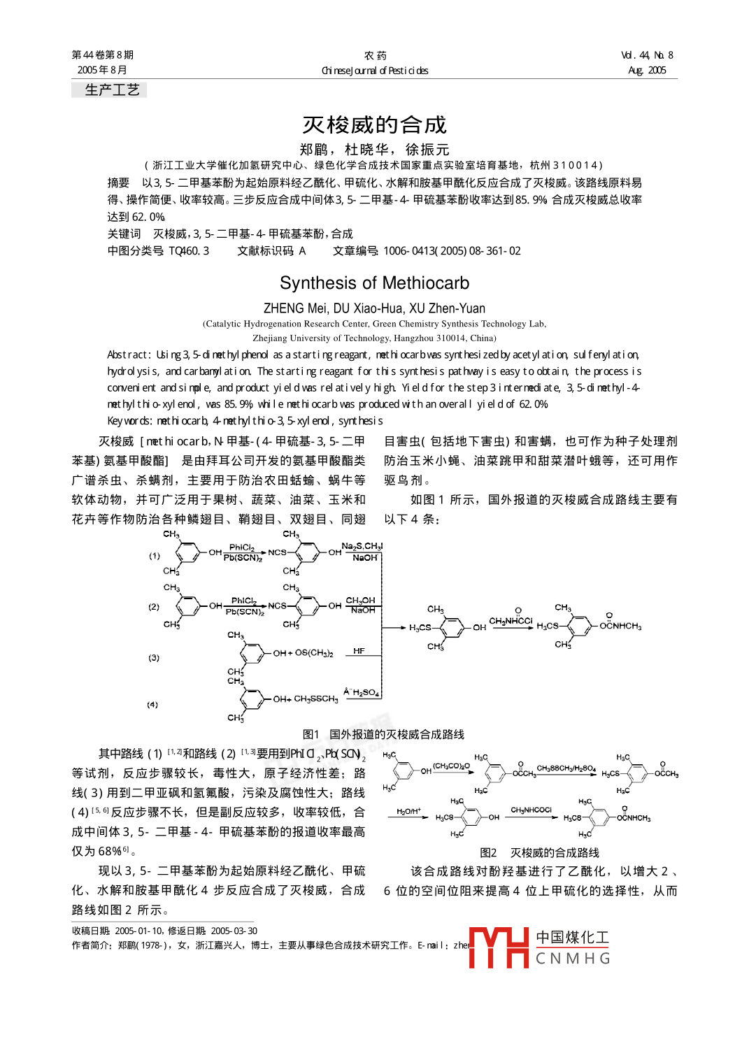第44卷第8期Vd.44No82005年8月Cinese| orrel df PesticidesAg 2005生產(chǎn)工藝滅梭威的合成鄭鹛,杜曉華,徐振元(浙江工業(yè)大學催化加氫研究中心、綠色化學合成技術(shù)國家重點實驗室培育基地,杭州310014)摘要以3, 5-二甲基苯酚為起始原料經(jīng)乙酰化、甲硫化、水解和胺基甲酰化反應(yīng)合成了滅梭威。該路線原料易得、操作簡便、收率較高。三步反應(yīng)合成中間體3, 5-二甲基- 4甲硫基苯酚收率達到85.9%合成滅梭威總收率達到62. 0%關(guān)鍵詞滅梭威,3, 5-二甲基-4甲硫基苯酚,合成中圖分類號TQ460.3文獻標識碼 A文章編號1006- 0413( 2005) 08 361- 02Synthesis of MethiocarbZHENG Mei, DU Xiao-Hua, XU Zhen-Yuan(Catalytic Hydrogenation Research Center, Green Chemistry Synthesis Technology Lab,Zhejiang University of Technology, Hangzhou 310014, China)Abstract: lbsing3, 5- di nethyl phenol as a starti ng reagant, nethi ocarbvas synthesi zedby acetyl ati on, sul feny| ationhydrol ysis, and carbanyl ation The starti ng reagant for this synthesis pathwayis easy toobtain the process isconveni ent andsinpl e, and product yi el dvas rel atively high. Yieldfor the step3internediate, 3, 5-di nethyl -4nethylthi 0 xyI enol, vas 85. 9% whi le nethi ocarb vas produced with an overal | yield of 62. 0%6Keyvords: nethi ocar, 4 nethylthi 0 3, 5 xyI enol, synthesis滅梭威[nethi ocarb, N甲基-(4-甲硫基-3,5-二甲目害蟲( 包括地下害蟲)和害螨,也可作為種子處理劑苯基)氨基甲酸酯]是 由拜耳公司開發(fā)的氨基甲酸酯類防治 玉米小蠅、油菜跳甲和甜菜潛葉蛾等,還可用作廣譜殺蟲、殺螨劑,主要用于防治農(nóng)田蛞蝓、蝸牛等 驅(qū)鳥劑。軟體動物,并可廣泛用于果樹、蔬菜、油菜、玉米和如圖1所示,國外報道的滅梭威合成路線主要有花卉等作物防治各種鱗翅目、鞘翅目、雙翅目、同翅以下4 條:_ or NazS,CH!! Pb(SCN2NaOHCHCH6PhICI2)Pb(SCN)NCS-- OH NaOHCHg0CH3CHNHicci. H2C8-- 0CNHCH3CHscH6-OH+ OS(CH)2_ HF__3)A"H2S044)cH圖1 國外報道的滅梭威合成路線其中路線(1) (1.4和路線(2) [1.3要用到PhIG,、Pb(SCN2 Hoc92 HgCS-等試劑,反應(yīng)步驟較長,毒性大,原子經(jīng)濟性差;路( ) oHChcono線( 3)用到二甲亞砜和氫氟酸,污染及腐蝕性大;路線HslgG(4)[5.61反應(yīng)步驟不長,但是副反應(yīng)較多,收率較低,合HgOHt_ HoCECHsNHCOCIoCNHCHs成中間體3, 5-二甲基-4-甲硫基苯酚的報道收率最高僅為68%61。圖2 滅梭威的合成路線現(xiàn)以3, 5-二甲基苯酚為起始原料經(jīng)乙?;?、甲硫該合成路線對酚羥基進行了乙酰化,以增大2、化、水解和胺基甲?;?步反應(yīng)合成了滅梭威,合成6 位的空間位阻來提高4位上甲硫化的選擇性,從而路線如圖2所示。收稿日期2005- 01- 10,修返日期2005- 03- 30中國煤化工作者簡介:鄭鹛( 1978-),女,浙江嘉興人,博士,主要從事綠色合成技術(shù)研究工作。E-nail: zheMYHCNMH G362農(nóng)藥CineseJarrel df Pasticids第44卷使中間體3, 5-二甲基-4甲硫基苯酚的收率達到了85. 9%灰白色固體34. 1g。mp.120C~126C(文獻值 121. 5°C [7)。使反應(yīng)的總收率提高到了62.0%。GC含量91.3%收率72. 2%產(chǎn)品經(jīng)TLC (乙酸乙酯/1試驗部分石油醚=4/6, v/v)分離得純品。N (ne): 235 (M), 168(MCHNC9, 153 (168- CH), 109(153-CS); HNR(QJ): & 021.1試劑所用試劑均為市售分析純、化學純或工業(yè)級藥(1H b5), 6 59(2Hs), 276(3H dJ=.4H), 2473H s), 234(6H s)。2結(jié)果與討論品,部分溶劑經(jīng)過干燥和重蒸。1.2儀器.2.1乙?;瘻囟扔嬑唇?jīng)校正;考慮到酚羥基為鄰對位定位基,對3, 5-二甲基苯酚XT-4雙目顯微熔點測定儀,北京泰克儀器有限直接進行甲硫化會生成較多的鄰位產(chǎn)物,從而使中間公司;體3, 5-二甲基-4-甲硫基苯酚的收率較低,也增加了分福力GC- 9070氣相色譜儀,浙江溫嶺福力分析儀離的難度。 因而首先對酚羥基作了乙?;Wo,增加了乙?;徫坏目臻g位阻,提高了在4-位上甲硫化的器有限公司;Bruker AC- 400核磁共振儀,內(nèi)標為TMS;選擇性,大大提高了3, 5-二甲基-4-甲硫基苯酚的收率。Vari an Saturn 2000質(zhì)譜儀, 70eV。2.2甲硫化1.3試驗方法在乙酸(3, 5-二甲基-4-甲硫基苯酚)酯的合成反應(yīng)中,采用的是無機酸做催化劑,促進二甲二硫在苯酚1.3. 1乙酸(3, 5-二甲基苯酚)酯于100nh三口燒瓶中加入3, 5-二甲基苯酚(24. 4g, .環(huán)上發(fā)生親電取代反應(yīng)。同時考慮到,取代反應(yīng)后,苯0.2mol)和乙酸酐(30. 6g, 0. 3nol ),攪拌溶解,升溫至環(huán)上便有了兩個致活基團(-OCOCH、 .SCH) ,如果酸度.110C反應(yīng)4h,GC檢測反應(yīng)完全,減壓蒸餾回收副產(chǎn)過高,必然會導致二元取代物的增加,因此,控制投物乙酸和過量的乙酸酐,得橙黃色液體32. 6g,GC含料比例為酚:二甲二硫:濃硫酸=1 :1 :1 (摩爾比)。甲硫化反應(yīng)的文獻報道中,反應(yīng)都是在回流溫量99.3%收率98.7%度(155C~160C)下進行的, 高溫使副反應(yīng)增加,導1.3.2乙酸(3, 5-二甲基4-甲硫基苯酚)酯致收率下降。我們采取較為溫和的反應(yīng)條件,即在室于100mh三口燒瓶中加入乙酸(3, 5-二甲基苯酚)酯溫下反應(yīng),適當延長反應(yīng)時間,得到了很好的收率。(26. 0g, 0.16nol) 和二甲基_硫(15.0g, 0. 16nol ),室溫攪3結(jié)論.拌,于1h內(nèi)滴加98%濃硫酸(16g, 0. 16nol),加完后繼以3, 5-二甲基苯酚為起始原料經(jīng)乙?;?、甲硫化、續(xù)于室溫下攪拌10h,然后倒入300m冰水中,用乙水解和胺基甲?;?步反應(yīng)合成了滅梭威。該方法較之酸乙酯(100ml X3)萃取,合并有機層,依次用5%碳原有的合成方法有原料易得、操作簡便、收率高等特酸鉀水溶液、冷水