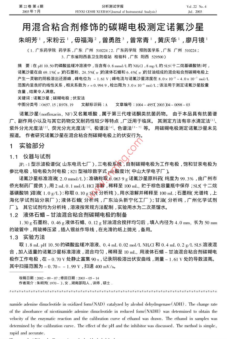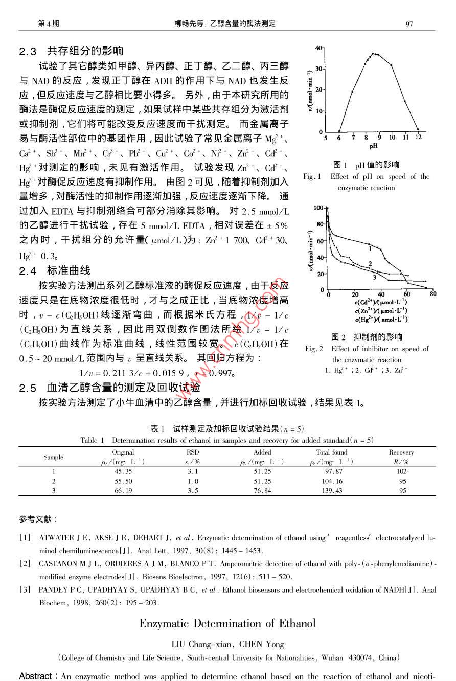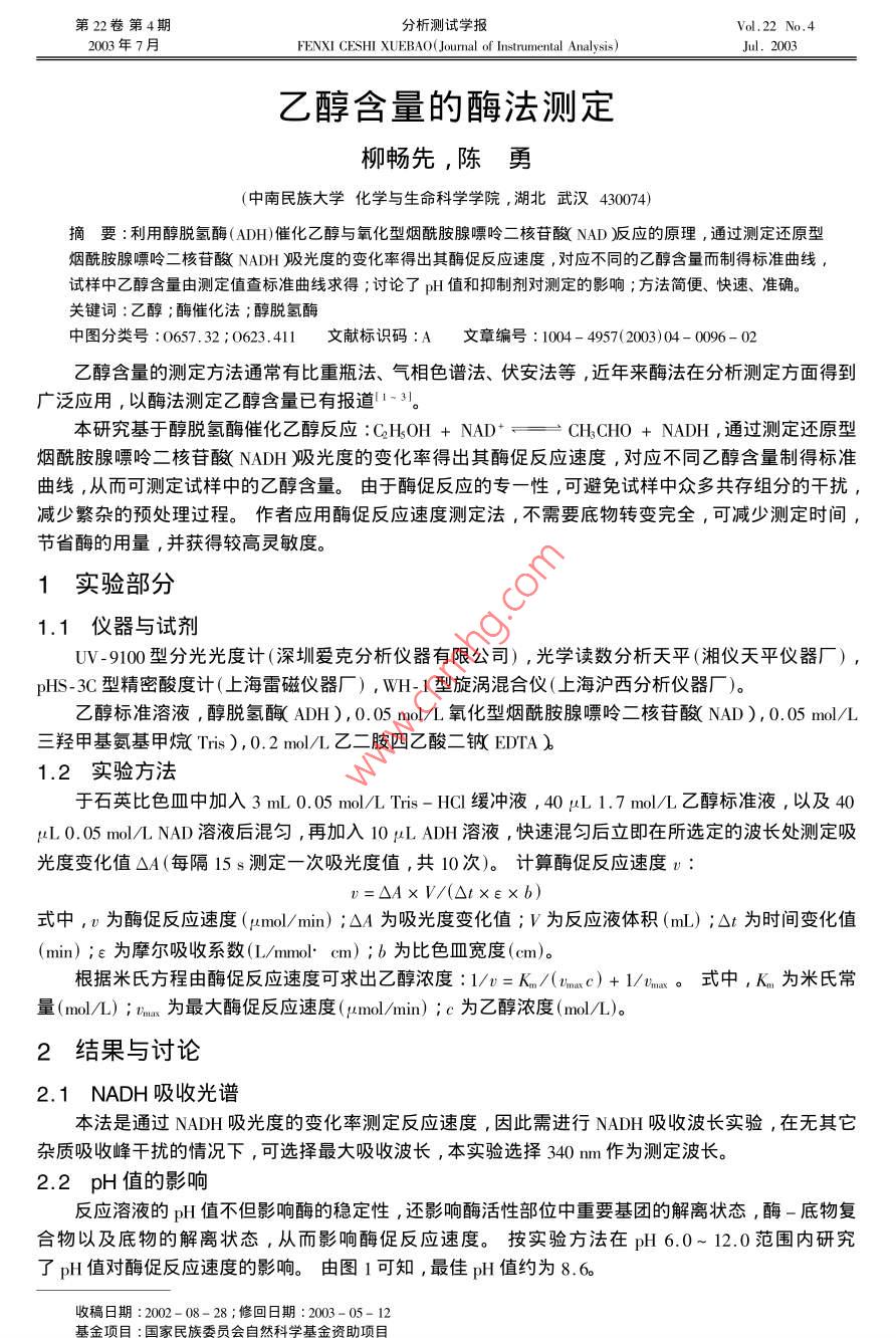 第22卷第4期分析測試學(xué)報(bào) Vol.22 No.42003年7月 FENXI CESHI XUEBAO( Journal of Instrumental Analysis)Jul.2003乙醇含量的酶法測定柳暢先,陳勇(中南民族大學(xué)化學(xué)與生命科學(xué)學(xué)院,湖北武漢430074)摘要:利用醇脫氫酶(ADH)催化乙醇與氧化型煙酰胺腺嘌呤二核苷酸(NAD反應(yīng)的原理,通過測定還原型煙酰胺腺嘌呤二核苷酸NADH吸光度的變化率得出其酶促反應(yīng)速度,對(duì)應(yīng)不同的乙醇含量而制得標(biāo)準(zhǔn)曲線,試樣中乙醇含量由測定值查標(biāo)準(zhǔn)曲線求得;討論了pH值和抑制劑對(duì)測定的影響;方法簡便、快速、準(zhǔn)確。關(guān)鍵詞:乙醇;酶催化法醇脫氫酶中圖分類號(hào):0657.320623.41文獻(xiàn)標(biāo)識(shí)碼:A文章編號(hào):1004-4957(2003)04-0096-02乙醇含量的測定方法通常有比重瓶法、氣相色譜法、伏安法等,近年來酶法在分析測定方面得到廣泛應(yīng)用,以酶法測定乙醇含量已有報(bào)道1-31。本研究基于醇脫氫酶催化乙醇反應(yīng):ChoH+NAD+CH CHO+NAH,通過測定還原型煙酰胺腺嘌呤核苷酸NADH吸光度的變化率得出其酶促反應(yīng)速度,對(duì)應(yīng)不同乙醇含量制得標(biāo)準(zhǔn)曲線,從而可測定試樣中的乙醇含量。由于酶促反應(yīng)的專一性,可避免試樣中眾多共存組分的干擾,減少繁雜的預(yù)處理過程。作者應(yīng)用酶促反應(yīng)速度測定法,不需要底物轉(zhuǎn)變完全,可減少測定時(shí)間,節(jié)省酶的用量,并獲得較高靈敏度。1實(shí)驗(yàn)部分1.1儀器與試劑UV-9100型分光光度計(jì)(深圳愛克分析儀器有限公司,光學(xué)讀數(shù)分析天平(湘儀天平儀器廠),phs-3c型精密酸度計(jì)(上海雷磁儀器廠)WH-1型渦混合儀(上海滬西分析儀器廠)。乙醇標(biāo)準(zhǔn)溶液,醇脫氫酶(ADH),0.05mol/L氧化型煙酰胺腺嘌呤二核苷酸NAD),0.05mol/L三羥甲基氨基甲烷Tris),0.2mol/L乙二胺四乙酸二鈉EDTA1.2實(shí)驗(yàn)方法于石英比色皿中加入3mL0.05mol/ Tris--HCl緩沖液,40μL1.7mol/L乙醇標(biāo)準(zhǔn)液,以及40L0.05mol/LNAD溶液后混勻,再加入10μLADH溶液,快速混勻后立即在所選定的波長處測定吸光度變化值△A(每隔15s測定一次吸光度值,共10次)計(jì)算酶促反應(yīng)速度v:v=△A(△tEb)式中,v為酶促反應(yīng)速度(mol/min);△A為吸光度變化值;V為反應(yīng)液體積(mL);△t為時(shí)間變化值(min);為摩爾吸收系數(shù)(L/mmol cm);b為比色皿寬度(cm)。根據(jù)米氏方程由酶促反應(yīng)速度可求出乙醇濃度:1/v=K()+1式中,K為米氏常量(mol/L)v為最大酶促反應(yīng)速度(umol/min)c為乙醇濃度(mol/L)2結(jié)果與討論2.1NADH吸收光譜本法是通過NADH吸光度的變化率測定反應(yīng)速度,因此需進(jìn)行NADH吸收波長實(shí)驗(yàn),在無其它雜質(zhì)吸收峰干擾的情況下,可選擇最大吸收波長,本實(shí)驗(yàn)選擇340mm作為測定波長。2.2pH值的影響反應(yīng)溶液的pH值不但影響酶的穩(wěn)定性,還影響酶活性部位中重要基團(tuán)的解離狀態(tài),酶-底物復(fù)合物以及底物的解離狀態(tài),從而影響酶促反應(yīng)速度。按實(shí)驗(yàn)方法在pH6.0~12.0范圍內(nèi)研究了pH值對(duì)酶促反應(yīng)速度的影響。由圖1可知,最佳pH值約為8.6基金項(xiàng)目:國家民族員會(huì)自然科學(xué)基金資助項(xiàng)目第4期柳暢先等:乙醇含量的酶法測定972.3共存組分的影響試驗(yàn)了其它醇類如甲醇、異丙醇、正丁醇、乙二醇、丙三醇與NAD的反應(yīng),發(fā)現(xiàn)正丁醇在ADH的作用下與NAD也發(fā)生反應(yīng),但反應(yīng)速度與乙醇相比要小得多。另外,由于本研究所用的20酶法是酶促反應(yīng)速度的測定,如果試樣中某些共存組分為激活劑10或抑制劑,它們將可能改變反應(yīng)速度而干擾測定。而金屬離子0易與酶活性部位中的基團(tuán)作用,因此試驗(yàn)了常見金屬離子Mg+、5689101112 pHCa2+、Sb3+、Mn2+、Cr+、Pb2+、Cu2+、Co2+、Ni2+、Zn2+、C+、Hg2+對(duì)測定的影響,未見有激活作用。試驗(yàn)發(fā)現(xiàn)Zn2+、C+、圖1pH值的影響Hg2+對(duì)酶促反應(yīng)速度有抑制作用。由圖2可見,隨著抑制劑加入 Fig.1 Effect of pH on speed of the過加入EDTA與抑制劑絡(luò)合可部分消除其影響。對(duì)2.5mmol/ enzymatic reaction量增多,對(duì)酶活性的抑制作用逐漸加強(qiáng),反應(yīng)速度逐漸下降。通的乙醇進(jìn)行干擾試驗(yàn),存在5mmol/ EDTA,相對(duì)誤差在±5%80之內(nèi)時(shí),干擾組分的允許量(μmol/L)為Zn2+1700、Cd+30、60Hg2+0.3402.4標(biāo)準(zhǔn)曲線20按實(shí)驗(yàn)方法測出系列乙醇標(biāo)準(zhǔn)液的酶促反應(yīng)速度,由于反應(yīng)速度只是在底物濃度很低時(shí),才與之成正比,當(dāng)?shù)孜餄舛仍龈?20406080(Cd'*Xumol-Il)時(shí),v-c(C2HOH)線逐漸彎曲,而根據(jù)米氏方程,1/v-1/c(Znyumol-L)( nmol-L)(C2HOH)為直線關(guān)系,因此用雙倒數(shù)作圖法所繪1/v-1/c圖2抑制劑的影響(CHOH)曲線作為標(biāo)準(zhǔn)曲線,線性范圍較寬。c(CHo)在g Effect of inhibitor on speed of0.5~20mmol/L范圍內(nèi)與v呈直線關(guān)系。其回歸方程為: the enzymatic reaction/v=0.2113/c+0.0159,r=0.9971.+2.c+;3.n2+2.5血清乙醇含量的測定及回收試驗(yàn)按實(shí)驗(yàn)方法測定了小牛血清中的乙醇含量并進(jìn)行加標(biāo)回收試驗(yàn),結(jié)果見表1表1試樣測定及加標(biāo)回收試驗(yàn)結(jié)果(n=5) Table 1 Determination results of ethanol in samples and recovery for added standard(=5) Original RSD Sample 
