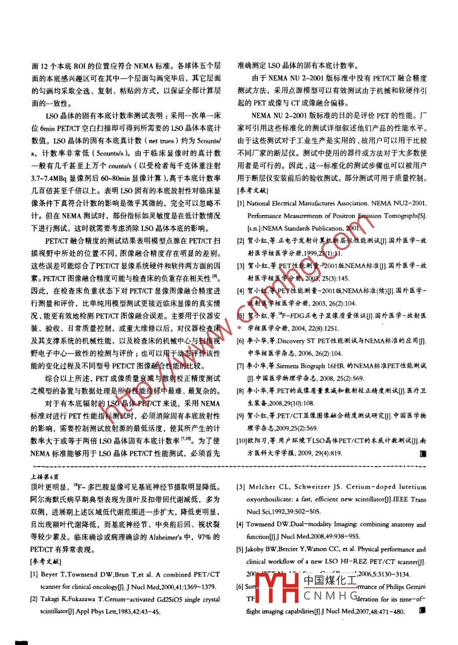 專欄一- PET/CT設(shè) 備的臨床應(yīng)用和管理編者按: PET. PET/CT進(jìn)入中國(guó)僅十幾年就已經(jīng)取得驕人業(yè)績(jī),但重引進(jìn)、重配置,輕管理、輕科研的狀況也值得引起業(yè)界高度重視。本專欄特約復(fù)旦大學(xué)附屬華山醫(yī)院PET中心主任許震生教授擔(dān)任欄目主編,專欄作者涵蓋企業(yè)和醫(yī)院的工作人員,也包括香港和臺(tái)灣地區(qū)的研究人員,從PET/CT的進(jìn)展、 研究、應(yīng)用到管理進(jìn)行了全面論述。許教授認(rèn)為,加強(qiáng)業(yè)界交流、信息共享、加強(qiáng)人才培養(yǎng)是當(dāng)前極為緊迫的任務(wù),亦是確保正電子放射影像事業(yè)能更快更好更平衡發(fā)展的重要手段。希望本專欄能夠?yàn)榇颂峁?一個(gè)良好的交流互動(dòng)平臺(tái),供讀者探討。PET/CT技術(shù)進(jìn) 展.Technology Development of PET/CT王文艇,錢(qián)鋒[摘要]本文著重介紹近幾年P(guān)ET/CT中PET的技術(shù)進(jìn)展。新晶體材料的(西門(mén)子(中國(guó))有限公司醫(yī)療業(yè)應(yīng) 用使得PET/CT在分辨率和靈敏度等方面有了顯著提高,飛行時(shí)間技術(shù)務(wù)領(lǐng)域,分子影像產(chǎn)品部,上(TOF改善了PET數(shù)據(jù)的信噪比,最新型的HD PET技術(shù)則讓PET獲得了全視海201318)野一致的高清圖像。文章最后簡(jiǎn)要描述了目前商業(yè)PET/CT的臨床應(yīng)用。[關(guān)鍵詞] PETICT;閃爍晶體;飛行時(shí)間技術(shù); HD PET;掃捕儀[中圖分類號(hào)]R814.42 [文獻(xiàn)標(biāo)志碼]A三[文章編號(hào)1 1674- 132009080001 -04Abstract: This study introduced the recent PET technology development of PET/CT. The application of new sinilalor sinificanl'y improved the resoluion and許震生sensitivity of PET/CT, the technology of time of flight (TOF) increased the signal-WANG Wen -Ting, QIAN Fengto-noise ratio of PET data, and the streanlined high-defination (HD) technology(Deparment of MoleculeImaging, Healthcare Sector,offered uniform resolution across the entire field of view and enhanced the qualitySiemens Limited China,of images. At last, the clinical practice of current PET/CT was bielly described.Shanghai 201318, China)Key words: PET/CT; siniltorTOF;:HD PET;scanner0前言的意義。患者和顯像中心運(yùn)作所獲得的最大便利是:一次預(yù)約,一次到醫(yī)院檢查,相關(guān)的醫(yī)師就可獲得疾病解剖和功能世界上首臺(tái)PET/CT原型機(jī)始于1998年,它聯(lián)合一臺(tái)狀態(tài)的完整評(píng)估。自首臺(tái)商用PET/CT于2001年5月安裝之單排CT掃描儀(SOMATOM AR.SP ; Siemens醫(yī)療部)和-后,所有主要的醫(yī)療影像設(shè)備生產(chǎn)商都生產(chǎn)了至少- -款PET/臺(tái)PET ( ECAT ART ; CPS Innovations)安裝在同一個(gè)旋轉(zhuǎn)CT,這項(xiàng)技術(shù)出人意料地被核醫(yī)學(xué)和放射科迅速接受。2006機(jī)架內(nèi),并且使用同一張CT檢查床"。數(shù)據(jù)采集和圖像重年之后PET/CT的銷(xiāo)售全面取代了單獨(dú)的PET。與最初的原建則分別在各自的計(jì)算機(jī)系統(tǒng)上進(jìn)行。同機(jī)配準(zhǔn)的CT圖型機(jī)一體化的方式不同,目前市場(chǎng)上的PETCT包含前后排像,使得PET圖像的解讀更加精確和富于信心,并可幫助確列.各自獨(dú)立的一臺(tái)多層螺旋CT和一臺(tái)PET掃描儀。檢查時(shí),認(rèn)"F-FDC非特異攝取,因此提高了圖像解讀的準(zhǔn)確性。使患者首先通過(guò)CT掃描儀然后再進(jìn)入PET的視野。CT 和PET用PET/CT,異常攝取的區(qū)域可定位到淋巴結(jié)之類的特殊形采用同-個(gè)數(shù)據(jù)采集工作站。PET/CT 的整體工作性能取決于態(tài)結(jié)構(gòu)上。CT圖像的解讀也可通過(guò)相關(guān)的PET掃描結(jié)果予各個(gè)獨(dú)立組件: CT組件, PET組件,電腦硬件和綜合軟件系以修正:陰性CT圖像上I°F-FDG攝取的升高仍有指示疾病統(tǒng)的功能等。在經(jīng)討許名年緩慢但卻穩(wěn)定的發(fā)展之后,CT在收稿日期: 2009-07-31欄目主編:許震生,高級(jí)政工師,華東理工大學(xué)商學(xué)院MBA講座教過(guò)去中國(guó)煤化工!著的進(jìn)步。PET 在過(guò)去本文作者:王文艇,碩士,西門(mén)子醫(yī)療集團(tuán)分子影像產(chǎn)品部市場(chǎng)專員。的十年|YHCNMHG展,這些進(jìn)步包括硬件錢(qián)鋒,博士,西門(mén)子醫(yī)療集團(tuán)臨床協(xié)作研究員。作者郵箱: wang.wenting@siemens. com和軟件兩方面,如:新型的閃爍體、更好的空間分辨率、更高的靈敏度、更精確的重建技術(shù),最近重新引人了飛行時(shí)間2空間分辨率的提高測(cè)量,以及全視野-致的高精度圖像技術(shù)等。正電子顯像在空間、時(shí)間和對(duì)比分辨率上有一定的限1 PET的新型閃爍晶體制,但這些性能在特定的顯像條件下可得到提高。正電子的射程和光子的非共線性減低分辨率的程度是由湮滅正電子能光子分量是閃爍體內(nèi)通過(guò)光電效應(yīng)相互作用發(fā)生湮滅光量和探頭孔徑分別確定的。事實(shí)上,臨床顯像的分辨率還受子的比例,相較于可能在探測(cè)器內(nèi)產(chǎn)生多發(fā)交互點(diǎn)的康普頓探測(cè)器元件、模塊編碼方案、重建算法和平滑濾波之類的其散射而言,光電效應(yīng)才是我們需要的。上世紀(jì)70年代,PET他因素影響。對(duì)于給定掃描的幾何條件、PET 生物標(biāo)記物如探測(cè)器經(jīng)歷了從鉈激活碘化鈉(Nal)向鍺酸鉍(BGO)的"F-FDG以及顯像程序之后,可達(dá)到的空