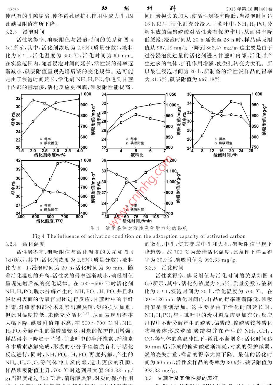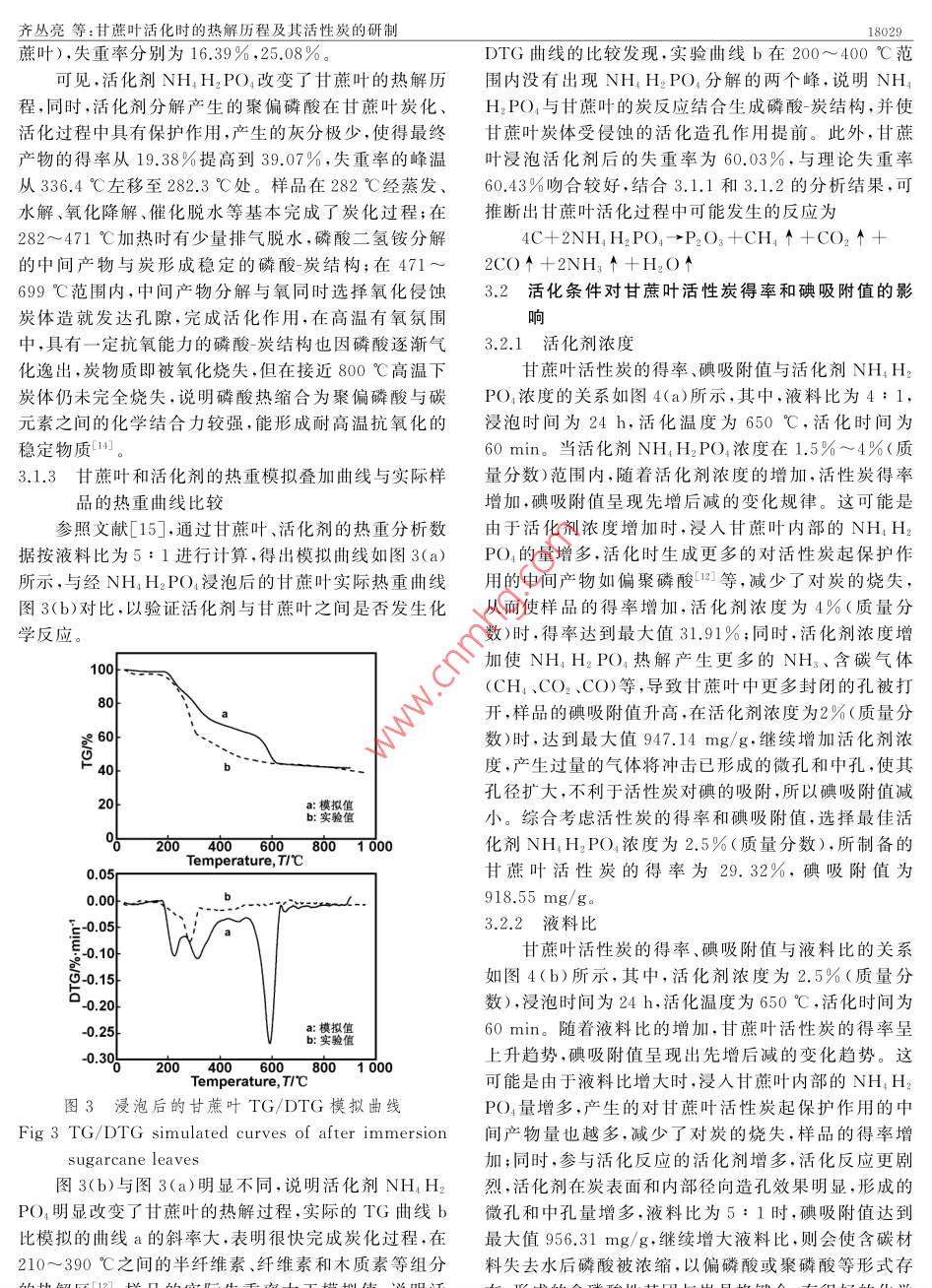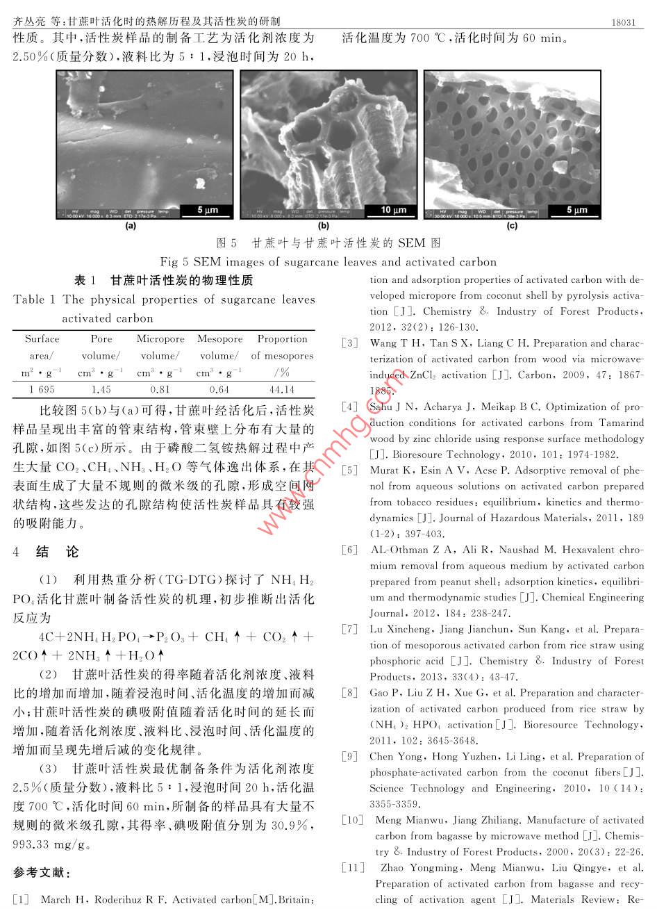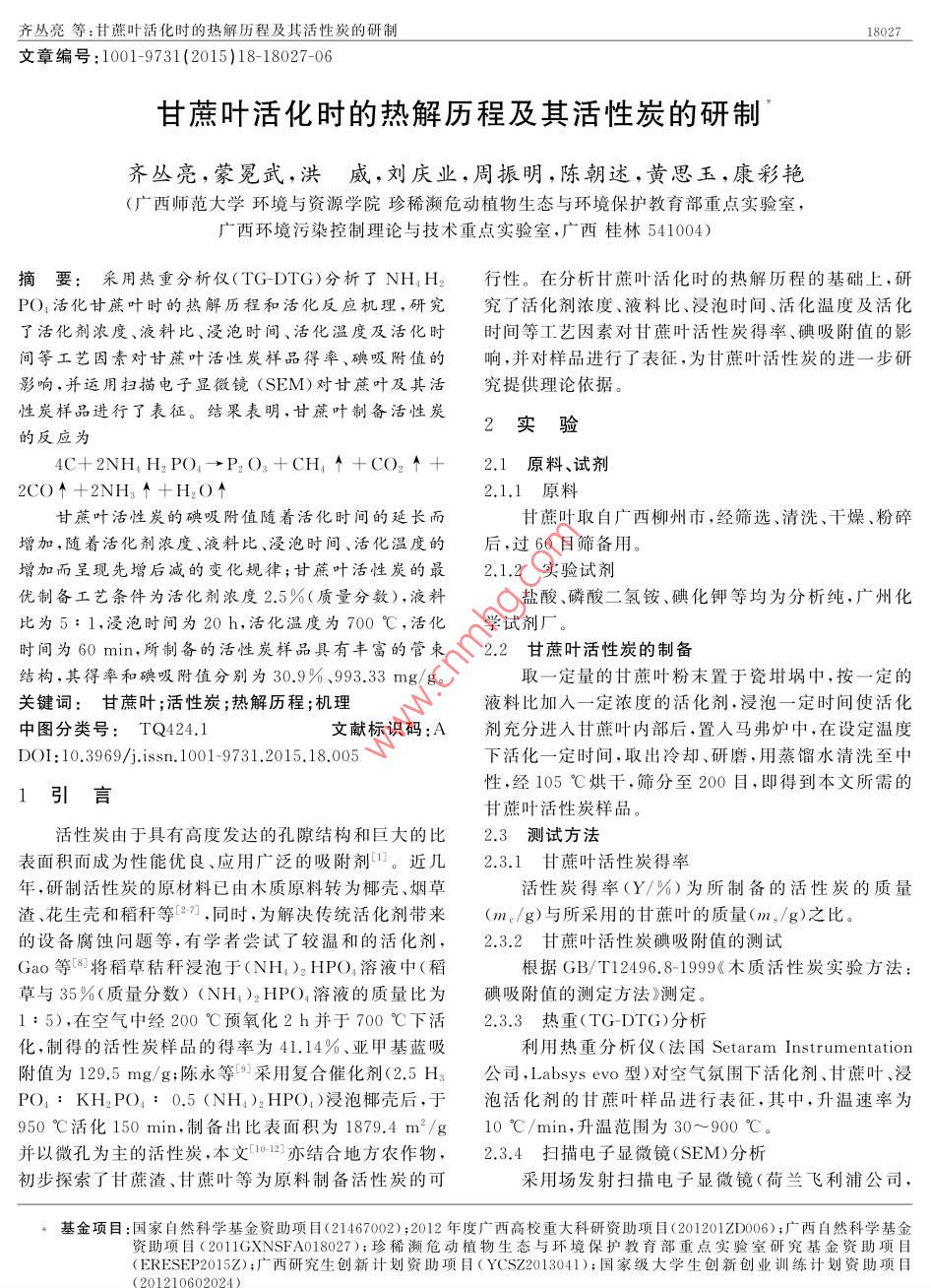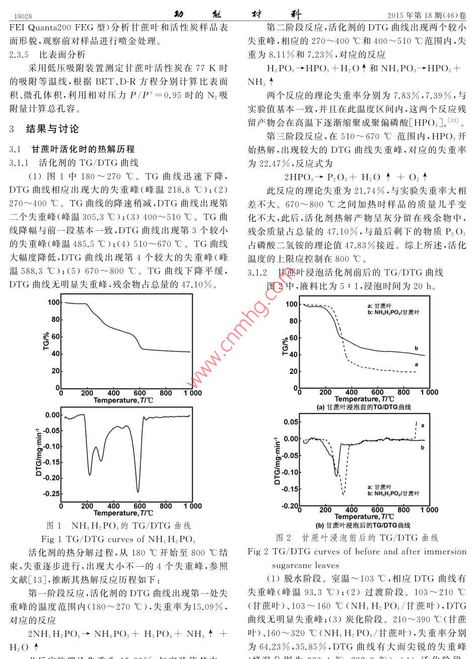 齊叢亮等:甘蔗葉活化時的熱解歷程及其活性炭的研制18027文章編號:1001-9731(2015)18- 18027-06甘蔗葉活化時的熱解歷程及其活性炭的研制齊叢亮,蒙冕武,洪威,劉慶 業(yè),周振明,陳朝述,黃思玉,康彩艷(廣西師范大學環(huán)境與資源學院珍稀瀕危動植物生態(tài)與環(huán)境保護教育部重點實驗室,廣西環(huán)境污染控制理論與技術(shù)重點實驗室,廣西桂林541004)摘要:采用熱重分析儀(TG-DTG)分析了NH,H2行性。在分析甘蔗葉活化時的熱解歷程的基礎(chǔ)上,研PO?;罨收崛~時的熱解歷程和活化反應(yīng)機理,研究究了活化劑濃度、液料比、浸泡時間、活化溫度及活化了活化劑濃度、液料比、浸泡時間、活化溫度及活化時時間等工藝因素對甘蔗葉活性炭得率、碘吸附值的影間等工藝因素對甘蔗葉活性炭祥品得率、碘吸附值的響,并對樣品進行了表征,為甘蔗葉活性炭的進- -步研影響,并運用掃描電子顯微鏡(SEM)對甘蔗葉及其活究提供理論依據(jù)。性炭樣品進行了表征。結(jié)果表明,甘蔗葉制備活性炭2實驗的反應(yīng)為4C+ 2NH: H,PO4→P2O。+CH,↑+CO2↑+2.1 原料、試劑2CO↑+2NH3↑+H2O↑2.1.1原料甘蔗葉活性炭的碘吸附值隨著活化時間的延長而甘蔗葉取自廣西柳州市,經(jīng)篩選、清洗、干燥、粉碎增加,隨著活化劑濃度、液料比、浸泡時間、活化溫度的后,過60目篩備用。增加而呈現(xiàn)先增后減的變化規(guī)律;甘蔗葉活性炭的最2.1.2實驗試劑優(yōu)制備工藝條件為活化劑濃度2.5%(質(zhì)量分數(shù)),液料鹽酸、磷酸二氫銨、碘化鉀等均為分析純,廣州化比為5: 1,浸泡時間為20 h,活化溫度為700 C,活化學試劑廠“。時間為60 min,所制備的活性炭樣品具有豐富的管束2.2甘蔗葉活性炭的制備結(jié)構(gòu),其得率和碘吸附值分別為30.9%、993.33 mg/g。取一定量的甘蔗葉粉末置于瓷坩堝中,按一定的關(guān)鍵詞:甘蔗葉;活性炭;熱解歷程;機理液料比加入一定濃度的活化劑,浸泡一定時間使活化中圖分類號:TQ424.1文獻標識碼:A劑充分進人甘蔗葉內(nèi)部后,置人馬弗爐中,在設(shè)定溫度DOI: 10.3969/jissn.1001-9731.2015.18.005下活化一-定時間,取出冷卻、研磨,用蒸餾水清洗至中性,經(jīng)105°C烘干.篩分至200目,即得到本文所需的1引言甘蔗葉活性炭樣品?;钚蕴坑捎诰哂懈叨劝l(fā)達的孔隙結(jié)構(gòu)和巨大的比2.3 測試方法表面積而成為性能優(yōu)良、應(yīng)用廣泛的吸附劑1。近幾2.3.1甘蔗葉活性炭得率年,研制活性炭的原材料已由木質(zhì)原料轉(zhuǎn)為椰殼、煙草活性炭得率(Y/%)為所制備的活性炭的質(zhì)量渣、花生殼和稻稈等[27],同時,為解決傳統(tǒng)活化劑帶來me/g)與所采用的甘蔗葉的質(zhì)量(m。/g)之比。的設(shè)備腐蝕問題等,有學者嘗試了較溫和的活化劑,2.3.2甘蔗葉活性炭碘吸附值的測試Gao等[8]將稻草秸稈浸泡于(NH,)2HPO,溶液中(稻根據(jù)GB/T12496.8- 1999《木質(zhì)活性炭實驗方法:草與35%(質(zhì)量分數(shù)) (NH;)2HPO,溶液的質(zhì)量比為碘吸附值的測定方法》測定。1 : 5),在空氣中經(jīng)200 C預氧化2 h并于700。C下活2.3.3 熱重(TG DTG)分析化,制得的活性炭樣品的得率為41.14%、亞甲基藍吸利用熱重分析儀(法國Setaram Instrumentation附值為129.5 mg/g;陳永等[Q]采用復合催化劑(2.5 H3公司,Labsys evo型)對空氣氛圍下活化劑、甘蔗葉、浸PO, : KH2PO4 : 0.5 (NH。);HPO, )浸泡椰殼后,于泡活化劑的甘蔗葉樣品進行表征,其中,升溫速率為950 C活化150 min,制備出比表面積為1879.4 m2/g10 °C/min,升溫范圍為30~900 C。并以微孔為主的活性炭,本文[10123亦結(jié)合地方農(nóng)作物,2.3.4掃描電子顯微鏡(SEM分析初步探索了甘蔗渣、甘蔗葉等為原料制備活性炭的可采用場發(fā)射掃描電子顯微鏡(荷蘭飛利浦公司,基金項目:國家自然科學基金資助項目(21467002);2012年度廣西高校重大科研資助項目(201201ZD006);廣西自然科學基金資助項目( 2011GXNSFA018027);珍稀瀕危動植物生態(tài)與環(huán)境保護教育部重點實驗室研究基金資助項目( ERESEP2015Z);廣西研究生創(chuàng)新計劃資助項目( YCSZ2013041);國家級大學生創(chuàng)新創(chuàng)業(yè)訓練計劃資助項目(20121 0602024 )18028材料2015年第18期(46)卷FEI Quanta200 FEG型)分析甘蔗葉和活性炭樣品表第二階段反應(yīng),活化劑的DTG曲線出現(xiàn)兩個較小面形貌,觀察前對樣品進行噴金處理。失重峰,相應(yīng)的270~400 °C和400~510 °C范圍內(nèi),失2.3.5 比表面分析重為8.11%和7.23%,對應(yīng)的反應(yīng)采用低壓吸附裝置測定甘蔗葉活性炭在77 K時H.PO,→HPO3+H2O↑和NHPO3→HPO3+的吸附等溫線,根據(jù)BET.D-R方程分別計算比表面NH3↑積、微孔體積,利用相對壓力P/P°=0.95時的N2吸兩個反應(yīng)的理論失重率分別為7.83%.7.39%,與.附量計算總孔容。實驗值基本--致,并且在此溫度區(qū)間內(nèi),這兩個反應(yīng)殘留產(chǎn)物會在高溫下逐漸縮聚成聚偏磷酸[HPOz][03]。3結(jié)果與討論第三階段反應(yīng),在510~670 °C范圍內(nèi),HPO3開3.1甘蔗葉活化時的熱解歷程始熱解,出現(xiàn)較大的DTG曲線失重峰,對應(yīng)的失重率3.1.1活化劑的 TG/DTG曲線為22.47%,反應(yīng)式為(1)圖1中180~270°C。TG曲線迅速下降,2HPO3→P2O3+ H2O↑+ O2↑DTG曲線相應(yīng)出現(xiàn)大的失重峰(峰溫218.8 C);(2)此反應(yīng)的理論失重為21.74%.與實驗失重率大相270~400 °C。TG曲線的降速稍減,DTG曲線出現(xiàn)第差不大。670~800 °C之間加熱時樣品的質(zhì)量幾乎變