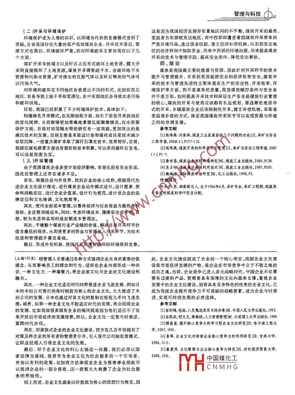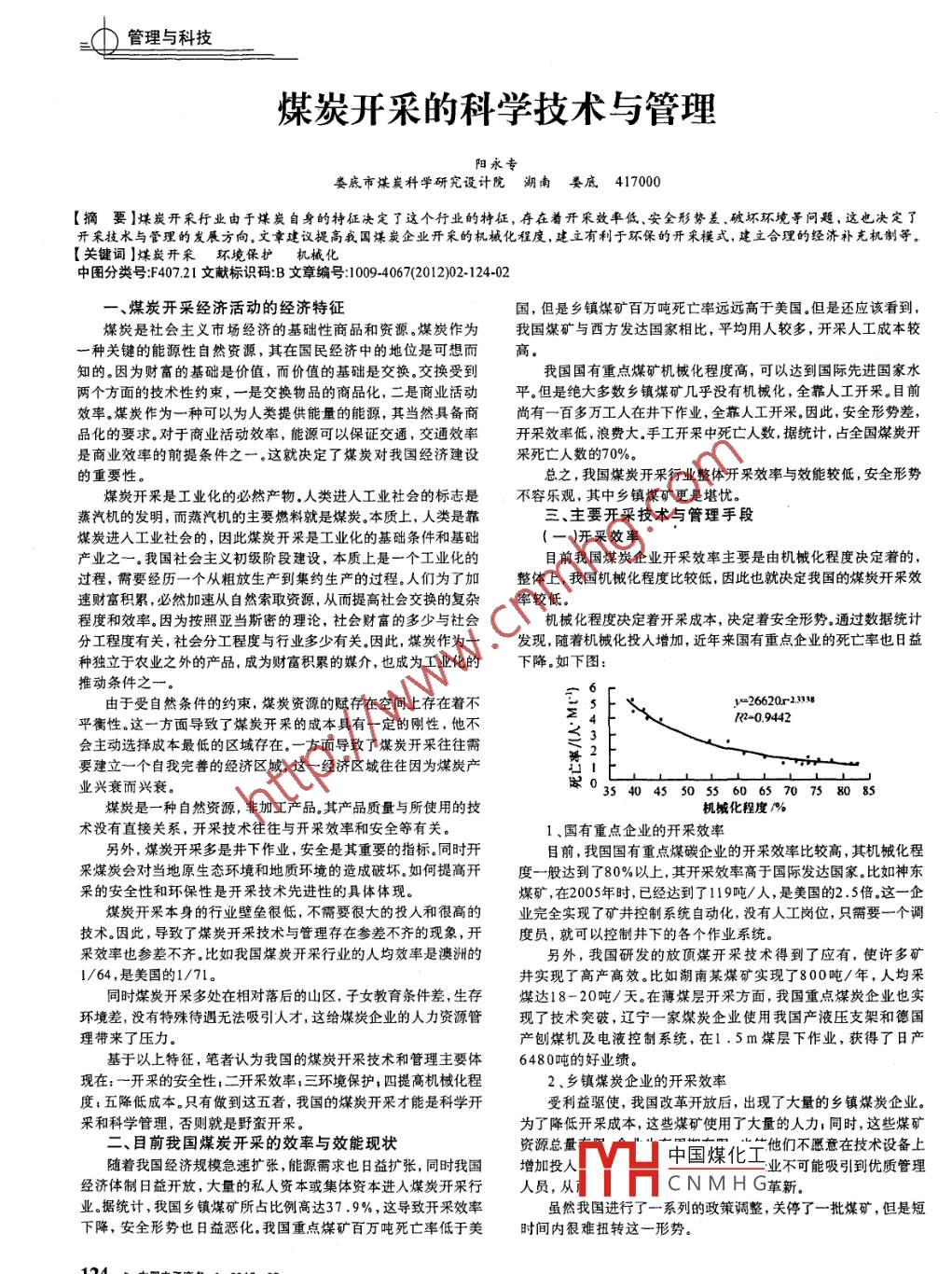 管理與科技煤炭開采的科學(xué)技術(shù)與管理陽永專婁底市煤炭科學(xué)研究設(shè)計院湖南婁底417000[摘要]煤炭開采行業(yè)由于煤炭自身的特征決定了這個行業(yè)的特征,存在著開采效率低、安全形勢差.破壞環(huán)境等問題,這也決定了開采技術(shù)與管理的發(fā)展方向。文章建議提高我國煤炭企業(yè)開采的機(jī)械化程度,建立有利于環(huán)保的開采模式,建立合理的經(jīng)濟(jì)補充機(jī)制等。[關(guān)鍵詞]煤炭開采環(huán)境保護(hù) 機(jī)械化 .中圖分類號:F407.21文獻(xiàn)標(biāo)識碼:B文章編號:1009-4067(2012)02-124-02-、煤炭開采經(jīng)濟(jì)活動的經(jīng)濟(jì)特征國,但是鄉(xiāng)鎮(zhèn)煤礦百萬噸死亡率遠(yuǎn)遠(yuǎn)高于美國.但是還應(yīng)該看到,煤炭是社會主義市場經(jīng)濟(jì)的基礎(chǔ)性商品和資源。煤炭作為我國煤礦與西方發(fā)達(dá)國家相比,平均用人較多,開采人工成本較-種關(guān)鍵的能源性自然資源,其在國民經(jīng)濟(jì)中的地位是可想而高知的。因為財富的基礎(chǔ)是價值,而價值的基礎(chǔ)是交換。交換受到我國國有重點煤礦機(jī)械化程度高,可以達(dá)到國際先進(jìn)國家水兩個方面的技術(shù)性約束,一是交換物品的商品化,二是商業(yè)活動平。但是絕大多數(shù)鄉(xiāng)鎮(zhèn)煤礦幾乎沒有機(jī)械化,全靠人工開采。目前效率.煤炭作為一種可以為人類提供能量的能源,其當(dāng)然具備商尚有一百多萬工人在井下作業(yè),全靠人工開采。因此,安全形勢差,品化的要求。對于商業(yè)活動效率,能源可以保證交通,交通效率開采效率低,浪費大.手工開采中死亡人數(shù),據(jù)統(tǒng)計,占全國煤炭開是商業(yè)效率的前提條件之一.這就決定了煤炭對我國經(jīng)濟(jì)建設(shè)采死亡人數(shù)的70%。的重要性??傊?,我國煤炭開采行業(yè)整體開采效率與效能較低,安全形勢煤炭開采是工業(yè)化的必然產(chǎn)物。人類進(jìn)人工業(yè)社會的標(biāo)志是不容樂觀,其中鄉(xiāng)鎮(zhèn)煤礦更是堪憂。蒸汽機(jī)的發(fā)明,而蒸汽機(jī)的主要燃料就是煤炭。本質(zhì)上,人類是靠三.主要開采技術(shù)與管理手段煤炭進(jìn)入工業(yè)社會的,因此煤炭開采是工業(yè)化的基礎(chǔ)條件和基礎(chǔ)(一)開采效率產(chǎn)業(yè)之一。我國社會主義初級階段建設(shè),本質(zhì)上是一個工業(yè)化的目前我國煤炭企業(yè)開采效率主要是由機(jī)械化程度決定著的,過程,需要經(jīng)歷-個從粗放生產(chǎn)到集約生產(chǎn)的過程。人們?yōu)榱思诱w上,我國機(jī)械化程度比較低,因此也就決定我國的煤炭開采效速財富積累,必然加速從自然索取資源,從而提高社會交換的復(fù)雜率較低。程度和效率。因為按照亞當(dāng)斯密的理論,社會財富的多少與社會機(jī)械化程度決定著開采成本,決定著安全形勢。通過數(shù)據(jù)統(tǒng)計分工程度有關(guān),社會分工程度與行業(yè)多少有關(guān)。因此,煤炭作為一發(fā)現(xiàn), 隨著機(jī)械化投入增加,近年來國有重點企業(yè)的死亡率也日益種獨立于農(nóng)業(yè)之外的產(chǎn)品,成為財富積累的媒介,也成為工業(yè)化的下降。如下圖:推動條件之一。由于受自然條件的約束,煤炭資源的賦存在空間上存在著不y-660-2.331R2-0.9442平衡性。這一方面導(dǎo)致了煤炭開采的成本具有一定的剛性,他不會主動選擇成本最低的區(qū)域存在.-方 面導(dǎo)致了煤炭開采往往需要建立一個自我完普的經(jīng)濟(jì)區(qū)城,這-經(jīng)濟(jì)區(qū)域往往因為煤炭產(chǎn)品!業(yè)興衰而興衰。3540455055606570758085煤炭是一種自然資源,非加工產(chǎn)品。其產(chǎn)品質(zhì)量與所使用的技機(jī)械化程度1%術(shù)沒有直接關(guān)系,開采技術(shù)往往與開采效率和安全等有關(guān)。1.國有重點企業(yè)的開采效率另外,煤炭開采多是井下作業(yè),安全是其重要的指標(biāo).同時開目前,我國國有重點煤碳企業(yè)的開采效率比較高,其機(jī)械化程采煤炭會對當(dāng)?shù)卦鷳B(tài)環(huán)境和地質(zhì)環(huán)境的造成破壞。如何提高開度一般達(dá)到了80%以上,其開采效率高于國際發(fā)達(dá)國家。比如神東采的安全性和環(huán)保性是開采技術(shù)先進(jìn)性的具體體現(xiàn)。煤礦,在2005年時,已經(jīng)達(dá)到了119噸/人,是美國的2.5倍.這一企煤炭開采本身的行業(yè)壁壘很低,不需要很大的投人和很高的業(yè)完全實現(xiàn)了礦井控制系統(tǒng)自動化,沒有人工崗位,只需要一個調(diào)技術(shù)。因此,導(dǎo)致了煤炭開采技術(shù)與管理存在參差不齊的現(xiàn)象,開度員,就可以控制井下的各個作業(yè)系統(tǒng)。采效率也參差不齊。比如我國煤炭開采行業(yè)的人均效率是澳洲的另外,我國研發(fā)的放頂煤開采技術(shù)得到了應(yīng)有,使許多礦1/64,是美國的1/71。井實現(xiàn)了高產(chǎn)高效。比如湖南某煤礦實現(xiàn)了800噸/年,人均采同時煤炭開采多處在相對落后的山區(qū).子女教育條件差,生存煤達(dá)18-20噸/天。在薄煤層開采方面,我國重點煤炭企業(yè)也實環(huán)境差,沒有特殊待遇無法吸引人才,這給煤炭企業(yè)的人力資源管現(xiàn)了技術(shù)突破,遼寧一家煤炭企業(yè)使用我國產(chǎn)液壓支架和德國理帶來了壓力。產(chǎn)刨煤機(jī)及電液控制系統(t