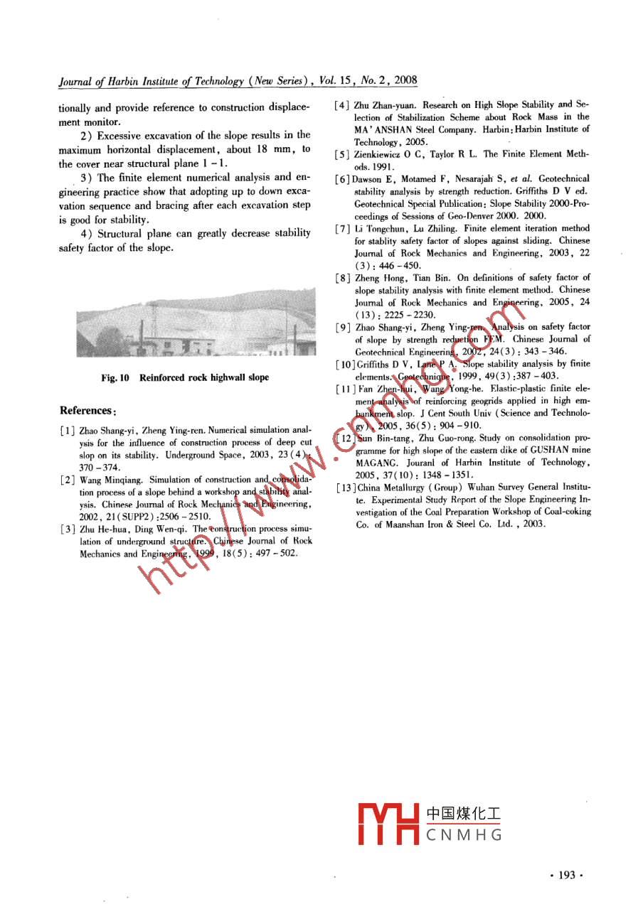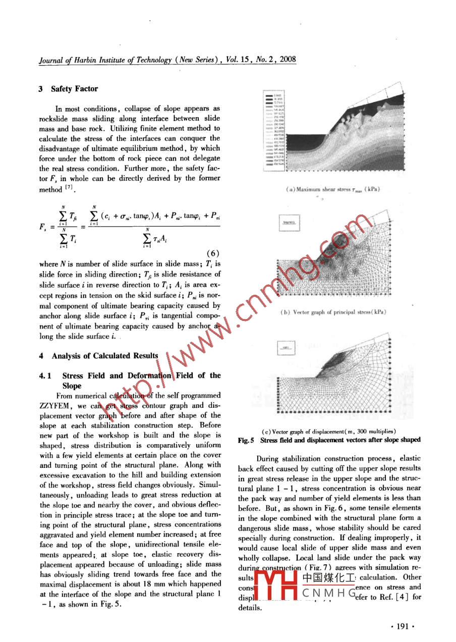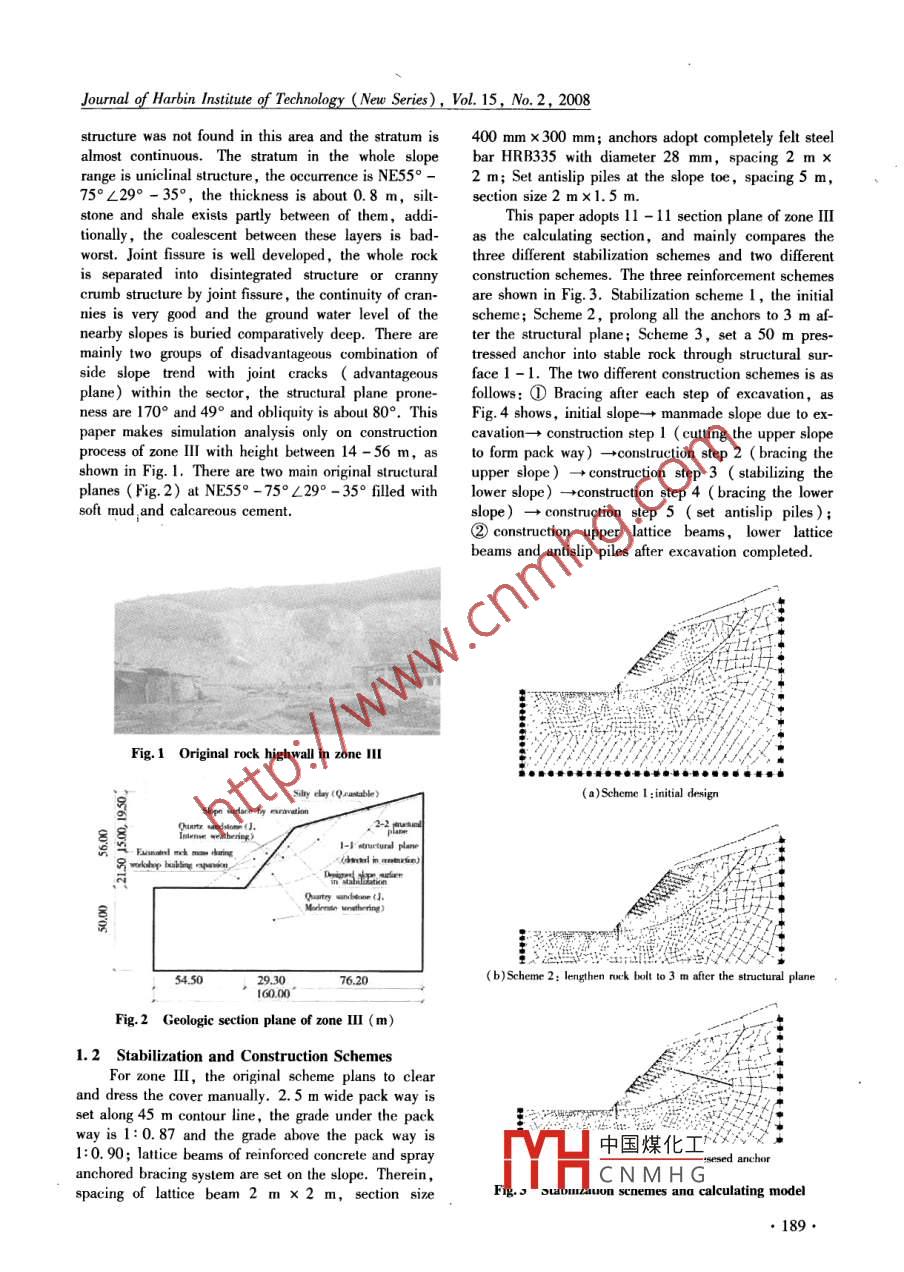 Journal of Harbin Instiute of Technology (New Series), Vol. 15, No.2, 2008Simulation analysis of construction process of high rock slope’s stabilizationZHU Zhan-yuan'i2, LING Xian-zhang',WANG Xuan-qing' , ZOU Zu-yin?朱占元,凌賢長,王宣青,鄒祖銀(1. School of Civil Engineering, Harbin Inslitutle of Teehnology, Harbin 150090, China, E-mail :zhuzywau910@ 163. com; 2. Information and EngineeringTechnology Clle,Sichuan Agriculural University, Ya'an 625014,Chinu; 3. Zhengyuan Construct Compary of Shandong Province,Yantai 26402, China)Abstract: A sel-developed elasto-plastic finite element program was used to analyze the construction sequenceof high rock slope’s stabilization in a coal-coking plant, and the result was compared with that employing theultimate equilibrium method. Based on the results of finite element analysis, the stress contour graphs and dis-placement vector graphs at different constniction steps were obtained, and the behavior of the slope during stabi-lization construction process was analyzed quantitatively. Based on the analysis of safety factors of three diferentschemes of stabilization and two different constnuction schemes, the assessment of stability and bracing design ofthe construetion process were performed. The results show that the original reinforcement design is improper;the stability of the rock slope is cotolled by a developed structural plane , the stability factor after excavation isless than 1, and the free surface should be braced in time; for stability, the construction sequence should adoptthat bracing follows excavation step by step up to down; the local slide occurred during the construction processagrees with the dangerous slide delermined by the numerical analysis 。which proves the validity and rationalityof the adopted method.Key words: high rock slope; stability; stabilization; construction process simulation; elasto-plastic FEMmethouCLC number: U416. 3Document code: AArticle ID: 1005-9113(2008 )02-0188-06From construction mechanics point of view, influ- measures to cover. etc. resulted in cracks on structuralence of construction step of excavation and bracing onplane 1 -1 and local rockslide in zone II, as shown inside slope stability is a very popular subject that deserv-Fig.1. On the background, self-designed elasto-plasticed investigation. Compared with classical ultimate e finite element program ZZYFEM which can simulatequilibrium methods, the finite element method based on construction process of slope was used to do numericaldeformation analysis has many unique advantages ,simulation analysis on three stabilization schemes andwhich provides new method to analysis of rock slope two construction schemes, and comparative sludy wasand has been successfully applied in many engineering done with the results calculated by ultimate equilibriumprojects 1-21. At present, some rockslide took place method.during construction period, in which construction se-quence is one of the important reasons. For deeply dig 1 General Situation of the Projecthighwall slope, excavation and bracing sequence havegreat influence on stability of slope , thus simulation a- 1. 1 Geologic Conditionnalysis for construction process is very important toThe rock highwall slope of the Cokeoven Plant isslope stabilization. Now, only a few papers about simu-close to a workshop used to store coal. For building ex-lation analysis for the construction process using finite tension of the workshop, excavation of the western up-element method can be found. Zhao Shang-yi utilized land shaped a high and steep manual slope which grad-ANSYS to make numerical simulation of the construc-ually heightens from south to north. Height of the slopetion process of slope cutting“; W ang Min-qiang simu- is between5 - 56 m, length about 300 m, slope anglelated the construction process and analyzed the stability. average at about 60° and some part nearly upright. Theof a slope beside a cetain workshop adopting, visco-site mainly belongs 10 low massif physiognomy and ac-elasto-plastic model and a new rheological model4. Jn cording to height, slope gradient, occurtence mode ofexcavation process of rock highwall slope in a coke-oV- the structural plane and level of rock integrity, theen Plant, because of bad geologic condition, neglect oflope is divided into 4 zones marked I, II, I1,andstructural plane 1 - 1 in sile survey coupled with exces-I中國煤化工nsity idegee.sive excavation, late bracing, shortage of protective It wassions basin, faultYHCNMHGReceived 2006 -04 -20.Sponsored by Scienife and Technological Suppont and Guidance Plan Projots of Zhejiang Province( Grant No. 2008C23019).●188●Journal of Harbin Institute of Technology (New Series), Vol. 15,No. 2, 2008structure was not found in this area and the stratum is400 mm x 300 mm; anchors adopt completely felt steelalmost continuous. The stratum in the whole slopebar HRB335 with diameter 28 mm, spacing 2 m xrange is uniclinal structure , the occurrence is NE55° -2 m; Set antislip piles at the slope toe, spacing5 m,75°∠29° - 35°, the thiekness is about 0.8 m, silt-section size 2 mx1.5 m.stone and shale exists partly between of them, addi-This paper adopls 11 - 11 section plane of zone IItionally, the coalescent between these layers is bad-as the calculating section, and mainly compares theworst. Joint fssure is well developed, the whole rockthree different stabilization schemes and two differentis separated into disintegrated structure or crannyconstruction schemes. The three reinforcement schemescrumb structure by joint fissure,the continuity of cran-are shown in Fig. 3. Stabilization scheme 1,the initialnies is very good and the ground water level of thescheme; Scheme 2, prolong all the anchors to3 m af-nearby slopes is buried comparatively deep. There areter the structural plane; Scheme 3, set a 50 m pres- .mainly two groups of disadvantageous combination 0tressed anchor into stable rock through structural sur-side sl