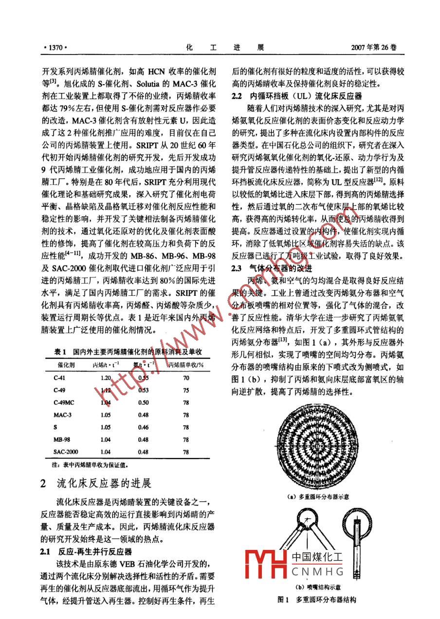 化工進(jìn)展2007年第26卷第10期CHEMICAL INDUSTRY AND ENGINEERING PROGRESS·1369·丙烯腈生產(chǎn)技術(shù)進(jìn)展吳糧華(中國石化上海石油化工研究院,上海201208)摘要:重點(diǎn)論述了丙烯腈催化劑、流化床反應(yīng)器及丙烯腈生產(chǎn)中環(huán)保節(jié)能降耗等生產(chǎn)技術(shù)的進(jìn)展,并展望了丙烯腈生產(chǎn)技術(shù)的發(fā)展關(guān)鍵詞:丙烯腈;氣氧化;催化劑;生產(chǎn)技術(shù)中圖分類號:TQ226文獻(xiàn)標(biāo)識碼:A文章編號:1000-6613(2007)10-1369-05Advances in the Production Technology of AcrylonitrilewU LianghuaShanghai Research Institute of Petrochemical Technology, SINOPEC, Shanghai 201208, China)Abstract: Acrylonitrile is a kind of important chemical raw material. In this paper, technicaldevelopment of acrylonitrile were elaborated in details. and the main directions of acrylonitrile catalystsKeywords: acrylonitrile; ammoxidation; catalyst; production technology丙烯腈是一種重要的化工原料,主要用來合成工藝自問世以來,工藝上沒有重大的改進(jìn),主要以聚丙烯腈纖維、ABS/SAN樹脂、己二腈、丙烯酰胺、研究新型催化劑為主及新型流化床反應(yīng)器的開發(fā),碳纖維等。丙烯腈于1893年由法國化學(xué)家首次制同時(shí)開展以節(jié)能降耗、環(huán)保等為目標(biāo)的工藝技術(shù)改得,但直到20世紀(jì)40年代丙烯腈才開始工業(yè)化生造,以提高裝置效率。進(jìn)入到90年代后,丙烷氨氧產(chǎn)。1960年, INEOS/BP( Sohio)成功地開創(chuàng)了由化制丙烯腈成為研究的熱點(diǎn)。丙烯、氨和空氣在多相催化下于流化床反應(yīng)器中直接氨氧化制造丙烯腈的新工藝,帶動了a烯烴選I催化劑的研究開發(fā)擇性氧化及相關(guān)學(xué)科的全面發(fā)展。從丙烯、異丁烯催化劑始終是丙烯腈生產(chǎn)的核心。各主要的丙等為原料,選擇性氧化反應(yīng)制備丙烯醛(酸)、丙烯烯腈技術(shù)開發(fā)商都著重于高性能催化劑的開發(fā),目腈、甲基丙烯醛(酸)、甲基丙烯腈等都已得到廣泛前居于世界先進(jìn)水平的催化劑有美國ⅣEOS/BP公工業(yè)化。目前用于此類反應(yīng)的工業(yè)化催化劑都是多司C49MC、旭化成工業(yè)公司的S催化劑、 Solutia組份復(fù)合金屬氧化物體系,主要的活性組分是鉬鉍公司的MAC3及上海石油化工研究院(SRIT)的鹽等四。由于新工藝具有過程簡單、操作方便、原MB98、SAC200等。 INEOS/BP是這一領(lǐng)域最重料易得、成本低等優(yōu)點(diǎn), Sohio工藝自開發(fā)成功后要的公司之一,其開發(fā)的催化劑從最初的磷鉬酸鉍迅速在世界范圍內(nèi)推廣,而同一時(shí)期,英國的催化劑,丙烯腈收率60%左右,到70年代的C-41Distillers公司、法國的 Ugine公司、意大利的催化劑,收率提高到了70%,之后又相繼推出了Montedison公司和SNAM公司及奧地利的O.SWC49和C-49mc催化劑,將丙烯腈的收率進(jìn)一步提公司雖然也分別開發(fā)出了自己的丙烯氨氧化催化劑高至中國煤化工 INEOS/BP也在和工藝,但由于技術(shù)和經(jīng)濟(jì)上無法和 Sohio工藝競CNMH爭,因此這些工藝已完全淡出市場。目前全世界丙收稿日烯腈的生產(chǎn)幾乎都采用 Sohio的內(nèi)烯氨氧化工藝。作者簡介吳糧華(1960-),男,高級工程師,主要從事丙烯腈工業(yè)催化劑及丙烯腩成套工藝技術(shù)的研究開發(fā)。電話021-68468623該工藝經(jīng)40多年的發(fā)展,工藝技術(shù)已非常成熟。該B-miwu@sript.com.co.1370·化工進(jìn)展2007年第26卷開發(fā)系列丙烯腈催化劑,如高HCN收率的催化劑后的催化劑有很好的粒度和適度的活性,可以獲得較等。旭化成的S催化劑、 Solutia的MAC3催化高的丙烯睛收率及保持催化劑良好的穩(wěn)定性劑在工業(yè)裝置上都取得了不俗的業(yè)績,丙烯腈收率22內(nèi)循環(huán)擋板(UL)流化床反應(yīng)器都達(dá)79%左右,但使用S催化劑需對反應(yīng)器作必要隨著人們對丙烯腈技術(shù)的深入研究,尤其是對丙的改造,MAC3催化劑含有放射性元素U,因此造烯氨氧化反應(yīng)催化劑的表面價(jià)態(tài)變化和反應(yīng)動力學(xué)成了這2種催化劑推廣應(yīng)用的難度,目前僅在自己的研究,提出了多種在流化床內(nèi)設(shè)置內(nèi)部構(gòu)件的反應(yīng)公司的丙烯腈裝置上使用。 SRIPT從20世紀(jì)60年器類型。在中國石化總公司的組織下,研究者在深入代初開始丙烯腈催化劑的研究開發(fā),先后開發(fā)成功研究丙烯氨氧化催化劑的氧化還原、動力學(xué)行為及9代丙烯腈工業(yè)催化劑,成功地應(yīng)用于國內(nèi)的丙烯提升管反應(yīng)器傳遞特性的基礎(chǔ)上,提出了新型的內(nèi)循腈工廠。特別是在80年代后,SRPT充分利用現(xiàn)代環(huán)擋板流化床反應(yīng)器,簡稱為UL型反應(yīng)器1。原料催化理論和基礎(chǔ)研究成果,深入研究了催化劑電荷以較低的氧烯比進(jìn)入床層下部,得到高的丙烯腈選擇平衡、晶格缺陷及晶格氧遷移對催化劑反應(yīng)性能和性,然后通過氧的二次布?xì)馐勾矊由喜康难跸┍容^穩(wěn)定性的影響,并開發(fā)了關(guān)鍵相法制備丙烯腈催化高,獲得高的丙烯轉(zhuǎn)化率,從而使總的丙烯腈收得到劑的技術(shù),通過氧化還原對的優(yōu)化及催化劑表面酸提高。反應(yīng)器通過設(shè)置的內(nèi)構(gòu)件,使催化劑實(shí)現(xiàn)內(nèi)循性的修飾,提高了催化劑在較高壓力和負(fù)荷下的反環(huán),消除了低氧烯比區(qū)域催化劑容易