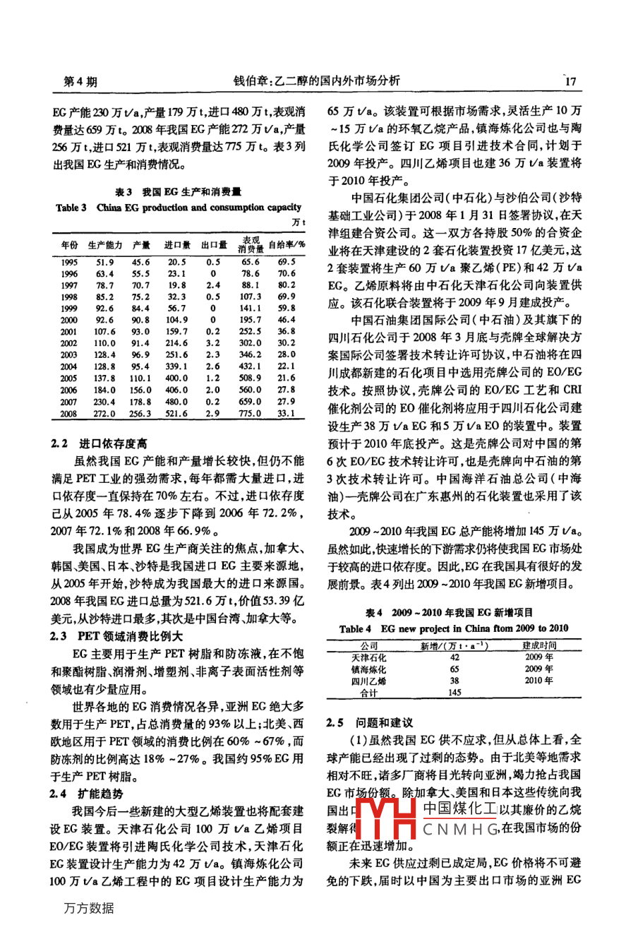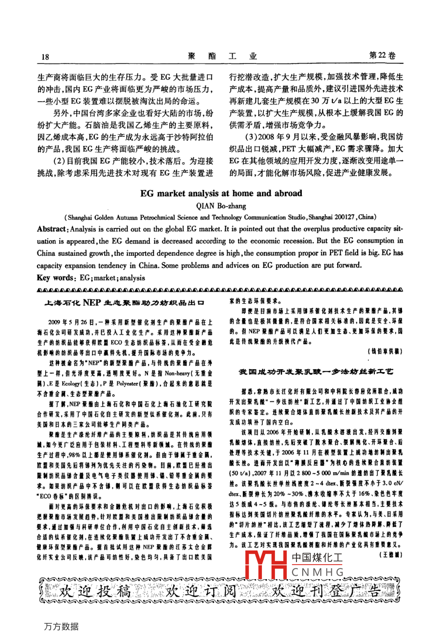 第22卷第4期聚酯工業(yè)Vol 22 No 4200907Polyester IndustryJuly 2009doi:10.396/iisn.10088261,2009.04.005乙二醇的國內(nèi)外市場(chǎng)分析錢伯章(上海金秋石化科技傳播工作室,上海200127)摘要:對(duì)EG的全球市場(chǎng)進(jìn)行了分析。指出EG產(chǎn)能出現(xiàn)過剩態(tài)勢(shì)經(jīng)濟(jì)衰退將使需求下降。中國的EG消費(fèi)量持續(xù)增長(zhǎng),進(jìn)口依存度高,PET領(lǐng)域的消費(fèi)比例大,EG有擴(kuò)能趨勢(shì)。并對(duì)EG生產(chǎn)提出了問題和建議關(guān)鍵詞:EC;市場(chǎng);分析中圖分類號(hào):TQ323.41文獻(xiàn)標(biāo)識(shí)碼:A文章編號(hào):1008-8261(2009)040015041全球市場(chǎng)分析面對(duì)亞洲特別是中國迅速擴(kuò)大的消費(fèi)市場(chǎng),全1.1產(chǎn)能出現(xiàn)過剩態(tài)勢(shì)球EG市場(chǎng)正掀起一股擴(kuò)能高潮,世界各大公司均據(jù)統(tǒng)計(jì)全球BG的生產(chǎn)能力逐年上升,2年約加緊新建和擴(kuò)建EC產(chǎn)能,預(yù)計(jì)2010年總產(chǎn)能將達(dá)為1471萬t,02年約為154萬t,20年為164萬到2709.3萬Ua,今后幾年供應(yīng)過剩已成定局。同t,004年為164萬,05年達(dá)167萬t,00和2007時(shí),以中東為主的產(chǎn)能新增地和以中國為主的亞洲年分別達(dá)1780萬t和1941萬t,2008年為2187萬t,消費(fèi)地的崛起將強(qiáng)力沖擊全球EG市場(chǎng)格局,使供預(yù)計(jì)200年將達(dá)2388萬t表1列出截至2008年統(tǒng)銷結(jié)構(gòu)發(fā)生重大變化。計(jì)的各國和地區(qū)EG和環(huán)氧乙烷(EO)的生產(chǎn)能力。陶氏化學(xué)是最大的EG生產(chǎn)企業(yè),產(chǎn)能320萬表12008年全球EO/EG生產(chǎn)能力t/a,占全球總產(chǎn)能的188%,生產(chǎn)廠主要分布在美Table1 World Eo/ EG production capacity in2008國、加拿大荷蘭和英國。第二大生產(chǎn)商是沙特東方萬va石化公司( Sharq),產(chǎn)能156.5萬va,約占全球的國家地區(qū)o(環(huán)氧乙烷EG(乙二醇)9.2%。位列第三的是殼牌化學(xué)公司,產(chǎn)能99.5萬美國344.6加拿大a,約占全球總產(chǎn)能的59%,生產(chǎn)廠主要分布在加壘西哥拿大、美國和荷蘭。到2010年,沙特東方石化公司35.0委內(nèi)璞拉的EG生產(chǎn)能力將超過330萬a,從而取代陶氏化比利時(shí)學(xué)成為全球最大的EG生產(chǎn)商。22.0110.032.7近年來,EG生產(chǎn)基地正加速向中東轉(zhuǎn)移。200荷蘭~2010年全球EC新增產(chǎn)能超過800萬Ua,其中超波西班牙過500萬ta的產(chǎn)能集中在沙特、伊朗、科威特等中瑞典11.5英國31.825.0東國家。如科威特伊奎特2·60萬a項(xiàng)目、沙特東俄羅斯64.050.0方石化470萬∽a項(xiàng)目、沙特延布的360萬∽a項(xiàng)東歐其他國家12.01483.295.0目于2008年投產(chǎn);伊朗哈爾克島(Khrg)50萬t/a科威特87.5項(xiàng)目和伊朗國家石化公司40萬va項(xiàng)目分別于抄特阿拉伯557.82008年下半年和2009年第4季度投產(chǎn);沙特阿美土耳其澳大利亞石油公司的80萬ta項(xiàng)目和沙特朱拜勒的3·675230.481.5萬ta項(xiàng)目分別定于2009年第2季度和2010年第印度尼西亞21.64季度投產(chǎn)。另外,委內(nèi)瑞拉??松梨?0萬ta103.689.0多國115.0134.8項(xiàng)目200年第2季度投產(chǎn);新加坡殼牌50萬a項(xiàng)馬來西亞38.5目2009年第4季度投產(chǎn)。中東新增的EG產(chǎn)能基新加坡中國臺(tái)灣203.5240.0本上YH中國煤化工中國為主32.5CNMHG的亞洲生產(chǎn)商將收稿日期:20090323。作者簡(jiǎn)介:錢伯章(1939-),男,江蘇南通人,高級(jí)工程師從事石油化工技術(shù)和經(jīng)濟(jì)信息的調(diào)研、傳播工作。聚酯工業(yè)第22卷必須加強(qiáng)在中國市場(chǎng)上的自我保護(hù),以應(yīng)對(duì)中東供需求將達(dá)2000萬t,供應(yīng)能力將達(dá)2080萬t。EG應(yīng)商的挑戰(zhàn),中東供應(yīng)商的生產(chǎn)成本相對(duì)要低50%供應(yīng)在2009年將繼續(xù)出現(xiàn)過剩。80%。預(yù)測(cè)今后幾年全球BC的消費(fèi)量將以年均48%美國、歐洲和日本的一些裝置將因競(jìng)爭(zhēng)能力較的速度增長(zhǎng),到2010年的總消費(fèi)量將達(dá)到約2110弱而被迫關(guān)閉,其中美國的裝置將占據(jù)多數(shù)萬t。從目前來看,亞洲是EG的主要消費(fèi)地區(qū),其雖然從總體上看,全球EG產(chǎn)能已經(jīng)出現(xiàn)過剩消費(fèi)量占全球EC總消費(fèi)量的60%以上,其中主要態(tài)勢(shì),但亞洲地區(qū)的產(chǎn)量卻不能滿足實(shí)際的需求每需求來自中國。年都得大量進(jìn)口,中國市場(chǎng)EC更是供不應(yīng)求。作EG的增產(chǎn)主要靠以中國為中心的亞洲市場(chǎng)消為世界最大的消費(fèi)國,中國2008年消費(fèi)量占世界消化吸收。供應(yīng)過剩局面形成后,亞洲EG合同價(jià)格費(fèi)量的30%,外銷市場(chǎng)的一半將集中到中國。2008和現(xiàn)貨價(jià)格均下跌。價(jià)格下跌的壓力將使以中國為2010年,中國將新增產(chǎn)能221萬ta,其中已通過主要出口市場(chǎng)的亞洲EG生產(chǎn)商面臨巨大的生存壓審批的有161萬a力,同時(shí)也將影響到中國的EG生產(chǎn)商。盡管有運(yùn)未來幾年中國必將成為EG廠商競(jìng)相搶占的費(fèi)上的優(yōu)勢(shì)以及關(guān)稅的保護(hù),但對(duì)于一些小型EG市場(chǎng)。隨著亞洲地區(qū)大型EG項(xiàng)目的投產(chǎn),這一地生產(chǎn)商來說將難以避免被淘汰出局的命運(yùn)。區(qū)EC產(chǎn)品長(zhǎng)期供不應(yīng)求的矛盾將會(huì)得到一定程度2中