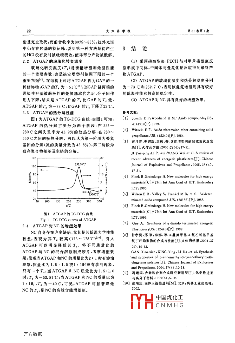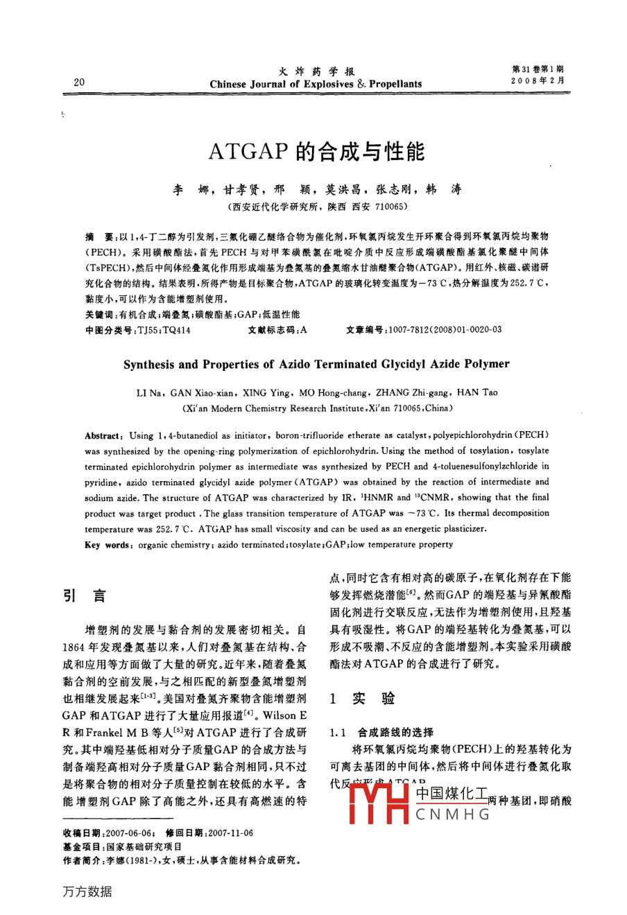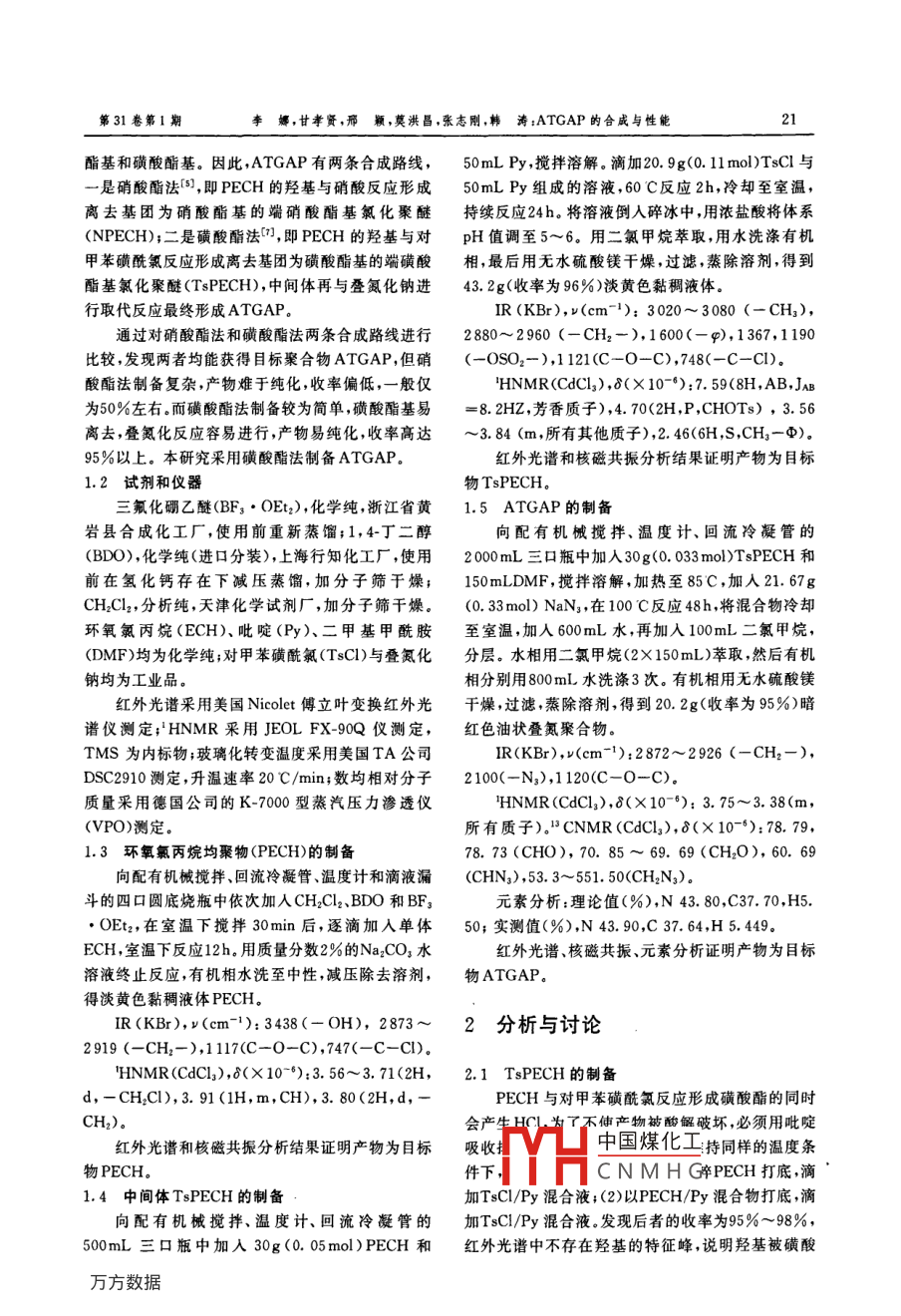 火炸藥學(xué)報第31卷第1期20Chinese Journal of Explosives & Propellants2008年2月!ATGAP的合成與性能李娜,甘孝賢,邢穎,莫洪昌,張志剛,韓濤(西安近代化學(xué)研究所,陜西西安710065)摘要:以1,4丁二醇為引發(fā)劑,三氟化硼乙醚絡(luò)合物為催化劑,環(huán)氧氯丙烷發(fā)生開環(huán)聚合得到環(huán)氧氯丙烷均聚物(PECH)。采用磺酸酯法,首先PECH與對甲苯磺酰氯在吡啶介質(zhì)中反應(yīng)形成端磺酸酯基氯化聚醚中間體(TsPECH),然后中間體經(jīng)疊氮化作用形成端基為疊氨基的疊氮縮水甘油醚聚合物(ATGAP)。用紅外、核磁、碳諧研究化合物的結(jié)構(gòu)。結(jié)果表明,所得產(chǎn)物是目標(biāo)聚合物,ATGAP的玻璃化轉(zhuǎn)變溫度為-73 C ,熱分解溫度為252.7C,黏度小,可以作為含能增塑劑使用。關(guān)鍵詞:有機(jī)合成;端疊氮;磺酸酯基;GAP;低溫性能中圖分類號:TJ55;TQ414文獻(xiàn)標(biāo)志碼;A文章編號:1007-7812(2008)01-0020-03Synthesis and Properties of Azido Terminated Glycidyl Azide PolymerLI Na, GAN Xiao xian, XING Ying, MO Hong-chang, ZHANG Zhi- gang, HAN Tao(Xi! an Modern Chemistry Research Institute ,Xi'an 710065 ,China)Abstract; Using 1, 4-butanediol as initiator, boron tifluoride etherate as catalyst, polyepichlorohydrin (PECH)was synthesized by the opening -ring polymerization of epichlorohydrin. Using the method of tosylation, tosylateterminated epichlorohydrin polymer as intermediate was synthesized by PECH and 4-toluenesulfonylzchloride inpyridine, azido terminated glycidyl azide polymer (ATGAP) was obtained by the reaction of intermediate andsodium azide. The structure of ATGAP was characterized by IR, IHNMR and "CNMR, showing that the finalproduct was target product . The glass transition temperature of ATGAP was- 73 C. Its thermal decompositiontemperature was 252. 7 C. ATGAP has small viscosity and can be used as an energetic plasticizer.Key words: organic chemistry; azido terminated;tosylate ;GAP ;low temperature property點,同時它含有相對高的碳原子,在氧化劑存在下能引言夠發(fā)揮燃燒潛能[°。然而GAP的端羥基與異氰酸酯固化劑進(jìn)行交聯(lián)反應(yīng),無法作為增塑劑使用,且羥基.增塑劑的發(fā)展與黏合劑的發(fā)展密切相關(guān)。自具有吸濕性。將GAP的端羥基轉(zhuǎn)化為疊氮基,可以1864年發(fā)現(xiàn)疊氮基以來,人們對疊氮基在結(jié)構(gòu)、合形成不吸潮、不反應(yīng)的含能增塑劑.本實驗采用磺酸成和應(yīng)用等方面做了大量的研究。近年來,隨著疊氮酯法對ATGAP的合成進(jìn)行了研究。黏合劑的空前發(fā)展,與之相匹配的新型疊氮增塑劑也相繼發(fā)展起來[1-3。美國對疊氮齊聚物含能增塑劑l實驗GAP和ATGAP進(jìn)行了大量應(yīng)用報道"]。Wilson ER和FrankelMB等人[5)對ATGAP進(jìn)行了合成研1.1合成路線的選擇究。其中端羥基低相對分子質(zhì)量GAP的合成方法與將環(huán)氧氯丙烷均聚物(PECH)上的羥基轉(zhuǎn)化為制備端羥高相對分子質(zhì)量GAP黏合劑相同,只不過可離去基團(tuán)的中間體,然后將中間體進(jìn)行疊氮化取是將聚合物的相對分子質(zhì)量控制在較低的水平。含代反 嚴(yán)央ATG中國煤化工兩種基團(tuán),即硝酸能增塑劑GAP除了高能之外,還具有高燃速的特TYHCNMHG收稿日期:2007-06-06;修 回日期2007-11-06基金項目:國家基礎(chǔ)研究項目作者簡介;李娜<1981-),女,碩士,從事含能材料合成研究。第31卷第1期李娜,甘孝賢,邢 穎,莫洪昌,張志剛,韓 濤:ATGAP 的合成與性能酯基和磺酸酯基。因此,ATGAP有兩條合成路線,50mL Py ,攪拌溶解。滴加20.9g(0. 11 mol)TsCl與一是硝酸酯法[5],即PECH的羥基與硝酸反應(yīng)形成50mLPy組成的溶液,60C反應(yīng)2h,冷卻至室溫,離去基團(tuán)為硝酸酯基的端硝酸酯基氯化聚醚持續(xù)反應(yīng)24h.將溶液倒人碎冰中,用濃鹽酸將體系(NPECH);二是磺酸酯法"],即PECH的羥基與對pH值調(diào)至5~6。用二氯甲烷萃取,用水洗滌有機(jī)甲苯磺酰氯反應(yīng)形成離去基團(tuán)為磺酸酯基的端磺酸相,最后用無水硫酸鎂干燥,過濾,蒸除溶劑,得到酯基氯化聚醚(TsPECH),中間體再與疊氮化鈉進(jìn)43. 2g(收率為96%)淡黃色黏稠液體。行取代反應(yīng)最終形成ATGAP.IR (KBr),v(cm-1): 3020~ 3080 (一CH3),通過對硝酸酯法和磺酸酯法兩條合成路線進(jìn)行2880~2960 (一CH2- ),1600(- p),1367,1190比較,發(fā)現(xiàn)兩者均能獲得目標(biāo)聚合物ATGAP,但硝(-OSO2-),1121(C-0-C),748(-C-Cl).酸酯法制備復(fù)雜,產(chǎn)物難于純化,收率偏低,一般僅'HNMR(CdClz),8(X 10-*):7.59(8H,AB,JAB為50%左右。而磺酸酯法制備較為簡單,磺酸酯基易= 8.2HZ,芳香質(zhì)子),4.70<2H,P ,CHOTs),3. 56離去,疊氮化反應(yīng)容易進(jìn)行,產(chǎn)物易純化,收率高達(dá)~3.84 (m,所有其他質(zhì)子),2.46(6H,S,CH3-中)。95%以上。本研究采用磺酸酯法制備ATGAP.紅外光譜和核磁共振分析結(jié)果證明產(chǎn)物為目標(biāo)1.2試劑和儀 器物TsPECH.三氟化硼乙醚(BF;●OEt2),化學(xué)純,浙江省黃1.5 ATGAP的制備巖縣合成化工廠,使用前重新蒸餾;1,4丁二醇向配有機(jī)械攪拌、溫度計、回流冷凝管的.(BDO) ,化學(xué)純(進(jìn)口分裝),上海行知化工廠,使用2 000mL三口瓶中加人30g(0.033 mol)TsPECH和前在氫化鈣存在下減壓蒸餾,加分子篩干燥;150mLDMF,攪拌溶解,加熱至85C,加入21.67gCH2Cl2,分析純,天津化學(xué)試劑廠,加分子篩干燥。(0. 33 mol) NaNs,在100 C反應(yīng)48h,將混合物冷卻環(huán)氧氯丙烷(ECH)、吡啶(Py)、二甲基甲酰胺至室溫,加入600mL水,再加入100mL二氯甲烷,(DMF)