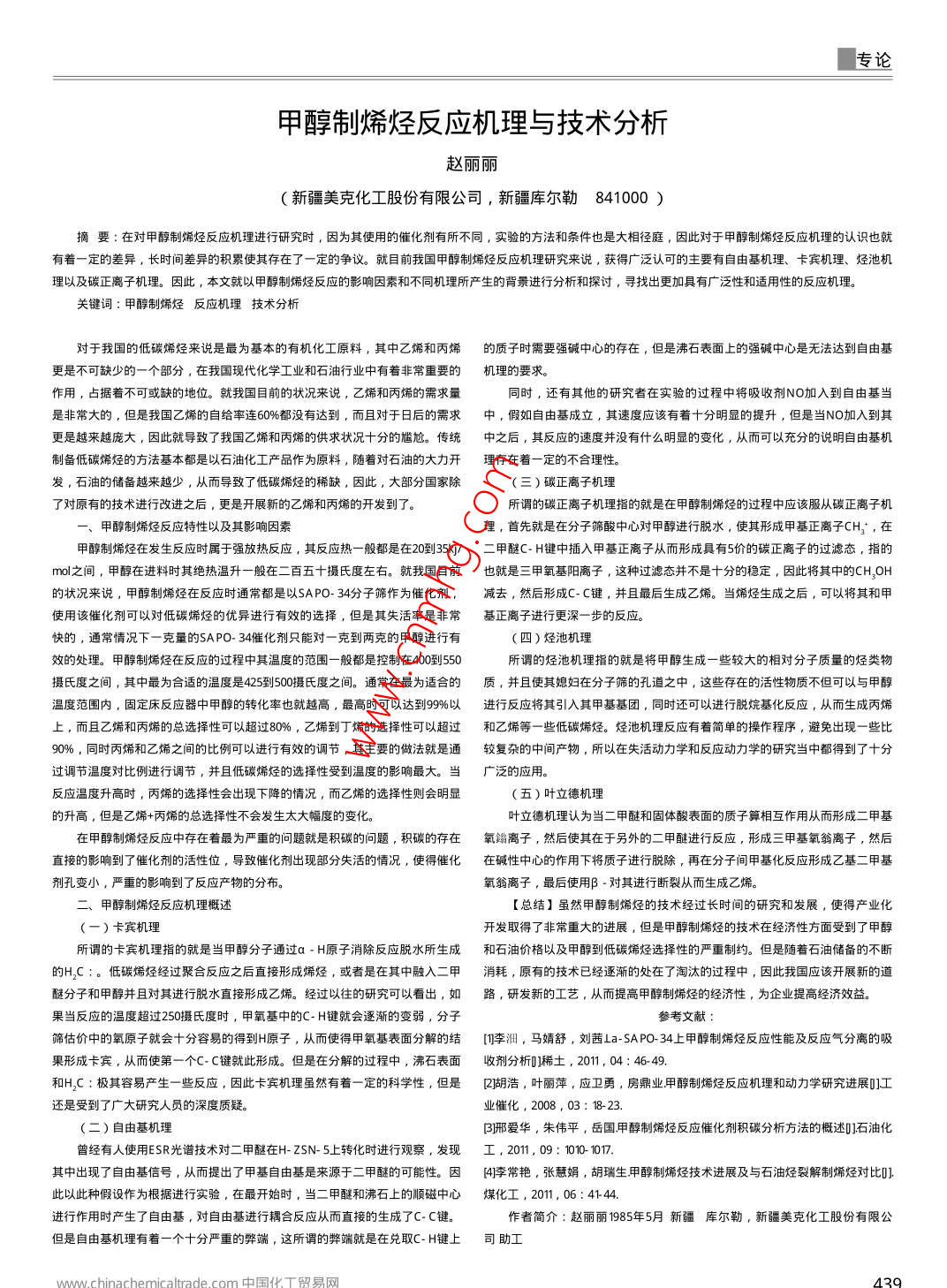 專論甲醇制烯烴反應(yīng)機(jī)理與技術(shù)分析趙麗麗(新疆美克化工股份有限公司,新疆庫爾勒841000 )摘要:在對(duì)甲醇制烯烴反應(yīng)機(jī)理進(jìn)行研究時(shí),因?yàn)槠涫褂玫拇呋瘎┯兴煌?實(shí)驗(yàn)的方法和條件也是大相徑庭,因此對(duì)于甲醇制烯烴反應(yīng)機(jī)理的認(rèn)識(shí)也就有著一定的差異,長(zhǎng)時(shí)間差異的積累使其存在了-定的爭(zhēng)議。就目前我國甲醇制烯烴反應(yīng)機(jī)理研究來說,獲得廣泛認(rèn)可的主要有自由基機(jī)理、卡賓機(jī)理、烴池機(jī)理以及碳正離子機(jī)理。因此,本文就以甲醇制烯烴反應(yīng)的影響因素和不同機(jī)理所產(chǎn)生的背景進(jìn)行分析和探討,尋找出更加具有廠泛性和適用性的反應(yīng)機(jī)理。關(guān)鍵詞:甲醇制烯烴反應(yīng)機(jī)理技術(shù)分析對(duì)于我國的低碳烯烴來說是最為基本的有機(jī)化工原料,其中乙烯和丙烯的質(zhì) 子時(shí)需要強(qiáng)堿中心的存在,但是沸石表面上的強(qiáng)堿中心是無法達(dá)到自由基更是不可缺少的一個(gè)部分,在我國現(xiàn)代化學(xué)工業(yè)和石油行業(yè)中有著非常重要的機(jī)理的要 求。作用,占據(jù)著不可或缺的地位。就我國目前的狀況來說,乙烯和丙烯的需求量同時(shí),還有其他的研究者在實(shí)驗(yàn)的過程中將吸收劑NO加入到自由基當(dāng)是非常大的,但是我國乙烯的自給率連60%都沒有達(dá)到,而且對(duì)于日后的需求中 , 假如自由基成立,其速度應(yīng)該有著十分明顯的提升,但是當(dāng)NO加入到其更是越來越龐大,因此就導(dǎo)致了我國乙烯和丙烯的供求狀況十分的尷尬。傳統(tǒng)中之后 ,反應(yīng)的速度并沒有什么明顯的變化,從而可以充分的說明自由基機(jī)制備低碳烯烴的方法基本都是以石油化工產(chǎn)品作為原料,隨著對(duì)石油的大力開理存在著一 定的不合理性。發(fā),石油的儲(chǔ)備越來越少,從而導(dǎo)致了低碳烯烴的稀缺, 因此,大部分國家除(三)碳正離子機(jī)理了對(duì)原有的技術(shù)進(jìn)行改進(jìn)之后,更是開展新的乙烯和丙烯的開發(fā)到了。所謂的碳正離子機(jī)理指的就是在甲醇制烯烴的過程中應(yīng)該服從碳正離子機(jī)一、 甲醇制烯烴反應(yīng)特性以及其影響因素里,首先就是在分子篩酸中心對(duì)甲醇進(jìn)行脫水,使其形成甲基正離子CH2* ,在甲醇制烯烴在發(fā)生反應(yīng)時(shí)屬于強(qiáng)放熱反應(yīng),反應(yīng)熱一般都是在20到35kj/二甲醚C-H鍵中插入甲基正離子從而形成具有5價(jià)的碳正離子的過濾態(tài),指的mol之間,甲醇在進(jìn)料時(shí)其絕熱溫升一般在二百五+攝氏度左右。就我國目前也就是 三甲氧基陽離子, 這種過濾態(tài)并不是十分的穩(wěn)定,因此將其中的CH.OH的狀況來說,甲醇制烯烴在反應(yīng)時(shí)通常都是以SAPO-34分子篩作為催化劑,減去,然后形成C- C鍵,并且最后生成乙烯。當(dāng)烯烴生成之后,可以將其和甲使用該催化劑可以對(duì)低碳烯烴的優(yōu)異進(jìn)行有效的選擇,但是其失活率是非常基正離 子進(jìn)行更深一步的反應(yīng)??斓?通常情況下-克量的SAPO- 34催化劑只能對(duì)-克到兩克的甲醇進(jìn)行有(四)烴池機(jī)理效的處理。甲醇制烯烴在反應(yīng)的過程中其溫度的范圍一般都是控制在400到550所謂的烴池機(jī)理指的就是將甲醇生成一些較大的相對(duì)分 子質(zhì)量的烴類物攝氏度之間,其中最為合適的溫度是425到500攝氏度之間。通常在最為適合的質(zhì) ,并且使其媳婦在分子篩的孔道之中,這些存在的活性物質(zhì)不但可以與甲醇溫度范圍內(nèi),固定床反應(yīng)器中甲醇的轉(zhuǎn)化率也就越高,最高時(shí)可以達(dá)到99%以進(jìn)行反應(yīng)將其引入其甲 基基團(tuán),同時(shí)還可以進(jìn)行脫烷基化反應(yīng),從而生成丙烯上,而且乙烯和丙烯的總選擇性可以超過80% ,乙烯到丁烯的選擇性可以超過和乙烯等一 些低碳烯烴。 烴池機(jī)理反應(yīng)有著簡(jiǎn)單的操作程序,避免出現(xiàn)- 些比90% ,同時(shí)丙烯和乙烯之間的比例可以進(jìn)行有效的調(diào)節(jié),其主要的做法就是通較復(fù) 雜的中間產(chǎn)物,所以在失活動(dòng)力學(xué)和反應(yīng)動(dòng)力學(xué)的研究當(dāng)中都得到了十分過調(diào)節(jié)溫度對(duì)比例進(jìn)行調(diào)節(jié),并且低碳烯烴的選擇性受到溫度的影響最大。當(dāng)廠 泛的應(yīng)用。反應(yīng)溫度升高時(shí),丙烯的選擇性會(huì)出現(xiàn)下降的情況,而乙烯的選擇性則會(huì)明顯(五)葉立德機(jī)理的升高,但是乙烯+丙烯的總選擇性不會(huì)發(fā)生太大幅度的變化。葉立德機(jī)理認(rèn)為當(dāng)二甲醚和固體酸表面的質(zhì)子算相互作用從而形成二甲基在甲i醇制烯烴反應(yīng)中存在著最為嚴(yán)重的問題就是積碳的問題, 積碳的存在氧鑰離子 ,然后使其在于另外的二甲醚進(jìn)行反應(yīng),形成三甲基氧翁離子,然后直接的影響到了催化劑的活性位,導(dǎo)致催化劑出現(xiàn)部分失活的情況,使得催化在堿性中心的作用 下將質(zhì)子進(jìn)行脫除,再在分子間甲基化反應(yīng)形成乙基二甲基劑孔變小,嚴(yán)重的影響到了反應(yīng)產(chǎn)物的分布。氧翁離子,最后使用-對(duì)其進(jìn)行斷裂從而生成乙烯。二、甲醇制烯