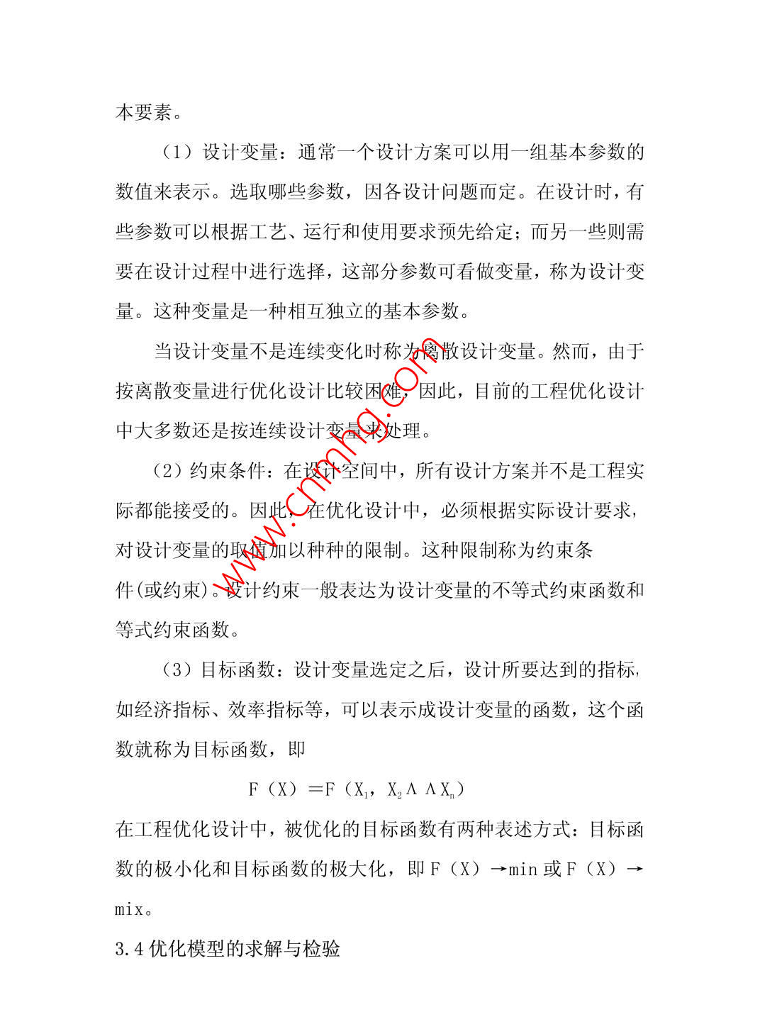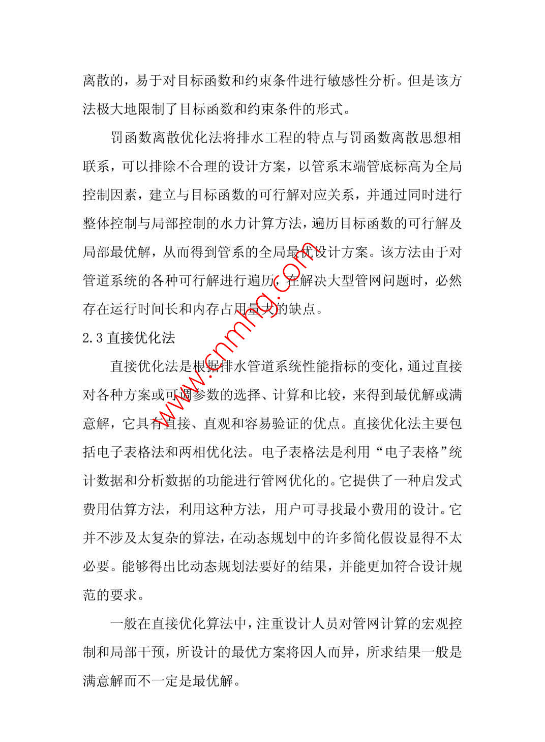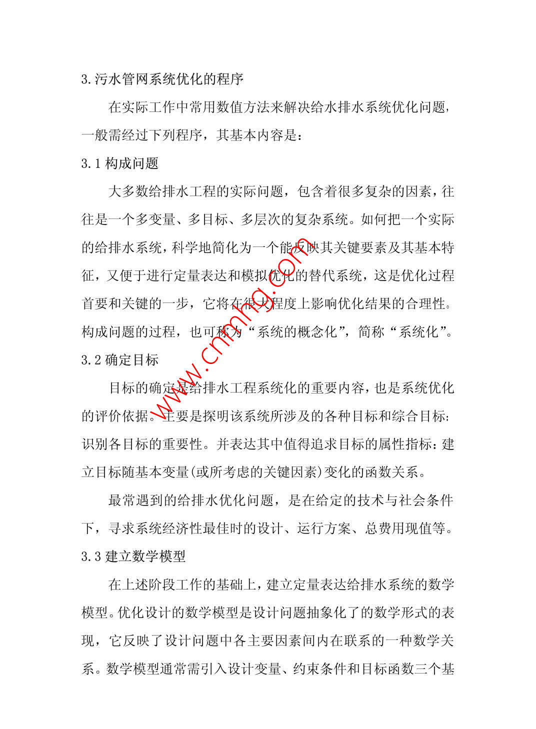 城市污水管網(wǎng)系統(tǒng)優(yōu)化研究楊國偉廣東東莞:523000【摘要】隨著城市人口的增長和工業(yè)企業(yè)的發(fā)展,污水排放量不斷增加,致使城市下游河段污染加劇,因此,建設(shè)一個(gè)經(jīng)濟(jì)、合理的污水處理系統(tǒng),減少污染,是當(dāng)前重要而緊迫的任務(wù)。本文通過分析實(shí)施污水管網(wǎng)系統(tǒng)優(yōu)化的意義,對其優(yōu)化方法及程序進(jìn)行探討,以期通過本文的闡述在實(shí)踐中達(dá)到減小污水管網(wǎng)的埋設(shè)深度,降低工程造價(jià)的目的。【關(guān)鍵詞】污水網(wǎng)管;系統(tǒng)優(yōu)化;排水管道1.對污水管網(wǎng)系統(tǒng)實(shí)施優(yōu)化的意義污水管網(wǎng)就是由污水管道,污水檢査井等組成的管網(wǎng)系統(tǒng),其基本任務(wù)就是及時(shí)、安全、通暢地收集、輸送污水到污水處理設(shè)施,避免環(huán)境受到污染,保障人民的健康和正常生活,促進(jìn)工農(nóng)業(yè)生產(chǎn)的順利進(jìn)行。完善的污水管網(wǎng)系統(tǒng)是一個(gè)城市現(xiàn)代化的標(biāo)志。我國多數(shù)城市污水管道沒有形成完善的系統(tǒng),有的利用街道,河道排水,有的污水隨意排放,影響環(huán)境衛(wèi)生。有的雖有管道,但排水能力低,極不適應(yīng)日益發(fā)展的城市建設(shè),對人民的生活、生產(chǎn)帶來很大的影響。近幾年來。我國在城市基礎(chǔ)建設(shè)方面投入了巨大的物力和財(cái)力,我國大多城市的污水管網(wǎng)系統(tǒng)也得以提升和改善,但是,與發(fā)達(dá)國家相比,仍有很大的差距。因此,大力進(jìn)行污水管網(wǎng)建設(shè),形成完善、通暢的污水管網(wǎng)系統(tǒng),可大大提高一個(gè)城市的人居環(huán)境和城市文明,加快城市發(fā)展,縮小我國和發(fā)達(dá)國家的差距。2.污水管網(wǎng)系統(tǒng)優(yōu)化的方法就管線平面布置已定情況下的污水管網(wǎng)各個(gè)參數(shù)的優(yōu)化設(shè)計(jì),主要有以下幾種方法:2.1線性規(guī)劃法線性規(guī)劃法是優(yōu)化技術(shù)中最常用的一種方法。它對于污水管網(wǎng)設(shè)計(jì)計(jì)算模型中的約束條件和目標(biāo)函數(shù)的非線性,分別用它們的一級泰勒展開式代替,將之化為線性規(guī)劃問題,用線性規(guī)劃的解作為問題的近似解,反復(fù)迭代,使迭代點(diǎn)序列逼近非線性規(guī)劃的最優(yōu)解。它的缺點(diǎn)是把管徑當(dāng)作連續(xù)變量來處理,存在計(jì)算管徑與市售規(guī)格管徑相矛盾的問題。把非線性函樹轉(zhuǎn)為線性函數(shù),前期準(zhǔn)備工作量大,且難以保證結(jié)果的計(jì)算精度混合整數(shù)規(guī)劃法,作為線性規(guī)劃法發(fā)展形式,克服了線性規(guī)劃的部分缺點(diǎn),可以解出離散的標(biāo)準(zhǔn)管徑,但由于整形變量過多往往難以求解,從而應(yīng)用受到限制。2.2非線性規(guī)劃法非線性規(guī)劃法是為了適應(yīng)排水管道系統(tǒng)優(yōu)化設(shè)計(jì)計(jì)算模型中目標(biāo)函數(shù)和約束條件的非線性特征而提出來的。它可以優(yōu)化選擇排水管道的直徑和埋深,以及中途泵站的位置。其假定管徑是離散的,易于對目標(biāo)函數(shù)和約束條件進(jìn)行敏感性分析。但是該方法極大地限制了目標(biāo)函數(shù)和約束條件的形式。罰函數(shù)離散優(yōu)化法將排水工程的特點(diǎn)與罰函數(shù)離散思想相聯(lián)系,可以排除不合理的設(shè)計(jì)方案,以管系末端管底標(biāo)高為全局控制因素,建立與目標(biāo)函數(shù)的可行解對應(yīng)關(guān)系,并通過同時(shí)進(jìn)行整體控制與局部控制的水力計(jì)算方法,遍歷目標(biāo)函數(shù)的可行解及局部最優(yōu)解,從而得到管系的全局最優(yōu)設(shè)計(jì)方案。該方法由于對管道系統(tǒng)的各種可行解進(jìn)行遍歷,在解決大型管網(wǎng)問題時(shí),必然存在運(yùn)行時(shí)間長和內(nèi)存占用量大的缺點(diǎn)。2.3直接優(yōu)化法直接優(yōu)化法是根據(jù)排水管道系統(tǒng)性能指標(biāo)的變化,通過直接對各種方案或可調(diào)參數(shù)的選擇、計(jì)算和比較,來得到最優(yōu)解或滿意解,它具有直接、直觀和容易驗(yàn)證的優(yōu)點(diǎn)。直接優(yōu)化法主要包括電子表格法和兩相優(yōu)化法。電子表格法是利用“電子表格”統(tǒng)計(jì)數(shù)據(jù)和分析數(shù)據(jù)的功能進(jìn)行管網(wǎng)優(yōu)化的。它提供了一種啟發(fā)式費(fèi)用估算方法,利用這種方法,用戶可尋找最小費(fèi)用的設(shè)計(jì)。它并不涉及太復(fù)雜的算法,在動態(tài)規(guī)劃中的許多簡化假設(shè)顯得不太必要。能夠得出比動態(tài)規(guī)劃法要好的結(jié)果,并能更加符合設(shè)計(jì)規(guī)范的要求。般在直接優(yōu)化算法中,注重設(shè)計(jì)人員對管網(wǎng)計(jì)算的宏觀控制和局部干預(yù),所設(shè)計(jì)的最優(yōu)方案將因人而異,所求結(jié)果一般是滿意解而不一定是最優(yōu)解。3.污水管網(wǎng)系統(tǒng)優(yōu)化的程序在實(shí)際工作中常用數(shù)值方法來解決給水排水系統(tǒng)優(yōu)化問題,一般需經(jīng)過下列程序,其基本內(nèi)容是:3.1構(gòu)成問題大多數(shù)給排水工程的實(shí)際問題,包含著很多復(fù)雜的因素,往往是一個(gè)多變量、多目標(biāo)、多層次的復(f