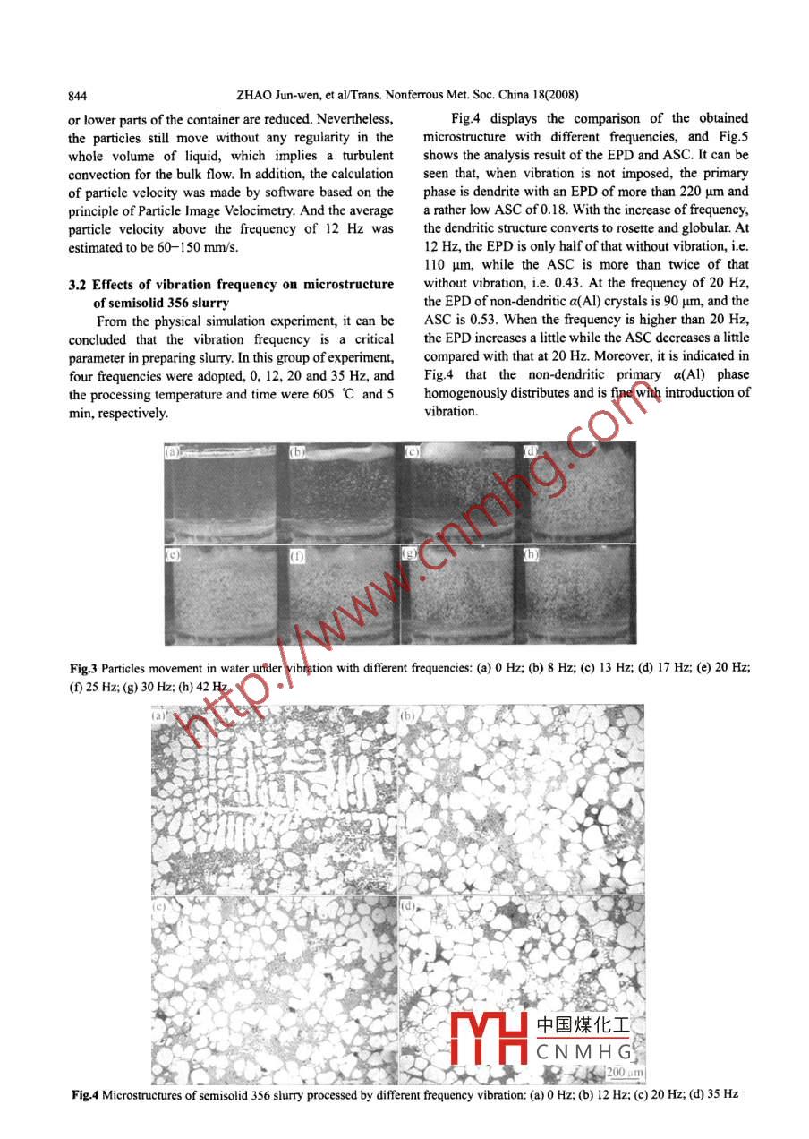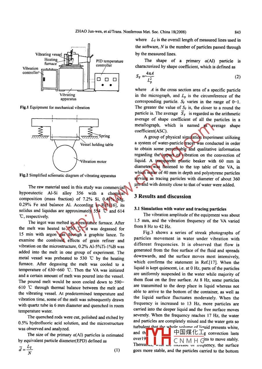 Available online at www.sciencedirect.com●CIENOEdoinectTransactions ofNonferrous Metals罵PSociety of ChinaScienceTrans. Nonferrous Met. Soc. China 18(2008) 842-846Presswww.csu.edu.cnvysxb/Effects of vibration and grain refiner on microstructure of semisolid slurry ofhypoeutectic Al-Si alloyZHAO Jun-wen(趙君文),WU Shu-sen(吳樹森), XIE Li-zhi(謝禮志), AN Ping(安萍), MAO You-wu(毛有武)State Key Lab of Materials Processing and Die & Mould Technology,Huazhong University of Science and Technology, Wuhan 430074, ChinaReceived 31 October 2007; accepted 15 February 2008Abstract: The efects of vibration and grain refiner on the microstructure of semisolid slurry of hypoeutectic Al-Si alloy werestudied. The impact of vibration on the convection of liquid was conducted by using a system of water-particle tracer. The 356 melt attemperature of 630-660 C with or without grain refiner Al-5%Ti-1%B was poured into a metal cup as the vibrating vessel, then itwas cooled to 590 -610 C in the semisolid zone and kept for some time, subsequently vibration with dfferenet frequencies wasapplied. The results show that the primary a(AI) particles become finer and rounder with the increase of vibration frequency. Theslurry with primary a(AI) equivalent particle diameter(EPD) of about 90 um and average shape coffcien(ASC) of about 05canbeprepared under vibration of 20 Hz. With the combined action of vibration and grain refiner Al-STi-B, even smaller and rounderspheroids with EPD of about 85 μm and ASC of about 0.6 are obtained.Key words: mechanical vibration; hypoeutectic Al-Si aly; semisolid metal; grain refinerWhat's more, the combined effects of vibration and1 Introductionrefiner on microstructure of semisolid slurry have beenlttle studied. Therefore, this work aims at studying theOver the last decade, a lot of attentions wereeffect of low-frequency vibration, grain refiner and theirattracted to metal rheoforming process[1-6], as it hascombined effects on microstructure of hypoeutectic Al-Simany advantages, such as high mechanical properties ofalloy.formed components, low cost and easy operation. As aresult, a number of novel slurry preparation methods and2 Experimentalrheoforming techniques have been invented, for example,semi -solid rheocasting[1], new rheocasting[7 - 8], liquidusThe self-developed equipment shown in Fig.1 wascasting[9], twin-screw rheomoulding[ 10], rotating barrelemployed in present trials, which consists of vibrationrheomoulding[11], swirled enthalpy equilbrationcontroller, vibrating apparatus(VA), heating fumace, PIDdevice[ 12] and controlled nucleation method[13].temperature controller, etc. The simplified schematic ofNevertheless, efforts were still made to develop newthe VA is shown in Fig.2. It consists of a vibration motorways of preparing semi-solid slurry with lower cost andattached to the vibrating vessel via a vessel holding tablesimpler process[14]. As vibration is easy to operate andsupported by a group of springs. The vibrating vesselneeds less expensive equipment, it could be anshall be fixed by bolts on the vessel holding table of thealternative for preparing semisolid slury.VA. The vibrating time, frequency and amplitude of theAlthough it was explored to prepare semisolidVA may be adjusted by the vibration controller. Theslurry with ultrasonic vibration[15], lttle study has beenpreheating temperature and isothermal holdingperformed on preparing slurry of semisolid metal btem中國煤化工the PID temperaturemechanical vibration with a frequency less than 50 Hz.YHCNMHGFoundation item: Prjec(50775086) supported by the National Natural Science Foundation of China; Project (2007AA032557) supported by the Hi-techResearch and Development Program of ChinaCorresponding author: ZHAO Jun-wen; TelFax: +86-27-87556262; E-mail: zhajunwen1982@yahoo.com.cnZHAO Jun-wen, et al/Trans. Nonferrous Met. Soc. China 18(2008)843where Lr is the overall length of measured lines used inthe software, N is the mumber of particles passed throughVibrating vesselby the measured lines.HeatingPID temperatureThe shape of a primary a(AI) particle iscontrollerVibrationcharacterized by shape coefficient, which is defined as口口口Isp=4n4(2)where A is the cross section area of a specific particleVibratingin the micrograph, and Lp is the circumference of theapparatuscorresponding particle. Sp varies in the range of 0-1.Fig,1 Equipment for mechanical vibrationThe greater the value of Sp is, the closer to a round theparticle is. The average Sp is regarded as the arithmeticaverage of shape coefficient of all the particles in ametallograph, which is named as average shapecoefficient(ASC).A group of physical simulation experiment utilizingVessel holding tablea system of water-particle tracer was conducted in orderto obtain some perceivable and qualitative informationregarding the impact of vibration on the convection ofVibration motorliquid. A transparent plastic beaker with 60 mm indiameter was fastened to the top table of the VA, inwhich water of 40 mm in depth and polystyrene particlesFig.2 Simplifed schiematic diagram of vibrating apparatusserving as tracing particles with diameter of about 360The raw material used in this study was commercialum and with density close to that of water were added.hypoeutectic Al-Si alloy 356 with a chemical3 Results and discussioncomposition (mass fraction) of 7.2% Si, 0.43% Mg,0.29% Fe and balance AL. According to Ref.[16], its3.1 Simulation with water and tracing particlessolidus and liquidus are approximately 554 C and 614C, respectively.The vibration amplitude of the equipment was aboutThe ingot was melted in a resistance fumace. After1.5 mm, and the vibration frequency of the VA variedhe melt was heated to 750 C, it was degassed forfrom8Hzto42Hz.15 min with argon gas through a graphite lance. ToFig.3 shows a series of streak photographs ofexamine the combined efects of grain refiner andparticles movement in water under vibration withvibration on the microstruc