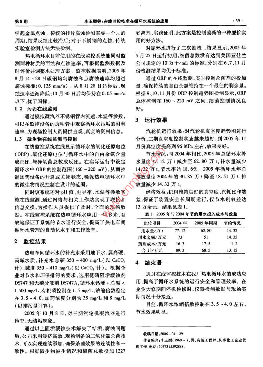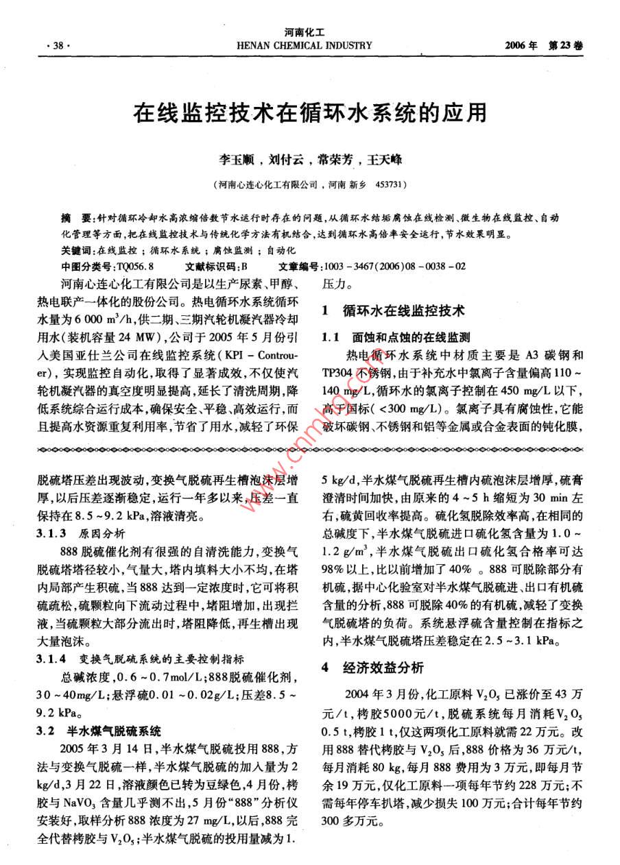 河南化工38HENAN CHEMICAL INDUSTRY2006年第23卷在線監(jiān)控技術在循環(huán)水系統(tǒng)的應用李玉順,劉付云,常榮芳,王天峰(河南心連心化工有限公司,河南新鄉(xiāng)453731)摘要:針對循環(huán)冷卻水高濃編偕數(shù)節(jié)水運行時存在的問題,從循環(huán)水結(jié)垢腐蝕在線檢測、微生物在線監(jiān)控、自動化管理等方面,把在線監(jiān)控技術與傳統(tǒng)化學方法有機結(jié)合,達到循環(huán)水高倍率安全運行,節(jié)水效果明顯。關鍵詞:在線監(jiān)控;循環(huán)水系統(tǒng);腐蝕監(jiān)測;自動化中圖分類號:TQ06.8獻標識碼:B文章編號:1003-3467(2006)08-0038-02河南心連心化工有限公司是以生產(chǎn)尿素、甲醇、壓力。熱電聯(lián)產(chǎn)一體化的股份公司。熱電循環(huán)水系統(tǒng)循環(huán)水量為6000m3/h,供二期、三期汽輪機凝汽器冷卻1循環(huán)水在線監(jiān)控技術用水(裝機容量24MW),公司于2005年5月份引1.1面蝕和點蝕的在線監(jiān)測入美國亞仕蘭公司在線監(jiān)控系統(tǒng)(KPI- Control-熱電循環(huán)水系統(tǒng)中材質(zhì)主要是A3碳鋼和er),實現(xiàn)監(jiān)控自動化,取得了顯著成效,不僅使汽TP304不銹鋼,由于補充水中氯離子含量偏高110~輪機凝汽器的真空度明顯提高,延長了清洗周期,降140mg/L,循環(huán)水的氯離子控制在40mg/L以下,低系統(tǒng)綜合運行成本,確保安全、平穩(wěn)、高效運行,而高于國標(<300mg/L)。氯離子具有腐蝕性,它能且提高水資源重復利用率,節(jié)省了用水,減輕了環(huán)保破壞碳鋼、不銹鋼和鋁等金屬或合金表面的鈍化膜,DeoOOeOOOeOOOSOOOG-OOOGOOOOOOOGOOOOOOOOOOOOOOOODOOOOOOOOOOOOOOOOOOOOOOoOoOoooOoO脫硫塔壓差出現(xiàn)波動,變換氣脫硫再生槽泡沫層增5kg/d,半水煤氣脫硫再生槽內(nèi)硫泡沫層增厚,硫膏厚,以后壓差逐漸穩(wěn)定,運行一年多以來,壓差一直澄清時間加快,由原來的4~5h縮短為30min左保持在8.5~9.2kPa,溶液清亮。右,硫黃回收率提高。硫化氫脫除效率高,在相同的3.1.3原因分析總堿度下,半水煤氣脫硫進口硫化氫含量為1.088脫硫催化劑有很強的自清洗能力,變換氣1.2g/m3,半水煤氣脫硫出口硫化氫合格率可達脫硫塔塔徑較小,氣量大,塔內(nèi)填料大小不均,在塔98%以上,比以前增加了40%。88可脫除部分有內(nèi)局部產(chǎn)生積硫,當88達到一定濃度時,它可將積機硫,據(jù)中心化驗室對半水煤氣脫硫進、出口有機硫硫疏松,硫顆粒向下流動過程中,堵阻增加,出現(xiàn)攔含量的分析888可脫除40%的有機硫減輕了變換液,當硫顆粒大部分流出時,塔阻降低,再生槽出現(xiàn)氣脫硫塔的負荷。系統(tǒng)懸浮硫含量控制在指標之大量泡沫。內(nèi),半水煤氣脫硫塔壓差穩(wěn)定在2.5~3.1kPa。3.1.4變換氣脫硫系統(tǒng)的主要控制指標4經(jīng)濟效益分析總堿濃度,0.6~0.7mol/L;888脫硫催化劑30~40mg/L;懸浮硫0.01~0.02g/L;壓差8.5~2004年3月份,化工原料V2O3已漲價至43萬9.2kPa。元/t,栲膠5000元/t,脫硫系統(tǒng)每月消耗V2O33.2半水煤氣脫硫系統(tǒng)0.5t,栲膠1t,僅這兩項化工原料就需22萬元。改2005年3月14日,半水煤氣脫硫投用88方用88替代栲膠與V2O3后,888價格為36萬元/法與變換氣脫硫一樣,半水煤氣脫硫的加入量為2每月消耗80kg,每月88費用為3萬元,即每月節(jié)kg/d,3月22日,溶液顏色已轉(zhuǎn)為豆綠色,4月份,栲余19萬元,僅化工原料一項每年節(jié)約228萬元;不膠與NavO3含量幾乎測不出,5月份“888”分析儀需每年停車扒塔,減少損失100萬元;合計每年節(jié)約安裝好,取樣分析888度為27mg/L,以后,888完300多萬元。全代替栲膠與2O3;半水煤氣脫硫的投用量減為1第8期李玉順等:在線監(jiān)控技術在循環(huán)水系統(tǒng)的應用引起金屬點蝕。傳統(tǒng)的掛片腐蝕檢測需要一個月的剝離劑,實踐證明此方案是控制菌藻的一種廉價實周期,結(jié)果反饋比較滯后;對于不銹鋼的點蝕,傳統(tǒng)用的好方法。實驗室檢測方法無法檢測。對循環(huán)水進行了三次抽檢,結(jié)果顯示,2005年熱電循環(huán)水目前使用的在線監(jiān)控系統(tǒng)能同時監(jiān)5月25日運行初期,細菌總數(shù)沒有達到美國亞仕蘭測兩種材質(zhì)的面蝕和點蝕速率,可根據(jù)監(jiān)測數(shù)據(jù)及公司規(guī)定的10萬個/mL的標準;分別在6、7、11月時評價并調(diào)整水處理方案。監(jiān)控數(shù)據(jù)表明,2005年份檢測結(jié)果均優(yōu)于標準。8月14~28日碳鋼均勻腐蝕和點腐蝕速率均超過通過ORP的在線監(jiān)測,實時控制殺菌劑的投加腐蝕標準(0.125mm/a)。從8月28日達標后,腐量,確保持續(xù)的自由余氯維持在一個最佳的剩余量。蝕速率逐漸降低;10月30日后均保持在0.05mm/a根據(jù)9、10、1l月份ORP控制趨勢圖檢測顯示,ORP以下,優(yōu)于國標總體控制在160~220mV之間,細菌控制情況良1.2污垢在線監(jiān)測好通過模擬凝汽器不銹鋼管內(nèi)流速、水溫等參數(shù),可以在監(jiān)控設備的透明管中觀察循環(huán)水污垢的附著3運行效果速率,為現(xiàn)場控制人員提供直觀、真實的資料信息。汽輪機運行效果:對汽輪機真空度趨勢圖進行1.3微生物在線監(jiān)測與控制分析,三期真空度控制狀態(tài)越來越好,到2005年11在線監(jiān)控系統(tǒng)在線顯示循環(huán)水的氧化還原電位月份真空度提高到9MPa左右,效果良好。(ORP),氧化還原電位與循環(huán)水中的自由余氯含量節(jié)水情況:與2004年相比,2005年總循環(huán)水補成正比,與