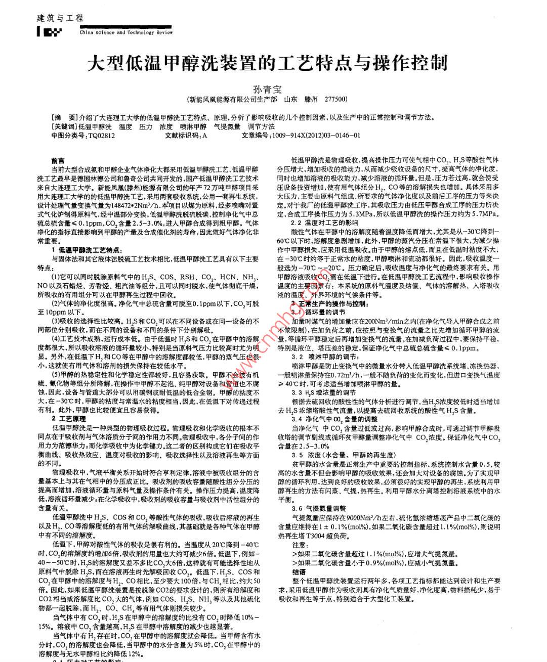 大型低溫甲醇洗裝置的工藝特點與操作控制