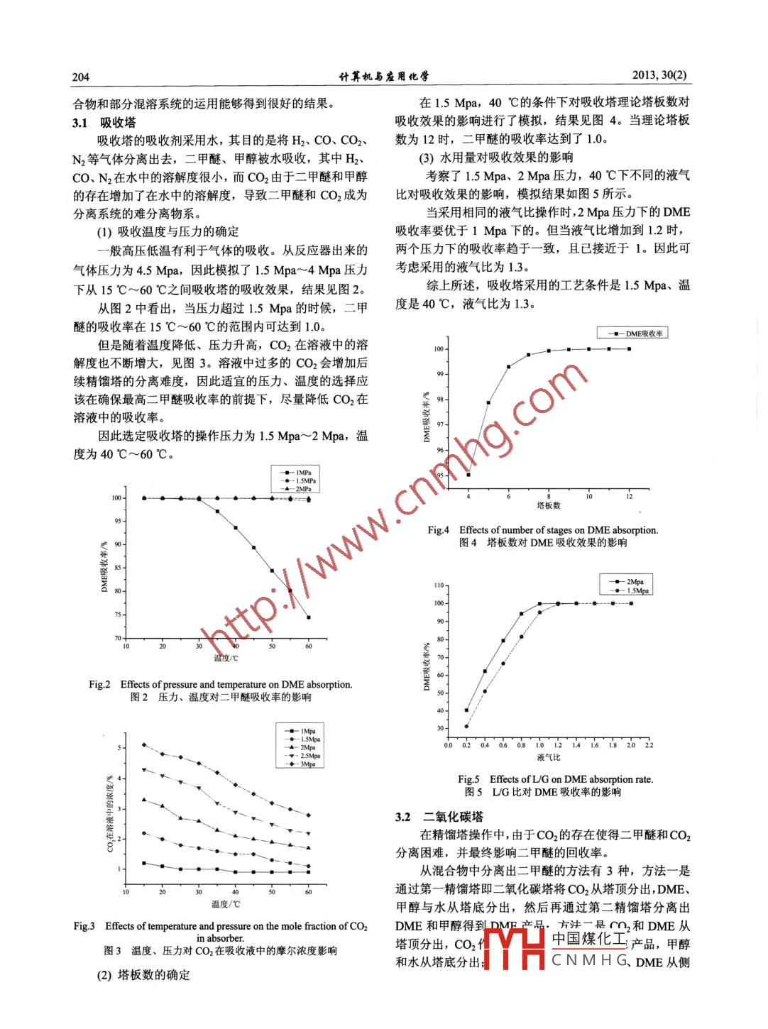 第30卷第2期針算機與應用化學Vol 30, No. 22013年2月28日Computers and Applied ChemistryFebruary 28, 2013合成氣一步法制二甲醚分離工藝流程優(yōu)化模擬郭曉艷,孫蘭義(中國石油大學化學工程學院化學工程系,山東,青島,265摘要:為獲得合成氣經(jīng)漿態(tài)床一步合成二甲醚最優(yōu)的分離流程和工藝參數(shù),運用化工流程模擬軟件 Aspen Plus對3種分離工藝過程進行了模擬分析。提出用水吸收一步反應氣相產(chǎn)物中的二甲醚,再用兩個精餾塔分離吸收液的工藝流程,模擬過程中汽液相平衡采用NRTL熱力學模型。對從吸收液中分離二甲醚的3種方法進行了模擬計算值的比較,并與文獻中的實驗值做了比較,最后采用了先通過第一精餾塔塔頂分離出CO2,塔底出甲醇和二甲醚,再通過第二精餾塔分離二甲醚和甲醇的方法。此種分離流程可使二甲醚的回收率達到911%,產(chǎn)品濃度達到9996%,高于文獻報道的結果。并對吸收塔的溫度、操作壓力、液氣比、塔板數(shù)等參數(shù)以及2個精餾塔的溫度、壓力、塔板數(shù)等參數(shù)進行了優(yōu)化模擬,確定了優(yōu)化的工藝和設備參數(shù)。最優(yōu)的分離流程尚需經(jīng)過回收率和操作費用綜合經(jīng)濟核算來確定關鍵詞:合成氣;二甲醚;一步法;優(yōu)化模擬中圖分類號:TQ0283文獻標識碼:A文章編號:100141602013)02-203-206DOI: 10. 11719/com. app. chem201302211前言2二甲醚分離流程二甲醚ODME)作為一種新興的基本化工原料,在燃料、農(nóng)藥、制藥等化學工業(yè)中有廣泛的用途。高純度的從漿態(tài)床反應器出來的氣相產(chǎn)品中有二甲醚、甲醇二甲醚可代替氟里昂用作氣溶膠噴射劑和制冷劑,減少H2O和沒反應的H2、CO、CO2N2組成的七元混合物,根據(jù)此復雜物系的特點以及二甲醚、甲醇、H2O、CO2汽對大氣環(huán)境的污染和臭氧層的破壞;二甲醚有含氧較短液相平衡物系的特點14,采用的分離方法是合成氣的分子式,沒有CC鍵,有高的十六烷值和低的自燃步反應后氣體經(jīng)換熱冷凝進入氣液分離器,冷凝后的氣點,因而成為理想的替代燃料即,它還是未來制取低碳烯相產(chǎn)物進入吸收塔,用水作吸收劑,其中的二甲醚、甲烴的主要原料之一近年來,二甲醚在合成過程和應用醇和部分CO2被水吸收后從塔底餾出與從氣液分離器的分的雙功能催化劑,因此,甲醇合成催化劑和甲醇脫水歐包/烈》畫領域的研究已成國內(nèi)外熱點之液相產(chǎn)物合并一起進入精餾塔進行下一步分離嗎16合成氣一步法制DME是在合成甲醇技術的基礎上分離流程如圖1所發(fā)展起來的③,它是由合成氣經(jīng)漿態(tài)床反應器一步合成DME。目前,國內(nèi)外的研究重點是催化劑、催化反應工二甲醚產(chǎn)品藝以及反應器。催化劑采用具有甲醇合成和甲醇脫水組催化劑的比例對DME生成速度和選擇性有很大的影響。合成氣法現(xiàn)多采用漿態(tài)床反應器4,其結構簡單,便于移出反應熱,易實現(xiàn)恒溫操作。因此,漿態(tài)床合成氣法制DME具有誘人的前景,將是煤炭潔凈利用的途徑之Fig 1 Separation process of dimethyl ether圖1二甲醚分離流程目前,相比甲醇脫水制二甲醚而言,一步法合成二甲醚因為體系存在有未反應完的合成氣以及二氧化碳,3模擬過程及分析要得到純度較高的二甲醚,分離過程比較復雜10,隨著流程模擬過程中涉及到的單元操作有吸收和精餾,漿態(tài)床合成方法研究的不斷成熟,研究二甲醚高效分離選擇合適的熱力學模型是準確模擬計算分離過程的非常工藝的可行性有著重要的意義。本文采用 ASPEN化工流關鍵的步驟。該物系中存在水,不含有電解質(zhì),因此選程模擬軟件,對一步法合成二甲醚的分離流程進行了模用NTRL熱力學模型進行模擬,該方法具有 Wilson方程擬計算與分析,確定了工藝優(yōu)化操作條件。的優(yōu)點,適用于液液平衡計算,對含水系統(tǒng)具有較高的精確度,形式上收稿日期:2012-10-08;修回日期:2012-12-18YHt中國煤化工時強非理想混CNMHG聯(lián)系人:孫蘭義(1972),男,山東人,博+,教授, E-mail: sunlanvie@163cm作者簡介:郭曉艷(1973),女,山東人,碩土研究生,Emat: gyan73@126co計算機與應用化營2013,30(2)合物和部分混溶系統(tǒng)的運用能夠得到很好的結果在1.5Mpa,40℃的條件下對吸收塔理論塔板數(shù)對31吸收塔吸收效果的影響進行了模擬,結果見圖4。當理論塔板吸收塔的吸收劑采用水,其目的是將H2、CO、CO2、數(shù)為12時,二甲醚的吸收率達到了1.0N2等氣體分離出去,二甲醚、甲醇被水吸收,其中H2(3)水用量對吸收效果的影響CO、N2在水中的溶解度很小,而CO2由于二甲醚和甲醇考察了15Mpa、2Mpa壓力,40℃下不同的液氣的存在增加了在水中的溶解度,導致二甲醚和CO2成為比對吸收效果的影響,模擬結果如圖5所示。分離系統(tǒng)的難分離物系。當采用相同的液氣比操作時,2Mpa壓力下的DME(1)吸收溫度與壓力的確定吸收率要優(yōu)于下的。但當液氣比增加到1.2時,般高壓低溫有利于氣體的吸收。從反應器出來的兩個壓力下的吸收率趨于一致,且已接近于1。因此可氣體壓力為4Mpa,因此模擬了1.5Mpa~4Mpa壓力考慮采用的液氣比為13下從15℃~60℃之間吸收塔的吸收效果,結果見圖2綜上所述,吸收塔采用的工藝條件是1.5Mpa、溫從圖2中看出,當壓力超過5Mpa的時候,二甲度是40℃,液氣比為13。醚的吸收率在15℃~60℃的范圍內(nèi)可達到1.0。ME吸收率但是隨著溫度降低、壓力升高,CO2在