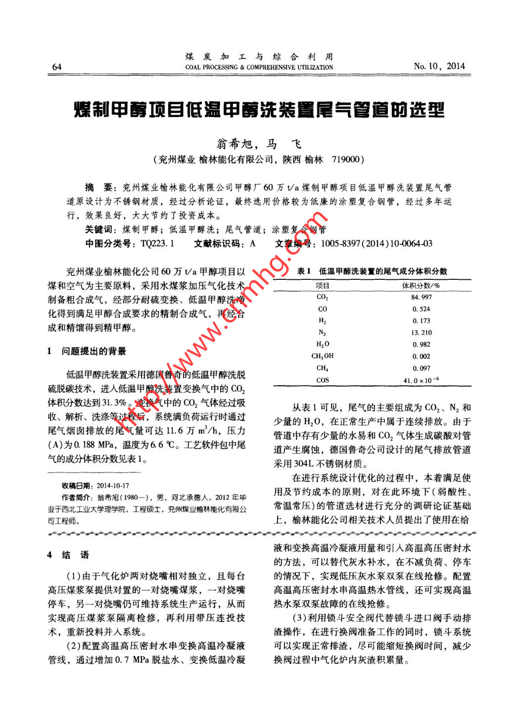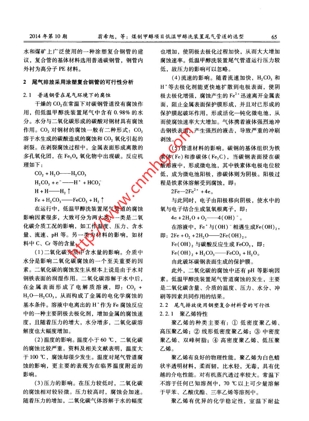 煤炭加工與綜合利用COAL PROCESSING & COMPREHENSIVE UTILIZATIONNo.10, 2014煤制甲醇項(xiàng)目低溫甲醇洗裝置尾氣管道的選型翁希旭,馬飛(兗州煤業(yè)榆林能化有限公司,陜西榆林719000)摘要: 兗州煤業(yè)榆林能化有限公司甲醇廠60萬Va煤制甲醇項(xiàng)目低溫甲醇洗裝置尾氣管道原設(shè)計(jì)為不銹鋼材質(zhì),經(jīng)過分析論證,最終選用價(jià)格較為低廉的涂塑復(fù)合鋼管,經(jīng)過多年運(yùn)行,效果良好,大大節(jié)約了投資成本。關(guān)鍵詞:煤制甲醇;低溫甲醇洗;尾氣管道;涂塑復(fù)合鋼管中圖分類號(hào): TQ223. 1.文獻(xiàn)標(biāo)識(shí)碼: A文章編號(hào): 1005-8397(2014) 10-0064-03兗州煤業(yè)榆林能化公司60萬Va甲醇項(xiàng)目以表1 低溫甲醇洗裝置的尾氣成分體積分?jǐn)?shù)煤和空氣為主要原料,采用水煤漿加壓氣化技術(shù)項(xiàng)目體積分?jǐn)?shù)/%制備粗合成氣,經(jīng)部分耐硫變換、低溫甲醇洗凈CO284. 9970. 524.化得到滿足甲醇合成要求的精制合成氣,再經(jīng)合H0. 173成和精餾得到精甲醇。N213. 210H2O0.982 .問題提出的背景CH2OH .0. 002CH40.097低溫甲醇洗裝置采用德國(guó)魯奇的低溫甲醇洗脫COS41.0x10-6硫脫碳技術(shù),進(jìn)入低溫甲醇洗裝置變換氣中的CO2體積分?jǐn)?shù)達(dá)到31.3%。變換氣中的CO2氣體經(jīng)過吸從表1可見,尾氣的主要組成為CO2、N2和收、解析、洗滌等過程后,系統(tǒng)滿負(fù)荷運(yùn)行時(shí)通過少量的H20,在正常生產(chǎn)中屬于連續(xù)排放。由于尾氣煙囪排放的尾氣量可達(dá)11.6萬m'/h,壓力管道中存有少量的水易和CO2氣體生成碳酸對(duì)管(A)為0.188 MPa,溫度為6.6 C。工藝軟件包中尾道產(chǎn)生腐蝕,德國(guó)魯奇公司設(shè)計(jì)的尾氣排放管道氣的成分體積分?jǐn)?shù)見表1。采用304L不銹鋼材質(zhì)。在進(jìn)行系統(tǒng)設(shè)計(jì)優(yōu)化的過程中,本著滿足使收稿日期: 2014-10-17作者簡(jiǎn)介:翁希旭(1980- -), 男,河北承德人,2012 年畢用及節(jié)約成本的原則,對(duì)在此環(huán)境下(弱酸性、業(yè)于西北工業(yè)大學(xué)理學(xué)院,工程碩士,兗州煤業(yè)榆林能化有限公常溫常壓)的管道選材進(jìn)行充分的調(diào)研論證基礎(chǔ)司工程師。上,榆林能化公司相關(guān)技術(shù)人員提出了使用在給液和變換高溫冷凝液用量和引人高溫高壓密封水4結(jié)語的方法,可以替代灰水補(bǔ)水,在不減負(fù)荷、停車(1)由于氣化爐兩對(duì)燒嘴相對(duì)獨(dú)立,且每臺(tái)的情況下,實(shí)現(xiàn)低壓灰水泵雙泵在線搶修。配置高壓煤漿泵提供對(duì)置的一對(duì)燒嘴煤漿,一對(duì)燒嘴高溫高壓密封水串高溫?zé)崴芫€,還可實(shí)現(xiàn)高溫停車,另一對(duì)燒嘴仍可維持系統(tǒng)生產(chǎn)運(yùn)行,從而熱水泵雙泵故障的在線搶修。實(shí)現(xiàn)高壓煤漿泵隔離檢修,再利用帶壓連投技(3)利用鎖斗安全閥代替鎖斗進(jìn)口閥手動(dòng)排術(shù),重新投料并入系統(tǒng)。渣操作,在進(jìn)行換閥準(zhǔn)備工作的同時(shí),鎖斗系統(tǒng)(2)配置高溫高壓密封水串變換高溫冷凝液可以實(shí)現(xiàn)正常排渣,盡可能縮短換閥時(shí)間,減少管線,通過增加0.7MPa脫鹽水、變換低溫冷凝換|閥過程中氣化爐內(nèi)灰渣積累量。2014年第10期翁希旭,等:煤制甲醇項(xiàng)目低溫甲醇洗裝置尾氣管道的選型65水和煤礦上廣泛使用的一種涂塑復(fù)合鋼管的建也增加,使陰極去極化過程加快,從而大大增加議,復(fù)合管的基體材料選用普通碳鋼管,鋼管內(nèi)腐蝕速率。低溫甲醇洗裝置尾氣管道運(yùn)行壓力較外襯為高分子PE材料。低,故壓力的影響可以忽略。(4)流速的影響。隨著流速加快,H2CO3 和2尾氣排放采用涂塑復(fù)合鋼管的可行性分析H*等去極化劑能更快地?cái)U(kuò)散到電極表面,使陰2.1 普通鋼管在尾氣環(huán)境下的腐蝕極去極化增強(qiáng),腐蝕產(chǎn)生的Fe2+迅速離開金屬表干燥的CO2在常溫下對(duì)碳鋼管道沒有腐蝕作面,阻止金屬表面保護(hù)膜形成,并且對(duì)已形成的用,但低溫甲醇洗裝置尾氣中含有0. 98%的水保護(hù)膜起破壞作用,形成活化一鈍化微電池, 從分。水分與二氧化碳形成的碳酸對(duì)鋼材具有腐蝕而使腐蝕速率大大增加。氣體攜著液體強(qiáng)烈地沖作用。CO2對(duì)鋼材的腐蝕一般有二種形式: CO2擊鋼鐵表面,產(chǎn)生強(qiáng)烈的液擊,導(dǎo)致嚴(yán)重的沖刷溶于水生成的碳酸造成的腐蝕和CO2氧化引起的剝蝕。剝裂。在剝裂腐蝕過程中,金屬表面形成離散的(5)管道材料的影響。碳鋼的基體組織為鐵多孔氧化團(tuán),在Fe,O4氧化物中出現(xiàn)碳。反應(yīng)機(jī)素體( Fe)和滲碳體(FezC),當(dāng)碳鋼表面浸在碳理如下:酸溶液中,形成微電池,其中鐵素體電極電位較CO2 + H20-- -H2CO3低,成為微電池陽極,滲碳體則為陰極。陽極過H,CO, +e"- -H* + HCO;程是鐵素體溶解受到腐蝕,即:H+H- -H2 ↑2Fe- -2Fe2* +4e。Fe + H,CO3--FeCO3 +H2↑與此同時(shí),電子由陽極移向陰極,使水中的在運(yùn)行中,低溫甲醇洗裝置尾氣管道的腐蝕氧與電子結(jié)合生成氫氧根離子,即:影響因素很多,大致可分為兩大類:一類是二氧4e +2H20+O2- 4(OH) -。化碳介質(zhì)工況的影響,如工作溫度、壓力、含水在溶液中,F(xiàn)e* 與(0H)-相遇生成Fe( 0H)2,量、流速、pH等。另一類為材料的影響,如材即: 2Fe +O2 +2H20一-2Fe( 0H)2。料中C、Cr 等的含量。Fe( 0H)2與碳酸
