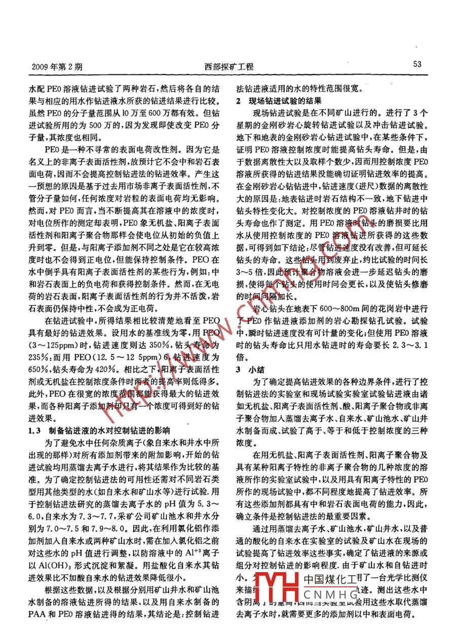 52西部探礦工程2009年第2期.在鉆進液中加化學(xué)添加劑的研究聶冠群(核工業(yè)華東建設(shè)工程集團公司,江西南昌330046)摘要:試驗研究得出了鉆頭對控制鉆進的影響,表面電荷改性劑對控制鉆進的影響,制備鉆進液的水對控制鉆進的影響,現(xiàn)場鉆進試驗的結(jié)果。關(guān)鍵詞:鉆進;添加劑;效率中圖分類號:P634.6文獻標(biāo)識碼:B 文章編號:1004- -5716(2009)02- -0052- -03在鉆進液中加入化學(xué)添加劑來提高硬巖的鉆進效荷,而這個等電點是通過用酸或堿調(diào)節(jié)pH值獲得的,率,對此進行了試驗研究,取得了明顯效果。這取決于IEP的pH值是高于還是低于水的初始pH1鉆進試驗的結(jié)果值。為了確保整個鉆進試驗都維持所希望的pH值,試1.1鉆頭對控制鉆進的影響驗中使用了緩沖溶液。這是很重要的,因為已發(fā)現(xiàn)巖石控制鉆進對火山巖和花崗巖均已證明能提高金剛鉆進時的主要副產(chǎn)物是氫氧根離子。當(dāng)只用蒸餾去離石鉆頭的壽命。金剛石鉆頭和鏟形鉆頭在控制鉆進中子水鉆進時測量流人液和排出液的pH值表明,鉆進使的成功,有力地證明這些鉆頭在鉆進條件下是適用的。鉆進液的pH值提高3~4個單位。用pH=5.5的緩研究結(jié)果還表明,控制鉆進能適用于所有刮刀型鉆頭,.沖溶液(醋酸一醋酸鈉)鉆進,其鉆進速度比單用蒸餾去并且可能使用任何類型的鉆頭。對金剛石鉆頭的鉆進離子水高279%,而鉆頭壽命則高218%,這兩者的提高試驗,鉆了若干個試驗孔也未見鉆進速度下降的情況。的一個可能解釋是整個試驗都由緩沖溶液維持了條件。這意味著用任何金剛石巖心鉆頭鉆進都是可行的。用氯化鋁時不可能始終保持條件,因為鉆進的變化或鉆1.2表面電荷改性劑對控制鉆進的影響進試驗過程中表面電荷條件的變化會產(chǎn)生氫氧根離子。(1)無機鹽:共試驗了幾種無機鹽,它們是氯化、氯這些試驗結(jié)果進一步說明,不管何種能中和表面電荷的化鈣、氯化鈉、氣化鋯及硝酸鋁,每種都試驗了多種濃添加劑都可在控制鉆進法中應(yīng)用。度。它們試驗表明,五種無機鹽都各有一-零表面電荷濃(4)陽離子聚合物:由于在零表面電荷時鉆屑粒子度獲得其最大的鉆進速度和提高鉆頭壽命。對于這些會發(fā)生絮凝,所以認為在控制條件下絮凝作用是提高鉆低價陽離子試劑來說,雖然需要較高濃度,但仍能提高進效率的部分原因。鑒于此。共試驗了兩種聚合物(一鉆進效率。根據(jù)花崗巖進結(jié)果,得出的結(jié)論是:幾種無種是陽離子的,另一種是非離子的)作鉆進液的添加劑,機鹽溶液在控制鉆進中都能提高鉆進速度和鉆頭壽命。借助分子的橋聯(lián)機理為主和電荷中和機理為輔的作用(2)陽離子表面活性劑:試驗了4種陽離子表面活使粒子絮凝。獲得鉆進效果與單用該水鉆進所獲的結(jié)性劑作為表面電荷改性劑。其中三種為常見的季銨鹽,果進行比較、試驗中配制的聚丙烯酰胺溶液的濃度是低它們是:十二烷基溴化三甲銨、十四烷基溴化三甲銨、十于、等于和高于控制濃度。象其他陽離子添加劑那樣,六烷基溴化三甲銨,第四種表面活性劑是市場上可購得PAA也能提高鉆進速度和鉆頭壽命。當(dāng)PAA濃度為的低分量陽離子聚合物,將它們所獲得的鉆進效率與相0.25ppm時,鉆進速度提高率最大(334%),鉆頭壽命應(yīng)的用水作鉆進液基準(zhǔn)線對該巖石的鉆進效率進行了的提高率也最大(187%)。應(yīng)指出的是,PAA鉆進試驗比較,其鉆進效果與相應(yīng)的水基準(zhǔn)線(不加添加劑)進行的結(jié)果清楚地表明,絮凝作用并不是提高控制鉆進法效了比較。鉆進試驗是在低于、等于和高于濃度的表面活果的主要原因,當(dāng)PAA濃度大于0. 1ppm時都發(fā)生絮性劑濃度進行的。從用陽離子表面活性劑作添加劑鉆凝作用,而最高的鉆進效率卻只是在0.25ppm的濃度進試驗的結(jié)果可以得出如下結(jié)論:這些表面活劑濃度為時獲|中國煤化工驗結(jié)果還表明,與所零表面電荷濃度時得到鉆進速度和鉆頭壽命的最大提使用CNM HG無關(guān)。高率。.(5非離子乘臺物:HF珀近液添加劑的非離子聚(3)酸、堿溶液:在等電點(IEP)時也能中和表面電合物的是水溶性的高分子量的聚氧化乙烯.用了兩種2009年第2期西部探礦工程53水配PE0溶液鉆進試驗了兩種巖石,然后將各自的結(jié)法鉆進液適用的水的特性范圍很寬。果與相應(yīng)的用水作鉆進液水所獲的鉆進結(jié)果進行比較。2現(xiàn)場鉆進試驗的結(jié)果雖然PE0的分子量范圍從l0萬至600萬都有效。但鉆現(xiàn)場鉆進試驗是在不同礦山進行的。進行了3個進試驗所用的為500萬的,因為發(fā)現(xiàn)即使改變PEO分星期的金剛砂巖心旋轉(zhuǎn)鉆進試驗以及沖擊鉆進試驗。子量,其濃度也相同。地下和地表的金剛砂巖心鉆進試驗中,在某些條件下,PEO是- -種不尋常的表面電荷改性劑。因為它是證明PEO溶液控制濃度時能提高鉆頭壽命。但是,由名義上的非離子表面活性劑,故預(yù)計它不會中和巖石表于數(shù)據(jù)離散性大以及取樣個數(shù)少,因而用控制濃度PEO面電荷,因而不會提高控制鉆進法的鉆進效率。產(chǎn)生這溶液所獲得的鉆進結(jié)果沒能確切證明鉆進效率的提高。- -預(yù)想的原因是基于過去用市場非離子表面活性劑,不在金剛砂巖心鉆鉆進中,鉆進速度(進尺)數(shù)據(jù)的離散性管分子量如何,任何濃度對巖粒的