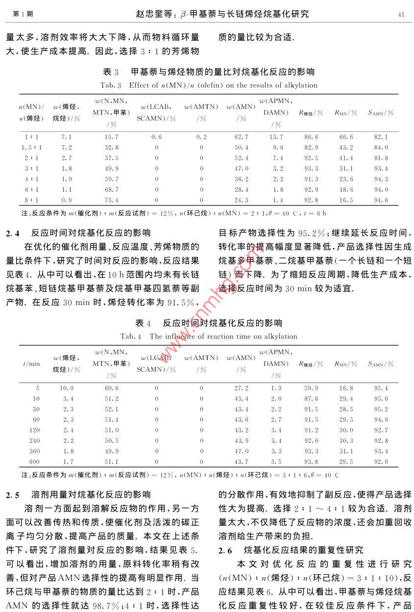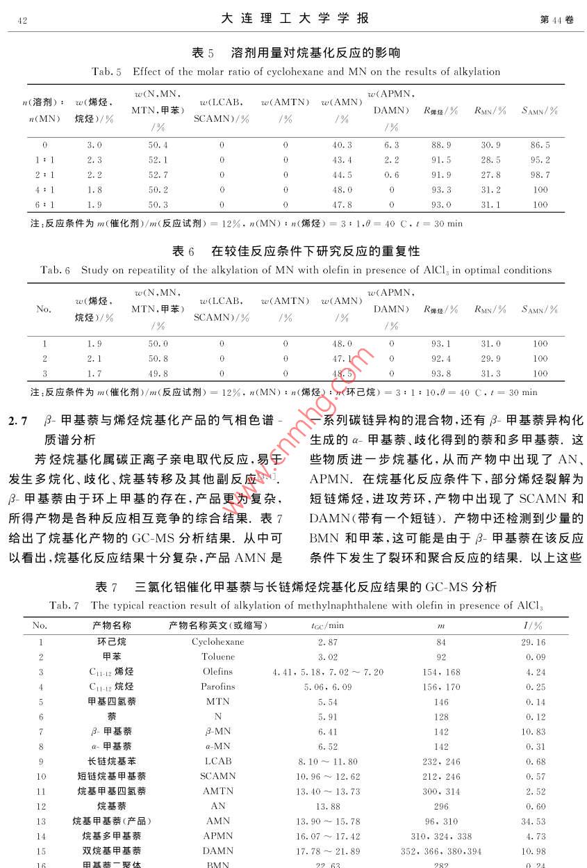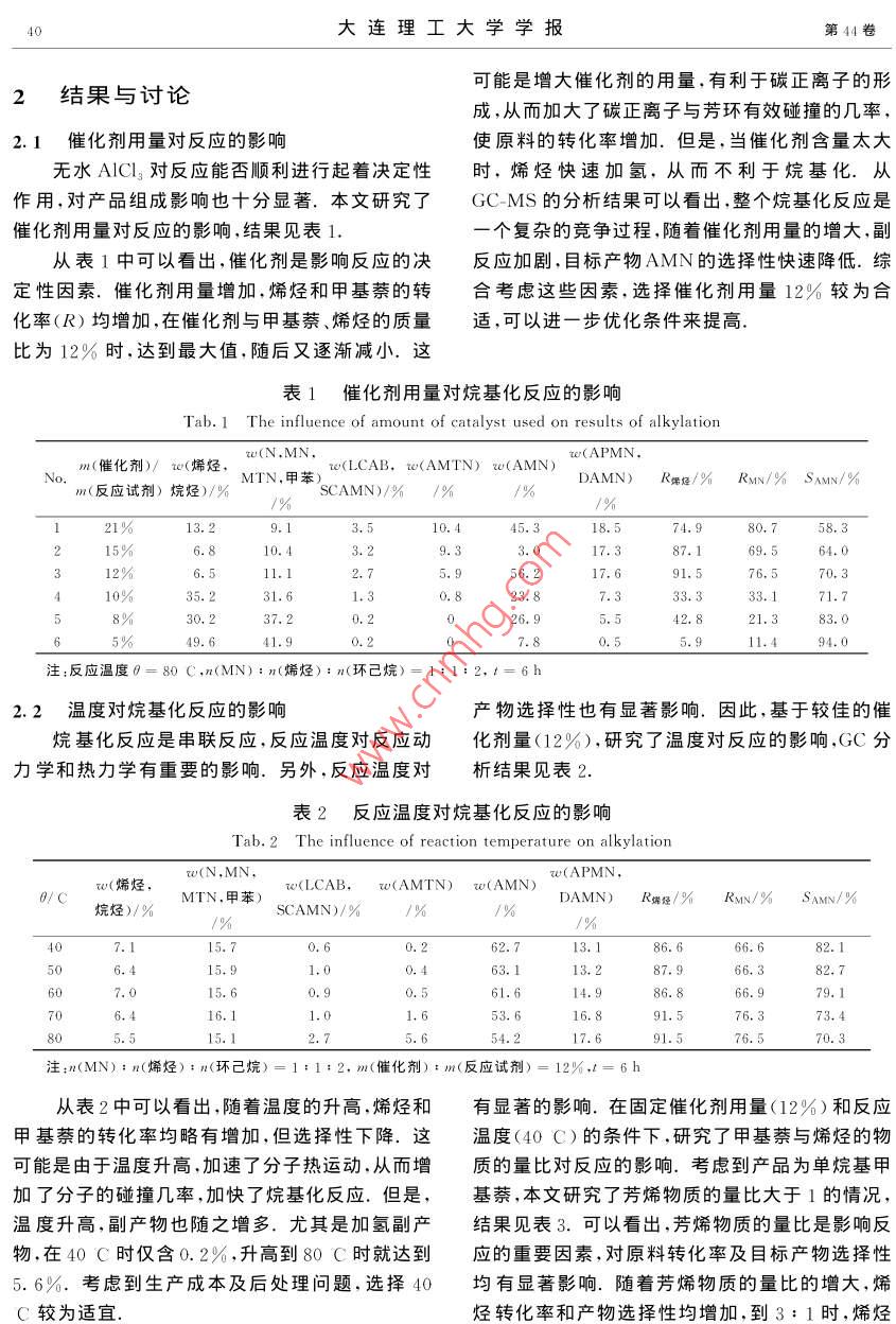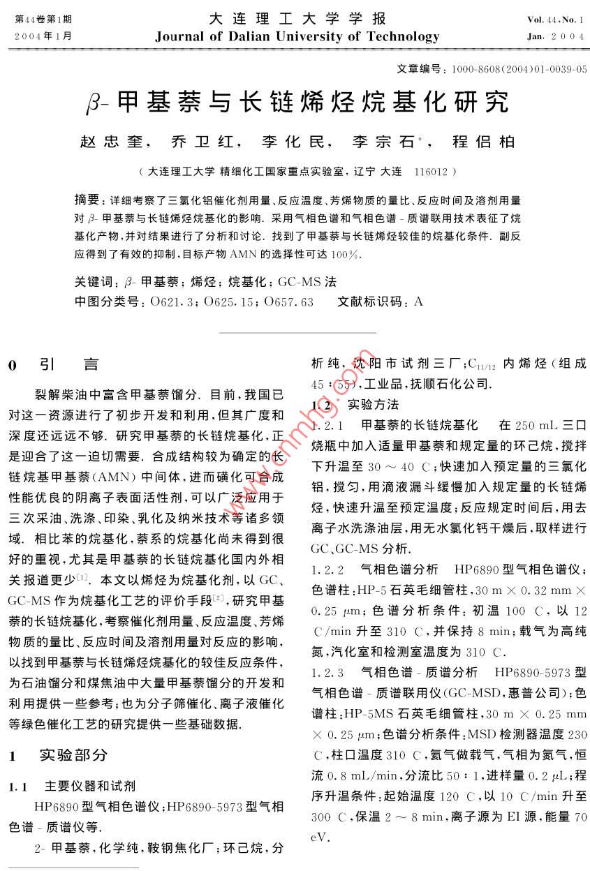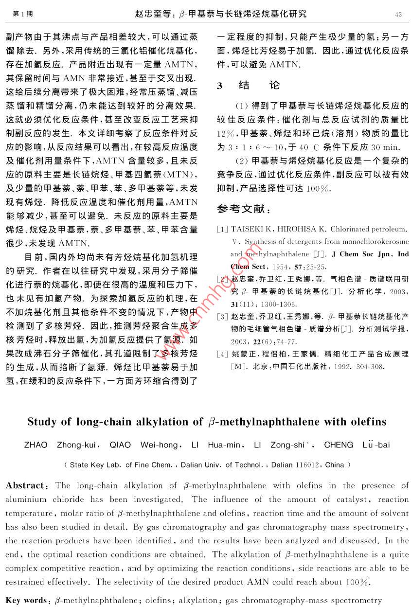 第44卷第1期大連理工大學學報2004年1月Journal of Dalian University of TechnologyJan.2004文章編號: 1000- -8608<(2004 )01-0039-05.β-甲基萘與長鏈烯烴烷基化研究趙忠奎,喬衛(wèi)紅,李化民,李宗石”,程侶柏(大連理工大學精細化工國家重點實驗室,遼寧大連116012 )摘要:詳細考察了三氯化鋁催化劑用量、反應溫度、芳烯物質(zhì)的量比、反應時間及溶劑用量對B-甲基萘與長鏈烯烴烷基化的影響.采用氣相色譜和氣相色譜-質(zhì)譜聯(lián)用技術(shù)表征了烷基化產(chǎn)物,并對結(jié)果進行了分析和討論.找到了甲基蔡與長鏈烯烴較佳的烷基化條件.副反應得到了有效的抑制,目標產(chǎn)物AMN的選擇性可達100%.關(guān)鍵詞: β-甲基萘;烯烴;烷基化; GC-MS法中圖分類號: O621.3; O625. 15; O657. 63文獻標識碼: A0引言析純,沈陽市試劑三廠;C1/2內(nèi)烯烴(組成裂解柴油中富含甲基萘餾分.目前,我國已45: 55),工業(yè)品,撫順石化公司.對這一資源進行了初步開發(fā)和利用,但其廣度和1.2實驗方法1.2.1甲基萘的長鏈烷基化在250mL三口深度還遠遠不夠.研究甲基萘的長鏈烷基化,正燒瓶中加入適量甲基萘和規(guī)定量的環(huán)己烷,攪拌是迎合了這一迫切需要.合成結(jié)構(gòu)較為確定的長下升溫至30~ 40 C;快速加入預定量的三氯化鏈烷基甲基蔡(AMN)中間體,進而磺化可合成鋁,攪勻,用滴液漏斗緩慢加入規(guī)定量的長鏈烯性能優(yōu)良的陰離子表面活性劑,可以廣泛應用于烴,快速升溫至預定溫度;反應規(guī)定時間后,用去.三次采油、洗滌、印染、乳化及納米技術(shù)等諸多領(lǐng).離子水洗滌油層,用無水氯化鈣干燥后,取樣進行域、相比苯的烷基化,萘系的烷基化尚未得到很GC、GC-MS分析. .好的重視,尤其是甲基萘的長鏈烷基化國內(nèi)外相1.2.2 氣相色譜分析 HP6890型氣相色譜儀;關(guān)報道更少0。本文以烯烴為烷基化劑,以GC、色譜柱:HP-5石英毛細管柱,30mX 0. 32 mm XGC-MS作為烷基化工藝的評價手段5] ,研究甲基0.25 pm;色譜分析條件:初溫100 C,以12萘的長鏈烷基化,考察催化劑用量、反應溫度、芳烯C/min升至310 C,并保持8 min;載氣為高純物質(zhì)的量比、反應時間及溶劑用量對反應的影響,氮,汽化室和檢測室溫度為310 C.以找到甲基萘與長鏈烯烴烷基化的較佳反應條件,為石油餾分和煤焦油中大量甲基萘餾分的開發(fā)和1.2.3 氣相色譜-質(zhì)譜分析HP6890- 5973型利用提供一些參考;也為分子篩催化、離子液催化氣相色譜-質(zhì)譜聯(lián)用儀(GC-MSD,惠普公司);色譜柱:HP-5MS石英毛細管柱,30 m X 0.25 mm等綠色催化工藝的研究提供-些基礎(chǔ)數(shù)據(jù).X0.25μm;色譜分析條件:MSD檢測器溫度2301實驗部分C,柱口溫度310 C,氦氣做載氣,氣相為氮氣,恒流0.8 mL/min,分流比50: 1,進樣量0.2 μL;程1.1主要儀器和試劑HP6890型氣相色譜儀;HP6890- 5973型氣相序升溫條件:起始溫度120 C,以10 C/min 升至300 C,保溫2~ 8 min,離子源為EI源,能量70色譜-質(zhì)譜儀等.eV.2-甲基萘,化學純,鞍鋼焦化廠;環(huán)己烷,分收稿日期: 2002-12-29;修回日 期: 2003-12-15.基金項目:“九七三”國家重點基礎(chǔ)研究專項資助項目(G1999022501).作者簡介:趙忠奎(1977-),男,博士生;李宗石* (1936-).男,教授;程侶柏(1933-),男,教授,博士生導師.40大連理工大學學報第44卷可能是增大催化劑的用量,有利于碳正離子的形.2結(jié)果與討論成,從而加大了碳正離子與芳環(huán)有效碰撞的幾率,2.1催化劑用量對反應的影響使原料的轉(zhuǎn)化率增加.但是,當催化劑含量太大無水AICIz對反應能否順利進行起著決定性時,烯烴快速加氫,從而不利于烷基化.從作用,對產(chǎn)品組成影響也十分顯著.本文研究了GC-MS的分析結(jié)果可以看出,整個烷基化反應是催化劑用量對反應的影響,結(jié)果見表1.一個復雜的競爭過程,隨著催化劑用量的增大,副從表1中可以看出,催化劑是影響反應的決.反應加劇,目標產(chǎn)物AMN的選擇性快速降低.綜定性因素.催化劑用量增加,烯烴和甲基萘的轉(zhuǎn)合考慮這些因素,選擇催化劑用量12%較為合化率(R)均增加,在催化劑與甲基萘、烯烴的質(zhì)量適,可以進-步優(yōu)化條件來提高.比為12%時,達到最大值,隨后又逐漸減小.這表1催化劑用量對烷基化反應的影響Tab.1 The influence of amount of catalyst used on results of alkylationm(催化劑)/ w(烯烴,w(N ,MN,rw(LCAB,w(AMTN) w(AMN)w(APMN,MTN,甲苯)DAMN)R粥烴/%Rsv/% SAMx/%m(反應試劑)烷烴)/%1%SCAMN)/% /%/%13.23.545.318.580. 758. 36.810.43.29.33. 017.387. 169.564.012%6.511.12.75.956. 217.676. 570. 310%35.231.61.30.823.833.171.78%30. 237. 20.2026.95.542. 821.383. 05%49.641.97.80.511.494.0注:反應溫度0= 80 C,n(MN) : n(烯烴) : n(環(huán)己烷)= 1: 1: 2.t=6h2.2溫度對烷基化反應的影響產(chǎn)物選擇性也有顯著影響.因此,基于較佳的催烷基化反應是串聯(lián)反應,反應溫度對反應動化劑量(12%),研究了溫度對反應的影響,GC分力學和熱力學有重要的影響.另外,反應溫度對析結(jié)果見表2.表2反應溫度對烷基化反應的影響Tab.2 The influence of reaction temperature on alkylationw(烯烴,w(LCAB,w(AMTN) w(AMN)0/CDAMN) R偶烴/%Rmv/% SAMN/%烷烴)/%SCAMN)/%7.115.70.662. 713.186. 666.682.1506.415.91.00.463. 187.966.382.715.614.986.866.979.116.11.6.53. 616.891.576.373.45.654.2注:n(MN) : n(烯烴) :n(環(huán)己烷)=1: 1:2. m(催化劑) : m(反應試劑)= 12%,t=6h從表2中可以看出,隨著溫度的升高,烯烴和有顯著的影響.在固定催化劑用量(12%)和反應甲基萘的轉(zhuǎn)化率均略有增加,但選擇性下降.這