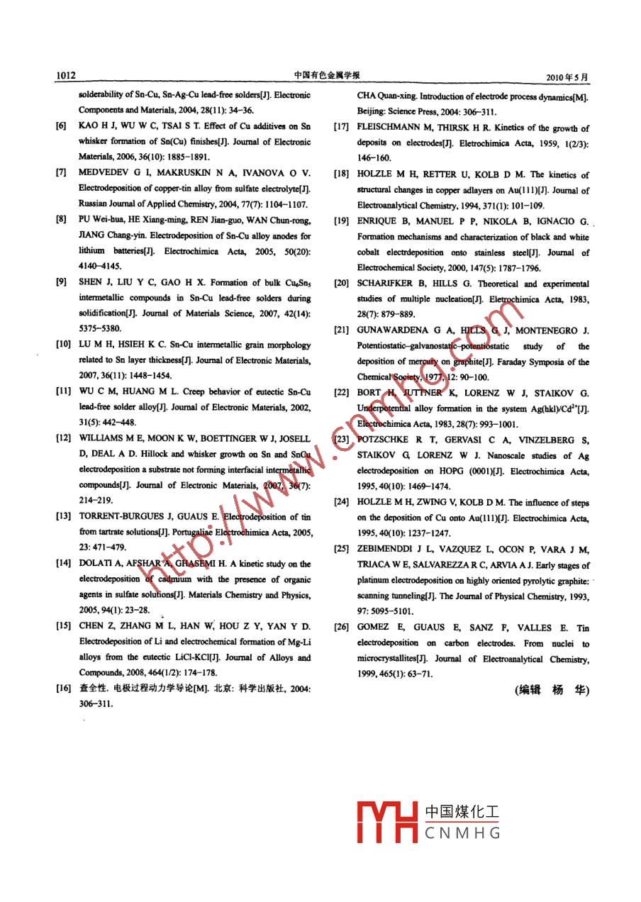 第20卷第5期中國有色金屬學報2010年5月Vol.20 No.5The Chinese Journal of Nonferrous MetalsMay 2010文章編號: 1004-0609(2010)05-1006-07Sn-Cu合金的電沉積行為及添加劑的影響胡煒1,2, 譚澄宇12,崔航',2, 鄭子樵1,2(1.中南大學有色金屬材料科學與工程教育部重點實驗室,長沙410083;2.中南大學材料科學與工程學院,長沙410083)摘要: 利用循環(huán)伏安和計時安培研究Sn-Cu哈金體系在玻碳電極上的電沉積行為,通過陰極極化曲線、SEM觀察及EDS分析討論檸檬酸和硫脲對Sn-Cu共沉積的影響。結(jié)果表明,Sn- Cu共沉積過程為擴散控制的不可逆過程:在沉積電位- 600~-750 mV的范圍內(nèi)Sn-Cu共沉積初期結(jié)晶行為滿足三維Scharifker Hil瞬時成核模型,隨著過電位的增大,形核活性點增多,形核弛豫時間縮短;當沉積過電位大于-700 mV時,Sn2*的擴 散系數(shù)約為6.435X10*cm7/s;檸檬酸和硫脈的加入細化了鍍層晶粒,使鍍層表面更加平整和致密。此外,硫脲的加入降低了鍍層中銅的含量,使合金鍍層中銅的含量維持在0.5%~ 2.0%(質(zhì)量分數(shù))。關(guān)鍵詞: Sn-Cu合金; 形核;循環(huán)伏安:電沉積;中圖分類號: TQ172.84文獻標志碼: AElectrodeposition behavior of Sn-Cu alloy and effect ofadditives on deposition processHU Weil.2 TAN Cheng:yu'., CUI Hang'", ZHENG Zi-qiaol'2(1. Educational Key Laboratory of Non-ferrous Metal Materials Science and Engineering,Central South University, Changsha 410083, China;2. School of Materials Science and Engineering, Central South University, Changsha 410083, China)Abstract: The eletrodeposition of Sn-Cu alay system on the glass carbon electrode was investigated by cyclicvoltammetry (CV) and chronoamperometry (CA). The effet of citric acid and thiourea additives on Sn-Cu alloycodeposition was discussed by cathodic polarization curve, SEM observation and EDS analysis. The results indicate thatthe electrodeposition process of Sn-Cu is an ireversible process controlled by diffusion, and the codeposition of Sa-Cualloy system in the initial stage follows Scharifker-Hills (SH) instantaneous nucleation/growth mechanism in the potentialrange of- 600-- -750 mV. With increasing the overpotential, the activity-point for oucleation increases, and thenucleation relaxation time reduces. When the depositin overpotential is higher than -700 mV, the diffusion coeficientof Sn2+ is 6.435*10*cm2/s. The additin of citric acid and thiourea refines grains in coating and the surface of coatingbecomes more even and compact. The presence of thiourea reduces clearly the copper content in coating and makes thecopper content remain in the range of 0.5% -2.0%(mass fraction),Key words: Sn-Cu alloy; nucleation; cyclic voltammetry; electrodeposition電子產(chǎn)品中使用的印刷電路板和表面貼片元件表Sn-Pb合金鍍層是傳統(tǒng)電子電鍍中廣泛使用的可焊性面通常都需要電鍍可焊性鍍層來實現(xiàn)二者的互聯(lián)。鍍層中國煤煤化工時環(huán)境造成了嚴重基金項目:民門配套資助項月(MKPT98.106)TYHCNMHG收稿日期: 2009-06-01; 修訂日期: 2010-01-15通信怍者:譚澄字,教授,博七: 電話: 03188830270; E-mail: tacbeay@abo.co.cno第20卷第5期胡煒,等: Sn-Cu合金的電沉積行為及添加劑的影響1007污染。在歐盟WEE和RoHS指令中,鉛已經(jīng)被明確禁極。電鍍工藝流程為乙醇除油→蒸餾水洗.10%稀硫止在電子產(chǎn)品中使用2,我國也于2007年3月1日正式酸除氧化膜→蒸餾水洗→磷酸擦拭活化表面→電鍍施行《電子信息產(chǎn)品污染控制管理辦法》,確定了對電Sn-Cu合金- +蒸餾水洗→干燥。利用Sirion200型場發(fā)射子信息產(chǎn)品中含有的鉛等多種有毒、有害物質(zhì)限制或掃描電鏡觀察合金鍍層的微觀表面形貌及對鍍層成分禁止使用,因此,需要開發(fā)無鉛可焊性鍍層以實現(xiàn)電進行EDS分析。子封裝行業(yè)的可持續(xù)發(fā)展。由于Sn-Cu合金鍍層的綜合性能較好,因此,.2 電化學測試Sn-Cu合金鍍層成為最有發(fā)展前途的可焊性鍍層之實驗采用CH1660C型電化學工作站(上海辰華)分其主要表現(xiàn)為低毒、沉積速度快、可焊性好、成別對Sn-Cu鍍液體系進行陰極極化曲線、循環(huán)伏安及本較低,且還具有在波峰焊過程中不污染焊料等優(yōu)點。計時安培測試,研究Sn-Cu合金共沉積機理,探討添Sn-Cu合金鍍層釬料既適宜于表面貼裝的再流焊,也加劑對合金沉積的影響。所有電化學測試都采用三電適用于接插型的波峰焊,是最具研究和應用價值的極體系,以玻碳電極為工作電極,輔助電極采用大面Sn系鍍層體系。OKADA等)研究表明,Sn-Cu(0.1%~積光亮鉑片,232型飽和甘汞電極為參比電極。極化曲0.2%)合金具有很強的抗錫須生長能力,即使在高溫下線掃描速度為1 mV/s,循環(huán)伏安掃描速度為100 mV/s;也有很好的可焊性。日本上村工業(yè)公司開發(fā)的Soft溶液溫度控制在(25士1)C。Alloy GTC220型電鍍液,很好地解決了晶須的產(chǎn)生問題,已具備電鍍作業(yè)性良好和成本低廉等優(yōu)點。目前,2結(jié)果與分析報道有關(guān)Sn-Cu合金鍍層研究的文獻不多,并且大多數(shù)都集中在制備工藝、鍍液組成及相關(guān)性能方面412),2.1循環(huán)伏安分析有關(guān)電化學共沉積過程與電結(jié)晶機理的研究報道較圖1所示為不同掃描速度下Sn-Cu合金鍍液的少。TORRENT-BURGUES和GUAUS [1]對純錫體系在循環(huán)伏安曲線。從圖1(a)可以看出,隨著掃描速度酸性條件下的電結(jié)晶行為進行研究。結(jié)果表明:錫的的加快,正掃過程中的還原峰電流逐漸增大,還原電電結(jié)晶行為遵循擴散控制的三維瞬時形核機制,添加