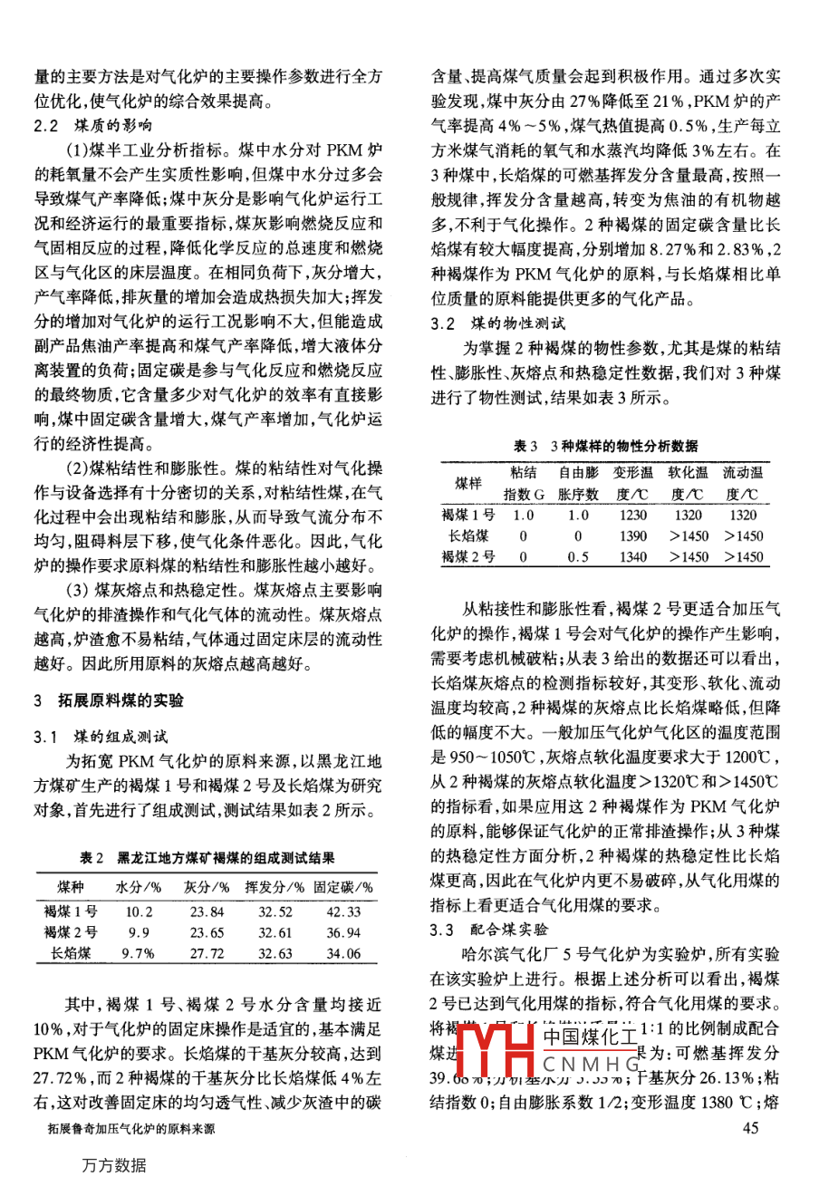 ★加工轉(zhuǎn)化★拓展魯奇加壓氣化爐的原料來源王海1)張麗華2)陳曉春3(1.哈爾濱氣化廠,黑龍江省哈爾濱市道里區(qū),150076;2.哈爾濱燃?xì)夤こ淘O(shè)計(jì)研究院,黑龍江省哈爾濱市道里區(qū),150076;3.北京化工大學(xué)1號(hào)信箱,北京市朝陽區(qū),100029)摘要通過對(duì)長焰煤、褐煤1號(hào)、褐煤2號(hào)、長焰煤與褐煤1號(hào)配合煤的物化性能等測(cè)試,用多次實(shí)驗(yàn)的結(jié)果說明褐煤2號(hào)和配合煤可用做PKM氣化爐原料。認(rèn)為加壓氣化爐的原料拓展是可行的,對(duì)保證企業(yè)的正常生產(chǎn)、提高氣化效率、提高企業(yè)經(jīng)濟(jì)效益都有益處。關(guān)鍵詞PKM氣化爐影響因素物性測(cè)試實(shí)驗(yàn)研究原料拓展1哈爾濱氣化廠的煤質(zhì)要求化廠的經(jīng)濟(jì)效益具有重要的現(xiàn)實(shí)意義哈爾濱氣化廠PKM氣化爐原料煤質(zhì)量指標(biāo)如哈爾濱氣化廠1993年引進(jìn)德國魯奇加壓氣化表1所示。該氣化爐設(shè)計(jì)日產(chǎn)煤氣160萬m3,年需裝置,其關(guān)鍵設(shè)備無粘破裝置的設(shè)計(jì)只適合長焰煤,6.3~-50mm的長焰煤71.38萬t,對(duì)煤質(zhì)的理想要用煤范圍很窄。裝置自投產(chǎn)以來,采用的原料來源求為水分<9%,灰分<26%顆粒限下率<3%‰。投于依蘭煤礦無粘結(jié)性的長焰煤,雖然運(yùn)行效果穩(wěn)定產(chǎn)以來,一直用依蘭無粘結(jié)性長焰煤,單一的原料路但單一的原料供應(yīng)路線難以適應(yīng)企業(yè)發(fā)展的要求。線和原料煤灰分指標(biāo)很難達(dá)到設(shè)計(jì)要求,嚴(yán)重影響隨著依蘭煤礦開采量和儲(chǔ)量的動(dòng)態(tài)變化,低粘結(jié)長氣化效果和經(jīng)濟(jì)效益。焰煤的長期穩(wěn)定供應(yīng)難以保證,而哈爾濱地區(qū)煤礦2影響氣化效率的主要因素的褐煤儲(chǔ)量豐富。因此,哈爾濱氣化廠在對(duì)引進(jìn)設(shè)備進(jìn)行二次開發(fā)的同時(shí),為使PKM氣化爐適應(yīng)國2.1操作條件的影響內(nèi)煤礦資源結(jié)構(gòu)的需要,進(jìn)一步開發(fā)、拓展氣化裝置從化學(xué)工程角度分析,在一定條件下,要用原料的新原料路線,釆取調(diào)整氣化裝置的運(yùn)行策略,配套煤生產(chǎn)出滿足要求的合格煤氣,必須維持一定的氧改造煤氣的后處理工藝。本文主要以哈爾濱部分煤氣負(fù)荷。氧負(fù)荷過大,將導(dǎo)致原料煤轉(zhuǎn)化為CO2,從礦的褐煤為研究對(duì)象,探討PKM氣化爐應(yīng)用褐煤而增大煤的損失,所以必須維持合適的水蒸汽量,以為原料的可行性,對(duì)于更好地利用國外技術(shù),提高氣滿足煤氣化的要求。水蒸汽量減少,將導(dǎo)致煤的氣表1哈爾濱氣化廠PKM氣化爐原料煤的質(zhì)量指標(biāo)煤種粒度/mm水分/%灰分/%揮發(fā)分/%固定碳/%焦油含量/%非粘結(jié)性煤7~209.726.421.142.8弱粘結(jié)性煤22.031.042.010.5化效率降低;水蒸汽量增大雖然碳的氣化效率得到子數(shù)V凵中國煤化工成甲烷有利同時(shí)體保證,但大量的水蒸汽在系統(tǒng)內(nèi)循環(huán),加大了水處理系內(nèi)CNMHG和降低煤的氧化消的負(fù)荷能量消耗進(jìn)一步增大;生成甲烷的反應(yīng)為分耗。因此在原料煤相對(duì)穩(wěn)定的情況下,提高煤氣產(chǎn)中國煤炭第29卷第8期2003年8月量的主要方法是對(duì)氣化爐的主要操作參數(shù)進(jìn)行全方含量、提高煤氣質(zhì)量會(huì)起到積極作用。通過多次實(shí)位優(yōu)化,使氣化爐的綜合效果提高。驗(yàn)發(fā)現(xiàn),煤中灰分由27%降低至21%,PKM爐的產(chǎn)2.2煤質(zhì)的影響氣率提高4%~5%,煤氣熱值提高0.5%,生產(chǎn)每立(1)煤半工業(yè)分析指標(biāo)。煤中水分對(duì)PKM爐方米煤氣消耗的氧氣和水蒸汽均降低3%左右。在的耗氧量不會(huì)產(chǎn)生實(shí)質(zhì)性影響,但煤中水分過多會(huì)3種煤中,長焰煤的可燃基揮發(fā)分含量最高,按照導(dǎo)致煤氣產(chǎn)率降低;煤中灰分是影響氣化爐運(yùn)行工般規(guī)律,揮發(fā)分含量越高,轉(zhuǎn)變?yōu)榻褂偷挠袡C(jī)物越?jīng)r和經(jīng)濟(jì)運(yùn)行的最重要指標(biāo),煤灰影響燃燒反應(yīng)和多,不利于氣化操作。2種褐煤的固定碳含量比長氣固相反應(yīng)的過程,降低化學(xué)反應(yīng)的總速度和燃燒焰煤有較大幅度提高,分別增加8.27%和2.83%,區(qū)與氣化區(qū)的床層溫度。在相同負(fù)荷下,灰分增大,種褐煤作為PKM氣化爐的原料,與長焰煤相比單產(chǎn)氣率降低,排灰量的增加會(huì)造成熱損失加大;揮發(fā)位質(zhì)量的原料能提供更多的氣化產(chǎn)品。分的增加對(duì)氣化爐的運(yùn)行工況影響不大,但能造成3.2煤的物性測(cè)試副產(chǎn)品焦油產(chǎn)率提高和煤氣產(chǎn)率降低,增大液體分為掌握2種褐煤的物性參數(shù),尤其是煤的粘結(jié)離裝置的負(fù)荷;固定碳是參與氣化反應(yīng)和燃燒反應(yīng)性、膨脹性、灰熔點(diǎn)和熱穩(wěn)定性數(shù)據(jù),我們對(duì)3種煤的最終物質(zhì),它含量多少對(duì)氣化爐的效率有直接影進(jìn)行了物性測(cè)試結(jié)果如表3所示。響,煤中固定碳含量增大,煤氣產(chǎn)率增加,氣化爐運(yùn)行的經(jīng)濟(jì)性提高。表33種煤樣的物性分析數(shù)據(jù)(2)煤粘結(jié)性和膨脹性。煤的粘結(jié)性對(duì)氣化操作與設(shè)備選擇有十分密切的關(guān)系,對(duì)粘結(jié)性煤,在氣煤樣粘結(jié)自