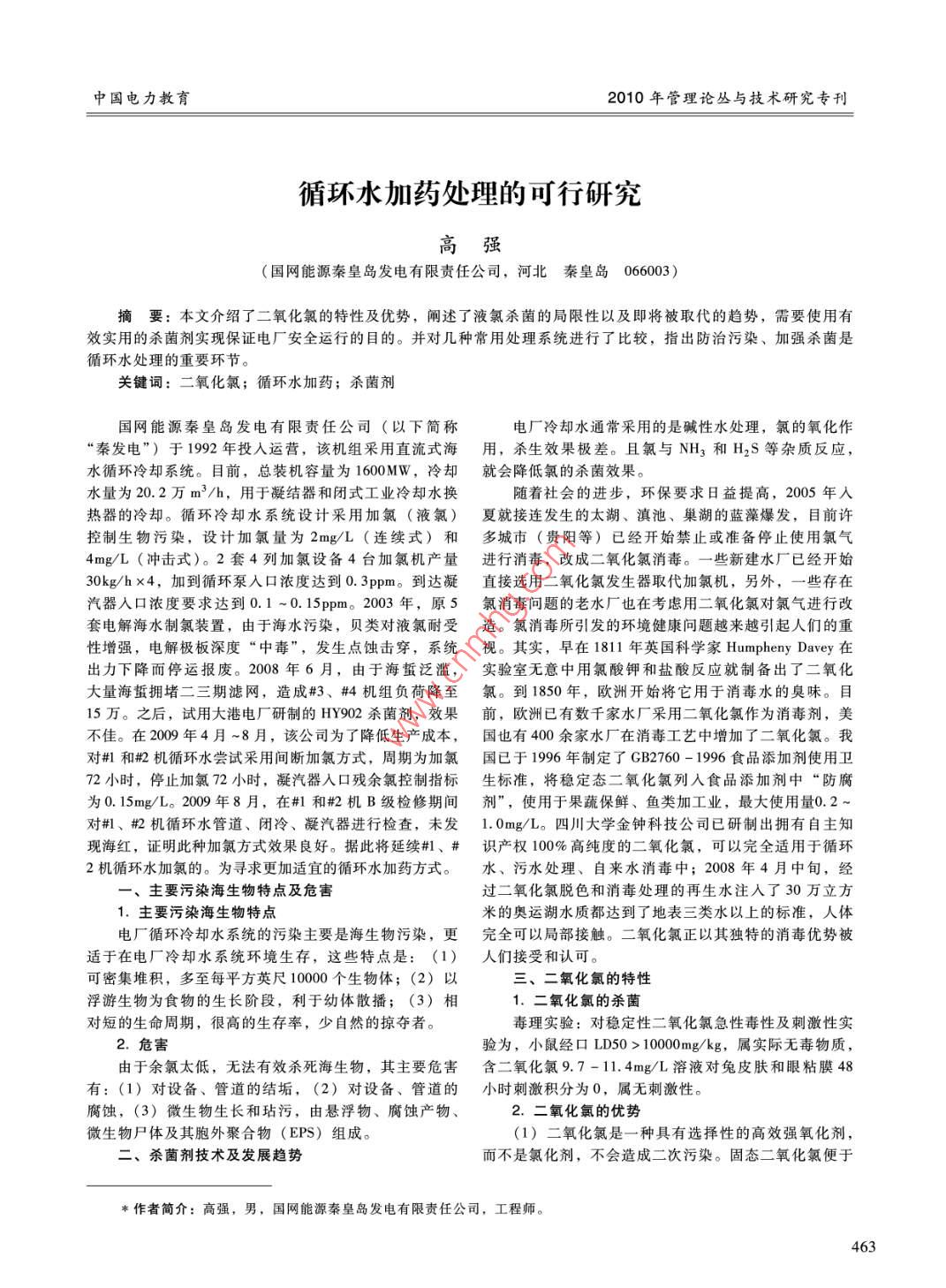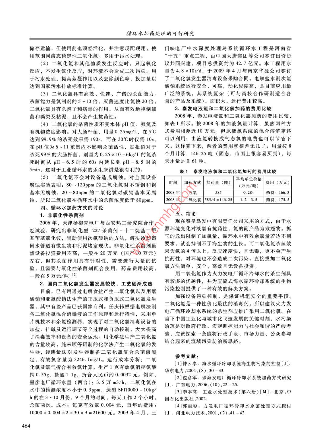 中國電力教育2010年管理論叢與技術(shù)研究??h(huán)水加藥處理的可行研究高強(國網(wǎng)能源秦皇島發(fā)電有限責(zé)任公司,河北秦皇島066003)摘要:本文介紹了二氧化氯的特性及優(yōu)勢,闡述了液氯殺菌的局限性以及即將被取代的趨勢,需要使用有效實用的殺菌劑實現(xiàn)保證電廠安全運行的目的。并對幾種常用處理系統(tǒng)進行了比較,指出防治污染、加強殺菌是循環(huán)水處理的重要環(huán)節(jié)。關(guān)鍵詞:二氧化氯;循環(huán)水加藥;殺菌劑國網(wǎng)能源秦皇島發(fā)電有限責(zé)任公司(以下簡稱電廠冷卻水通常釆用的是堿性水處理,氯的氧化作“秦發(fā)電”)于1992年投入運營,該機組采用直流式海用,殺生效果極差。且氯與NH3和H2S等雜質(zhì)反應(yīng),水循環(huán)冷卻系統(tǒng)。目前,總裝機容量為1600MW,冷卻就會降低氯的殺菌效果。水量為20.2萬m3/h,用于凝結(jié)器和閉式工業(yè)冷卻水換隨著社會的進步,環(huán)保要求日益提高,2005年入熱器的冷卻。循環(huán)冷卻水系統(tǒng)設(shè)計采用加氯(液氯)夏就接連發(fā)生的太湖、滇池、巢湖的藍藻爆發(fā),目前許控制生物污染,設(shè)計加氯量為2mg/L(連續(xù)式)和多城市(貴陽等)已經(jīng)開始禁止或準(zhǔn)備停止使用氯氣4mg/L(沖擊式)。2套4列加氯設(shè)備4臺加氯機產(chǎn)量進行消毒,改成二氧化氯消毒。一些新建水廠已經(jīng)開始30kg/h×4,加到循環(huán)泵入口濃度達到0.3ppm。到達凝直接選用二氧化氯發(fā)生器取代加氯機,另外,一些存在汽器入口濃度要求達到0.1~0.15ppm。2003年,原5氯消毒問題的老水廠也在考慮用二氧化氯對氯氣進行改套電解海水制氯裝置,由于海水污染,貝類對液氯耐受造。氯消毒所引發(fā)的環(huán)境健康問題越來越引起人們的重性增強,電解極板深度“中毒”,發(fā)生點蝕擊穿,系統(tǒng)視。其實,早在1811年英國科學(xué)家 Humpheny Davey在出力下降而停運報廢。208年6月,由于海蜇泛濫,實驗室無意中用氯酸鉀和鹽酸反應(yīng)就制備出了二氧化大量海蜇擁堵二三期濾網(wǎng),造成#3、#4機組負荷降至氯。到1850年,歐洲開始將它用于消毒水的臭味。目15萬。之后,試用大港電廠研制的HY902殺菌劑,效果前,歐洲已有數(shù)千家水廠采用二氧化氯作為消毒劑,美不佳。在2009年4月~8月,該公司為了降低生產(chǎn)成本,國也有400余家水廠在消毒工藝中增加了二氧化氯。我對#和#機循環(huán)水嘗試采用間斷加氯方式,周期為加氯國已于1996年制定了GB2760-1996食品添加劑使用衛(wèi)72小時,停止加氯72小時,凝汽器入口殘余氯控制指標(biāo)生標(biāo)準(zhǔn),將穩(wěn)定態(tài)二氧化氯列入食品添加劑中“防腐為0.15mg/L。2009年8月,在#和#機B級檢修期間劑”,使用于果蔬保鮮、魚類加工業(yè),最大使用量0.2對#、#機循環(huán)水管道、閉冷、凝汽器進行檢查,未發(fā)1.0mg/L。四川大學(xué)金鐘科技公司已研制出擁有自主知現(xiàn)海紅,證明此種加氯方式效果良好。據(jù)此將延續(xù)相、#識產(chǎn)權(quán)100%高純度的二氧化氯,可以完全適用于循環(huán)2機循環(huán)水加氯的。為尋求更加適宜的循環(huán)水加藥方式。水、污水處理、自來水消毒中;2008年4月中旬,經(jīng)、主要污染海生物特點及危害過二氧化氯脫色和消毒處理的再生水注入了30萬立方主要污染海生物特點米的奧運湖水質(zhì)都達到了地表三類水以上的標(biāo)準(zhǔn),人體電廠循環(huán)冷卻水系統(tǒng)的污染主要是海生物污染,更完全可以局部接觸。二氧化氯正以其獨特的消毒優(yōu)勢被適于在電廠冷卻水系統(tǒng)環(huán)境生存,這些特點是:(1)人們接受和認(rèn)可??擅芗逊e,多至每平方英尺10000個生物體;(2)以、二氧化氯的特性浮游生物為食物的生長階段,利于幼體散播;(3)相1.二氧化氯的殺菌對短的生命周期,很高的生存率,少自然的掠奪者。毒理實驗:對穩(wěn)定性二氧化氯急性毒性及刺激性實2.危害驗為,小鼠經(jīng)口LD50>10000mg/kg,屬實際無毒物質(zhì),由于余氯太低,無法有效殺死海生物,其主要危害含二氧化氯9.7-11.4mg/L溶液對兔皮膚和眼粘膜48有:(1)對設(shè)備、管道的結(jié)垢,(2)對設(shè)備、管道的小時刺激積分為0,屬無刺激性。腐蝕,(3)微生物生長和玷污,由懸浮物、腐蝕產(chǎn)物2.二氧化氯的優(yōu)勢微生物尸體及其胞外聚合物(EPS)組成。(1)二氧化氯是一種具有選擇性的高效強氧化劑,殺菌劑技術(shù)及發(fā)展趨勢而不是氯化劑,不會造成二次污染。固態(tài)二氧化氯便于*作者簡介:高強,男源秦皇島發(fā)電有限責(zé)任公司,工程師。循環(huán)水加藥處理的可行研究儲存運輸,但使用前也須經(jīng)活化,并注意現(xiàn)配現(xiàn)用,使門峽電廠中水深度處理島系統(tǒng)循環(huán)水工程是河南省用范圍同液態(tài)穩(wěn)定性二氧化氯。多用于污水處理?!笆濉敝攸c工程,由中國大唐集團等公司簽訂出資協(xié)(2)二氧化氯和其他物質(zhì)發(fā)生反應(yīng)時,只起氧化議共同興建,項目總投資約為42.7億元。本工程用水反應(yīng),不發(fā)生氯化反應(yīng),對環(huán)境不會造成二次污染。用量為4.8×10td,于2009年4月與南京華源公司簽訂于污水處理,提高絮凝作用以及去除顏色等,投加量以了二氧化氯發(fā)生器消毒設(shè)備采購合同。電解鹽水制次氯達到國家污水排放標(biāo)準(zhǔn)計算。酸鈉系統(tǒng)運