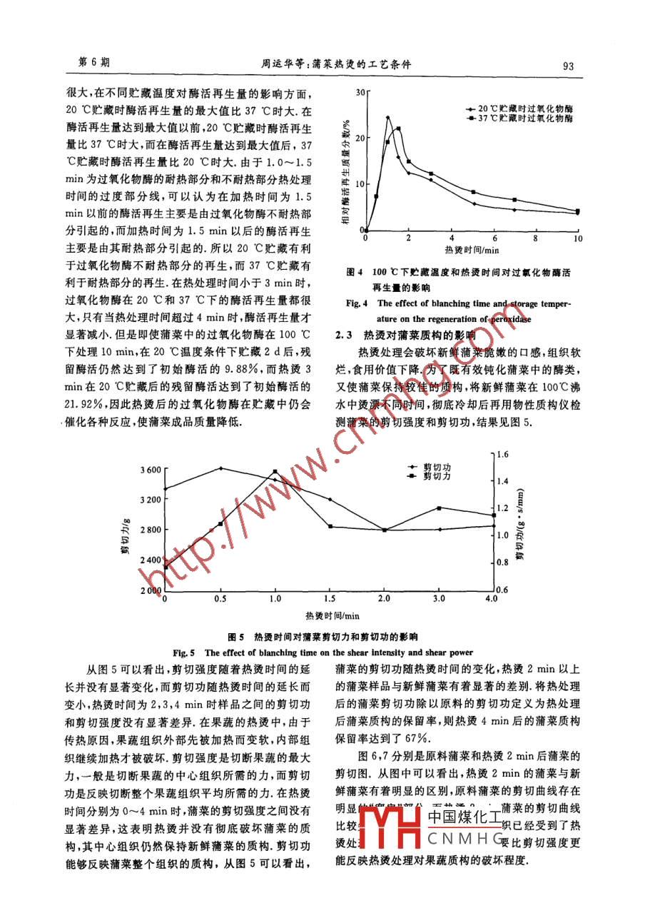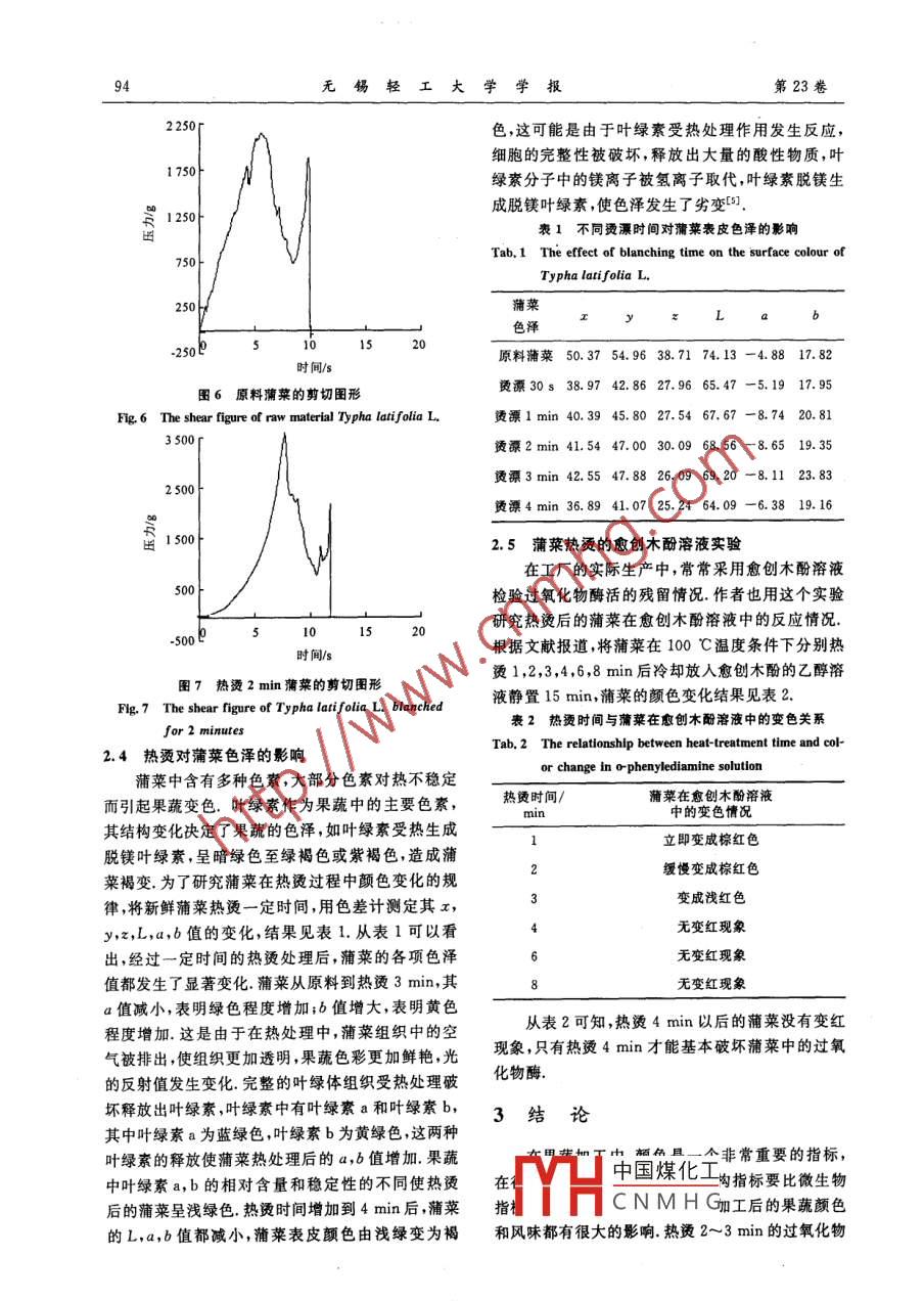 第23卷第6期無錫輕工大學學報Vol 23 No 62004年11月Journal of Wuxi University of Light IndustryNov.2004文章編號:1009-038X(2004)06-0090-06蒲菜熱燙的工藝條件周運華,張慜(江南大學食品學院,江蘇無錫214036)摘要:通過對過氧化物酶的殘留酶活、色差、剪切強度和剪切功的分析,研究了熱燙時間和貯藏溫度對蒲菜的過氧化物酶、色澤和質構的影響.結果表明,在100℃的熱燙溫度下隨著熱燙時間的延長,過氧化物酶活降低,而貯藏2d后酶活的再生量先增大后降低,在熱處理時間為1.0~1.5min時達到最大值;熱燙時間為4min時,可基本破壞蒲茉中的過氧化物酶,且蒲萊的質構和色澤較好關鍵詞:蒲菜;過氧化物酶;質構;色澤;熱燙中圖分類號:TS255.36文獻標識碼:AThe Study of Heat-Treatment Condition of Typha latifolia L.HOu Yun- hua, ZHANG Min(School of Food Science and Technology, Southern Yangtze University, Wuxi 214036, China)Abstract: By analysis of the retention activity of peroxidase, chromatic aberration, shear intensityand shear power, the effect of different blanching time on the peroxidase, surface color andtexture was studied. The result showed that the activity of peroxidase decreased with the increaseof blanching time at 100 C, while the regeneration amounts of peroxidase after storaging for 2days increased first and then decreased, with the maximum regeneration value occurred when theblanching time was at the range of 1 to 1. 5 minutes. When blanching time was 4 minutes, theperoxidase in Typha latifolia L. were mostly inactivated, the texture and the surface colour canbe well retaineKey words: Typha latifolia L; peroxidase; texture; surface color: heat-treatment蒲菜歸屬于香蒲科的香蒲屬( Typha),在我國統(tǒng)分類為EC.1.1.1.7,在自然界廣泛分布POD特別是長江以南的湖、水渠、溝塘中,其分布比較廣能催化4種類型的反應:(1)過氧化反應;(2)氧化泛,多呈野生狀態(tài).它在我國作為蔬菜食用有很強反應;(3)過氧化氫反應;(4)羥基化反應,但主要催的地域性,其他國家或地區(qū)主要作為水生觀賞植物化以過氧化物和氫供體為底物的過氧化反應().過或凈化水質或藥用氧化物酶在果蔬加工中的作用主要包括:(1)過氧在果蔬加工中,過氧化物酶是一個非常重要的化物酶的活力與果蔬產品,特別是與那些非酸性蔬影響因素.過氧化物酶(POD)屬氧化還原酶系,系菜在保存期間形成的不良風味有關;(2)過氧化物收稿日期:2004-04-02;修回日期:2004-0630.作者簡介:周運華(1976),男湖南衡山人農產品貯藏與加工TH中國煤化工CNMHG第6期周運華等:蒲萊熱燙的工藝條件酶的活力與果蔬中的酶促褐變有關,過氧化物酶能搗碎機中搗碎成均漿,均漿用雙層紗布過濾后再置催化果蔬中的酚類物質生成有色的醌類物質而使于冷凍離心機中以5000r/min的速度離心10min果蔬變色;(3)過氧化物酶屬于最耐熱的酶類,它在得到澄清的酶液制得的酶液保存于冰箱中待用果蔬加工中常被用作熱處理是否充分的指標,這是1.3.2過氧化物酶液的熱處理在8支試管中加因為當果蔬中的過氧化物酶在熱加工中失活時,其入一定容量的酶液,先將各試管在溫度為60℃的他酶以活性形式存在的可能性很小;(4)過氧化物水浴中保溫1min,然后將試管移至溫度為100℃酶與果蔬的木質化有關的另一水浴鍋隨即記錄時間,分別在30s,1,1,5,為了保持加工果蔬的良好品質就必須將果蔬2,3,5,7min和10min時取出一支試管作上相應原料中的過氧化物酶鈍化,在果蔬加工中,熱處理的時間標簽,并立即將試管在冰浴中冷卻是一個非常重要而有效的方法.據報道,許多果蔬1.3.3過氧化物酶活力的測定將待測酶液靜置中的過氧化物酶在80~90℃溫度范圍的熱失活是20min后,在比色皿中加入2.6mL緩沖液Ⅱ(0.1個雙相和部分可逆的過程,這是由于過氧化物mol/L磷酸鹽緩沖液pH值7.0),0.1mL鄰苯二酶存在不同的耐熱部分,其中不耐熱部分在熱處理胺乙醇溶液,0.2mL過氧化氫溶液,然后加入0.1時迅速失活,耐熱部分則緩慢失活,并且熱處理后mL酶液,混合均勻,在430m波長下,用分光光度的酶在貯藏中,已失活的酶活又可部分再生,由于計測定反應混合物吸光度的變化,而未經熱處理的過氧化物酶的耐熱部分在熱處理中緩慢失活,徹底酶液稀釋10倍后進行活力測定.以每分鐘光密度鈍化果蔬中的過氧化物酶所需要的熱燙時間將對增加一個單位定義為一個酶活單位,單位為果蔬的質構和色澤造成較大的破壞,故不能為了破△Asm/min.為方便比較并將原料酶液的酶活定為壞過氧化物酶而任意延長果蔬的熱燙時間在有關100%,其他熱處理后的酶活與其相比較計算其相對果蔬熱燙處理工藝的研究文獻中,并沒有熱燙時對酶活間和貯藏溫度對過氧化物酶活的再生及熱燙對果1.3.4剪切強度和剪切功的測定采用物性測試蔬色澤質構的研究報道蒲菜的熱燙工藝報道就更儀測定模具為A/LKBF,切割前刀片速度為5.0少.在蒲菜軟罐頭的研究中,為了生產品質良好的mm/s,切割速度為1.0mm/s,切割后速度為5.0產品,作者就熱燙對蒲菜的過氧化物酶、色澤和質mm/s,取切斷蒲菜的最大力為剪切強度,單位為g構進行了研究,以確定合適的熱燙工藝條件,為蒲取切斷蒲菜所需的總功除以剪切距離為剪切功,單菜的加工生產提供參考位為g.s/mm.剪切強度和剪切功都是用來衡量熱處理對蒲菜質構的破壞程度剪切強度和剪切功越材料與方法小,表明熱處理對蒲菜質構的破壞程度越大1.1原料及藥品試劑1.3.5色澤的測定采用TCPⅡ型全自動色差蒲菜原料由淮安市天妃宮蒲菜種植專業(yè)戶提測定儀測
