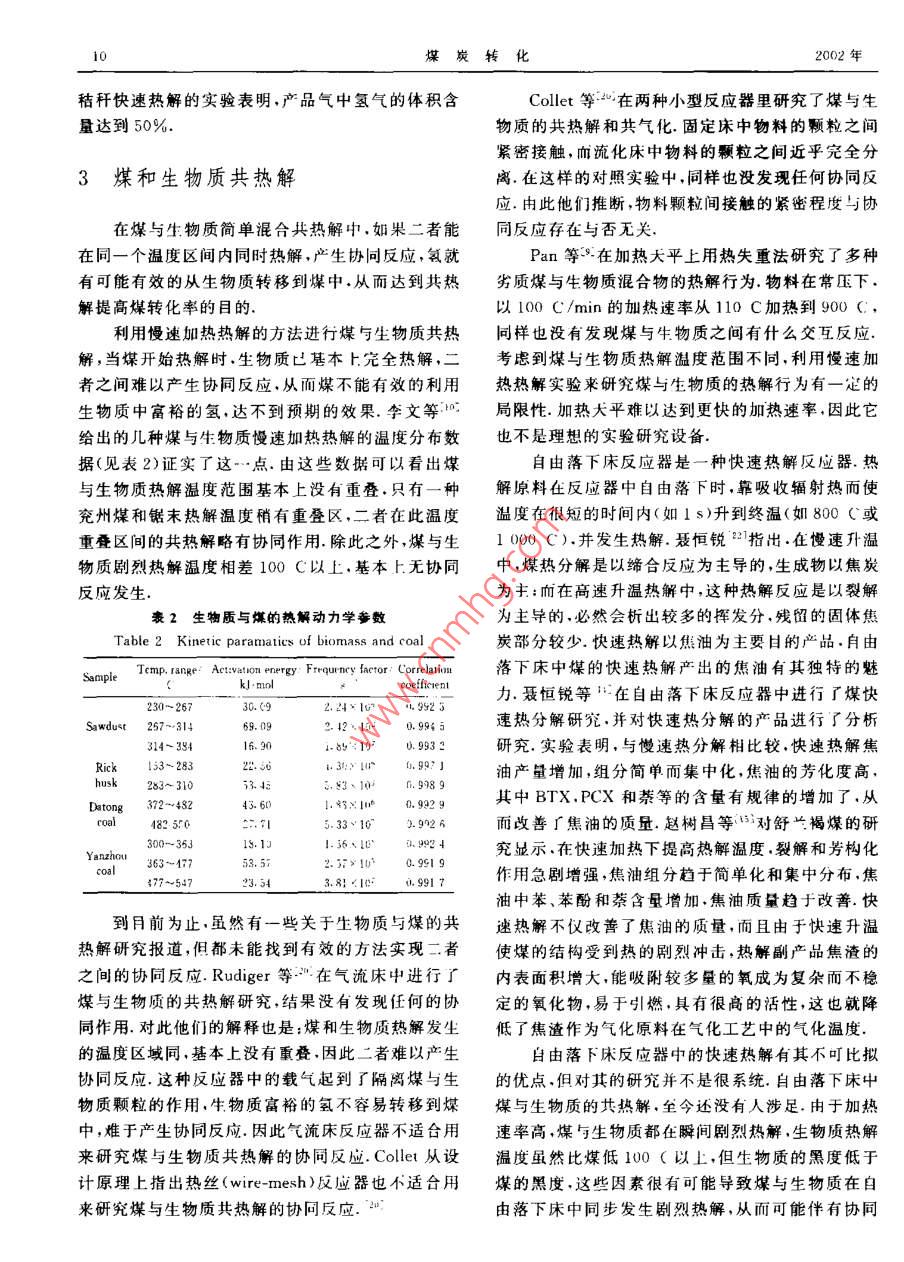第25卷第1期媒炭轉(zhuǎn)化Vol.21 No. 12002年1月COAI, C(NVERSIONJan. 2002煤與生物質(zhì)的共熱解李世光”徐紹 平1摘要對(duì)近年來煤與生物質(zhì)共熱解的研究作了綜述.研究的焦點(diǎn)集中在由富氨的生物質(zhì)向貧氫的煤的轉(zhuǎn)移,即尋找是否存在所謂的協(xié)同效應(yīng)。在固定床、流化床等類型反應(yīng)器中煤與生物質(zhì)共熱解的研究沒有發(fā)現(xiàn)協(xié)同效應(yīng)。這主要是因?yàn)槊号c生物質(zhì)熱解溫度的差異所造成的.至今還沒見到在自由落下床中煤與生物質(zhì)共熱解的研究報(bào)道.在這種類型的反應(yīng)器中,物料自由落下,物料粒子的溫度很大程度上依賴于其黑度.由于煤的黑度遠(yuǎn)遠(yuǎn)大于生物質(zhì)的黑度。在自由落下床中可以使二者達(dá)到同步熱解.此外.生物質(zhì)熱解產(chǎn)生的富氫氣體可以作為煤加氫熱解的氫源.在這個(gè)基礎(chǔ)上。提出了兩步法共熱解的思路.關(guān)鍵詞煤,生物質(zhì),共熱 解中圖分類號(hào)TQ530. 2解轉(zhuǎn)化率不高。因此如何供氫以提高煤轉(zhuǎn)化率成了0引言熱解研究的關(guān)鍵。這使得加氫熱解度成為煤清潔利用的研究熱點(diǎn).由于純氫的生產(chǎn)成本較高,研究者隨著石油資源儲(chǔ)量的日益臧少.從長(zhǎng)遠(yuǎn)來看.國(guó)們把注意力集中到尋找廉價(jià)的氫源上來.際油價(jià)不斷攀升.各國(guó)都加大對(duì)煤研究開發(fā)的力度.快速熱解不僅足煤清潔利用的-種重要方法.力圖通過煤的清潔利用以達(dá)到最終用煤代替石油.也是使生物質(zhì)轉(zhuǎn)化為氣體和液體燃料很有效的手緩解石油危機(jī)的日的.我國(guó)煤儲(chǔ)量豐富.到月前為段.生物質(zhì)是富禮物質(zhì),可以做煤的供氨劑.煤與生止,我國(guó)能源消費(fèi)主要還是以煤為主.生物質(zhì)則足物質(zhì)共熱解不僅可以提高煤的轉(zhuǎn)化率.降低生產(chǎn)成種可再生資源,它是世界第四大能源.對(duì)全世界一次本.還可有效利用自然資源.關(guān)于煤的快速熱解、加能源的貢獻(xiàn)約占14%.在我國(guó).生物質(zhì)占一次能源氫熱解、多年米有大量的研究報(bào)道.牛物質(zhì)快速熱解總量的33%,是僅次于煤的第_二大能源.我國(guó)的生的研究報(bào)道也比較多.但是生物質(zhì)與煤共熱解.特別物質(zhì)資源豐富,每年農(nóng)作物廢棄物就相當(dāng)于6化多1是快速共熱解的研究鮮有所見.本研究就是在這種標(biāo)準(zhǔn)煤,還有約3億1煤當(dāng)量的林業(yè)發(fā)棄物.5如此情形下進(jìn)行的.試圖尋找一種新的途徑實(shí)現(xiàn)煤與生豐富的資源,同樣引起世界各[國(guó)對(duì)生物質(zhì)利用的高物質(zhì)的共熱解.度重視.煤的利用方法很多,我國(guó)長(zhǎng)期以來主要是以直.1煤加氫熱解接燃燒的方式加以利用.這不僅造成了很大的環(huán)境污染,而且考慮到煤的有機(jī)組成成分,直接燃燒并不假如在煤的熱解過程中.氡能夠適當(dāng)?shù)胤峙浣o能發(fā)揮其最大的潛能.因此研究者們紛紛尋找各種碳原子。則煤中的氫量幾乎足以便之全部揮發(fā),至少清潔利用的新途徑,以達(dá)到既能減少環(huán)境污染,又能對(duì)中、低煤階的煤米說是如此的.然而,由于煤的結(jié)充分而有效地利用煤的有機(jī)成分的月的.快速熱解構(gòu)特點(diǎn).氫主要以化合水(米源于羥基)及高度穩(wěn)定作為煤清潔利用的一-種重要方法.可以使產(chǎn)品簡(jiǎn)單的輕質(zhì)脂肪烴(如甲烷及乙烷)的形式逸出.因而使化、集中化而備受關(guān)注.由于煤有貧氫的特點(diǎn).其熱急需氫的其余碳原子只好空著.由于內(nèi)在氫的這種.●1)鎮(zhèn)士牛:21副教授.大連埋」大學(xué)化T學(xué)院化112系.11號(hào)12大連.收稿口期:2001-11018煤炭轉(zhuǎn)化2002年無效作用,即使是在最佳條件下熱解、也會(huì)生成重質(zhì)果在氫氣氣氛下熱解轉(zhuǎn)化率和焦油收率大大提高.焦油和殘余的半焦.在外部沒有氫的情況下。勞香簇這表明了在氫壓下,煤熱解初搠坐慮的自由基與氫似乎可免于內(nèi)部裂解.事實(shí)上,高溫下長(zhǎng)時(shí)問加熱芳發(fā)生了反應(yīng).抑制了自由基間的相互結(jié)合,從而生成香蔟將會(huì)進(jìn)行緩慢的脫氫反應(yīng),進(jìn)而發(fā)生聚合.除此較多的低分子化合物.與惰性氣氛下熱解相比.溫度之外,在熱解過程中.劣質(zhì)煤中含量很高的O和S873K和壓力3MPa的加氫熱解焦油收率提高了2與C爭(zhēng)奪氫,形成H2O和H,S,使本來氫量不多的倍.焦油中苯、甲苯、二甲苯(BTX)和酚、甲酚、二甲煤更加缺氫,從而使煤得不到完全熱解.為了使煤能酚(P(X)收率分別增加4倍和2倍.隨著氫壓和反完全熱解,有必要引起外部氫,于是加氫熱解成為熱應(yīng)溫度的升高.煤的轉(zhuǎn)化率和氣體收率都有所增加,解研究的一一個(gè)特點(diǎn).但焦油及BTX和PCX收率在873K,3MPa時(shí)較加氫熱解可以提高煤熱解的轉(zhuǎn)化率.提高焦油高,這個(gè)條件下.H2和He氣氛熱解時(shí)產(chǎn)品對(duì)比見表產(chǎn)量,改善焦油質(zhì)量.李保慶:"在寧夏靈武煤加氫熱解的研究中。對(duì)氫氣氣氛利情性氣氛進(jìn)行了比較,結(jié)表1 H:和He氣氛的熱解對(duì)比(873 K .3 MPa)Table 1 Comparision between pyrolysis under H2 and He at 873 K and 3 MPaYield: edaGan eomporion/K .dafGasCharCiasWaterCO:CH57.477.5620. 0716. 472.287.797.63U.042.37te73. 3826413. 369.062.627. 