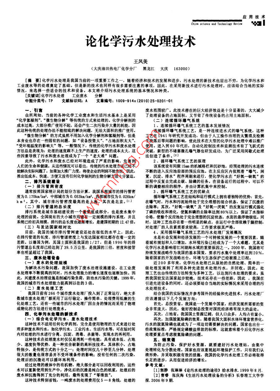 應(yīng)用技術(shù)China science and Technology Review論化學(xué)污水處理技術(shù)王鳳美(大慶油田熱電廠化學(xué)分廠黑龍江大慶163000分化學(xué)污水處理是我國當前的一項重要工作之一,隨著經(jīng)濟和技術(shù)的發(fā)展和進步,污水處理的新技術(shù)也層出不窮,為化學(xué)污水和理奠定了基礎(chǔ)。但是新的技術(shù)也同樣有很多需要注意的事項,因此,在采用新技術(shù)進行污水處理時,應(yīng)該結(jié)合當?shù)氐膶嶋H些適合的技術(shù)和設(shè)備。本文將介紹污水處理系統(tǒng)的基本情況和種類學(xué)污水處理工業(yè)廢水分解TP文獻標識碼:A文章編號;1009-914x(2010)25-0201-01一、引言廢水范圍較廣。此技術(shù)潛在的巨大經(jīng)濟效益是十分顯著的,大大減少眾所周知,當前的各種化學(xué)工業(yè)廢水和生活污水基本上是采用了處理設(shè)備的占地面積,又節(jié)省了傳統(tǒng)設(shè)備的占用土地面積“化學(xué)絮凝劑”、“微生物分解”等傳統(tǒng)的方式來處理的?;瘜W(xué)分解劑的(二)連續(xù)循環(huán)曝氣系統(tǒng)成本過高,大部分推廣使用不起,還會產(chǎn)生二次污染并大量的耗能,因1、連續(xù)循環(huán)曝氣系統(tǒng)工藝的基本發(fā)展情況此這種傳統(tǒng)的處理辦法不能徹底的解決問題,無法大面積的推廣使用連續(xù)循環(huán)曝氣系統(tǒng)工藝,是一種連續(xù)進水式的曝氣系統(tǒng),這種“微生物分解”的方式雖然不用加入化學(xué)分解劑和絮凝劑等,但是工藝在1941年研究開發(fā)成功,但由于人工操作治理的太繁瑣及檢測本身業(yè)也存在一些固有的問題,如“設(shè)備投資大”、“占地面積太大手段落后等問題的影響,使此技術(shù)在大型的化學(xué)污水處理中難以推廣受環(huán)境溫度的影響大”等,一般情況下,傳統(tǒng)的化學(xué)污水和廢水處理使用。進入到60年代后,自動化控制技術(shù)和監(jiān)測技術(shù)有了飛躍式的方法總是表現(xiàn)為:處理的速度跟不上生產(chǎn)的速度,處理的成本太大,這突破,新型的不堵塞微孔曝氣器也研發(fā)成功,為廣泛采用間歌式處理法創(chuàng)造了條件,2此外,化學(xué)污水和廢水已經(jīng)對環(huán)境造成了嚴重的影響,危害到2、循環(huán)曝氣系統(tǒng)工藝的原理人們的生命和健康。從這些情況可以看出,傳統(tǒng)的污水處理方法已經(jīng)不該系統(tǒng)設(shè)有間隙15m的機械格欄預(yù)處理的污水連續(xù)能解決實際問題了,如果加大推廣力度,將使企業(yè)的利潤不能負擔,因此,不斷的進入反應(yīng)池前部的預(yù)反應(yīng)池推出低成本、快速、方便又沒有任何化學(xué)制劑的生物分解方法十分緊迫。置、沉淀、排水”程序周期來進行在依照著“曝氣、閑好氧一缺氧”的二、排污系統(tǒng)設(shè)過程中反復(fù)去完成去碳、除磷的任務(wù)。在設(shè)備運行的過程中,可以不)排污管網(wǎng)密度斷的調(diào)整相應(yīng)的程序,并由計算機集中來控制通常按照國家統(tǒng)計局的劃分方法計算,我國東部城市的排污管密3、循環(huán)曝氣系統(tǒng)工藝的優(yōu)缺點度為0.170km/km2,中部城市為0.053km/km2,西部城市僅為0.026km/循環(huán)曝氣系統(tǒng)工藝在結(jié)構(gòu)和運行模式上擁有著獨特的優(yōu)勢:首先,km2。其中,城市排污管密度最高的是上海,其次是北京。【1在曝氣時,污水和污泥始終處于完全理想的混合狀態(tài),保證了沉渣的(二)排污管道的總長度去除率:其次,“好氧一缺氧”及“好氧一厭氧”的反復(fù)運行模式強化排污系統(tǒng)是城市基礎(chǔ)建設(shè)的一個重要組成部分,也是廢水集中了磷的吸收和消化,使氮和磷的去除率達到80%以上,保證了水指標處理的前提。全國現(xiàn)有的大小城市均建有一定規(guī)模的排污系統(tǒng),并且合格,使整個反應(yīng)池處于完全理想的沉淀狀態(tài),水面的懸浮物極低,同系統(tǒng)已經(jīng)初具規(guī)模。排污的總長度也逐漸增長,是建國初期的1247倍。時,這種工藝也存在著一些明顯的缺點,在運行中全部依賴于腦控制(三)與發(fā)達國家相對比對處理廠的人員素質(zhì)要求較高,工作要求極其嚴格目前,我國的城市排污管網(wǎng)建設(shè)還處在很低的水平上,因4、采用循環(huán)曝氣系統(tǒng)工藝的污水處理廠發(fā)展概況在排污管道的長度、排污管道密度上與發(fā)達國家相比都存在著一定的水是社會發(fā)展和經(jīng)濟發(fā)展的一個可持續(xù)發(fā)展的一個重要因素,隨差距。以德國為例,其國土面積是我國的1/27,但是1996年的排著城市規(guī)劃和人口增加,水環(huán)境污染已經(jīng)成為了一個大難題,尤其是污管道總長度卻已經(jīng)達到了39.5萬公里,是我國的三倍,密度和接管化學(xué)污水是影響著江河湖海水域的重要原因之一。2000年,我國將可率也明顯超過了我國持續(xù)發(fā)展戰(zhàn)略作為我國的基本國策,要求污水集中處理率達到20%三、康水處理設(shè)備隨著國家的開發(fā)戰(zhàn)略出臺,環(huán)境與生態(tài)保護已經(jīng)被提上日程。(一)廢水的處理規(guī)模近200多年來,化學(xué)污水處理已從原始的自然處理、簡單的一為解決水污染問題,我國加快了廢水治理設(shè)施建設(shè),在工業(yè)廢級處理發(fā)展到了利用各種先進技術(shù)處理污水,并回收。因此,處水處理率不斷提高的同時,污水處