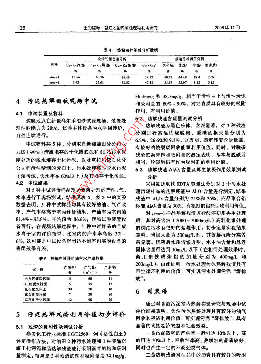 24第19卷第6期石油規(guī)劃設(shè)計2008年11月王萬?!ざ判l(wèi)東何銀花劉穎劉鵬中國石油集團(tuán)安全環(huán)保技術(shù)研究院王萬福等.含油污泥熱解處理與利用研究.石油規(guī)劃設(shè)計,2008,19(6):24~27摘要污泥處理是油田污水處理系統(tǒng)不可缺少的重要工藝環(huán)節(jié)。分析了溶劑萃取、熱化學(xué)洗油、熱解等6種污泥資源化技術(shù)的利用程度、二次污染物和適用范圍及特點,指出熱解處理是值得推廣的技術(shù)。通過含油污泥熱解處理室內(nèi)實驗,測定了回收油氣組成、熱解殘渣含碳量和ALO3含量;對熱解殘渣瀝青的吸附性能和再生處理的絮凝性能進(jìn)行了測試分析;開展了水平回轉(zhuǎn)爐用于含油污泥熱解處理的現(xiàn)場中試評價。結(jié)聚表明,含油污泥熱解處理具有較好的油氣回收和殘渣再生利用價值關(guān)鍵詞固體廢物含油污泥資源化熱解油氣回收率廢渣再生利用零排放油田污水處理的實質(zhì)就是將污水中的油和懸浮收油氣、燃燒利用熱值、用于油田開發(fā)調(diào)剖等方法。固體粒子分離出來,分離出來的濃縮體則形成污泥。6種主要含油污泥資源化處理技術(shù)方法的對比分析污水處理實際上就是一個不斷產(chǎn)生、不斷分離和不結(jié)果,見表1。斷處理污泥的過程,污泥的處理是油田污水處理系對比分析結(jié)果表明,溶劑萃取與熱化學(xué)洗油存統(tǒng)不可缺少的重要工藝環(huán)節(jié)。隨著國家環(huán)保法規(guī)標(biāo)在大量的二次污染物,不能實現(xiàn)含油污泥最終處理,準(zhǔn)的提高及環(huán)保執(zhí)法力度的不斷加大,含油污泥的其應(yīng)用將受到限制;焦化處理與作油田調(diào)剖劑工藝污染控制與資源化利用,已成為石油行業(yè)的重大課題。成熟,無二次污染物,可實現(xiàn)含油污泥完全最終處隨著天然資源的短缺和固體廢物排量的激增,理,但應(yīng)用有限;焚燒利用熱值與熱解處理需要二許多國家把固體廢物作為“資源”積極開展綜合利次處理的污染物少,基本可實現(xiàn)完全最終處理,適用口。由于油田煉化集輸處理過程產(chǎn)生的罐底泥、宜規(guī)模處理,具有研究與推廣應(yīng)用價值。其中,熱浮渣、廢白土和落地原油等含油污泥的石油類物質(zhì)解較焚燒有較好的直接經(jīng)濟(jì)效益,將具有更好的市含量高(千重油含量一般在10%以上,多數(shù)可達(dá)場優(yōu)勢。20%~30%),同時還含有較多的金屬與黏土無機(jī)礦物,因此具有非常重要的油氣回收和金屬礦物質(zhì)再2含油污泥熱解處理與利用評價研生利用價值,污泥資源化利用將是其今后最終處置究進(jìn)長的根本方式(含油污泥資源化處理方瀆為加強(qiáng)油田含油污泥的治理,于2003年中國石油勘探與生產(chǎn)分公司立項開展了“含油污泥處理工國內(nèi)外含油污泥資源化處理研究采用了多種技藝技術(shù)”研究。近年來,項目組通過調(diào)研比選和實術(shù)方法,如熱化學(xué)洗油、溶劑萃取回收油、熱解回驗研究,提出了脫水污泥“熱解回收油氣一殘渣利奉王萬福,男,1966年生,高級工程師。1991年畢業(yè)于西南石油大學(xué)應(yīng)用化學(xué)專業(yè),現(xiàn)任中國石油集團(tuán)安全環(huán)保技術(shù)研究院環(huán)保技術(shù)研究所副所長一直從事油田及煉化污水污泥處理技術(shù)方法、工藝與配套設(shè)備的研究開發(fā)和推廣應(yīng)用工作。通信地址:北京市海淀區(qū)志新西路8號,10008第19卷第6期石油規(guī)劃設(shè)計表16種含油污泥資源化處理技術(shù)方法的對比分析處理方法資源化二次污染物設(shè)施行直接適用范圍與特點處理程度工藝投資經(jīng)濟(jì)效益溶劑萃取回收油較徹底剩余污泥量大較復(fù)雜不夠成熟較高般適宜深度回收油熱化學(xué)洗油回收油不徹底剩余污水污泥量大簡單成熟較低較好適宜簡單回收油焦化處理全部處理較復(fù)雜成熟較低較好適宜最終處理但用量有限作油田調(diào)剖劑全部處理簡單成熟較低費(fèi)用投人適宜最終處理但用量有限焚燒利用熱值有機(jī)物全部處灰渣煙氣少較復(fù)雜較成熟較高費(fèi)用投入適宜最終處理污泥含水要低理回收熱能熱解處理有機(jī)物全部處灰渣少,且可再生利用較復(fù)雜不夠成熟較高較好適宜最終處理脫水泥餅即可理回收油氣用”的資源化處理技術(shù)新思路,并利用“水平回轉(zhuǎn)驗數(shù)據(jù)表明,3種樣品均具有較好油氣產(chǎn)收率,其熱解爐”設(shè)備進(jìn)行了回收輕烴和不凝氣的現(xiàn)場中試中w-1的產(chǎn)油率高達(dá)34.2%,熱解回收油的價值評價。突出;在熱解過程中,樣品除本身含水外,也產(chǎn)生目前,為有利于熱解技術(shù)的深入研究、樣品的一定的合成水;殘渣基本達(dá)到不含油。室內(nèi)評價,以及為工業(yè)化應(yīng)用裝置和工程設(shè)計提供32餾分組成分析全面可靠的設(shè)計參數(shù),項目組研究建立了含油污泥3.21熱解氣組成分析熱解室內(nèi)評價的技術(shù)體系。編制形成了《含油污泥2種油田污水處理污泥熱解氣的組成分析數(shù)據(jù)熱解室內(nèi)評價實驗操作手冊》,其涉及實驗物料物性見表3。分析結(jié)果表明,樣品來源不同,其組成有分析評價、實驗物料熱解產(chǎn)物(油、氣、水和殘渣)較大差異。其中ytws-1的C1~C烴類組分高達(dá)90%,產(chǎn)生量評價、熱解油組成