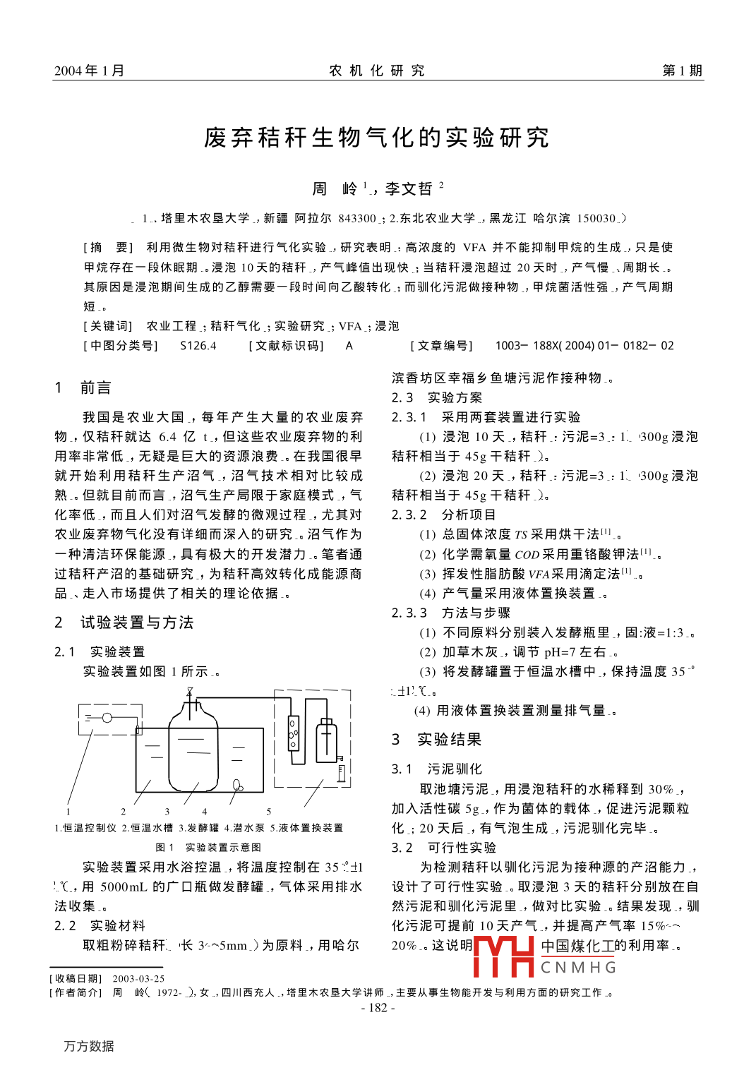 2004年1月農(nóng)機化研究第1期廢棄秸稈生物氣化的實驗研究周嶺1,李文哲21.塔里木農(nóng)墾大學(xué),新疆阿拉爾843300;2東北農(nóng)業(yè)大學(xué),黑龍江哈爾濱150030.)[摘要]利用微生物對秸稈進行氣化實驗,研究表明:高濃度的ⅤFA并不能抑制甲烷的生成,只是使甲烷存在一段休眠期浸泡10天的秸稈,產(chǎn)氣峰值岀現(xiàn)快;當(dāng)秸稈浸泡超過20天時,產(chǎn)氣慢、周期長其原因是浸泡期間生成的乙醇需要一段時間向乙酸轉(zhuǎn)化;而馴化污泥做接種物_,甲烷菌活性強,產(chǎn)氣周期短[關(guān)鍵詞]農(nóng)業(yè)工程;秸稈氣化;實驗研究;VFA;浸泡[中圖分類號]S126.4[文獻標(biāo)識碼]A[文章編號]1003-188X(2004)01-0182-02濱香坊區(qū)幸福鄉(xiāng)魚塘污泥作接種物1前言2.3實驗方案我國是農(nóng)業(yè)大國,每年產(chǎn)生大量的農(nóng)業(yè)廢棄2.3.1采用兩套裝置進行實驗物,僅秸稈就達6.4億t,但這些農(nóng)業(yè)廢棄物的利(1)浸泡10天,秸稈:污泥=3.:1、300g浸泡用率非常低,無疑是巨大的資源浪費。在我國很早秸稈相當(dāng)于45g千秸稈2。就開始利用秸稈生產(chǎn)沼氣,沼氣技術(shù)相對比較成(2)浸泡20天,秸稈污泥=3:1、300g浸泡熟-。但就目前而言,沼氣生產(chǎn)局限于家庭模式,氣秸稈相當(dāng)于45g干秸稈化率低,而且人們對沼氣發(fā)酵的微觀過程,尤其對2.3.2分析項目農(nóng)業(yè)廢棄物氣化沒有詳細(xì)而深入的研究。沼氣作為(1)總固體濃度T采用烘干法1。種清潔環(huán)保能源,具有極大的開發(fā)潛力。筆者通(2)化學(xué)需氧量COD采用重鉻酸鉀法過秸稈產(chǎn)沼的基礎(chǔ)研究,為秸稈高效轉(zhuǎn)化成能源商(3)揮發(fā)性脂肪酸VFA采用滴定法11。品、走入市場提供了相關(guān)的理論依據(jù)(4)產(chǎn)氣量采用液體置換裝置2試驗裝置與方法2.3.3方法與步驟(1)不同原料分別裝入發(fā)酵瓶里,固:液=1:3。2.1實驗裝置(2)加草木灰,調(diào)節(jié)pH=7左右實驗裝置如圖1所示。(3)將發(fā)酵罐置于恒溫水槽中,保持溫度35±1!℃(4)用液體置換裝置測量排氣量3實驗結(jié)果3.1污泥馴化取池塘污泥,用浸泡秸稈的水稀釋到30%,加入活性碳5g作為菌體的載體,促進污泥顆粒1.恒溫控制儀2.恒溫水槽3.發(fā)酵罐4.澘水泵5.液體置換裝置化;20天后,有氣泡生成,污泥馴化完畢圖1實驗裝置示意圖3.2可行性實驗實驗裝置采用水浴控溫,將溫度控制在35士為檢測秸稈以馴化污泥為接種源的產(chǎn)沼能力,℃,用5000mL的廣口瓶做發(fā)酵罐,氣體采用排水設(shè)計了可行性實驗。取漫泡3天的秸稈分別放在自法收集。然污泥和馴化污泥里,做對比實驗。結(jié)果發(fā)現(xiàn),馴2.2實驗材料化污泥可提前10天產(chǎn)氣,并提高產(chǎn)氣率15%取粗粉碎秸稈長3~5mm)為原料,用哈爾20%,這說明凵中國煤化工的利用率CNMHG[收稿日期]2003-03-25[作者簡介]周嶺(1972-),女,四川西充人,塔里木農(nóng)墾大學(xué)講師,主要從事生物能開發(fā)與利用方面的研究工作2004年1月農(nóng)機化研究第1期3.3秸稈浸泡時間的實驗味,說明有乙醇生成。從圖3可看出:當(dāng)原料進入本實驗到目前進行了40天,試驗結(jié)果如圖2、反應(yīng)罐30天左右,VFA才達到峰值,而在標(biāo)準(zhǔn)條圖3和表1所示。件下,乙醇不會被降解。這說明反應(yīng)器內(nèi)氫濃度的從圖2可看出:浸泡10天的秸稈進罐后7天降低有利于乙醇向乙酸轉(zhuǎn)化。也就是說_,產(chǎn)氣周期開始產(chǎn)氣,14天后達到峰值1375mL,產(chǎn)氣穩(wěn)定,被延長了持續(xù)14天后逐漸降低;浸泡20天的秸稈進罐只有表1試驗結(jié)果微弱的產(chǎn)氣現(xiàn)象。COD進COD出COD去除6193.183856.3237.70%402,293516,83浸泡10天從表1可看出,浸泡10天的秸稈的COD去除500浸泡20天率達37.7%,而浸泡20天的秸稈COD去除率達3490%。這說明兩個反應(yīng)罐的有機負(fù)荷不一樣,510152025303540前者較后者高。因此,前者產(chǎn)氣情況較好時間/天4實驗結(jié)果分析圖2浸泡實驗結(jié)果(1)用馴化后的污泥作接種物,甲烷菌活性強,產(chǎn)氣快一浸泡10天(2)浸泡10天的秸稈產(chǎn)氣快,表明酸化率與一浸泡20天產(chǎn)氣率成正比。(3)浸泡20天的秸稈產(chǎn)酸期緩慢,主要是因為有一段乙醇向酸轉(zhuǎn)化的時期時間/天[參考文獻]圖3揮發(fā)性脂肪酸的變化情況圖3表示了揮發(fā)性脂肪酸的變化情況。浸泡101]賀延嶺,廢水厭氧生物處理[M].北京:中國輕工業(yè)出天的實驗表明:VFA7天后達到峰值15.76 mMol/L版社,1999之后產(chǎn)酸逐漸降低,28天后達到最低值2張光明城市生活垃圾厭氧消化產(chǎn)酸階段研究[重慶20mmol幾L但從實驗看,甲烷仍在繼續(xù)產(chǎn)生。這環(huán)境科學(xué),1998,20(1):35-36說明在產(chǎn)酸期間,有甲烷生成,酸化率與甲烷量成正比。浸泡20天的秸稈,進料時有輕微的酒精a Study on Refused Straw Pole gasified by microbeZHOU Ling, LI Wen-zhe(ITarim Agriculture University, Alar 843300, China; 2. North-East Agriculture University, Harbin 150030,China)[Abstract Utilizing microorganism carrying on straw pole indicate that VFA is too dense to suppress theformulation of CHa but just one rest period, straw pole of soaking 10 days produces peak value fast. Straw poof soaking 30 days reach peak value slowly, due to produce too much ethanol and need some time to transformacetic acid, Tame mud being fungus source, methane activation is better so as to produce cycle fast[Key words] agricultural engineering; straw pole; experimental research; gasification; VFA;