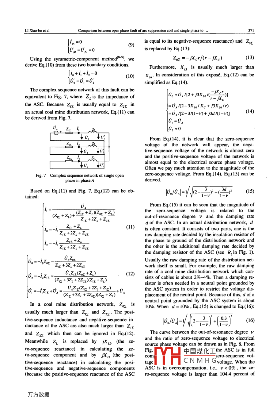 Availableonlineatwww.sciencedirect.comJOURNAL OF CHINA UNIVERSITY OFDirectMININGTECHNOLOGYELSEVIERJ China Univ Mining Technol 18(2008)0368-0372www.elsevier.corm/locate/jcumtComparison between open phase fault of arc suppressioncoil and single phase to earth fault in coalmine distribution networkLI Xiao-bo, WANG Chong-linSchool of Information Electrical Engineering, China University of Mining& Technology, Xuzhou, Jiangsu 221008, ChinaAbstract: When, in a coal mine distribution network whose neutral point is grounded by an arc suppression coil (ASC), a faultoccurs in the ASC, compensation cannot be properly realized. Furthermore, it can damage the safe and reliable run of the network.We first introduce a three-phase five-column are suppression coil (TPFCASC)and discuss its autotracking compensation theoryThen we compare the single phase to ground fault of the coal mine distribution network with an open phase fault at the TPFCAScusing the Thevenin theory, the symmetrical-component method and the complex sequence network respectively. The results showthat, in both types of faults, zero-sequence voltage of the network will appear and the maximum magnitude of this zero-sequencevoltage is different in both faults. Based on this situation, a protection for the open phase fault at the TPFCASC should be estab-lishedKey words: open phase; protection; single phase to ground fault; three-phase five-column arc suppression coil (TPFCASC)1 Introductionand reliable operation. However, when a fault occursin the ASC itself, compensation cannot be realizedIn coal mines, the safety of production is to some properly. It can actually damage the safe and reliableextent determined by the reliability of power supply run of the distribution network. One problem is theand the electrical equipment. A considerable amount overvoltage in the distribution network, another is theexperts-3. A main branch of this field is the problem lected and it is quite necessary to do some researchof research has been carried out on this issue by some false ground fault. These problems are usuallyof the neutral point of the distribution networkthemWith the development of a distribution network incoal mines, much attention has been paid to the issue 2 Basic structure of TPFCASC and itsof the neural point. One problem is its increasinglyautomatic compensation theorylarger capacitive current. Such a large capacitive current can do considerable harm to the network and2.1 Basic structure and operation principle ofresult in accidents such as gas outbursts, coal dustexplosions and cable bursts, etc, when a single phaseFig. I shows the principle of TPFCASC applied toto earth fault occurs. The best method to reduce thetypical coal mine distribution network and Fig. 2capacitive current is to use an arc suppression coils Its structure(ASC) 46In this new asc which is also a transformer, threeThe newest ASC can now autotrack the variation middle cores are surrounded by three primary windin capacitive current of the coal mine distribution ings A, B and C which are connected to the distribu-network and realize full compensation", which tion network and the earth respectively. The threemeans that the ASC can provide an inductive current secondary windings are open-delta connections. Thewhose phase is contrary to that of the capacitive cur- two auxiliary cores, located at both sides, are used asrent when a single phase to ground fault occurs, the zero-sequence magnetic path. The four air gaps,making the entire phase to ground current of the coal betyYH中國煤化工d the three middlemine distribution network small and ensuring its safe coresalize the rough ad-CNMHGReceived 10 October 2007: accepted 14 April 2008CorrespondingauthorTel+86-516-83885605;e-Mailaddressxbli_cumt@126.comLI Xiao-bo et alComparison betweease fault ofjustment in inductance of the ASc4-sI. The magnetic distribution network to ground, I. is the resistiveresistance of the three middle limbs is very low, i.e.current of the entire distribution network to groundthe positive-sequence impedance of the TPFCASC is (In a neutral point to ground via ASC system, it alsovery high and implies that its positive-sequence curincludes the current of the damping resistor. For exrent is very small. It approximately equals the no-load ample it includes the current of R, in Fig. 1),I, is theurrent of the transformer. In contrast. the ze-ro-sequence magnetic resistance is very large because inductive current provided by the TPFCASC, Xc isof the presence of airspaces in the zero-sequence the capacity reactance of phase to ground of the dis-magnetic path. That means the zero-sequence current, tribution network and Xwhich has the same phase and magnitude in the three ductive reactance of phase to ground of thewindings, is very high. The secondary windings, fit-ted with the thyristors and reactors L2 and L,,areTPFCASC. When Ice >I,, it is referred to as unopen-delta connections. When the conduction angles decompensation, when Ics=l, as full compensaof the thyristors are changed, the inductive current of tion and whenCe 0%, the zero-sequence voltage is 5 Conclusionsless than 104. 4 per cent of the phase voltage. WhenV=-50%, the zero-sequence voltage is 500 percent An ASC is beneficial to the coal mine distributionof the phase voltage and when v=50%, the network when it is sound. However, when a fault oc-zero-sequence voltage is 24.7 percent. Fig 9 is the curs itself, it will damage the network. We havesimulated result of the secondary zero-sequence compared, in detail, the single open phase fault at thevoltage at a single openault by the TPFCASC with the single phase to ground fault in aPSCAD/EMTDC. The simulation conditions are distribution network. The following conclusions canV=0%, d=10% and the capacity current is 50 A. be drawn: in both types of faults a zero-sequenceIt is almost similar to the result of Fig. 8.voltage of the network will appear. In a single phaseto ground fault, the maximum magnitude 
