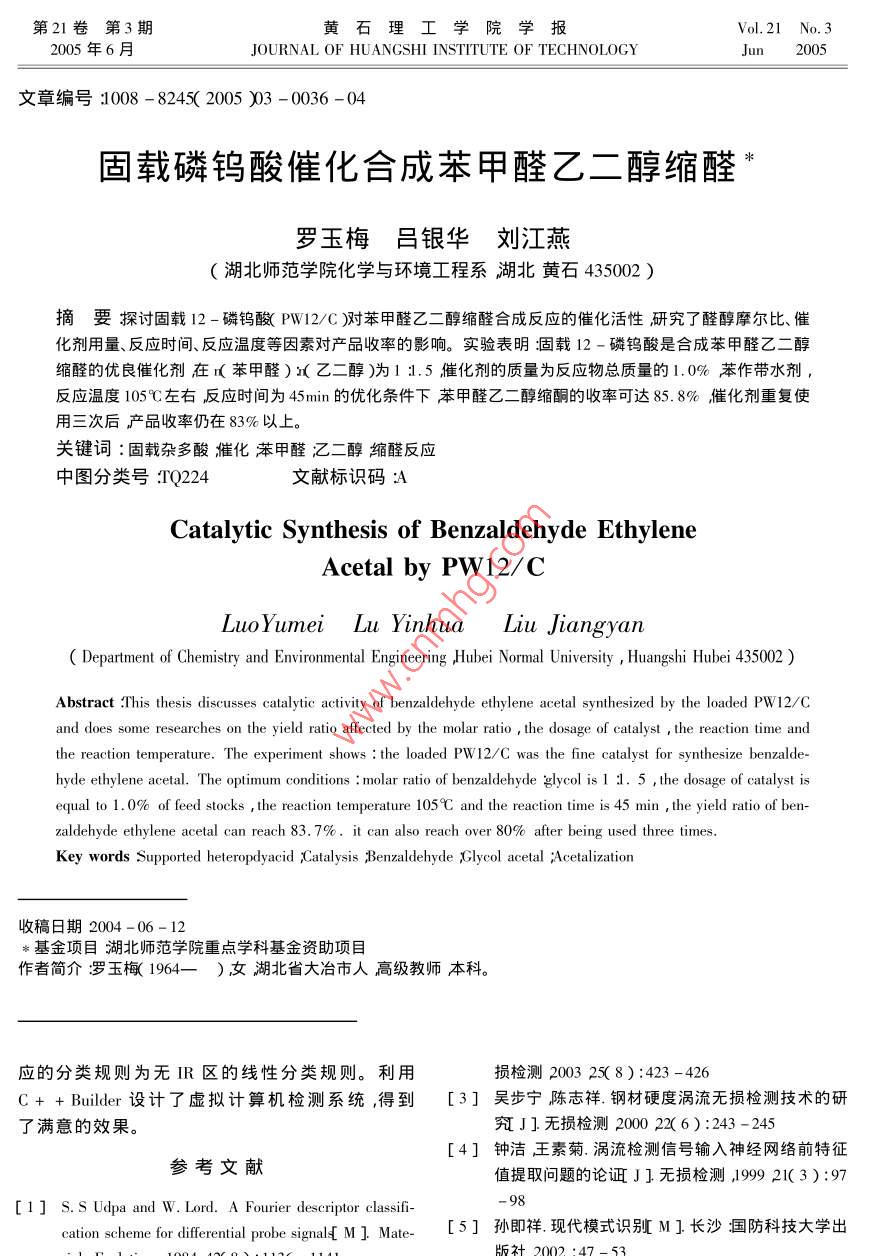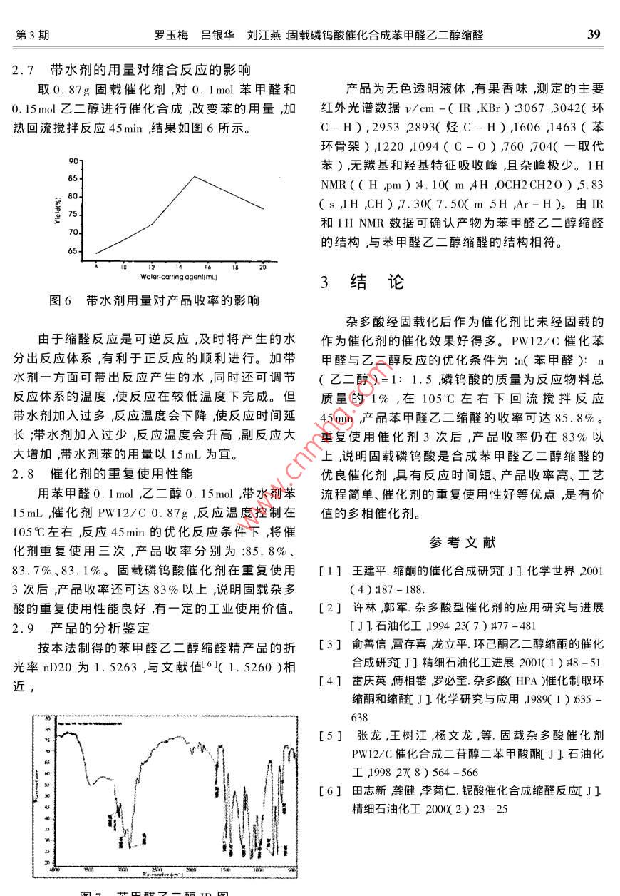 第21卷第3期黃石理工學(xué)院學(xué)報(bào)Vol 21 No. 32005年6月JOURNAL OF HUANGSHI INSTITUTE OF TECHNOLOGYJun 2005文章編號(hào)】008-8245(2005)3-0036-04固載磷鎢酸催化合成苯甲醛乙二醇縮醛羅玉梅呂銀華劉江燕〔湖北師范學(xué)院化學(xué)與環(huán)境工程系湖北黃石435002)摘要探討固載12-磷鎢酸Pw12C)對(duì)苯甲醛乙二醇縮醛合成反應(yīng)的催化活性研究了醛醇摩爾比、催化劑用量、反應(yīng)時(shí)間、反應(yīng)溫度等因素對(duì)產(chǎn)品收率的影響。實(shí)驗(yàn)表明固載12-磷鎢酸是合成苯甲醛乙二醇縮醛的優(yōu)良催化劑在κ苯甲醛)乙二醇)為1:1.5催化劑的質(zhì)量為反應(yīng)物總質(zhì)量的1.0%苯作帶水劑反應(yīng)溫度105℃左右反應(yīng)時(shí)間為45min的優(yōu)化條件下苯甲醛乙二醇縮酮的收率可達(dá)85.8%催化劑重復(fù)使用三次后產(chǎn)品收率仍在83%以上。關(guān)鍵詞:固載雜多酸催化苯甲醛乙二醇縮醛反應(yīng)中圖分類(lèi)號(hào)Q224文獻(xiàn)標(biāo)識(shí)碼:ACatalytic Synthesis of benzaldehyde ethyleneAcetal by Pw12/cLuo Yumei Lu yinhua Liu JiangyanDepartment of Chemistry and Environmental Engineering Hubei Normal University, Huangshi Hubei 435002)Abstract This thesis discusses catalytic activity of benzaldehyde ethylene acetal synthesized by the loaded PW12/Cand does some researches on the yield ratio affected by the molar ratio, the dosage of catalyst, the reaction time arthe reaction temperature. The experiment shows the loaded PW12/C was the fine catalyst for synthesize benzalhyde ethylene acetal. The optimum conditions molar ratio of benzaldehyde glycol is 1 :1. 5, the dosage of catalystequal to 1. 0% of feed stocks the reaction temperature 105C and the reaction time is 45 min, the yield ratio of ben-acetal can reach 83. 7%. it can also reach over 80% after being used three timeKey words Supported heteropdyacid atalysis Benzaldehyde Glycol acetal Acetalization收稿日期2004-06-12*基金項(xiàng)目湖北師范學(xué)院重點(diǎn)學(xué)科基金資助項(xiàng)目作者簡(jiǎn)介羅玉梅(1964—)女湖北省大冶市人高級(jí)教師本科。應(yīng)的分類(lèi)規(guī)則為無(wú)IR區(qū)的線性分類(lèi)規(guī)則。利用損檢測(cè)200325(8):423-426C++ Builder設(shè)計(jì)了虛擬計(jì)箅機(jī)檢測(cè)系統(tǒng),得到[3]吳步寧陳志祥.鋼材硬度渦流無(wú)損檢測(cè)技術(shù)的研了滿意的效果。究J]無(wú)損檢測(cè)20002(6):243[4]鐘潔王素菊.渦流檢測(cè)信號(hào)輸入神經(jīng)網(wǎng)絡(luò)前特征參考文獻(xiàn)值提取問(wèn)題的論證J]無(wú)損檢測(cè)199921(3):97[1] S S Udpa and w. Lord. A Fourier descriptor classifi-cation scheme for differential probe signal![ M1Mae.[5]孫即祥現(xiàn)代模式識(shí)別M1長(zhǎng)沙圍防科技大學(xué)出第3期羅玉梅呂銀華劉江燕固載磷鎢酸催化合成苯甲醛乙二醇縮醛37進(jìn)入二十一世紀(jì)的今天,大多數(shù)人的生活水冷合并有機(jī)物,將混合物加入分液漏斗中先用平在提高,人們不僅對(duì)食品要求可口,而且要求飽和食鹽水洗滌二次再用蒸餾水洗滌至中性,用色、味、香具全。而縮醛(酮)具有優(yōu)于母體醛無(wú)水氯化鈣干燥后常壓蒸餾,先收集前餾分,再收酮)的特殊香味具有香氣透發(fā)、留香持久、原料集沸程(226-230)℃的餾分,測(cè)其折光率稱量來(lái)源豐富、生產(chǎn)工藝簡(jiǎn)單、化學(xué)性質(zhì)穩(wěn)定等優(yōu)計(jì)算收率點(diǎn)1,是日用香精和食品香精的優(yōu)良添加劑傳統(tǒng)制備縮醛(酮)一般使用質(zhì)子酸,其優(yōu)點(diǎn)2結(jié)果與討論是催化劑價(jià)廉易得、產(chǎn)品收率高,但產(chǎn)生三廢污染,設(shè)備腐蝕嚴(yán)重,后處理麻煩。近幾年來(lái),人們2.1催化劑是否固載化對(duì)產(chǎn)品收率的影響利用雜多酸作為催化劑,在酯化反應(yīng)2、醚化反分別取含純雜多酸0.1g未經(jīng)固載的和經(jīng)過(guò)應(yīng)、烷基化反應(yīng)、縮合反應(yīng)34中均取得了較好的固載的HPA催化劑固載量為30%)用15ml苯結(jié)果特別是將雜多酸固載后,其催化性能更為優(yōu)作帶水劑結(jié)果如表1所示。異5]。筆者以活性炭固載12-磷鎢酸催化合成表1催化劑是否固載化對(duì)產(chǎn)品收率的影響苯甲醛乙二醇縮醛結(jié)果較為理想。催化醛醇比反應(yīng)反應(yīng)收率劑用mol時(shí)間溫度實(shí)驗(yàn)部分/℃/%未固載0.111.541.1實(shí)驗(yàn)儀器及藥品固載0.111.54010072.0儀器:標(biāo)準(zhǔn)磨口(中量)有機(jī)制備儀器、D402F型電動(dòng)攪拌機(jī)、KDM型連續(xù)可調(diào)控溫電熱可見(jiàn),HPA經(jīng)固載后催化效果比未經(jīng)固載的套 nicolet5DX型傳立葉變換紅外光譜儀(KBr液好得多,原因是磷鎢酸經(jīng)固載化后,催化劑的比表膜法)。面積増大催化劑表面活性位增多,使催化性能增藥品:甲醛、乙二醇、苯均為分析純,活性炭強(qiáng),〔市售),12-磷鎢酸(自制),一次蒸餾水。2.2催化劑固載量對(duì)產(chǎn)品收率的影響1.2催化劑的制備取5份固載量不同的PW12/C催化劑,調(diào)整1.2.112-磷鎢酸的制備催化劑總用量,使每份含純雜多酸的量均為0.1將10g鎢酸鈉和1.6g磷酸氫二鈉溶于15m苯甲醛0.lmol,n(苯甲醛)n(乙二醇)1:1.5沸騰的蒸餾水中,邊攪拌邊滴加濃鹽酸至溶液成15mL苯在100℃下回流攪拌40min結(jié)果如圖1懸濁狀冷卻轉(zhuǎn)移至分液漏斗中用20ml乙醚分所示。多次萃取。取出下層的油狀混合物,用少量的水洗滌。將油狀物置于抽風(fēng)櫥中鳳風(fēng)