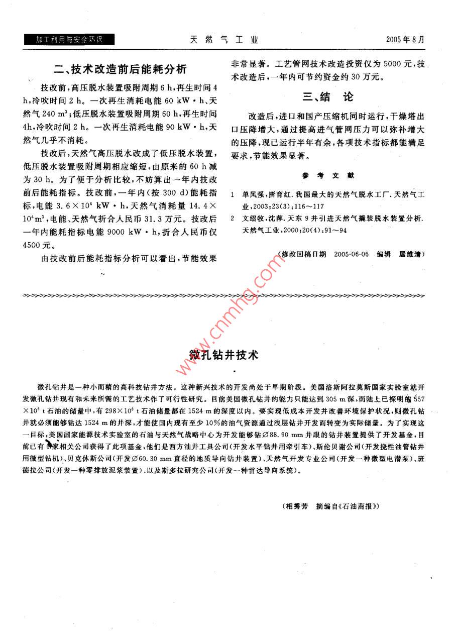 第25卷第8期天然氣工業(yè)加工劉用與安全環(huán)保天然氣脫水系統(tǒng)的技術(shù)改造王樂(lè)賈立民付孟貴宋海潮河南中原綠能高科有限責(zé)任公司)王樂(lè)等.天然氣脫水系統(tǒng)的技術(shù)改,天然氣工業(yè),2005;25(8):123~124摘要河南省開封市CNG一號(hào)加氣站中的高壓脫水裝置,存在著因壓縮機(jī)油污分子篩干燥劑,導(dǎo)致干燥劑使用周期短、更換困難、能耗大等渚多弊端,亟需改造。為此,將高壓脫水裝蠼改為低壓脫水裝置,延長(zhǎng)了吸附周期,減少了再生頻次,并大大降低了電能和天然氣消耗量,獲得年減少電、氣開支30萬(wàn)元的直接經(jīng)濟(jì)效益。主題詞天然氣脫水系統(tǒng)技術(shù)改邊節(jié)能效益目前,河南中原綠能高科有限責(zé)任公司開封1不難看出,有兩種技術(shù)改造方案可以實(shí)施。方案CNG一號(hào)加氣站已安裝了5臺(tái)天然氣壓縮機(jī),其中是將高壓脫水裝置更換為低壓脫水裝置,并配套相3臺(tái)為國(guó)產(chǎn)壓縮機(jī),2臺(tái)為進(jìn)口壓縮機(jī)。3臺(tái)國(guó)產(chǎn)壓應(yīng)天然氣進(jìn)出管網(wǎng)、配電、自動(dòng)控制系統(tǒng)等改造,此縮機(jī)天然氣脫水共用一套高壓脫水裝置,即天然氣方案投資達(dá)數(shù)十萬(wàn)元,且改造復(fù)雜,改造周期長(zhǎng),這先經(jīng)壓縮后再脫水;2臺(tái)進(jìn)口壓縮機(jī)分別采用一套低種方案實(shí)不可取。方案二是通過(guò)簡(jiǎn)單的進(jìn)氣管網(wǎng)改壓脫水裝置,即天然氣先脫水再壓縮。高壓脫水裝造,利用原有低壓脫水裝置,直接將高壓脫水改為低置是1999年建站投用的老式裝置,存在著裝置老壓脫水,投資僅需數(shù)千元,即目前業(yè)已投產(chǎn)的改造方化,干燥劑失效無(wú)法更換,吸附周期短,電能和天然案。也即利用原有4壓縮機(jī)低壓脫水裝置,將國(guó)產(chǎn)氣耗量大等諸多弊端。低壓脫水裝置是擴(kuò)建投用的壓縮機(jī)進(jìn)氣管網(wǎng)也改接在4“壓縮機(jī)脫水裝置上,原新型裝置,有吸附周期長(zhǎng)、電能耗量低、幾乎不消耗高壓脫水裝置被甩掉。這樣,4“壓縮機(jī)脫水裝置同天然氣及分子篩易于更換等諸多優(yōu)點(diǎn)。因此,對(duì)國(guó)時(shí)承擔(dān)4“壓縮機(jī)和國(guó)產(chǎn)壓縮機(jī)天然氣干燥吸附任產(chǎn)壓縮機(jī)天然氣脫水系統(tǒng)進(jìn)行技術(shù)改造勢(shì)在必行。務(wù)。該方案理論分析完全可行。高壓脫水裝置天然、技術(shù)改造方案氣處理能力640m3/h,低壓脫水裝置天然氣處理能力100m3/h,兩臺(tái)國(guó)產(chǎn)壓縮機(jī)實(shí)際排量和4*壓縮低壓脫水是天然氣在壓縮前,經(jīng)分子篩吸附脫機(jī)實(shí)際排量基本相當(dāng),均為500m3/h,顯然,該低壓水。分子篩再生過(guò)程為閉式循環(huán),幾乎不消耗天然脫水裝置從天然氣處理能力看,完全可以滿足一臺(tái)氣,循環(huán)路徑為:進(jìn)口壓縮機(jī)和兩臺(tái)國(guó)產(chǎn)壓縮機(jī)實(shí)際排量的要求。再再生氣體→循環(huán)風(fēng)機(jī)→電爐→干燥塔→換熱器→分離器者,國(guó)產(chǎn)壓縮機(jī)天然氣進(jìn)氣管網(wǎng)離該低壓脫水裝置號(hào)站在技術(shù)改造前的狀況如圖1所示。從圖很近,便于改造,詳見圖2。該方案投資僅數(shù)千元,且節(jié)能效果非常顯著,系最佳改造方案。宋站天然氣高壓脫水裝置F為產(chǎn)壓機(jī)來(lái)站天然氣5機(jī)1-3°為國(guó)產(chǎn)壓縮機(jī)4-5進(jìn)口產(chǎn)壓縮機(jī)低壓脫水裝置圖1改造前工藝流程示意圖圖2改造后工藝流程示意圖作者簡(jiǎn)介:王樂(lè),1965年生,工程師;1997年畢業(yè)于原石油大學(xué)(華東);現(xiàn)任河南中原綠能高科有限責(zé)任公司開封CNG號(hào)加氣站站長(zhǎng)。地址:(457001)河南中原綠能高科有限責(zé)任公司。電話:13592116401(開封),13030329652(濮陽(yáng))。Email: wangsuchen sohu com加工利用與安全玉供天然氣工業(yè)2005年8月二、技術(shù)改造前后能耗分析非常顯著。工藝管網(wǎng)技術(shù)改造投資僅為5000元,技術(shù)改造后,一年內(nèi)可節(jié)約資金約30萬(wàn)元技改前,高壓脫水裝置吸附周期6h,再生時(shí)間h,冷吹時(shí)間2h。一次再生消耗電能60kW·h、天三、結(jié)論然氣240m3;低壓脫水裝置吸附周期60h,再生時(shí)間改造后,進(jìn)口和國(guó)產(chǎn)壓縮機(jī)同時(shí)運(yùn)行,干燥塔出4h,冷吹時(shí)間2h。一次再生消耗電能90kW·b,天口壓降增大,通過(guò)提高進(jìn)氣管網(wǎng)壓力可以彌補(bǔ)增大然氣幾乎不消耗。的壓降,現(xiàn)已運(yùn)行半年有余,各項(xiàng)技術(shù)指標(biāo)都能滿足技改后,天然氣高壓脫水改成了低壓脫水裝置,要求,節(jié)能效果顯著。低壓脫水裝置吸附周期相應(yīng)縮短,由原來(lái)的60h減為30h。為了便于分析比較,不妨算出一年內(nèi)技改前后能耗指標(biāo)。技改前,一年內(nèi)(按300d)能耗指1單鳳強(qiáng),唐育紅我國(guó)最大的天然氣脫水工廠.天然氣工標(biāo),電能3.6×104kW·h,天然氣消耗量14.4X業(yè),2003;23(3):116~11710m3,電能、天然氣折合人民幣31.3萬(wàn)元。技改后2文紹牧,沈萍.天東9井引進(jìn)天然氣撬裝脫水裝置分析年內(nèi)能耗指標(biāo)電能9000kW·h,折合人民幣僅然氣工業(yè),200024:91~944500元。由技改前后能耗指標(biāo)分析可以看出,節(jié)能效果(修改回稿日期20050606編輯居維清微孔鉆井技