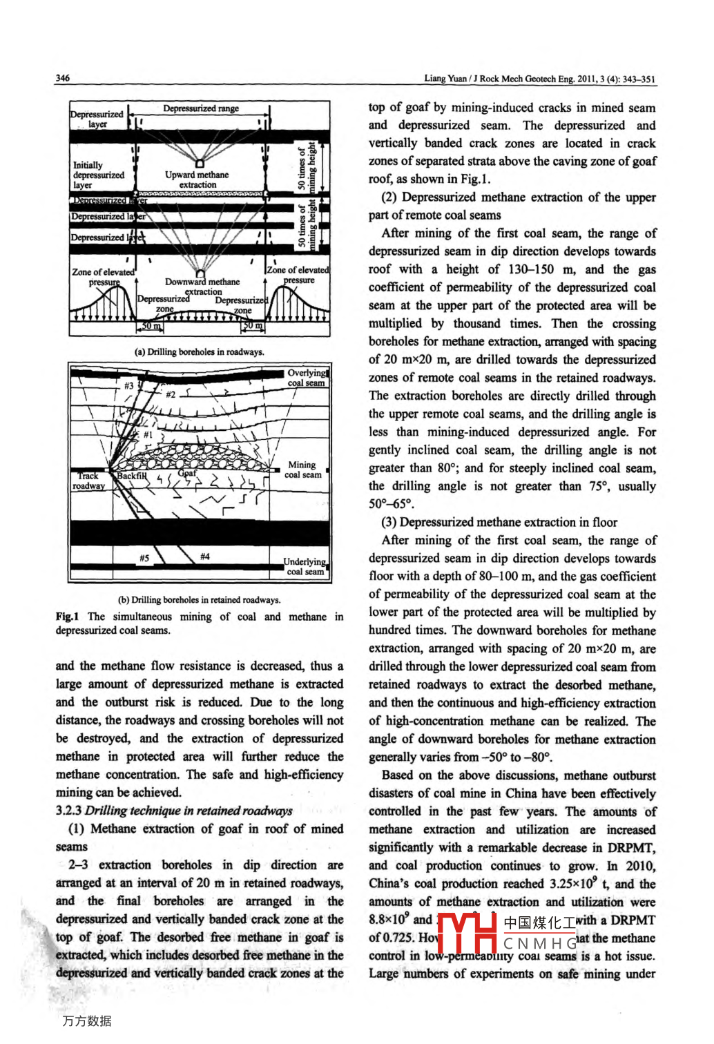 Jourmal of Rock Mechanics and Geotechnical Engineering. 2011, 3(4): 343-351Journal of Rock Mechanics and Geotechnical EngineeringJournalonlinewww.rockgeotech.orgCsRMETheories and techniques of coal bed methane control in ChinaLiang yuanNational Engineering and Research Center for Coal Gas Control, Huainan, 232001, ChinaReceived in 1 March 2011; received in revised form 13 July 2011; accepted 14 September 2011Abstract: Coal bed methane control with low permeability is a hot issue at present. The current status of coal bed methanecontrol in China is introduced. The govermment-support policies on coal bed methane control are presented. This paper proposethe theories of methane control in depressurized mining, including methane extraction in depressurized mining, simultaneousmining technique of coal and methane without coal pillar, and circular overlying zone for high-efficiency methane extraction incoal seams with low permeability. The techniques of methane control and related instruments and equipments in China areintroduced On this basis, the problems related to coal bed methane control are addressed and further studies are pointed out.Key words: coal bed methane control; depressurized mining; low permeability; coal seams; simultaneous mining technique ofcoal and methane without coal pillar; circular overlying zonecoal field investigations, the total reserve of coal1 Introductionresources in China is approximately 5.57x10t, inwhich the predicted reserve of coal resources at depthsof 0-600 m accounts for 26.8%, 600-1 000 m for 20%,China is one of the largest coal producers in the1000-1500mfor25.1%,and15002000mforworld,accounting for 37% of the global coal 28. 1%[3]. Meanwhile, the abundant coal bed methaneproduction. As the major energy in China, coalin China proves that geological reserve of coal bedaccounts for 76% and 69% of primary energymethane is approximately 1.023x10"m, recoverableproduction and consumption, respectively []. Thereserve is about 4.7x10 m. and the coal bed methaneState Energy Long-term Development Plan states that resources within the depth of 2 000 m is 3.68x109China will uphold the energy strategy that coal and ranking the third in the world [4]. In 2009, China'selectricity are used as the main resources; oil, gas and coal production reached 3.05x10%t, accounting fornew energy are developed in all-round way. Ine 45.6%of the global coal production. In 2010, China'sNational Energy Development Strategy 2030-2050 coal production reached 3. 25x10%t, accounting foissued by Chinese Academy of Engineering(CAE) 45% of the global coal production. The amount ofpoints out that the annual demands of coal will be up to methane extraction is 9.1x10%m. and the amount of3.8x10 t( ton), which still accounts for 50% of the methane utilization is 3.610%m, with a death rate perenergy-consuming structure in China. Therefore, the million tons(DRPMT)of 0.725[5, 6]. Most coalpresent status and prospect of energy development and mines in China are rich in methane and more thanthe coal resources sustainable supply dominate the 70% of state-owned major coal mines are methane-richimportant situation and prominent role of the coal or coal and methane outburst-prone mines.Theindustry in economic and social development in China permeability of most coal seams is relatively low,[2]. It is evident that the coal as one of the dominant which is basically less than 1 mD, averagingenergy resources in China cannot be replaced in a long 0.002-16.17 mD. The coal seams with the permeabilityof timeless than 0. 1 mn.for 350 1-1 mD for 37According to prediction results of the 2nd national larger than 1中國煤化工han10mDisscarce. EvenCNMHG PermeabilityDoi;10.3724SPJ235.2011.00343such as mines of Shuicheng, Fengcheng, HuogangCorresponding author. Tel: +86-554-7624616E-mail:xuejunhua2003@163.comKailuan and Liulin, permeability is only 1-18 mD,Liang Yuan/J Rock Mech Geotech Eng 2011, 3 (4): 343-351about two or three orders of magnitude lower than safe situation of coal mines in China is stillthose in the United States and Australia [7, 8]. Coal discouragingBed Methane Drainage Engineering DesignDuring the 1lth Five-yearof the methaneSpecification (GB50471-2008)indicates that the outburst disasters and deathwere graduallymethane in coal seams with permeability less than 1 reduced. Compared with 2006, the methane outburstmD is difficult to be extracted. The geological disasters in 2010 were reduced by 182(accounting forconditions in Huainan mining district are very 55.7%)while the death toll was reduced by 696complicated, roughly characterized by (1)large (accounting for 52.8%). But the particularly severeoverburden depth of 400-1 500 m, (2)8-15 layers of methane outburst disasters occurred time and time, andcoal seams, (3)methane-rich coal seams with methane the severe methane outburst disasters with life losscontent of 12-36 m/t,(4)very soft coal (robustness over 50 cannot be avoided, as shown in Table 1 [9-13].coefficient f=0.2-0.8), (5) low coal seam permeability Therefore, the coal bed methane control is still the keyof 0.001 mD,(6)high gas pressure(up to 6.2 MPa), issue for mining safetyand(7)complex geological structures [7]With further development in coal mining, there is a 3 Key issues and techniques in coaltrend to mine at depth. The coal mining depth in China bed methane controlincreases 10-20 m per year on average, coal bedmethane pressure increases by 0. 1-0.3 MPa per year, 3. 1 Key issuesand methane emission quantity increases by aboutAs the mining depth increases, the methane outburst1.5x10 m per year. As the mining depth increases, the accidents occur frequently. At present, 95% of coalgeological structures are complex or extremely mines in China are underground mines. The averagecomplex. The threat of natural hazards in coal mine mining depth of middle- and large-scale mines is aboutgradually increases. Most key state-owned coal mines 456 m, and the deepest mining depth is 1 365 m. There turned