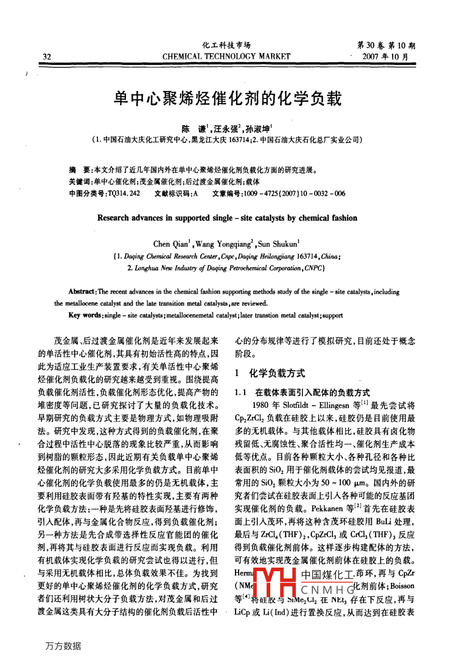 化工科技市場第30卷第10期32CHEMICAL TECHNOLOGY MARKET2007年10月單中心聚烯烴催化劑的化學負載.陳謙',汪永強,孫淑坤'(1.中國石油大慶化工研究中心,黑龍江大慶163714;2.中國石油大慶石化總廠實業(yè)公司)摘要:本文介紹 了近幾年國內(nèi)外在單中心聚烯烴催化劑負載化方面的研究進展。關鍵詞:單中心催化劑;茂金屬催化劑;后過渡金屬催化劑;載體中圖分類號:TQ314.242文獻標識碼:A 文章編號 :1009 - 4725(2007)10 -0032 -006Research advances in supported single - site catalysts by chemical fashionChen Qian' ,Wang Yongqiang2 ,Sun Shukun'(1. Daqing Chemical Research Center ,Cnpc ,Daqing Heilongiang 163714, China;2. Longhua Newo Industry of Daqing Petrochemical Corporation,CNPC)Abstract:The recent advances in the chemical fashion spporting methods study of the single - site catalysts , includingthe melallocene catalyst and the late transition metal catalysts , are reviewed.Key words :single - site calytsmeallocenenetal catalyst;later transtion metal calytsupport茂金屬、后過渡金屬催化劑是近年來發(fā)展起來心的分布規(guī)律等進行了模擬研究,目前還處于概念的單活性中心催化劑,其具有初始活性高的特點,因階段。此為適應工業(yè)生產(chǎn)裝置要求,有關單活性中心聚烯1化學負載方式烴催化劑負載化的研究越來越受到重視。圍繞提高負載催化劑活性,負載催化劑形態(tài)優(yōu)化,提高產(chǎn)物的1.1 在載體表面引入配體的負載方式堆密度等問題,已研究探討了大量的負載化技術。1980年Slofildt - Ellingesn 等[1] 最先嘗試將早期研究的負載方式主要是物理方式,如物理吸附CpzZrCl2負載在硅膠上以來,硅膠仍是目前使用最法。研究中發(fā)現(xiàn),這種方式得到的負載催化劑,在聚多的無機載體。與其他載體相比,硅膠具有鹵化物合過程中活性中心脫落的現(xiàn)象比較嚴重,從而影響殘留低、無腐蝕性、聚合活性均一、催化劑生產(chǎn)成本到樹脂的顆粒形態(tài),因此近期有關負載單中心聚烯低等優(yōu)點。目前各種顆粒大小、各種孔徑和各種比烴催化劑的研究大多采用化學負載方式。目前單中表面積的SiO2用于催化劑載體的嘗試均見報道,最心催化劑的化學負載使用最多的仍是無機載體,主常用的SiO2顆粒大小為50 ~ 100 μm。國內(nèi)外的研要利用硅膠表面帶有羥基的特性實現(xiàn),主要有兩種究者們嘗試在硅膠表面上引人各種可能的反應基團化學負載方法:---種是先將硅膠表面羥基進行修飾,實現(xiàn)催化劑的負載。Pekkanen 等[2首先在硅膠表引入配體,再與金屬化合物反應,得到負載催化劑;面上引入茂環(huán),再將這種含茂環(huán)硅膠用BuLi處理,另一種方法是先合成帶選擇性反應官能團的催化最后與ZrCI,(THF)2,CpZrCl,或CrCI](THF);反應劑,再將其與硅膠表面進行反應而實現(xiàn)負載。利用得到負載催化劑前體。這樣逐步構建配體的方法,有機載體實現(xiàn)化學負載的研究嘗試也得以進行,但可有效地實現(xiàn)茂金屬催化劑前體在硅膠上的負載。與采用無機載體相比,總體負載效果不佳。為找到.Herm:中國煤化工茚環(huán),再與CpZr更好的單中心聚烯烴催化劑的化學負載方式,研究(NM:MHCN M H G化利前體:Boissos者們還利用樹狀大分子負載方法,對茂金屬和后過等[41將硅膠與SiMe,U2在NEt,存在下反應,再與渡金屬這類具有大分子結構的催化劑負載后活性中,LiCp或Li(Ind)進行置換反應,從而達到在硅膠表2007年10月陳謙等:單中心聚烯烴催化劑的化學負載33面引人配體的目的,最后與ZrCl,(THF)2、LiCp或Li負載催化劑活性相當于,甚至優(yōu)于對應的均相催化(Ind)反應完成負載過程。這三種路線所得到催化劑。Suzuki 等"利用硅氫化反應,在含乙烯基硅橋劑主金屬Zr的負載量為1.99% ~3. 11%。在MAO的茂催化劑的硅橋上引入硅氯鍵,選擇性地和硅膠助催化作用下,三種催化劑催化乙烯聚合都有較高表面的硅羥基反應,得到鍵合部位為Si-0- -Si 的.的催化活性,達到(0.2 ~ 1.3) x 103 kg/mol.負載催化劑。此外還研究了通過活性烯烴鏈作負載Zr. b. h。所得聚合物分子量分布寬,表明配合物與位和通過與硅膠表面硅醚反應的負載方式。硅膠表面反應過程中副反應較多,可能產(chǎn)生了多個Deck等['8]研究了用活性硅烷基官能團與硅膠活性中心。.的負載反應。負載催化劑所生成聚乙烯的Mw/Mn早前在載體上引入雙茚及芴基化合物的方法也為寬分布,表明聚合過程中存在多種活性中心,茂金有報道。如將硅膠用SiCl,進行處理后引入茚基或?qū)俅呋瘎┰诠枘z上可能存在多個鍵合部位。負載后芴基,鋰化反應后再與ZrCl,(THF)2或NdCl3配位,濾過的均相催化劑減少,表明催化劑負載量提高??梢院铣?-系列硅膠負載的雙茚及芴基茂金屬催化但由于鍵合部位增加,大大束縛了表面催化劑的自劑。由度,影響單體的插人,導致活性降低。甚至在多鍵Spitz等'報道了一種新穎的四步負載方法(圖合部位的情況下,有可能出現(xiàn)不可逆的“面朝下”結1),首先將表面硅羥基鋰化;鋰化物和6,6-二甲基構的配合物,造成催化劑失活。如圖2所示。這是富烯反應;再與ZrCI4(THF)2配位;最后與LiCp進今后在這種負載方法的研究中需注意的問題。行取代反應。這種負載催化劑前體和三異丁基鋁、Si-BrOH OH QH(HNMe2Ph) [B(CEs).]等組成的催化體系,在+σδo6o80A: Zτ≤285: 1的低鋁鋯比下對乙烯聚合表現(xiàn)出極高的活性,達到7200 kg/mol Zr .b.h。缺點是催化劑的合成過程較繁瑣。INEoaloe圈2帶有“ 面朝下”結構的