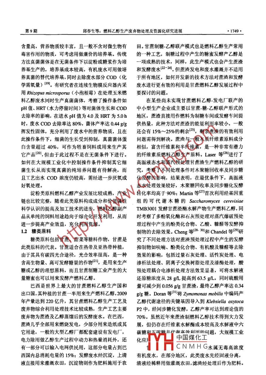 化工進(jìn)展年第29卷第9期HEMICAL INDUSTRY AND ENGINEERING PROGRESS1747進(jìn)展與述評(píng)燃料乙醇生產(chǎn)廢棄物處理及資源化研究進(jìn)展邱春生,賈曉強(qiáng),聞建平,盧文玉(天津大學(xué)化工學(xué)院生物化工系,天津300072摘要:隨著燃桿乙醇產(chǎn)業(yè)的發(fā)展,其生產(chǎn)過程中產(chǎn)生的廢棄物如廢渣、廢水等的處理及資源化利用研究得到廣泛關(guān)注。本文以幾種具有代表性的原料,如玉米、甘蔗、木薯、甜高粱和木質(zhì)纖維素等為例,分別介紹了其燃料乙醇生產(chǎn)過程中產(chǎn)生的廢棄物種類、特點(diǎn)、處理及資源化利用技術(shù)研究進(jìn)展關(guān)鍵詞:燃料乙醇;廢棄物處理;資源化中圖分類號(hào):X703:X705文獻(xiàn)標(biāo)志碼:A文章編號(hào):1000-6613(2010)09-1747-08Progress in fuel ethanol production waste treatment and resource recoveryQ1U Chunsheng, JIA Xiaoqiang, WEN Jianping, LU Wenyu(Department of Biochemical Engineering, School of Chemical Engineering and TechnologyTianjin University, Tianjin 300072, China)Abstract: With the development of fuel ethanol industry, the waste treatment and resource recovery inthe production process, such as wastewater and solid residues, have attracted widespread attention. Thispaper summarizes the category and characteristics of the waste from fuel ethanol production as well asthe development of utilization technology with various feedstocks, such as sugar cane, cassava, sweetsorghum and lignocellulose etc.Key words: fuel ethanol; waste treatment; resource recovery現(xiàn)代工業(yè)及交通運(yùn)輸業(yè)的迅速發(fā)展需要消耗的廢渣、發(fā)酵過程的副產(chǎn)物及蒸餾階段產(chǎn)生的酒糟大量的能源,隨著全球工業(yè)化進(jìn)程的加速,化石能液等。由于此類廢弁物中富含有機(jī)物質(zhì),如蛋白質(zhì)源的大量消耗造成能源供需矛盾日益突出及生態(tài)環(huán)纖維素、油脂及有機(jī)酸類等,有較高的利用價(jià)值境惡化。近年來,清潔環(huán)保的可再生能源的開發(fā)利因此對(duì)其處理研究不再僅限于如何達(dá)標(biāo)排放,而用得到人們的廣泛關(guān)注,其中,燃料乙醇由于原料如何充分利用廢棄物中的有用物質(zhì)生產(chǎn)其它高附來源豐富廣泛且生產(chǎn)工藝相對(duì)成熟,是一種理想的加值產(chǎn)品、實(shí)現(xiàn)廢棄物資源化綜合利用是目前研可再生清潔能源,大力發(fā)展燃料乙醇產(chǎn)業(yè)可為工業(yè)究的熱點(diǎn)。生產(chǎn)提供穩(wěn)定清潔的能源供應(yīng)、減少污染氣體和溫隨著燃料乙醇產(chǎn)業(yè)的發(fā)展,其生產(chǎn)廢棄物處理室氣體排放及增加農(nóng)業(yè)收入及資源化利用成為亟待解決的問題,在處理此類廢燃料乙醇一般通過微生物發(fā)酵方法生產(chǎn)。根據(jù)棄物的同時(shí)開發(fā)其高效的資源化利用途徑,充分利原料不同,其生產(chǎn)技術(shù)可分為三類:以玉米、小麥、谷物及薯類等為原料的淀粉類生產(chǎn)方法;以甘蔗、收稿日期:20100203:修改稿日期:20100303甜菜及甜高梁等為原料的糖類生產(chǎn)方法;以農(nóng)作物“金02)及教育部科學(xué)技術(shù)秸稈、林業(yè)廢棄物等為原料的纖維素類生產(chǎn)方法中國(guó)煤化二源化成套技術(shù)研究與示范”CNMHG生產(chǎn)工藝一般包括原料預(yù)處理、糖化發(fā)酵、乙醇蒸第一作者簡(jiǎn)介:邱春生(1984-),男,博士研究生, E-mail餾及精餾脫水等“6。燃料乙醇微生物發(fā)酵生產(chǎn)過3s4@63m,聯(lián)系人:聞建平,教授,博士生導(dǎo)師,Em程中會(huì)產(chǎn)生大量的廢棄物,包括預(yù)處理過程中產(chǎn)生ipen@tju.edu.cn.·1748·2010年第29卷用原料,是燃料乙醇產(chǎn)業(yè)能否健康快速發(fā)展的重要徑與玉米酒糟蛋白生產(chǎn)工藝類似-12技術(shù)基礎(chǔ),有助于形成完整的燃料乙醇產(chǎn)業(yè)生產(chǎn)鏈。玉米酒糟生產(chǎn)飼料附加值較低,除用做牲畜飼本文作者從燃料乙醇廢弁物處理及資源化利用角度料外,其它工業(yè)用途有待進(jìn)一步開發(fā)。研究者對(duì)酒出發(fā),根據(jù)原料不同分類對(duì)目前國(guó)內(nèi)外燃料乙醇生糟蛋白飼料的組成及性質(zhì)進(jìn)行了分析,探討其深加產(chǎn)過程中產(chǎn)生的廢棄物特點(diǎn)、處理及資源化利用研利用價(jià)值玉米酒糟飼料主要含有以下幾種成分:究進(jìn)展作了概括和總結(jié)。蛋白質(zhì)(268%~337%),油脂類(3.5%~12.8%),1傳統(tǒng)原料燃料乙醇生產(chǎn)廢棄物處碳水化合物(3269,纖維素類(242理及資源化利用加工技術(shù)的革新,如何利用其加工高附加值產(chǎn)品是此行業(yè)的一個(gè)發(fā)展趨勢(shì)。11淀粉類原料人類使用淀粉基原料生產(chǎn)乙醇已有幾千年的玉米蛋白可用來生產(chǎn)蛋白纖維、膜材料和黏合劑等,一般通過混磨法從玉米籽粒中提取,原料成歷史,原料包括玉米、小麥、水稻等,主要利用原本較髙,玉米酒糟蛋白飼料是較廉價(jià)的原料來源。料中富含的淀粉類物質(zhì)水解發(fā)酵產(chǎn)乙醇。玉米是目前燃料乙醇工業(yè)化生產(chǎn)中使用最多的淀粉基原料,xu等5對(duì)如何利用DDGS提取蛋白和纖維作了以玉米為代表的乙醇生產(chǎn)工藝及廢棄物資源化利用系列研究,開發(fā)了酸性條件下有還原劑存在時(shí)從工藝發(fā)展相對(duì)比較成熟DDGS中提取玉米蛋白的方法,得到蛋白質(zhì)含量超美國(guó)是米燃料乙醇產(chǎn)業(yè)發(fā)展