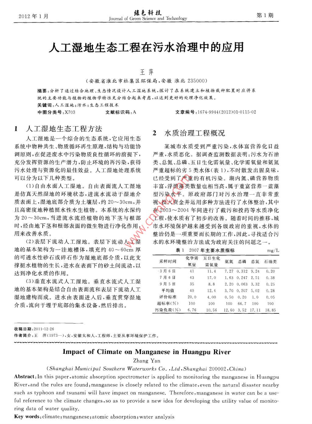 2012年1月綠色科技Journal of Green Science and Technology第1期人工濕地生態(tài)工程在污水治理中的應(yīng)用王萍(安徽省淮北市杜集區(qū)環(huán)保局,安徽淮北235000)摘要:分析了通過(guò)結(jié)合地理、生態(tài)情況設(shè)計(jì)人工濕地系統(tǒng),探討了在系統(tǒng)建立和植物栽種配置時(shí)應(yīng)將系統(tǒng)的主要功能與植物的植物學(xué)特性充分結(jié)合起來(lái)考慮,以達(dá)到更妤的處理凈化效果關(guān)鍵詞:人工濕地;污水;生態(tài)工程技術(shù)中圖分類(lèi)號(hào):X703文獻(xiàn)標(biāo)識(shí)碼:A文章編號(hào):1674-9944(2012)01-0115-02人工濕地生態(tài)工程方法2水質(zhì)治理工程概況人工濕地是一個(gè)綜合的生態(tài)系統(tǒng),它應(yīng)用生態(tài)系統(tǒng)中物種共生、物質(zhì)循環(huán)再生原理,結(jié)構(gòu)與功能協(xié)某城市水質(zhì)受到嚴(yán)重污染,水體富營(yíng)養(yǎng)化日益調(diào)原則,在促進(jìn)廢水中污染物質(zhì)良性循環(huán)的前提下,嚴(yán)重,水質(zhì)惡化。據(jù)調(diào)查監(jiān)測(cè)數(shù)據(jù)表明:污水為石油充分發(fā)揮資源的生產(chǎn)潛力,防止環(huán)境的再污染,獲得類(lèi)、總氮、總磷、五日生化需氧量、化學(xué)需氧量和氨氮污水處理與資源化的最佳效益。人工濕地處理系統(tǒng)嚴(yán)重超標(biāo)的劣5類(lèi)水體(表1),不時(shí)散發(fā)出腥臭味可以分為以下幾種類(lèi)型。已經(jīng)受到了嚴(yán)重的有機(jī)污染。湖內(nèi)氮、磷營(yíng)養(yǎng)物質(zhì)(1)自由水面人工濕地。自由表面流人工濕地豐富,浮游藻類(lèi)數(shù)量也相當(dāng)高,屬于重富營(yíng)養(yǎng)一藍(lán)藻是仿真天然濕地的環(huán)境狀態(tài),進(jìn)流水流動(dòng)于濕地介型污染水平。原政府部門(mén)對(duì)污水治理一直非常重質(zhì)表面上,濕地底部介質(zhì)為土壤層,約20~30cm,并視,投入資金并運(yùn)用多種方法進(jìn)行了水體整治,其中且高密度地種植挺水性水生植物。本系統(tǒng)的水深約在2003~2004年間進(jìn)行了截污和投藥等水質(zhì)凈化為20~30cm,當(dāng)進(jìn)流水流經(jīng)植物的地下莖與根部程,使水質(zhì)有了初步的改善。隨著時(shí)間的推移,城時(shí),經(jīng)由地下莖和根部表面的微生物進(jìn)行凈化作用,市水環(huán)境保護(hù)越來(lái)越受到各級(jí)政府的重視,水體的用來(lái)改善水質(zhì)整治仍是一項(xiàng)重要而長(zhǎng)期的工作,因此,尋找適合污(2)表層下流動(dòng)人工濕地。表層下流動(dòng)人工濕水的水環(huán)境整治方法成為政府關(guān)注的問(wèn)題之地的基本架構(gòu)為一洼地槽體,填充約40~60cm厚表12007年主要水質(zhì)指標(biāo)mg/L的可透水性砂石或碎石作為濕地底部介質(zhì),以此支化學(xué)需五日生化撐挺水植物的生長(zhǎng),進(jìn)水在表面下的砂土間流動(dòng),以氧量需氧量氨氮總解總氮石油類(lèi)達(dá)到凈化水質(zhì)的作用。3月6日270.3129.240.207月6日(3)垂直水流式人工濕地。垂直水流式人工濕17.01.630.2472,510,38月58.82.200.0633.320.25地的基本架構(gòu)是結(jié)合自由表面流和表層下流動(dòng)人工平均值12.43.700.2075.020.28濕地建構(gòu)而成。進(jìn)水由表面進(jìn)入后,垂直貫穿濕地評(píng)價(jià)標(biāo)準(zhǔn)20.04.000.500.201.00.05介質(zhì),流向于埋于底部的集水設(shè)備,然后排出。超標(biāo)率(%)110066.7100100污染負(fù)荷(%)6.7610.5612.603.5217.1118.85收稿日期:2011-12-26作者簡(jiǎn)介:王萍(1973-),女,安徽太和人,工程師,主要從事環(huán)境保護(hù)工作Impact of Climate on Manganese in Huangpu RiverShanghai Municipal Southern Waterworks Co, Ltd Shanghai 200002, China)Abstract: In this paper, atomic absorption spectrometer is applied to monitoring the manganese in huangpuRiver, and the rules are found manganese is closely related to the climate, even the natural disaster nearbysuch as typhoon and tsunami will have impact on manganese. Therefore, manganese in water can be a useful reference to the climate changes, so as to provide a new idea for developing the utility value of monito-ring data of water quality.Key words: climate; manganese; atomic absorption; water analysis王萍:人工濕地生態(tài)工程在污水治理中的應(yīng)環(huán)境與安全式,其功能是作為一級(jí)氧化塘的補(bǔ)充和加強(qiáng)環(huán)節(jié)3人工濕地生態(tài)技術(shù)處理水質(zhì)研究3.4水生植物塘我國(guó)對(duì)于運(yùn)用人工濕地生態(tài)技術(shù)處理水體,有不水生植物塘是兼有穩(wěn)定塘和水生養(yǎng)殖優(yōu)點(diǎn)的生少成功的實(shí)例如上海蘇州河的夢(mèng)清園活水公園、杭州態(tài)凈化技術(shù)。穩(wěn)定塘是通過(guò)菌藻共生系統(tǒng)對(duì)污水進(jìn)長(zhǎng)橋溪人工濕地和深圳的白泥坑人工濕地等等。如何行生態(tài)處理的工程設(shè)施。按凈化機(jī)理可分為好氧運(yùn)用巳經(jīng)掌握的成功經(jīng)驗(yàn),結(jié)合污水實(shí)際情況,尋找適塘、厭氧塘、兼性塘、曝氣塘和綜合生物塘等。不同合的污水治理方案,是目前要探討的問(wèn)題。類(lèi)型的塘串聯(lián)組成的塘系統(tǒng),往往具有更好的處理由于其地理環(huán)境的特殊性,可將水生生態(tài)修復(fù)能力。水生養(yǎng)殖是以太陽(yáng)能為初始能源,通過(guò)在污系統(tǒng)按城市污水→A區(qū)→B區(qū)→C區(qū)→D區(qū)這一回水生態(tài)系統(tǒng)中