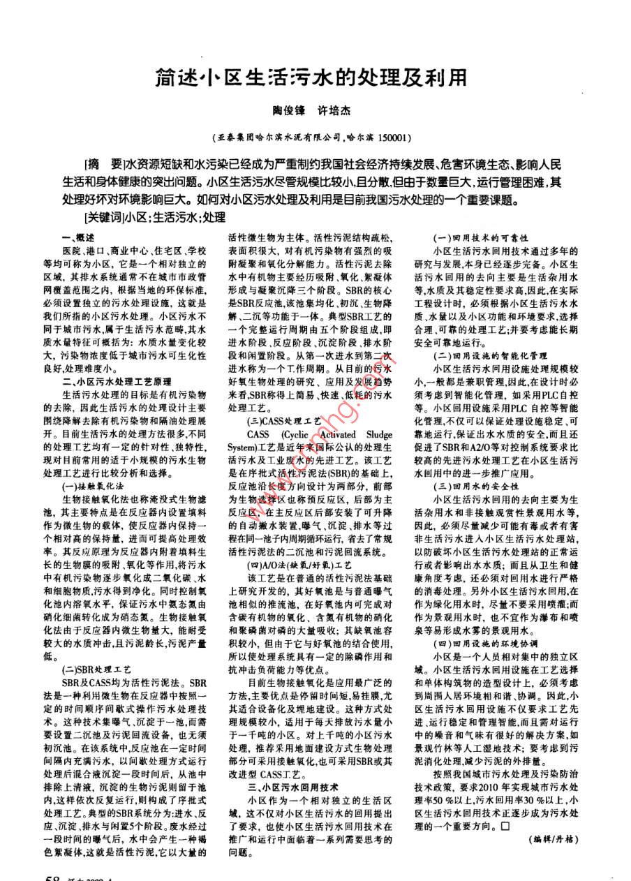 簡(jiǎn)述小區(qū)生活污水的處理及利用