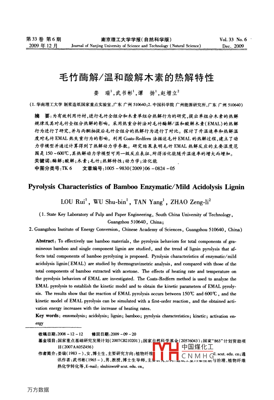 第33卷第6期南京理工大學(xué)學(xué)報(bào)(自然科學(xué)版)Vol 33 No 62009年12月Journal of Nanjing University of Science and TechnolDec.2009毛竹酶解/溫和酸解木素的熱解特性婁瑞',武書彬!,譚揚(yáng)',趙增立2(1華南理工大學(xué)制漿造紙國家重點(diǎn)實(shí)驗(yàn)室廣東廣州510640;2中國科學(xué)院廣州能源研究所廣東廣州510640)摘要:為有效利用竹材,進(jìn)行毛竹全組分和木素單組分熱解行為的研究,提出單組分木素的熱解規(guī)律及其對毛竹全組分熱解的影響。采用熱重分析法對毛竹酶解/溫和酸解木素(EMAL)的熱解行為進(jìn)行了研究,并與丙酮抽提后毛竹全組分的熱解行為進(jìn)行了對比。探討了升溫速率和熱解溫度對毛竹EMAL熱失重行為的影響。利用Cats- Redfern法描述毛竹EMAL的熱解過程,建立了動(dòng)力學(xué)模型并通過計(jì)算得到了熱解動(dòng)力學(xué)參數(shù)。研究結(jié)果表明毛竹EMAL熱解反應(yīng)的主要溫度范圍是150~600℃,其熱解動(dòng)力學(xué)模型可用一級反應(yīng)表征,所得活化能隨升溫速率的增大而增加。關(guān)鍵詞:酶解;酸解;木素;毛竹;熱解特性;動(dòng)力學(xué);活化中圖分類號:TK6文章編號:1005-9830(2009)06-0824-05Pyrolysis Characteristics of Bamboo Enzymatic/Mild Acidolysis LigninLOU Rui, WU Shu-bin, TAN Yang, ZHAO Zeng-li(1. State Key Laboratory of Pulp and Paper Engineering, South China University of TechnologyGuangzhou 510640,China2. Guangzhou Institute of Energy Conversion, Chinese Academy of Sciences, Guangzhou 510640, ChinaAbstract: To effectively use bamboo materials, the pyrolysis behaviors for total components of gramineous bamboo and single component lignin are studied, and the trend of lignin pyrolysis that af-fects total components of bamboo pyrolyzing is proposed. Pyrolysis chacidolysis lignin(EMAL)are studied by thermogravimetric analysis, and compared with those of thetotal components of bamboo extracted with acetone. The effects of heating rate and temperature onthe pyrolysis behaviors of EMAL are investigated. The Coats-Redfern method is used to analyze theEMAL pyrolysis to establish the kinetic model and to obtain the kinetic parameters of EMAL pyrolysis. The results show that the reaction of EMAL pyrolysis occurs between 150C and 600C, and thekinetic model of EMAL pyrolysis can be simulated with a first-order reaction, and the obtained acti-vation energy increases with the increase of heating ratesKey words: enzomolysis; acidolysis; lignin; bamboo; pyrolysis characteristics; kinetic; activation en收稿日期:2008-12-12修回日期:2009-09-20基金項(xiàng)目:國家重點(diǎn)基礎(chǔ)研究發(fā)展計(jì)劃(200c210201);國家自然科學(xué)基金(20576043):國家“863”計(jì)劃資助項(xiàng)目(2007AA05Z456)中國煤化工作者簡介:婁瑞(1983-),女,博士生,主要研究方向:植物纖維CNMHscut. edu. cn;通訊作者:武書彬(1965-),男,教授博士生導(dǎo)師,主要乳:是米江啊與治理、植物纖維熱化學(xué)轉(zhuǎn)化等,E-mal: shubino@scu.edu.cm??偟?69期瑞武書彬揚(yáng)趙增立毛竹酶解/溫和酸解木素的熱解特性我國生物質(zhì)資源十分豐富,僅稻草、麥草、分離得到含少量碳水化合物的酶解粗木素,再用蔗渣、蘆葦、竹子等非木材纖維年產(chǎn)量就超過分析純鹽酸配制成pH值2.0的去離子水(簡稱10億t。如何有效開發(fā)利用豐富的植物資源,酸性去離子水)洗滌,冷凍干燥。成為國內(nèi)外眾多學(xué)者研究的熱點(diǎn)課題之1.2.2溫和酸解和EMAL的提取竹類是我國重要植物資源之一,具有特殊的經(jīng)酶解粗木質(zhì)素(5g絕干)分散在100mL酸濟(jì)、生態(tài)和社會(huì)價(jià)值,它在我國分布廣、生長快、性二氧六環(huán)-水混合液(二氧六環(huán)用量85mL,濃適應(yīng)性強(qiáng)3。以竹類為原料,經(jīng)化學(xué)轉(zhuǎn)化生產(chǎn)度0.01mo/L)中?;旌弦涸?7℃、氮?dú)獗Wo(hù)下紙漿、化學(xué)品和液體燃料,對能源工業(yè)和化學(xué)工回流抽提2h。反應(yīng)結(jié)束后將混合液過濾,殘?jiān)脴I(yè)的可持續(xù)發(fā)展及發(fā)展生態(tài)經(jīng)濟(jì)均有十分重要中性二氧六環(huán)-水混合液洗滌至濾液澄清。得到的意義。深入認(rèn)識竹材熱解的動(dòng)力學(xué)規(guī)律,是的濾液用碳酸氫鈉中和后,在35℃下減壓蒸發(fā)濃竹材高效利用的理論基礎(chǔ)和關(guān)鍵。竹材的熱解縮,少量的濃縮液慢慢滴加至大量酸性去離子水產(chǎn)物組分繁多,并受到其熱解動(dòng)力學(xué)的制約,其中,靜置。將沉淀的木素離心分離,洗滌后冷凍干熱裂解行為是纖維素、半纖維素和木質(zhì)素這3燥,最后用色譜級正己烷洗滌,去除其它殘留的抽種主要組分熱裂解行為綜合表現(xiàn)的結(jié)果。木素出物,然后在室溫下真空干燥,即得到EMAL,供是一種復(fù)雜的、非結(jié)晶性的空間立體結(jié)構(gòu)的大后續(xù)研究使用。實(shí)驗(yàn)以丙酮抽提后的毛竹和分離分子有機(jī)化合物,以苯基丙烷單元為主體,經(jīng)各得到的EMAL為原料進(jìn)行分析種醚鍵、碳-碳鍵等連接而成,且含有豐富的羥1.3元素分析基和甲氧基等官能團(tuán)。本文以毛竹為原材料采采用(德國)Ⅴario-元素分析儀和ICP等離用酶解/溫和酸解的方法分離毛竹中的木素,子體發(fā)射光譜儀對毛竹木素樣品進(jìn)行化學(xué)成分檢此法所得木素的純度和磨木木素( Milled wood測。測定條件如下:氧化爐溫度1150℃,還原爐lignin,MWL)相當(dāng),但其得率是MWL的2~3溫度850℃;測量池載氣流速90mL/min、參比池倍。目前國內(nèi)外都在