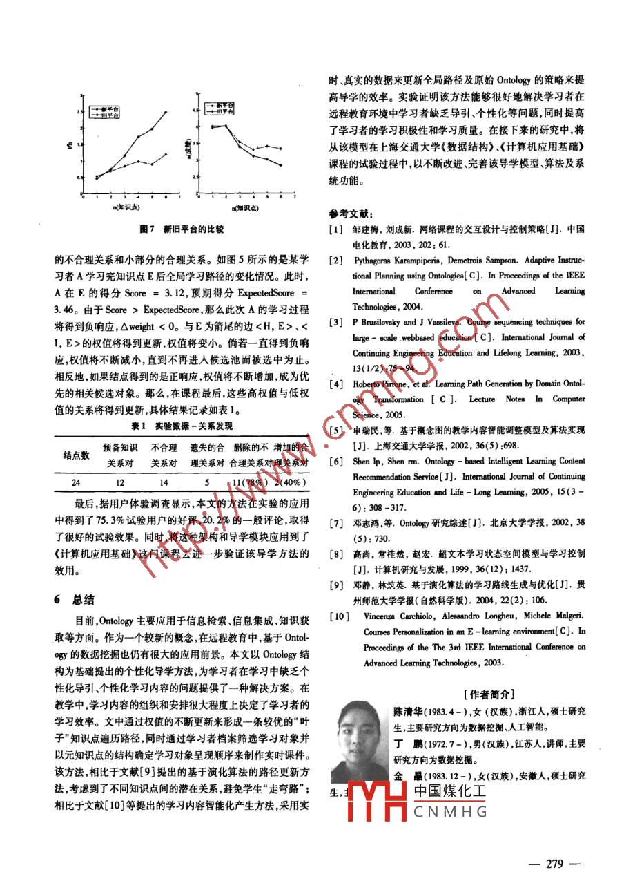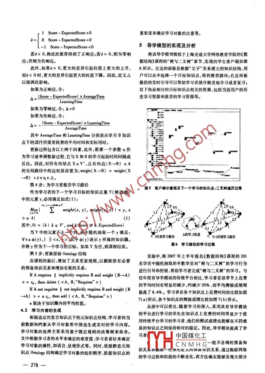 第25卷第10期計(jì)算機(jī)仿真2008 年10月文章編號:1006 - 9348(2008)10-0275 -05學(xué)習(xí)指導(dǎo)的設(shè)計(jì)與實(shí)現(xiàn)陳清華,丁鵬,金晶(_上海交通大學(xué)計(jì)算科學(xué)與工程系,上海200240)摘要:針對遠(yuǎn)程教育平臺中,因缺乏有效的學(xué)習(xí)控制、個性化的引導(dǎo)、調(diào)節(jié)等而導(dǎo)致平均學(xué)習(xí)效率低下的問題,提出了一種基于知識點(diǎn)架構(gòu)的個性化課程導(dǎo)學(xué)模型。該模型根據(jù)課程中知識點(diǎn)的本體結(jié)構(gòu)、資源檔案以及學(xué)習(xí)者的檔案和學(xué)習(xí)行為等,通過知識點(diǎn)本體結(jié)構(gòu)與圖的轉(zhuǎn)換、路徑權(quán)值更新、路松搜索內(nèi)容篩選、本體更新等步驟,實(shí)時地定制出適合于學(xué)習(xí)者個體的學(xué)習(xí)內(nèi)容。在實(shí)驗(yàn)中,方法應(yīng)用于上海交通大學(xué)網(wǎng)絡(luò)教育學(xué)院的《數(shù)據(jù)結(jié)構(gòu)》課程。經(jīng)分析與研究說明,算法不僅能夠幫助學(xué)習(xí)者完成課程的學(xué)習(xí),并能有效地控制引導(dǎo)學(xué)習(xí)者對資源的訪向和課程的學(xué)習(xí),達(dá)到了提高學(xué)習(xí)者學(xué)習(xí)質(zhì)量和學(xué)習(xí)興趣的月的;同時,該方法也能夠發(fā)現(xiàn)課程初始本體結(jié)構(gòu)中不合理的關(guān)系。關(guān)鍵詞:遠(yuǎn)程教育;個性化服務(wù);課程編例;學(xué)習(xí)控制;學(xué)習(xí)路徑;本體中圈分類號:TP391.7文獻(xiàn)標(biāo)識碼:ADesign and Implementation of Learning GuidanceCHEN Qing - hua , DING Peng,JIN Jing(Depl. of Computer Sci, and Eng. ,Shanghai Jjiaotong Univ. , Shanghai 200240, China)ABSTRACT: 'This paper describes a novel methodology to generate personalized learning guidance content for e-learners according to course ontology and their profiles. Through ontology - graph transformnation, weight updating al-gorithm, content customization and ontology update, the methodology implements an automatic - adapted relationshipwith gradually enhanced leaning control. After a period of learning, the ontology can be updated to achieve a moreaccurate personalization. The proposed methodology is applied to the implementation of a web based leaming systembased upon the course‘Data Structure' . Experimental results show that the model can not only help the e - learmersfinish their course , but also can achieve the purpose of increasing learming eficiency and quality through the way ofcotrlling their access to leaning resources and giving them efective guidance.KEYWORDS: E - learning; Personalized service; Course 8equencing; Lerming control; Learming path; Ontology問題。1引盲根據(jù)對上海交通大學(xué)網(wǎng)絡(luò)教育學(xué)院的專項(xiàng)調(diào)查顯示,具隨著計(jì)算機(jī)、多媒體技術(shù)的飛速發(fā)展和廣泛應(yīng)用,遠(yuǎn)程有相似學(xué)習(xí)興趣的學(xué)員趨向于需求相同的學(xué)習(xí)資源,并對它教育(E - Learning)突破了傳統(tǒng)教學(xué)方式的物理限制,為更多們有類似的評 分;而具有相近學(xué)習(xí)順序的學(xué)員在同等成績的人提供了豐富的學(xué)習(xí)資源和方便、靈活的教學(xué)環(huán)境。然下,花費(fèi)的時間 相近。學(xué)習(xí)材料的選擇學(xué)習(xí)順序的制定影而,在享受遠(yuǎn)程教育帶來的優(yōu)勢的同時,也伴隨著新的需求響學(xué)習(xí)質(zhì)量,如果學(xué)員能夠?qū)?nèi)容的學(xué)習(xí)有一個合理的組織和問題。目前,很多遠(yuǎn)程教育機(jī)構(gòu)都只注重資源的宣傳,缺和安排,可大大提高 學(xué)員的學(xué)習(xí)效率。在相關(guān)研究中, Py-乏學(xué)習(xí)控制"和個性化的學(xué)習(xí)指導(dǎo)。面對學(xué)生數(shù)目龐大、學(xué)thagoras 等[23提出了一-種基于本體( Ontology)的課程編例['3生之間水平參差不齊學(xué)生缺乏教師直接指導(dǎo)的遠(yuǎn)程教育環(huán)通用體系,該方法通過將學(xué)習(xí)者檔案作為參數(shù)對學(xué)習(xí)對象進(jìn)境,如何利用學(xué)習(xí)者在網(wǎng)絡(luò)課堂中的學(xué)習(xí)活動記錄、測試記行過濾產(chǎn)生虛擬學(xué)習(xí)對象池,最后根據(jù)領(lǐng)域Ontology和教學(xué)錄及學(xué)習(xí)者的留言等反饋信息指導(dǎo)學(xué)習(xí)者并進(jìn)行有效的學(xué)計(jì)劃從她中洗取對爭并產(chǎn)生個姓化理程;Roberto等[4]提出習(xí)控制"、引導(dǎo)和調(diào)節(jié)成了遠(yuǎn)程課程教學(xué)方式中亟待解決的中國煤化工成方法,將課程架構(gòu)成三層|YHC N M H G文檔) ,先將Ontology基金項(xiàng)目:國家自然科學(xué)基金項(xiàng)目(60372078)轉(zhuǎn)換成權(quán)重圖,并從圖中搜索達(dá)到特定目標(biāo)的學(xué)習(xí)路徑。收稿日期:2007 -09-17修回日期:2007 -10-03Shen Ip等0則提出了一-種基于Ontology的智能化學(xué)習(xí)內(nèi)容-275-推薦算法。上述方法以O(shè)nlology()]) 為基礎(chǔ),通過知識挖掘、發(fā)現(xiàn)潛在RoquiresRequiresLeaming的關(guān)系的過程以達(dá)到適應(yīng)性學(xué)習(xí)的目的。然而,上述方法尚Is-forResources處在理論階段,缺乏有效的實(shí)驗(yàn)數(shù)據(jù)來證實(shí)其可用性。另外/CompoundAlE-方面,雖然它們都考慮了適應(yīng)性學(xué)習(xí),但是方法的輸人都Knowledge ftIs part of -Points是片面的,并未考慮在多變、動態(tài)的學(xué)習(xí)環(huán)境中,各種因素對1s-forExer學(xué)習(xí)者形成的影響和變化。如:上述方法都缺