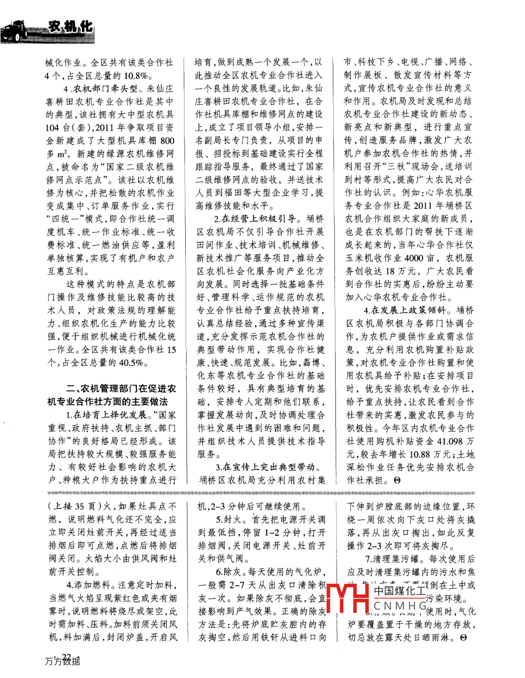 用戶指家用秸稈氣化爐的選擇和使用安徽省農(nóng)業(yè)機(jī)械試驗(yàn)鑒定站口祝思文肖沖舟王光明昊榮輝作為農(nóng)業(yè)大國,我國的農(nóng)作選擇家用秸稈氣化爐時(shí),要|低,燃燒無力;燃料裝得太松物秸稈資源非常豐富。一直以選擇:(1)燃燒效果好、加熱快是不能很好地將燃料轉(zhuǎn)為燃?xì)鈦?農(nóng)村做飯、燒水都是直接燃捷,不需要輔助能源,也不用化‖二是無法將燃?xì)庵械碾s質(zhì)充分燒農(nóng)作物秸稈、木柴等獲取能學(xué)添加劑;(2)燃燒安全,無煙、過濾,會縮短產(chǎn)氣時(shí)間,影響燃源,不僅浪費(fèi)資源,更降低了熱「無味、無積碳、無廢氣產(chǎn)生;(3)「燒效果。燃料裝填時(shí),要邊裝邊效能;不僅造成環(huán)境污染,更使「結(jié)構(gòu)簡單,使用可靠,操作方便;用直徑為2-3∈m粗的木棍將爐人們的健康受到危害。近年來,(4)有一定的通用性,能用于炊內(nèi)燃料均勻地?fù)v緊、搗實(shí)。密實(shí)隨著國家對農(nóng)業(yè)科技的持續(xù)投事、洗浴、保溫、烘干等多種用的燃料搗松些,泡松的燃料搗緊入,農(nóng)業(yè)秸稈利用技術(shù)日益成|途。些。只有掌握好燃料裝填的松緊熟,科研部門研發(fā)出戶用秸稈氣度,爐子燃燒的產(chǎn)氣效果才能達(dá)化爐投放農(nóng)村市場,它將農(nóng)作物二家用秸稈氣化爐的使用到最佳。秸稈、農(nóng)林廢棄物等有效地轉(zhuǎn)化(一)燃料的選擇(二)使用方法與注意事項(xiàng)為燃?xì)?使用方便、千凈衛(wèi)生,改1燃料越干越好。燃料越干1.氣化爐灶具安放。氣化爐善了農(nóng)村做飯、燒水等生活衛(wèi)生‖產(chǎn)氣效果越好。雖然稍稍吸潮的「灶具應(yīng)靠窗戶安放,并在灶具上環(huán)境。目前,國內(nèi)家用秸稈氣化燃料也能用,但不能太濕,否則「方的窗戶上加一排風(fēng)扇,以便排爐市場上,生產(chǎn)企業(yè)眾多、爐型產(chǎn)出的氣體水分含量高,影響燃除室內(nèi)有害氣體。繁雜,農(nóng)戶選擇和使用都有一些燒效果。一般來說燃料含水量2安全檢查。使用前,應(yīng)先檢困難,下面對戶用秸稈氣化爐的以不超過20%為佳。查電源是否正常,緊固件是否擰選擇與使用方法做簡單介紹。2燃料搭配要合理。利用農(nóng)「緊,閥門及調(diào)節(jié)開關(guān)等操作件是村現(xiàn)有的稻殼、谷糠、鋸木,曬干否靈活。氣化爐應(yīng)平穩(wěn)的放置在一家用秸稈氣化妒的類型的豬、牛、羊等糞便,以及食用菌地面上,周圍不得放置易燃物和和選擇栽培廢料等作燃料時(shí),如在其中雜物,確保使用安全家用秸稈氣化爐主要有上加入一些大塊的玉米芯、木柴塊3.點(diǎn)火。關(guān)閉供氣閥、供風(fēng)吸式和下吸式兩種形式,其中家等則燃燒效果更佳。玉米稈、高閥、放水閥和出灰口,打開排煙用上吸式秸稈氣化爐從爐體底梁稈、豆稈、樹枝等須剿成3-閥,從填料口向爐內(nèi)填入少量的部送風(fēng),經(jīng)氣化反應(yīng)后,產(chǎn)生的5cm長的段或粉碎后與稻殼等細(xì)千柴或茅草等易燃物并點(diǎn)燃。為燃?xì)馔ㄟ^爐體上部的出氣管道碎燃料混合使用、合理搭配可提使底火充分燃燒,可打開風(fēng)機(jī)助送出,其優(yōu)點(diǎn)是:氣化率較高、灰高燃燒效果。燃。底火點(diǎn)燃后關(guān)閉風(fēng)機(jī),這時(shí)分少;家用下吸式秸稈氣化爐從3燃料裝填松緊要適度。氣爐體下、中部送風(fēng),經(jīng)氣化反應(yīng)化爐在產(chǎn)氣過程中,要求燃料具中國煤化衛(wèi)入氣化風(fēng)機(jī),這后,產(chǎn)生的燃?xì)鈴臓t體下部的出有一定的透氣性,不能大緊,也CNMH的煙氣氣管道送出,它的優(yōu)點(diǎn)在于焦油不能太松。如燃料裝得太緊,會排出,過2-3分鐘后,打開供氣含量較少、工作穩(wěn)定性好。阻礙燃?xì)饽嫘?導(dǎo)致灶頭火焰閥和灶前開關(guān)點(diǎn)(下轉(zhuǎn)22頁)數(shù)機(jī)化械化作業(yè)。全區(qū)共有該類合作社培育,做到成熟一個(gè)發(fā)展一個(gè),以|市、科技下鄉(xiāng)、電視、廣播、網(wǎng)絡(luò)、4個(gè),占全區(qū)總量的108%。此推動全區(qū)農(nóng)機(jī)專業(yè)合作社進(jìn)入制作展板、散發(fā)宣傳材料等方4農(nóng)機(jī)部門牽頭型。朱仙莊一個(gè)良性的發(fā)展軌道。比如,朱仙式宣傳農(nóng)機(jī)專業(yè)合作社的意義喜耕田農(nóng)機(jī)專業(yè)合作社是其中莊喜耕田農(nóng)機(jī)專業(yè)合作社,在合和作用。農(nóng)機(jī)局及時(shí)發(fā)現(xiàn)和總結(jié)的典型,該社擁有大中型農(nóng)機(jī)具作社機(jī)具庫棚和維修網(wǎng)點(diǎn)的建設(shè)農(nóng)機(jī)專業(yè)合作社建設(shè)的新動態(tài)104臺(套),2011年?duì)幦№?xiàng)目資上,成立了項(xiàng)目領(lǐng)導(dǎo)小組,安排新亮點(diǎn)和新典型,進(jìn)行重點(diǎn)宣金新建成了大型機(jī)具庫棚800名副局長專門負(fù)責(zé),從項(xiàng)目的申傳,創(chuàng)造服務(wù)品牌,激發(fā)廣大農(nóng)多m,新建的綠源農(nóng)機(jī)維修網(wǎng)「報(bào)、招投標(biāo)到基礎(chǔ)建設(shè)實(shí)行全程「機(jī)戶參加農(nóng)機(jī)合作社的熱情,并點(diǎn),被命名為“國家二級農(nóng)機(jī)維跟蹤指導(dǎo)服務(wù),最終通過了國家「利用召開“三秋”現(xiàn)場會,送培訓(xùn)修網(wǎng)點(diǎn)示范點(diǎn)”。該社以農(nóng)機(jī)維二級維修網(wǎng)點(diǎn)的驗(yàn)收,并送技術(sh