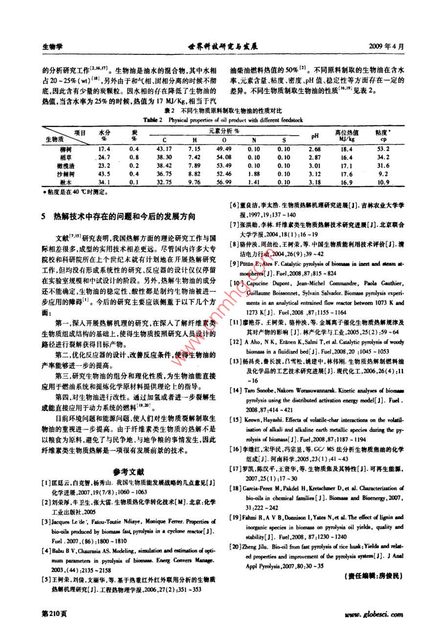 第31謄第2期世界科技研憲與發(fā)展Vol. 31No.22009年4月208 -210頁(yè)WORLD SCI-TECH R&DApr. 2009 pp. 208 -210纖維素類(lèi)生物質(zhì)熱解研究進(jìn)展王通洲高虹(沈陽(yáng)理工大學(xué)環(huán)境與化學(xué)工程學(xué)院,沈陽(yáng)理工大學(xué)新型能源技術(shù)開(kāi)發(fā)中心,沈陽(yáng)110168)摘要:從熱解的機(jī)理、工藝 、反應(yīng)器等方面綜述了國(guó)內(nèi)外對(duì)纖雛素類(lèi)生物質(zhì)越解研究的現(xiàn)狀,討論了生物質(zhì)熱解產(chǎn)物的組成及其理化特性,重點(diǎn)介紹了然解制備生物油技術(shù)。生物油既可以作為燃料油直接燃燒又可以進(jìn)一步通過(guò)加氫或者裂解制備其它精細(xì)化學(xué)品,還可以從中提取有用的化學(xué)原材料。因此,纖維素類(lèi)生物質(zhì)熱解制取生物油技術(shù)被看作是最有發(fā)展前景的生物質(zhì)利用技關(guān)鍵詞:纖維素類(lèi)生物質(zhì);熱解;生物油中國(guó)分類(lèi)號(hào):Q65文獻(xiàn)標(biāo)識(shí)碼:AResearch Progress in Cellulosic Biomass PyrolysisWANG Tonghou GAO Hong(Scbool of Eovironmental and Chemical Engineering, Reseurch & Center Developroent d New EoergyTchnology ,Shenyang Ligong Univerity ,Shemyung 110168)Abstrec:This peper inoduced the rearch progress of euleie biomnses prolyeis from the mechanism, the proges in the word and thereactor of biomass pyrolysis. The composition , physical and chemical characteristic of the pyrolyeis product are discused bere. This paper alsofocused on pyrolysis techology which uwsed to produce bio-oil. The bio-oil is not only used酗fuel oil but also can be used 1o produce otherchemical productions by bydrogenation or cmacking. So the ellulosic biomas prolyie technology is the one that has the moot devedopingprospect,Key wordselluloic biomss pylyis;iooil解:半纖維素在225 ~350 C分解、纖維素在325 -375 C分1引言解.木質(zhì)素在250 ~500 C進(jìn)行分解”。通過(guò)熱重分析表明,生物質(zhì)是地球上廣泛存在的可再生資源之一。纖維素生物質(zhì)在熱解的初始階段( 100 C左右)有輕微失重,這和通類(lèi)生物質(zhì)是植物通過(guò)光合作用將空氣中的二氧化碳和水轉(zhuǎn)過(guò)工業(yè)分析所得生物質(zhì)的水分含量能夠吻合。Babu BV!°等化成的有機(jī)質(zhì)。由于其具有產(chǎn)量巨大、可再生性、能進(jìn)行碳人認(rèn)為生物質(zhì)熱解經(jīng)過(guò)五步完成:第-步,來(lái)自加熱源的熱循環(huán)、可液化獲得液體燃料.可熱解獲得多種高附加值的化量預(yù)熱反應(yīng)器內(nèi)部生物質(zhì);第二步,溫度繼續(xù)升高,生物質(zhì)中學(xué)產(chǎn)品和生物油等優(yōu)點(diǎn)而成為國(guó)內(nèi)外研究人員的研究熱的揮發(fā)成份釋放、焦油形成;第三步,熱量在熱的揮發(fā)成份和點(diǎn)。冷卻器之間進(jìn)行傳導(dǎo),沒(méi)有裂解的生物質(zhì)隨揮發(fā)成份流出;纖維素類(lèi)生物質(zhì)主要指植物的秸稈,如樹(shù)木、農(nóng)作物秸第四步,揮發(fā)成份冷凝形成生物油,沒(méi)有來(lái)得及冷凝的部分稈、草類(lèi)以及工農(nóng)業(yè)產(chǎn)品的廢料甘蔗渣、橄欖瀆等,其主要成隨不可冷凝氣體排出;第五步,由于交互式的自催化作用生分是纖維素、半纖維素、木質(zhì)素。目前對(duì)于纖維素類(lèi)生物質(zhì)物油在反應(yīng)器內(nèi)發(fā)生二次裂解。浙江大學(xué)王樹(shù)榮,等通過(guò)的處理方法主要有生物轉(zhuǎn)換法.物理轉(zhuǎn)換法、熱化學(xué)轉(zhuǎn)換法,在線紅外分析認(rèn)為裂解初期產(chǎn)物主要為酸類(lèi)、醇類(lèi)、酮類(lèi)醛其中熱化學(xué)轉(zhuǎn)換包括直接燃燒、氣化.熱解。直接燃燒儀能類(lèi)、酯類(lèi)水分和小分子氣體等,隨后大分子物質(zhì)又二次降解獲得生物質(zhì)總能量的10 - 20% ,采用新型設(shè)計(jì)的省柴灶能提為一氧化碳為主的氣體產(chǎn)物。Anta'2! 等人認(rèn)為纖維素在裂高到40- 45%: ,目前主要在農(nóng)村被使用以及用于直燃發(fā)解初期先經(jīng)過(guò)脫水作用形成脫水纖維素,脫水纖維素進(jìn)一步電。氣化可以獲得甲烷,一氧化碳、氫氣以及小分子氣態(tài)烴,分解產(chǎn)生大多數(shù)的炭和一些揮發(fā)物。但在相對(duì)稍高溫度下,既可以直接燃燒提供熱量又可以做為原料合成甲醇等燃料。脫水纖維隸解聚會(huì)產(chǎn)生左旋葡萄糖焦油的反應(yīng)和其競(jìng)爭(zhēng)。熱解是在隔絕或少量供給氧氣的條件下,加熱生物質(zhì)分解獲閃速熱解由于采用高升溫速率,高反應(yīng)溫度短的停留時(shí)間得炭、液體油、氣體的過(guò)程。熱解產(chǎn)物炭可以做為生產(chǎn)活性使纖維素完全轉(zhuǎn)化為生物油和裂解氣,慢速裂解則由于較長(zhǎng)炭的原材料;液體生物油含有多種化工行業(yè)所必須的原材料的停留時(shí)間使得左旋葡萄糖主要轉(zhuǎn)化為炭’6。以及高附加值的產(chǎn)品并改性后直接用于透平機(jī);氣體可以合目前國(guó)內(nèi)外對(duì)生物質(zhì)熱解機(jī)理的研究都側(cè)重于采用熱成甲醇等燃料)]。通過(guò)熱解可以將低能量密度的生物質(zhì)轉(zhuǎn)分析或者熱分析紅外聯(lián)用技術(shù)在線分析不同溫度下裂解產(chǎn)化為高能量密度的氣液固產(chǎn)品,便于儲(chǔ)存運(yùn)輸。此外采用物,但沒(méi)有深人研究纖維素.半纖維素、木質(zhì)素的結(jié)構(gòu)并從理纖維索類(lèi)生物質(zhì)做為熱解原料不