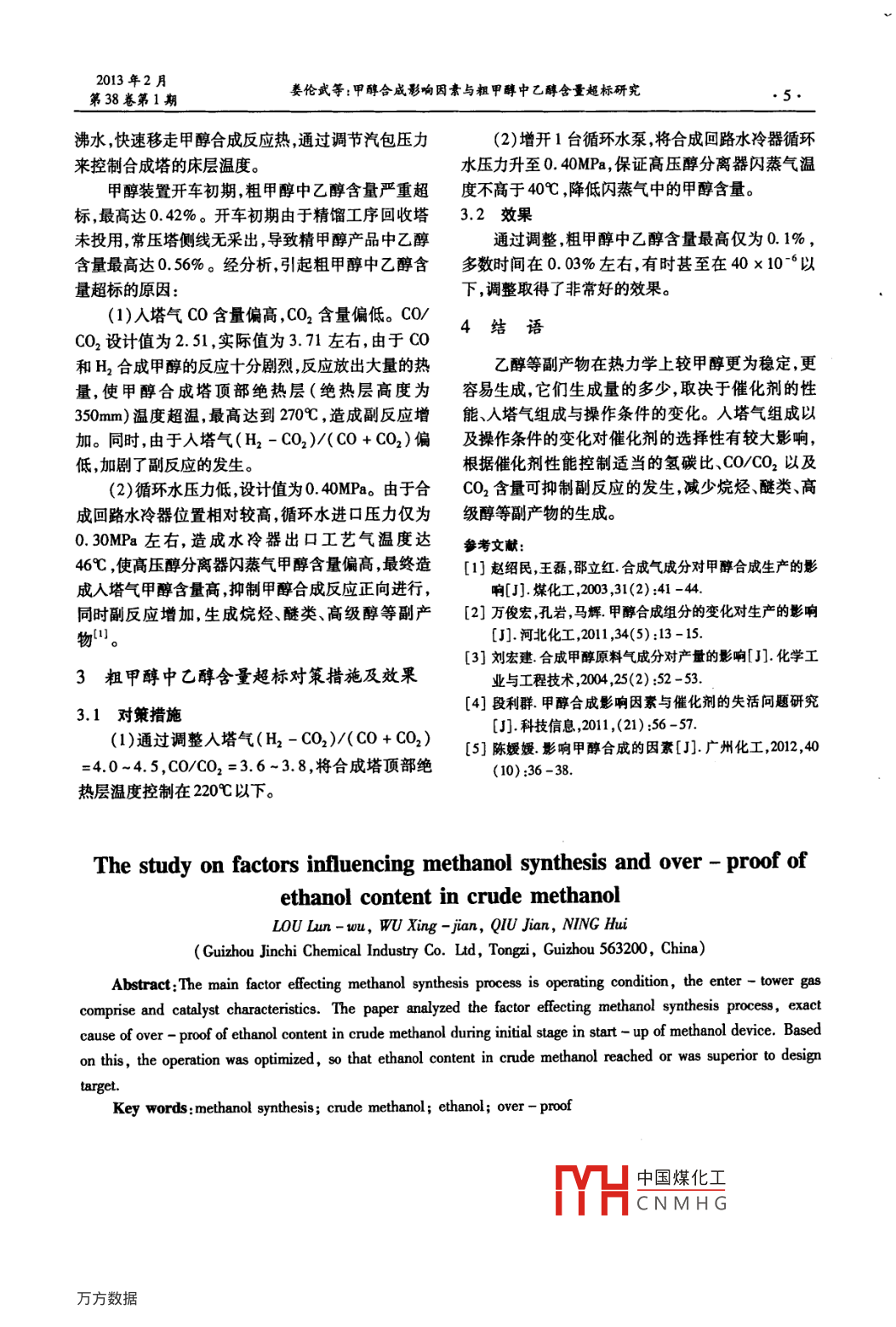 甲醇合成影響因素與粗甲醇中乙醇含量超標(biāo)研究