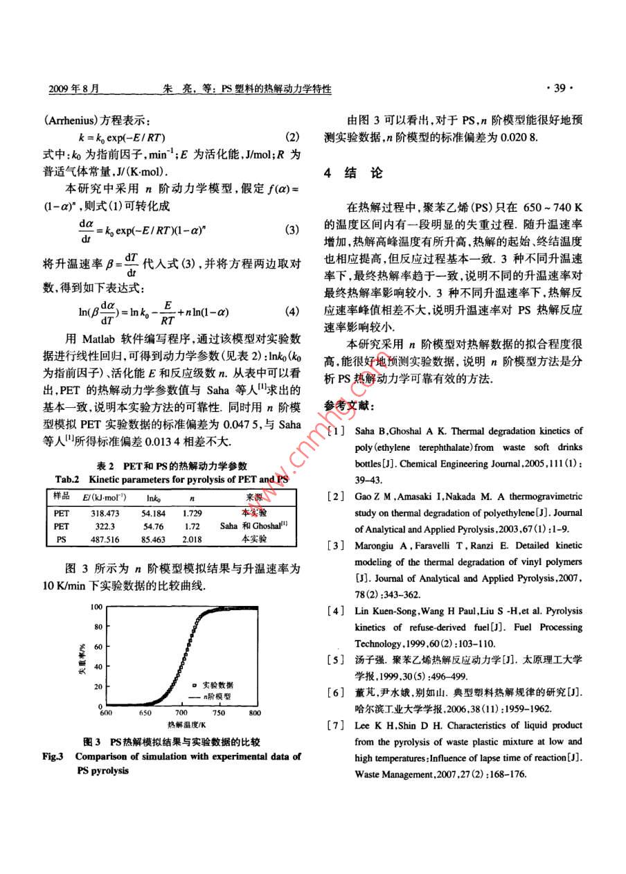 第24卷第4期天津科技大學(xué)學(xué)報(bào)Vol 24 No, 42009年8月Journal of Tianjin University of Science TechnologyAug.2009PS塑料的熱解動力學(xué)特性朱亮1,劉鳳花1,李占勇,王昶(1.天津科技大學(xué)機(jī)械工程學(xué)院,天津300222;2.天津科技大學(xué)海洋科學(xué)與工程學(xué)院,天津300457)摘要:通過熱重法對聚苯乙烯(PS)進(jìn)行熱分析,得到在氪氣環(huán)境,熱解溫度為303~1073K,3種不同升溫速率下PS的熱解實(shí)驗(yàn)數(shù)搢.對實(shí)驗(yàn)教據(jù)用n階模型進(jìn)行模擬,得出熱解動力學(xué)參數(shù)lnk、活化能E和反應(yīng)級數(shù)n.結(jié)果表明,PS在熱解過程中只有一段明顯的失重過程,升溫速率對熱解率影響較小,π階模型能很好地預(yù)測熱解實(shí)驗(yàn)數(shù)據(jù)關(guān)鍵詞:聚苯乙烯;熱解;動力學(xué);熱重法中圖分類號:TQ325文獻(xiàn)標(biāo)志碼:A文章編號:16726510(2009)040037-03Pyrolysis Kinetics of Waste PolystyreneZHU Liang, LIU Feng-hua, LI Zhan-yong, WANG Chang2. College of Marine Science and Engineering, Tianjin University of Science Technology, Tianjin 300457, ChinaAbstract: Polystyrene(PS)was chosen to study the thermal degradation kinetics by the thermogravimetric analysisThermal degradation was carried out at three different heating rates while the activation temperature was changed in therange of 303-1073 K. The kinetic parameters Inko activation energy E and reaction order n of pyrolysis were determinedwith the nth order model. The simulated results show that there is only one obvious weight loss process during the pyrolysisof PS and the heating rate had little influence on its conversion. Consequently, the nth order model is a suitable model thatpredicts the experimental data very well.Keywords: polystyrene; Pyrolysis: kinetics: thermogravimetry近年來,國內(nèi)外學(xué)者十分關(guān)注廢棄塑料的熱解研乙烯,聚苯乙烯和聚氯乙烯)進(jìn)行分析,求出了RDF究.通過這些研究,可以得到塑料的反應(yīng)速率和反應(yīng)整體的熱解反應(yīng)動力學(xué)參數(shù)湯子強(qiáng)用熱重法對聚參數(shù),預(yù)測所得產(chǎn)品的分布,這些信息對合理選擇反苯乙烯的熱解反應(yīng)進(jìn)行了研究,計(jì)算了不同升溫速率應(yīng)器、優(yōu)化反應(yīng)器的設(shè)計(jì)和操作是非常重要的.Saha下的表觀反應(yīng)活化能和反應(yīng)速度常數(shù),表明聚苯乙烯和 Ghoshal對可口可樂和百事可樂飲料瓶(主要成裂解是一個容易進(jìn)行且速度很快的反應(yīng),且反應(yīng)是近分均為PET)進(jìn)行了熱解動力學(xué)分析,并分別用n階似一級的.董芃等對5種典型的單組分塑料即高密模型和 ASTM E698模型求解出動力學(xué)參數(shù).高致明度聚乙烯、低密度聚乙烯、聚丙烯、聚苯乙烯和聚氯乙等通過熱重法對高密度聚乙烯進(jìn)行熱解研究,并在稀進(jìn)行了系統(tǒng)的熱分析,得到了5種塑料在不同升溫等溫和動態(tài)降解兩種條件下得出相同的反應(yīng)級數(shù)速率條件下的熱解規(guī)律和熱解反應(yīng)動力學(xué)參數(shù)(反應(yīng)(n=05. Marong等從反應(yīng)機(jī)理上對乙烯基聚合級數(shù)為一級).但國內(nèi)外塑料熱解研究利用不同的熱體(包括聚苯乙烯,聚丙烯和聚乙烯)進(jìn)行了熱解動力解模型計(jì)算,結(jié)果有一定差異,得出的熱解動力學(xué)參學(xué)模型分析.Lin等研究了城市固體廢棄物中垃圾數(shù)與實(shí)驗(yàn)結(jié)果的擬合程度不一衍生燃料(RDF)的熱解動力學(xué),并用加權(quán)的方法對現(xiàn)有的廢棄塑料主要包括聚酯(PET)、聚乙烯RDF中的關(guān)鍵組分(紙屑,低密度聚乙烯,高密度聚(PE)、聚丙烯(PP)、聚苯乙烯(PS)和聚氯乙烯收稿日期:200901-16;修回日期:20090415基金項(xiàng)目:天津市應(yīng)用基礎(chǔ)研究計(jì)劃面上項(xiàng)目(o5YFMC02700)作者簡介:朱亮(1985-),男,江西人,碩土研究生;通信作者:李占勇,教授,yli@ Isteden天津科披大學(xué)學(xué)報(bào)第24卷第4期(PVC),它們的總量占到廢棄塑料的70%以上m.由表1PS在3種升溫速率下熱解特征參數(shù)于這些塑料難以降解,導(dǎo)致了嚴(yán)重的生態(tài)問題.本文Tab1 Pyrolysis characteristic parameters of Ps during the主要研究了PS的熱解反應(yīng)動力學(xué),用n階模型進(jìn)行pyrolysis at three different heating rates模擬并求出熱解動力學(xué)參數(shù),并驗(yàn)證了n階模型模擬升溫速率/(Kmin)TⅨK/K7/K結(jié)果與實(shí)驗(yàn)結(jié)果的擬合程度106917251材料與方法圖2為PS在3種升溫速率下熱解反應(yīng)速率隨溫度的變化曲線(即失重變化率隨溫度變化曲線)實(shí)驗(yàn)原料為PS,取自一次性快餐盒.此外,為了驗(yàn)證本實(shí)驗(yàn)操作的可靠性,以PET(取自可口可樂飲料瓶)為原料,研究其熱解動力學(xué)參數(shù),并與Saha等10K/min一15K/min人所得數(shù)據(jù)進(jìn)行對比熱分析采用美國TA公司的Q50TGA熱分析儀,通入流量為40-60 mL/min的氮?dú)庾鳛楸Wo(hù)氣,使試樣在惰性氣體氛圍下發(fā)生熱解.熱解的溫度范圍均為303-1073K,升溫速率分別采用5、10、15K/min.取樣質(zhì)量PS為6mg,PET為20mg圖2PS在3種升溫速率下熱解反應(yīng)速率隨溫度的變化曲線Fig2 Variation of reaction rate with2熱解特性分析the pyrolysis of PSPS在整個熱解過程中都只有一個熱解高峰,發(fā)在3種不同升溫速率下得到的PS的熱重曲線如生在650~740K區(qū)間內(nèi)在這個范圍內(nèi)樣品的失重圖1所示率達(dá)到70%~80%.對PS的熱解過程分析認(rèn)為:熱解產(c