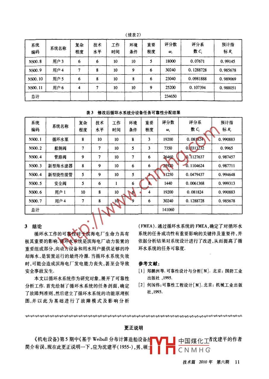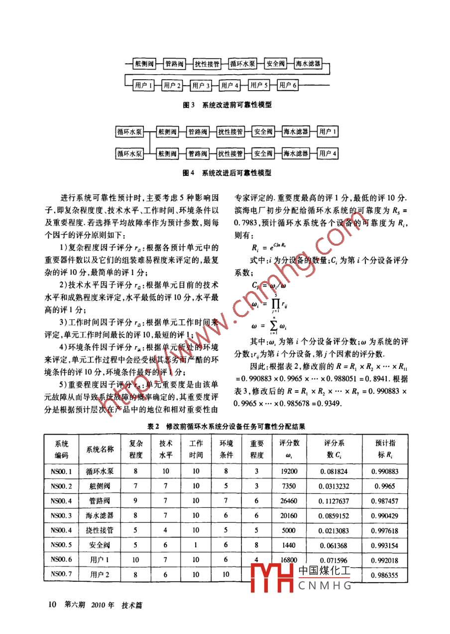 濱海電廠循環(huán)水系統(tǒng)可靠性設(shè)計與分析柳志忠,鄭中”, 尤小健2(1.海軍駐葫蘆島四三一廠軍事代表室,葫蘆島215000; 2.武漢第二船舶設(shè)計研究所,武漢430064)摘要:循環(huán)水系統(tǒng)是濱海電廠動力裝置最重要的系統(tǒng)之--,主要負責將冷卻海水提供給眾多用戶.該系統(tǒng)與舷外海水直接連通,承受著等同于舷外海水的壓力,該系統(tǒng)的安全可靠運行是保證電廠運行的必要條件之一.針對循環(huán)水系統(tǒng)的特點,分析了任務(wù)剖面,列舉其可能發(fā)生的故障模式,分析其故障原因及對任務(wù)造成的影響,給出相應(yīng)的補償措施,并將分析結(jié)果反饋到系統(tǒng)設(shè)計中;建立模型并采用定量計算對改進的系統(tǒng)進行可靠性預(yù)計.結(jié)果表明,對系統(tǒng)的改進合理有效,其可靠性有一定的提高.關(guān)鍵詞:循環(huán)水系統(tǒng);可靠性; FMEA分析;改進設(shè)計中圖分類號:TM62文獻標識碼:A文章編號:1005 8354( 2010 )06-0007-05Reliable Design and Analysis on Circulating Water System ofBinhai Power PlantLIU Zhi-zhong',ZHENG Zhong2 , YOU Xiao jian2(1. Representative Ofice at No. 431 plant, Huludao 215000, China; 2. Wuhan Second Ship Design and Research Insti-ute, Wuhan 430064, China)Abstract:Circulating water system is one of the most important systems of Haibin Pover Plant , and suppliescooling seawvater for muli-user. Being that circulating 1oater system is connected with external seawater and hasthe same external seawater pressure value , the safe and reliable operation of circulating water system is one ofthe necessary conditions for Power Plant operation. By analyzing the missin section, failure modes and rea-son, and the failure ingluence of circulating water system , the corresponding preventing measures and remediesare given and the above whole analytical results are also applied to the system design. The reliability predictionof the improved circulating water system has been done by modeling and quantitatiue calculation, and the re-sults show that the improrement measures is effective, and the reliability is improved.Key words :circulating water system; reliability; FMEA analysis ; iproved design0引言水泵、管件、閥門、減振接管、濾器、儀表等組成.循環(huán)水系統(tǒng)是濱海電廠動力裝置最重要的系統(tǒng)之一,擔負著將海水冷卻水提供給眾多用戶的重任,1系統(tǒng)任務(wù)剖面該系統(tǒng)與舷外海水直接連通,承受著等同于舷外海水循環(huán)水系統(tǒng)作為動力裝置的冷卻水供應(yīng)系統(tǒng),在的壓力.循環(huán)水系統(tǒng)共有2條獨立的管路系統(tǒng),每條濱海電廠運行前必須先行投入工作,并在整個任務(wù)過管路配置!臺循環(huán)水泵,舷外海水通過吸人格柵、舷程連續(xù)不間斷運行,循環(huán)水系統(tǒng)的任務(wù)剖面如圖1所間管、舷側(cè)閥、管路閥和海水濾器被循環(huán)水泵吸入,經(jīng)示.其中,參數(shù)t代表不同任務(wù)的任務(wù)時間.過加壓后送到各設(shè)備用水處.循環(huán)水系統(tǒng)主要由循環(huán)收稿日期:2010903中國煤化工作者簡介:柳志忠(1967-) ,男,本科,主要從事造船檢驗.MHCNMHG技術(shù)篇2010年第六期7↑e流量(I/b)于系統(tǒng)自身原因或其他外部原因引起的所有導(dǎo)致循循環(huán)水系統(tǒng)啟動循環(huán)水系統(tǒng)停運環(huán)水無法供給的故障.2系統(tǒng)FMEA分析循環(huán)水系統(tǒng)正常運行對循環(huán)水系統(tǒng)進行FMEA分析,系統(tǒng)的識別并防止故障,對該系統(tǒng)可能的故障進行全面預(yù)防.系統(tǒng)采用硬件法進行FMEA分析.循環(huán)水系統(tǒng)約初始約定層1時間h)次為濱海電廠動力系統(tǒng);約定層次為循環(huán)水系統(tǒng);最圖1循環(huán)水系統(tǒng)任務(wù)剖面終約定層次為循環(huán)水泵、舷側(cè)閥管路閥、減振元件、.濾器等管路及附件.假設(shè)與循環(huán)水系統(tǒng)相關(guān)的電力系在任務(wù)剖面中,循環(huán)水系統(tǒng)啟動和停運時其流量統(tǒng)、液壓系統(tǒng)控制系統(tǒng)認為可靠,且分析的各種故障變化并不是簡單的線性變化,在這里只是描述循環(huán)水模式是相互獨立的.流量的變化趨勢;另外,正常運行時的循環(huán)水流量是2.1系統(tǒng)原理 .隨著濱海電廠運行工況變化而改變的,所以也并不是循環(huán)水系統(tǒng)分兩條獨立支路每條支路從舷外取圖中所示的恒定流量值.水,然后經(jīng)過舷側(cè)閥、管路閥、撓性接管、循環(huán)水泵、用致命性故障判別準則:在一次典型任務(wù)期間,由戶、管路閥舷側(cè)閥排至舷外.C用戶1h一舷側(cè)闊管路閥}擾性接管-循環(huán)水泵一擾性接管H用戶2十管路闕一炫側(cè)閥一用戶門d[用戶4h一舷側(cè)閥一臂路閥一擾性接管-循環(huán)水泵擾性接管}十用戶5 ]十管路閥一舷側(cè)閥卜4用戶6]圖2循環(huán)水系統(tǒng)原理圖2.2系統(tǒng) FMEA分析及改進措施了系統(tǒng)的泄漏率和可靠性;依據(jù)系統(tǒng)功能確定各種故障模式所產(chǎn)生的影響,4)采用了新型的撓性接管,抗軸向變形和剪切變包括局部的影響、對高一層次影響以及最終產(chǎn)生的影形能力更好;響.局部影響是對所在約定層次部件功能和狀態(tài)的影5)改變舷側(cè)閥形式,提高可靠性;響;高一層次影響是指部件故障模式對系統(tǒng)功能和狀6)增加系統(tǒng)橋管,并將用戶2.3、5.6用另一系統(tǒng)態(tài)的影響;最終影響指故障模式對濱海電廠動力裝置供水,提高循環(huán)