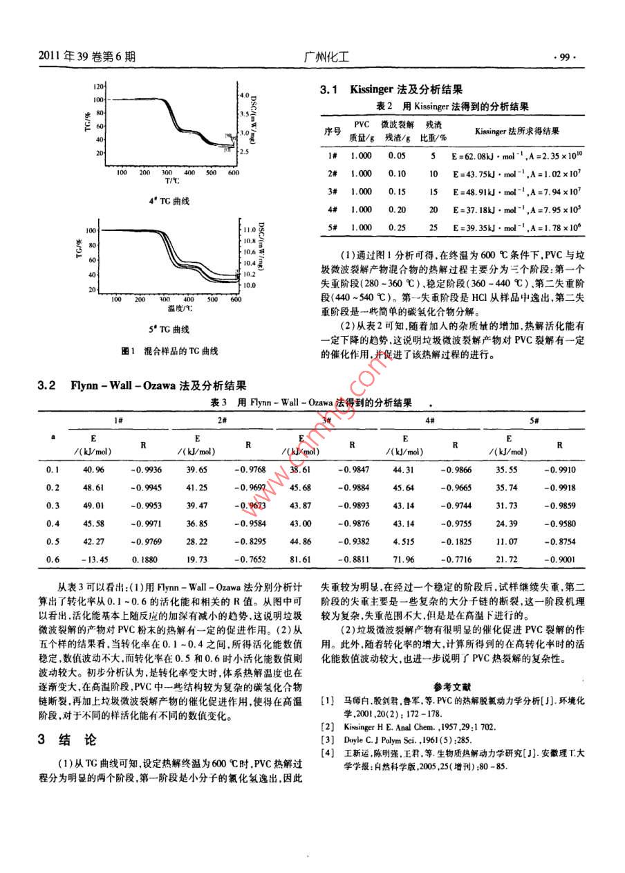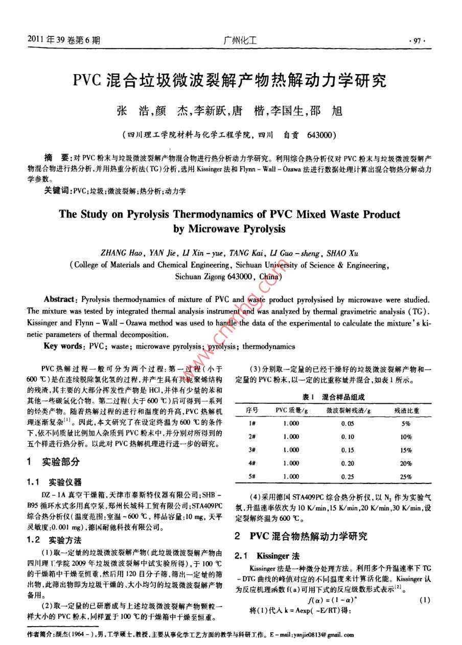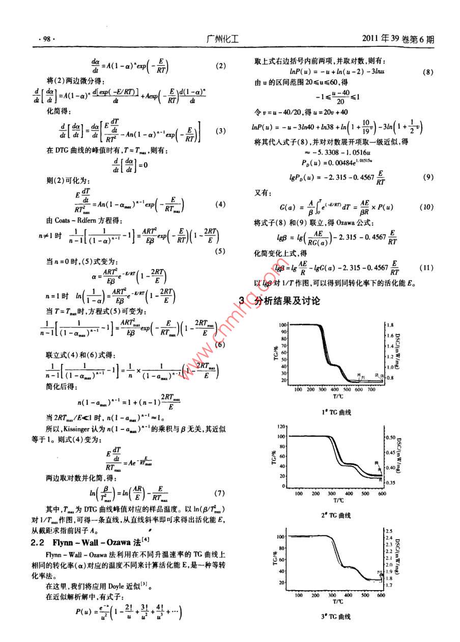 2011年39卷第6期廣州化工.97.PVC混合垃圾微波裂解產(chǎn)物熱解動力學研究張浩,顏杰,李新躍,唐楷,李國生,邵旭(四川理工學院材料與化學工程學院,四川自貢 643000)摘要:對PVC粉末與垃圾微波裂解產(chǎn)物混合物進行熱分析動力學研究。利用綜合熱分析儀對PVC粉末與垃圾微波裂解產(chǎn)物混合物進行熱分析,并用熱重分析法( TC)分析,選用Kssinger法和Flyn - Wall - Ozawa法進行數(shù)據(jù)處理計算出混合物熱分解動力學參數(shù)。關(guān)鍵詞:PVC;垃圾;微波裂解;熱分析;動力學The Study on Pyrolysis Thermodynamics of PVC Mixed Waste Productby Microwave PyrolysisZHANG Hao, YAN jie, LI Xin -yue, TANG Kai, U Guo - sheng, SHAO Xu(College of Materials and Chemical Engineering, Sichuan University of Science & Engineering,Sichuan Zigong 643000, China)Abstract: Pyrolysis thermodynamics of mixture of PVC and waste product pyrolysised by microwave were studied.The mixture was tested by integrated thermal analysis instrument and was analyzed by thermal gravimetric analysis (TG).Kissinger and Flynn - Wall - Ozawa method was used to handle the data of the experimental to calculate the mixture' s ki-netic parameters of thermal decompostion.Key words: PVC; waste; microwave pyrolysis; pyrolysis ; thermodynamicsPVC熱解過程一般可分為兩個過程:第一過程(小于(3)分別取-定量的已經(jīng)干燥好的垃圾微波裂解產(chǎn)物和一600 C)是在連續(xù)脫除氯化氫的過程.并產(chǎn)生具有共軛聚烯結(jié)構(gòu)定量的 PVC粉末,以一定的比重稱址并混合,如表1所示。的殘渣,其主要的大部分揮發(fā)性產(chǎn)物是HCI,并伴有少量的苯和表1混合樣品組成其他一些碳氫化合物。第二過程(大于600 C)后可得到一系列的烴類產(chǎn)物。隨著熱解過程的進行和溫度的升高,PVC熱解機序號PVC質(zhì)最/g ;微波裂解殘渣/g殘渣比重理逐漸復雜"。因此,本文研究了在設(shè)定終溫為600 C的條件#1.0000.055%下,依不同質(zhì)敗比例加入雜質(zhì)到PVC粉末中.并分別對所得到的2#0.1010%五個樣進行熱分析。以此對PVC熱解機理進行進一步的研究。3#0.151591實驗部分4#0.202090.2525%1.1實驗儀器DZ-1A真空千燥箱,天津市泰斯特儀器有限公司;SHB-(4)采用德國STA409PC綜合熱分析儀,以N,作為實驗氣B95循環(huán)水式多用真空泵鄭州長城科工貿(mào)有限公司:STA409PC氛,升溫速率依次為10 K/min,15 K/min ,20 K/min ,30 K/min,設(shè)綜合熱分析儀(溫度范圍:室溫-600 C,樣品容量:10 mg,天平定裂解終溫為600 C。靈敏度:0.001 mg) ,德國耐馳科技有限公司。1.2 實驗方法2 PVC 混合物熱解動力學研究(1)取一定量的垃圾微波裂解產(chǎn)物(此垃圾微波裂解產(chǎn)物由2.1 Kissinger 法四川理T.學院2009年垃圾微波裂解中試實驗所得),于100 CKissinger法是一-種微分處理方法。利用多個升溫速率下TG的干燥箱中干燥至恒重然后用120目分子篩.篩出--定量的篩- DTG曲線的峰值對應的不同溫度來計算活化能。Kissinger 認出物,此篩出物即為垃圾干燥的、大小均勻的垃圾微波裂解產(chǎn)物為反應機理兩數(shù)f(a)可用下式的反應級數(shù)形式表示2]。備用。f(a)=(1-a)"(1)(2)取-定量的已研磨成與上述垃圾微波裂解產(chǎn)物顆粒一將(1)代人k=Aexp( -E/RT)得:樣大小的PVC粉末,同樣置于100 C的干燥箱中f燥至恒重。作者簡介:顧杰(1964- ),男,工學碩士.教授,主要從事化學工藝方面的教學與科研工作。Emil:yanji0813@ grail. com. 98.廣州化工2011年39卷第6期出=(1-a)'e(一最)(2)取上式右邊括號內(nèi)前兩項,并取對數(shù),則有:InP(u)= -u+ln(u-2) - 3lnu將(2)兩邊微分得:由u的區(qū)間范圍20≤u≤60,得-1≤4-40≤化簡得:令v=u-40/20,得u=20v +40[出]=出日五b(u-=-1040+h38+1(1+號)31(1+司)將其代人式子(8) ,并對對數(shù)展開項取一-級近似,得在DTC曲線的峰值時有,T=T. .則有:=-5. 3308 -1.0516u[出]=0Po(u) =0. 0484e015則(2)可化為:lgPo(u)= -2.315-0.467上(9)E又有:RT=m(-m"( )(4)C(a) =foomdr=能xP(u)10)= βF由Coats - Rdiem方程得:將式子(8)和(9)聯(lián)立,得Ozawa公式:n≠1時lkβ=lg( RAE)-2.315 -0.4567(5)化簡變化上式,得當n=0時,(5)式變?yōu)? .48=g -gG(a) -2.315 -0.4567品(11)a= E0(1管)ART以lepB對I/T作圖,可以得到同轉(zhuǎn)化率下的活化能E。n=1時(=)-=-(1-2號)3分析結(jié)果及討論當7下=7_時,方程式(5)可變?yōu)?10-1.8一*p(0)(--E-)(6)14號聯(lián)立式(4)和(6)式得:1.2號-=+-(122=)20簡化后得:100 200300400500 600 700T/1' TC曲線當2R./E<1時, n(1-am)*-'=1。所以,isinger認為n(1 -a.. )”-的乘積與β無關(guān),其近似120等于1。則式(4)變?yōu)?00.0.50口800.45號g 00兩邊取對數(shù)并化簡,得叫懸)=叫(管)點(7)100200300400500 600其中,為DTC曲線峰值對應的樣品溫度。以ln(β/7)2" TC曲線對17..作圖,可得一條直線.從直線斜率即可求得出活化能E,從截距求指前因子A。002.2 Flynn - Wall - Ozawa法[4]Flynn - wall - Ozawa法利用在不同升溫速率的TG曲線上2.1言臺601相同的轉(zhuǎn)化率( a)對應的溫度不同來計算活化能E,是一種等轉(zhuǎn)401.9號化率法。在這里,我們將應用Doyle近似!”。在近似解析解中,有式子:100200300400S00600T/CP()=S(1-44+告+-)3° TG曲線2011年39卷第6期廣州化工●99●2023.1 Kissinger 法及分析結(jié)果0.表2用Kissinger 法得到的分析結(jié)果e 600PVC微波裂解 殘請40號質(zhì)量/g殘渣/g比重/%Kisinger 法所求得結(jié)果20251# 1.000 0.055 E=62.08kJ . mol-' .A=2.35 x1010100~ 2000 So0 6002# 1.000 0.100 E=43.75kJ.mol-1 ,A=1.02 x10'T/t;3# 1.000 0.15I5 E=48.91kJ . mol-' ,A=7.94 x10’4" TC曲線4# 1.000 0.2020 E=37. 18J●mol-' ,A=7.95x I000{11.0勇# 1.000 0.255 E=39.35KJ●mol-',A=1.78x 10°t 10.M三8010
