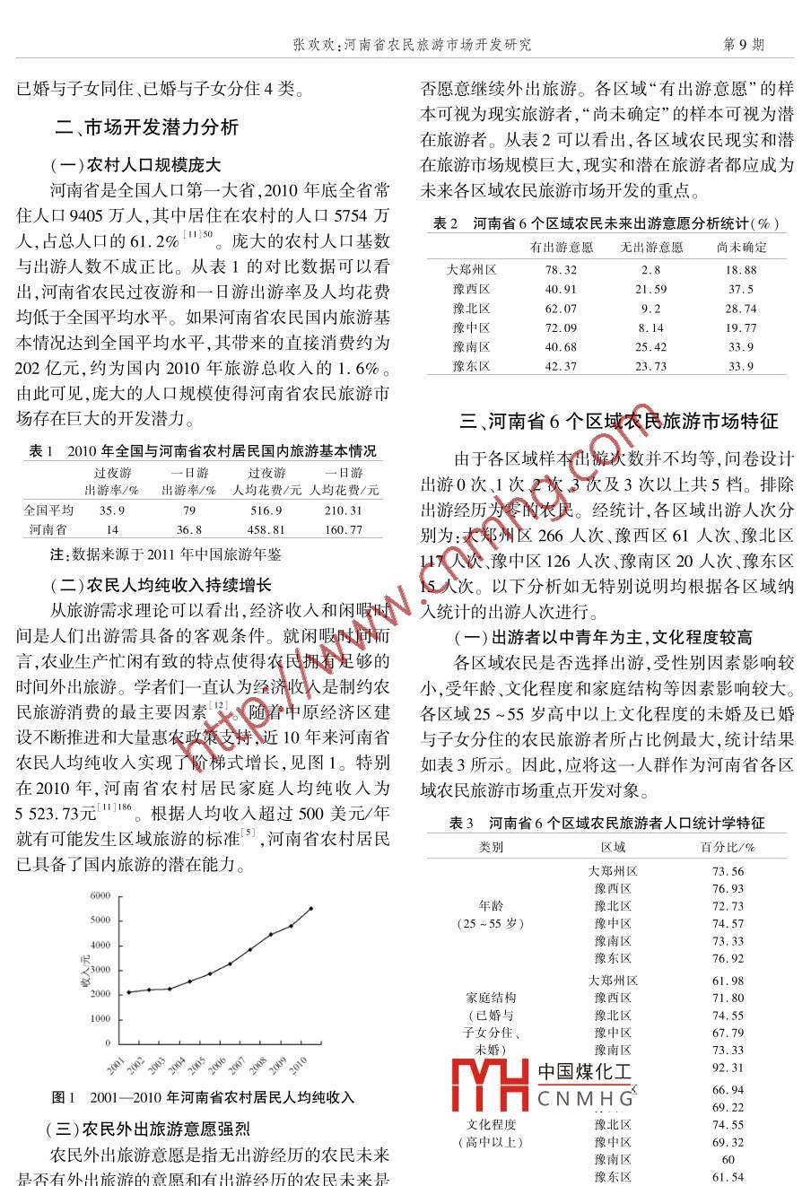 第9期河南科技學院學報2014年9月No. 9Jourmal of Henan Institute of Science and TechnologySep. 2014doi : 10.3969/j. issn. 1673 - 6060.2014. 09.005河南省農(nóng)民旅游市場開發(fā)研究張歡歡(信陽農(nóng)林學院食品科學系,河南信陽464000)摘要:開發(fā)農(nóng)民旅游 市場是實現(xiàn)國民旅游休閑發(fā)展目標的重中之重。以地域經(jīng)濟發(fā)展水平為特征,將河南省劃.分為大鄭州區(qū)、豫西區(qū)、豫北區(qū)、豫中區(qū)、豫南區(qū)和豫東區(qū)6個區(qū)域,采用問卷調(diào)查法,對各區(qū)農(nóng)民的旅游行為特征.進行調(diào)查分析。結(jié)果表明:河南省農(nóng)民旅游市場存在巨大的開發(fā)潛力,但又呈現(xiàn)出大鄭州區(qū)一豫北區(qū)、豫中區(qū)- -豫西區(qū)、豫南區(qū)、豫東區(qū)依次遞減階梯型發(fā)展模式,應從“旅游下鄉(xiāng)”產(chǎn)品服務體系和優(yōu)惠政策三個方面著手實施階梯式開發(fā)戰(zhàn)略。關(guān)鍵詞:國民旅游;農(nóng)村居民;旅游市場;階梯式開發(fā)中圖分類號:F592文獻標志碼:A .文章編號: 1673 - 6060(2014)09 -0018-052013年2月18日,國務院辦公廳正式發(fā)布《國市場開發(fā)還是旅游消費,學者- -般都把研究對象直民旅游休閑綱要(2013- 2020)》, 提出國民旅游休接定位于全國或全省,進行共性抽象,尋找一般規(guī)閑發(fā)展目標:到2020年,職工帶薪年休假制度基本律10],忽略了農(nóng)村發(fā)展的非均衡性而帶來的旅游市得到落實,城鄉(xiāng)居民旅游消費水平大幅度增長,國民場發(fā)展的非均衡性特點。以經(jīng)濟地域發(fā)展水平為特旅游休閑質(zhì)量顯著提高,與小康社會相適應的現(xiàn)代征將河南省劃分為大鄭州區(qū)、豫西區(qū)、豫北區(qū)、豫中國民旅游休閑體系基本建成"。要實現(xiàn)這一-目標,區(qū)、豫南區(qū)和豫東區(qū)6個區(qū)域作為研究對象,采用問必須關(guān)注農(nóng)村,只有使占總?cè)丝?8. 73%的農(nóng)民參卷調(diào)查法,對各區(qū)農(nóng)民的旅游行為特征進行調(diào)查分與旅游休閑活動,才有可能實現(xiàn)全面小康,建成真正析,并針對不同區(qū)域提出開發(fā)戰(zhàn)略。的國民旅游休閑體系。然而,目前中國旅游市場的-、河南省農(nóng)民旅游市場基本情況主體還是城市居民,是城里人下鄉(xiāng)或城里人流的互動。農(nóng)村還只是一個供給市場,相對較低的消費水將河南省所轄17個省轄市和1個省直管市以.平,使農(nóng)民旅游并不被旅游市場所看好,其市場供給地域經(jīng)濟發(fā)展水平為特征劃分為大鄭州區(qū)(包括鄭嚴重不足,農(nóng)民旅游發(fā)展極其緩慢口。20世紀80州、新鄉(xiāng)、開封焦作、濟源)、豫西區(qū)(包括洛陽、三年代初,范家駒和何行烈對上海地區(qū)的農(nóng)民旅游特門峽、南陽)、豫北區(qū)(包括安陽濮陽、鶴璧)、豫中征進行概括,并提出上海已出現(xiàn)農(nóng)民旅游熱區(qū)(包括漯河、許昌、平頂山)、豫南區(qū)(包括信陽、駐由此,農(nóng)民旅游作為專門的研究對象進人學界視野。馬店)和豫東區(qū)(包括商丘、周口)6個區(qū)域,從6個學者的研究多集中于市場開發(fā)和旅游消費等。如王區(qū)域所含18地市中各選取1個較大規(guī)模行政村進坤欣'5].梁留科[°]、王瑩(”1等從市場開發(fā)角度對農(nóng).行成比例抽樣調(diào)查。樣本為縣以下(不包含縣城所民旅游的市場特征、潛力、開發(fā)現(xiàn)狀、存在問題及開在地)的農(nóng)村居民。樣本的年齡分為17~25歲、25發(fā)策略等做了相關(guān)研究;魏正環(huán)[8]、趙慧!°)等從旅游~35歲、35~45歲、45~55歲、55歲以上5檔。樣消費角度,對農(nóng)民旅游需求現(xiàn)狀、消費水平、消費結(jié)本的中國煤化工高中、大專、本科及以構(gòu)、消費環(huán)境和影響因素做了相關(guān)研究。無論探討上5活未婚.新婚夫妻二人、THCNMHG'收稿日期:2014-01-13.基金項目:河南省教育廳人文社會科學青年項目“國民旅游背景下的河南省農(nóng)民旅游市場開發(fā)研究”(2011 - QN -072)作者簡介:張歡歡(1983--),女,河南濟源人,講師,碩士,主要從事旅游資源與旅游市場開發(fā)研究。張歡歡:河南省農(nóng)民旅游市場開發(fā)研究第9期已婚與子女同住、已婚與子女分住4類。否愿意繼續(xù)外出旅游。各區(qū)域“有出游意愿”的樣本可視為現(xiàn)實旅游者,“尚未確定”的樣本可視為潛二、市場開發(fā)潛力分析在旅游者。從表2可以看出,各區(qū)域農(nóng)民現(xiàn)實和潛(一)農(nóng)村人口規(guī)模龐大在旅游市場規(guī)模巨大,現(xiàn)實和潛在旅游者都應成為河南省是全國人口第一.大省,2010年底全省常未來各區(qū)域農(nóng)民旅游市場開發(fā)的重點。住人口9405萬人,其中居住在農(nóng)村的人口5754萬表2河南省6個區(qū)域農(nóng)民未來出游意愿分析統(tǒng)計(%)人,占總?cè)丝诘?1.2%150。龐大的農(nóng)村人口基數(shù)有出游意愿無出游意愿尚未確定與出游人數(shù)不成正比。從表1的對比數(shù)據(jù)可以看大鄭州區(qū)78. 322. 818. 88出,河南省農(nóng)民過夜游和一日游出游率及人均花費豫西區(qū)40.9121.5937.5豫北區(qū)62. 079.228. 74均低于全國平均水平。如果河南省農(nóng)民國內(nèi)旅游基豫中區(qū)2.098.1419.77本情況達到全國平均水平,其帶來的直接消費約為豫南區(qū)40.6825.42202億元,約為國內(nèi)2010年旅游總收人的1. 6%。