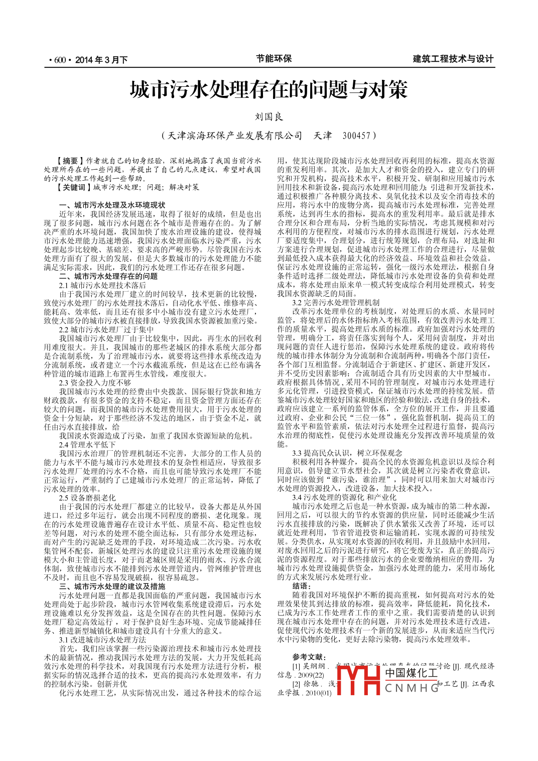 ●600●2014年3月下節(jié)能環(huán)保建筑工程技術(shù)與設計城市污水處理存在的問題與對策劉國良(天津濱海環(huán)保產(chǎn)業(yè)發(fā)展有限公司 天津300457 )[摘要]作者就自己的切身經(jīng)驗,深刻地揭露了我國當前污水用, 使其達現(xiàn)階段城市污水處理回收再利用的標準,提高水資源處理所存在的一些問題,并提出了自己的幾點建議,希望對我國的重發(fā)利用率。 其次,是加大人才和資金的投入,建立專門的研的污水處理工作起到一-些幫助。究和開發(fā)機構(gòu),提高技術(shù)水平,積極開發(fā)、研制和應用城市污水. [關(guān)鍵詞]城市污水處理;問題;解決對策.回用技術(shù)和新設備,提高污水處理和回用能力;引進和開發(fā)新技術(shù),.通過積極推廣各種膜分離技術(shù)、臭氧化技術(shù)以及安全消毒技術(shù)的一、城市污水處理及水環(huán)境現(xiàn)狀應用,將污水中的廢物分離,提高城市污水處理標準,完善處理近年來,我國經(jīng)濟發(fā)展迅速,取得了很好的成績,但是也出系統(tǒng),達到再生水的指標,提高水的重發(fā)利用率。最后就是排水現(xiàn)了很多問題,城市污水問題在各個城市是普遍存在的。為了解合理分區(qū)和合理布局,分析當?shù)氐膶嶋H情況,考慮其規(guī)模和對污決嚴重的水環(huán)境問題,我國加快了廢水治理設施的建設,使得城水利用的方便程度,對城市污水的排水范圍進行規(guī)劃,污水處理市污水處理能力迅速增強,我國污水處理面臨水污染嚴重,污水廠要適度集中,合理劃分,進行統(tǒng)籌規(guī)劃,合理布局,對選址和處理起步比較晚、基礎差、要求高的嚴峻形勢。盡管我國在污水方案進行合理規(guī)劃,促進城市污水處理工作的合理進行,盡量做處理方面有了很大的發(fā)展,但是大多數(shù)城市的污水處理能力不能到最低投入成本獲得最大化的經(jīng)濟效益、環(huán)境效益和社會效益。滿足實際需求,因此,我們的污水處理工作還存在很多問題。保證污水處理設施的正常運轉(zhuǎn),強化一級污水處理法,根據(jù)自身三、城市條件適時選擇二級處理法,降低城市污水處理設備的負荷和處理二城市污水處理存在的問題成本,將水處理由原來單一- 模式轉(zhuǎn)變成綜合利用處理模式,轉(zhuǎn)變2.1城市污水處理技術(shù)落后由于我國污水處理廠建立的時間較早,技術(shù)更新的比較慢,我國水資源缺乏的局面。致使污水處理廠的污水處理技術(shù)落后,自動化水平低、維修率高、機制能耗高、效率低,而且還有很多中小城市沒有建立污水處理廠,改革污水處理單位的考核制度,處理后的水質(zhì)、水量同時致使大部分的城市污水被直接排放,導致我國水資源被加重污染。監(jiān)管,將處理后的水體指標納入考核范圍,有效改善污水處理工作的質(zhì)量水平,提高處理后水質(zhì)的標準。政府加強對污水處理的我國城市污水處理廠由于比較集中,因此,再生水的回收利管理, 明確分工,將責任落實到每個人,采用問責制度,并對出用難度很大。并且,我國城市的那些老城區(qū)的排水系統(tǒng)大部分都現(xiàn)問題的責任人進行懲治,保障污水處理系統(tǒng)的建設。政府將傳是合流制系統(tǒng),為了治理城市污水,就要將這些排水系統(tǒng)改造為統(tǒng)的城 市排水體制分為分流制和合流制兩種,明確各個部廣]責任,分流制系統(tǒng),或者建立一個污水截流系統(tǒng),但是這在已經(jīng)布滿各各 個部門互相監(jiān)督。分流制適合于新建區(qū)、擴建區(qū)、新建開發(fā)區(qū),種管道的城市道路上布置再生水管線,難度很大。并不受歷史因素影響;合流制適合具有歷史因素的大中型城市。2.3資金投入力度不夠政府根據(jù)具體情況,采用不同的管理制度,對城市污水處理進行我國城市污水處理的經(jīng)費由中央撥款、國際銀行貸款和地方多 元化管理,引進投資模式,保證城市污水處理的持續(xù)發(fā)展。借財政撥款,有很多資金的支持不穩(wěn)定,而且資金管理方面還存在鑒 城市污水處理較好國家和地區(qū)的經(jīng)驗和做法,改進自身的技術(shù),較大的問題,而我國的城市污水處理費用很大,用于污水處理的政府應該建 立一系列的監(jiān)管體系,全方位的展開工作,并且要通資金十分短缺,對于那些經(jīng)濟不發(fā)達的地區(qū),由于資金不足,就過政府、 企業(yè)和公民“三位一體”強化監(jiān)督機制,提高員工的任由污水直接排放,給監(jiān)管水平和監(jiān)管素質(zhì),依法對污水處理全過程進行監(jiān)督,提高污.我國淡水資源造成了污染,加重了我國水資源短缺的危機。水治理的徹底性,促使污水處理設施充分發(fā)揮改善環(huán)境質(zhì)量的效2.4 管理水平低下我國污水治理廠的管理機制還不完善,大部分的工作人員的3.3提高民眾認識,樹立環(huán)保觀念能力與水平不能與城市污水處理技術(shù)的復雜性相適應,導致很多積極利用各種媒介,提高全民的水資源危機意識以及綜合利污水處理廠處理的污水不合格,而且也可能導致污水處理廠不能用意識, 倡導建立節(jié)水型社會,其次就是樹立污染者收費意識,正常運行,嚴重制約了已建城市污水處理廠的正常運轉(zhuǎn),降低了同時應該做到“誰污染,誰治理”,同時可以用來加大對城市污污水處理的效率。水處理的資源投入,改進設備,加大技術(shù)投入。2.5設備