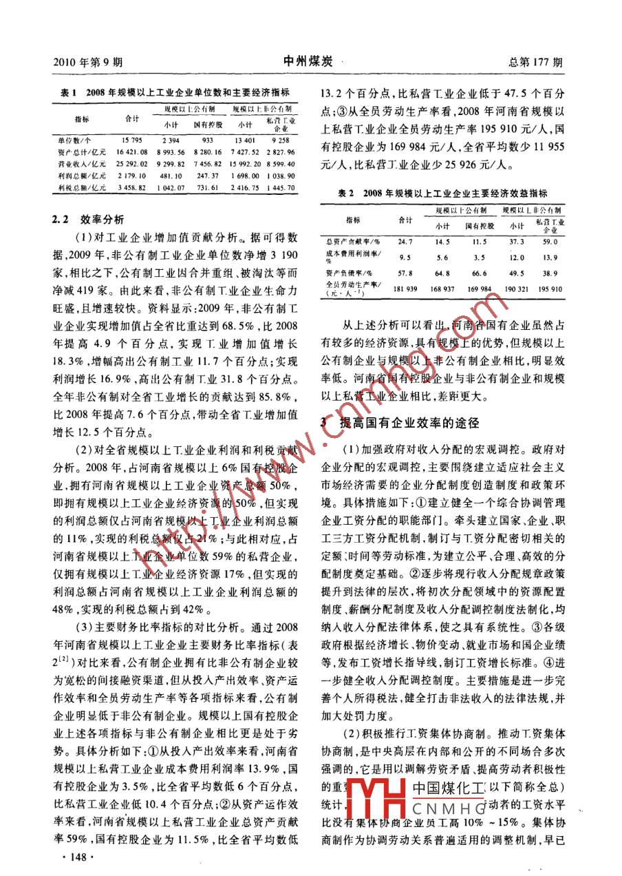 2010年第9期中州煤炭總第177期河南省國有企業(yè)效率分析鄭新成(河南工程學院,河南新鄭451191)摘要:改革開放以來,雖然河南工業(yè)經濟實力顯著增強。但作為河南省工業(yè)發(fā)展的微觀基礎一國有企 業(yè)和非公有制工業(yè)企業(yè),在效率上存在顯著差異。通過對國有企業(yè)和非公有制工業(yè)企業(yè)財務指標的對比分析,從分配效率的角度探索了提高河南省國有企業(yè)效率的途徑。關鍵詞:河南省;國有企業(yè);非公有制企業(yè);分配效率中圈分類號:F275文獻標識碼:B文章編號:1003 - 0506(2010)09 -0147 -03造的利潤分別只相當于廣東省、山東省、江蘇省的1河南工業(yè) 概況62. 9% ,57. 3% ,70.2% ,河南省工業(yè)發(fā)展效率依然河南既是傳統的農業(yè)大省和人口大省,又是新低下。興的經濟大省和工業(yè)大省。改革開放以來;河南省總之,改革開放以來,河南T.業(yè)實現了快速的增工業(yè)經濟持續(xù)快速發(fā)展,工業(yè)經濟實力顯著增強。長。但工業(yè)經濟總體結構不合理、發(fā)展方式粗放等截至2008年,全省全部工業(yè)增加值達到9546.08問題制約著工業(yè)企業(yè)的效率。與此同時,不同所有億元,全部工業(yè)增加值占全省GDP的比重首次超過制工業(yè)企業(yè)之間,效率也存在顯著的差距。有關數50% ,達到51. 9%,比2007年提高1.9個百分點,比據顯示,公有制工業(yè)企業(yè)反映企業(yè)效率的指標,如盈2003年提高10.0個百分點;工業(yè)增長對全省經濟利能力、資產運作效率、全員勞動生產率等,明顯低.增長的貢獻率達到65. 3% ,比上年提高0.3個百分于非公有制企業(yè)的相關指標,說明公有制工業(yè)企業(yè)點,帶動全省GDP增長7.9個百分點。2009年,在.的整體效率低于非公有制工業(yè)企業(yè),一定程度上也.金融危機對全省實體經濟沖擊下,全省工業(yè)增加值影響到河南工業(yè)經濟的健康發(fā)展。仍達9 858.40億元,比2008年增長11.4%。其中2近年來不同所有制企業(yè)財務指標對比規(guī)模以上工業(yè)增長14.6% ,增幅居全國第14位,全.部工業(yè)經濟總量和規(guī)模以上工業(yè)總量繼續(xù)位居全國改革開放以來,河南省工業(yè)經濟平均以每年各省市區(qū)第五、中西部省份第一川。13. 3%的速度持續(xù)發(fā)展。但經濟發(fā)展中,工業(yè)企業(yè)應該看到,河南省工業(yè)經濟的快速增長,主要依.規(guī)模過小、產業(yè)集中度不高,特別是國有工業(yè)企業(yè)與賴于生產要素的高投人和資源能源的高消耗,經濟其他所有制企業(yè)相比,效率低下問題依然突出。結構過于偏重資源、原材料工業(yè)?,F有工業(yè)結構仍2.1規(guī)模分析以勞動密集型和初加工產品為主,重工業(yè)中采掘業(yè)、河南省不同所有制工業(yè)企業(yè)相比而言,由于私.原材料T.業(yè)所占比重達60%以上,輕工業(yè)中以農產營經濟和外商經濟發(fā)展滯后,國有企業(yè)仍具有較大品為原料的加T業(yè)所占比重近80%。結構不合理、的規(guī)模優(yōu)勢。以2008年為例,規(guī)模以上國有控股單發(fā)展方式粗放等仍是河南省經濟發(fā)展的典型特征。位數933家,占河南省規(guī)模以上工業(yè)企業(yè)單位數數據顯示,2007年,盡管河南CDP已經達到1.5萬6%,擁有資產總額占到近50%,營業(yè)收人占到近億元,穩(wěn)居全國第5位,但規(guī)模以上的工業(yè)企業(yè)所創(chuàng)30% ;同期規(guī)模以,上私營工業(yè)企業(yè)單位數9258家,占河南省柳植1上τ山企業(yè)單位數近59% ,擁有資收稿日期: 2010-08-13中國煤化工近34<%2。2008 .基金項目:河南省政府決策研究招標課題(項日編號:B407)年河HCN M H G和主要經濟總量作者簡介:鄭新成(1964-),男,河南郵陵人,剮教授,1987年畢業(yè)指標見表1。于蘭州大學,主要從事管理和會計實務研究工作。147●2010年第9期中州煤炭總第177期表12008年規(guī)模以上工業(yè)企業(yè)單位數和主要經濟指標13.2個百分點,比私營工業(yè)企業(yè)低于47.5個百分規(guī)模以上公有制規(guī)模以上非公有制點;③從全員勞動生產率看,2008年河南省規(guī)模以指標合計小計國有控股小計 在 設工業(yè)上私營T.業(yè)企業(yè)全員勞動生產率195 910元/人,國單位數/個15 795239413 401 9 258資產總計/億元16421.08 8993.56 8280.16 7427.52 2827.96有控股企業(yè)為169 984元/人,全省平均數少11 955營業(yè)收入/化元25292.02 9299.82 7456.82 15992.20 8599.40元/人,比私營工業(yè)企業(yè)少25 926元/人。利潤總額/億元2179.10 481.10 247.37 1698.00 1038. 90利稅總額/化元3458.82 1 042.07 731.61 2416.75 1 445.70表22008年規(guī)模以上工業(yè)企業(yè)主要經濟效益指標規(guī)模以十公有制規(guī)模以工非公布制2.2效率分 析揩標聞有挖股小計 私營工業(yè)(1)對工業(yè)企業(yè)增加值貢獻分析。據可得數總資產亦獻率/% 2414.511.5據,2009年,非公有制工業(yè)企業(yè)單位數凈增3 190成本費用利潤率/ 9.5..512.013.9家,相比之下,公有制工業(yè)因合并重組、被淘汰等而費產負債卑/%49.538.9凈減419家。由此來看,非公有制T.業(yè)企業(yè)生命力全員勞動生產率/181 939168937 169 984190321 195 910旺盛,且增速較快。資料顯示:2009年,非公有制工業(yè)企業(yè)實現增加值占全省比重達到68.5%,比2008從上述分析可以看出,河南省國有企業(yè)雖然占年提高4.9個百分點,實現工業(yè)增加值增長有較多的經濟資源,具有規(guī)模上的優(yōu)勢,但規(guī)模以上18.3% ,
