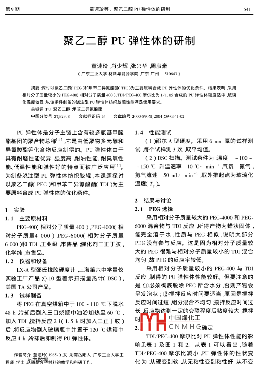 第9期董速玲等,聚乙二醇PU彈性體的研制41聚乙二醇PU彈性體的研制童速玲肖少輝張興華周彥豪廣東工業(yè)大學(xué)材料與能源學(xué)院廣東廣州510643)摘要探討以聚乙二釀PEG)和甲苯二異氰酸瞰(T)為主要原料合成PU彈性體的優(yōu)化條件。結(jié)果表明采用相對分子質(zhì)量較小的PEG40α相對分子質(zhì)量400)TDl/PEG400摩爾比為1/1.05合成的PU彈性體硬度適中玻璃化溫度較低以該條件制備的澆注型PU彈性體紡織膠輥性能滿足使用要求。關(guān)鍵詞PU聚乙二醇呷苯二異氰酸酯中圖分類號TQ323.8伏標(biāo)識碼#文章編號1000890X(2004)940541402PU彈性體是分子主鏈上含有較多氨基甲酸1.4性能測試酯基團(tuán)的聚合物總稱,它是由低聚物多元醇和(1)邵爾A型硬度。采用6mm厚的試樣測異氰酸酯等化合物反應(yīng)制得的。PU彈性體由于試每個試樣測3次取平均值。具有耐曆性能優(yōu)異強(qiáng)度高耐油性能、耐臭氧性(2)DSC掃描。測試條件為溫度-100能、低溫性能和彈性好的特點(diǎn)而被廣泛應(yīng)用2。+150℃升溫速率10℃min氣氛氮?dú)鉃橹苽錆沧⑿蚉U彈性體紡織膠輥本課題探討氮?dú)饬魉?0mL·minˉ取外推起點(diǎn)為玻璃化以聚乙二醇PEG)和甲苯二異氰酸酯(TD)為主溫T要原料合成PU彈性體的優(yōu)化條件。2結(jié)果與討論1實(shí)驗(yàn)2.1PEG選擇1.1主要原材料采用相對分子質(zhì)量較大的PEG4000和PEG-PEG40X相對分子質(zhì)量400)PEG400(相6000混合物與TD反應(yīng)所得產(chǎn)物為蠟狀固體對分子質(zhì)量4000),PEG-6000(相對分子質(zhì)量能完全溶于水性質(zhì)與PEG相似,說明大部分6000和TD工業(yè)級,市售品催化劑三正丁胺,PEG沒有參與反應(yīng)。這是因?yàn)橄鄬Ψ肿淤|(zhì)量較化學(xué)純市售品。大的PEG很難與相對分子質(zhì)量較小的TD混合1.2儀器和設(shè)備均勻故PEG的反應(yīng)率較低。LX-A型邵氏橡膠硬度計(jì)上海第六中學(xué)量儀采用相對分子質(zhì)量較小的PEG400與TDI實(shí)驗(yàn)工廠產(chǎn)品Q-10型差示掃描量熱計(jì)(DC),反應(yīng)制得的PU彈性體性能較好。但要注意的美國TA公司產(chǎn)品是①必須徹底脫除PEG所含水分,否則產(chǎn)物會1.3試樣制備呈發(fā)泡狀;②攪拌反應(yīng)時間要適當(dāng)原因是攪拌將PEG在真空烘箱中于100~110℃下脫水反應(yīng)時間過短組分混合不均勻攪拌反應(yīng)時間過48h冷卻后倒入三口燒瓶中油浴加熱至60℃,長反應(yīng)物達(dá)到一定的交聯(lián)程度后粘度較大攪拌加入TDⅠ攪拌反應(yīng)2K1.5h時加入三正丁胺)中國煤化工后將反應(yīng)物倒入玻璃瓶中并置于120℃烘箱中CNMHG確定反應(yīng)4h冷卻后即制得PU彈性體。TDI/PEG400摩爾比對PU彈性體性能的影響見表1及圖1和2。從表1可以看出,隨著作者簡介童速套(195)女湖南岳陽人廣東工業(yè)大學(xué)工 TDI/ PEG400摩爾比減小,PU彈性體的性狀變程師學(xué)士蒂材料的教學(xué)和科研工作?;癁閺挠沧兊杰洀臒o粘性變到粘性好從不變542橡膠工業(yè)2004年第51卷表1 TDL PEG-400摩爾比對PU彈性體性狀的影響TDLPEG400摩爾比PU彈性體性狀1/0.9硬、無彈性、無粘性、不變形硬、無彈性、無粘性、不變形硬、稍有彈性、無粘性、不變形1/1. 0較硬、有彈性、無粘性、不易變形較軟、有彈性和粘性、較易變形l/1.15軟、彈性差、粘性好、易變形1/091/0.951/11/1.051/1,11/115TDE/PEG-400摩爾比圖2 TDIPEG-400摩爾比對PU彈性體硬度的影響比小于1/1.1時PU彈性體的硬度過低很難保袋持形狀 TDLPEG400摩爾比大于1/0.95時PU彈性體的硬度過高而無彈性這是由于PEG400過度反應(yīng)或過量的TD發(fā)生副反應(yīng)造成的。綜合考慮,確定TD/PEG-400摩爾比為1/1.05圖1PU彈性體的DSC曲線TDL/PEG400摩爾比a-1/—1/1.1053結(jié)語c-1/1.1-1/1.15采用PEG和TDI為主要原料合成PU彈性體形變到易變形從無彈性變到有彈性再變到彈的優(yōu)化條件為PEG采用相對分子質(zhì)量較小的性差。PEG400 TDI PEG400摩爾比為1/1.05。利用從圖1可以看出A種TD/PEG400摩爾比該條件制備的澆注型PU彈性體紡織膠輥性能較的PU彈性體在溫度低于0℃時都有一個明顯的好可滿足使用要求。玻璃化轉(zhuǎn)變, TDI PEG400摩爾比越小,PU彈性體的T越低。原因是,與分子運(yùn)動能力有關(guān),參考文獻(xiàn)TDI含量越小彈性體分子的交聯(lián)程度越低運(yùn)動[1]周菊興.合成樹脂與塑料工藝M]北京北學(xué)工業(yè)出版能力越強(qiáng)。社2000238從圖2可以看出隨著TD/PEG400摩爾比[2]王建軍史鐵鈞耐熱型聚氨酯彈性體的合成J1合成橡膠工業(yè)2001246)347-349減小PU彈性體的硬度降低 TDIPEG400摩爾收稿日期2004益陽橡塑機(jī)科技創(chuàng)新捷報頻傳益陽橡塑機(jī)公司歷來重視產(chǎn)品的開發(fā)和創(chuàng)中圖分類號TQ330.4+3文獻(xiàn)標(biāo)識碼〗新把國際橡膠輪胎業(yè)巨頭對設(shè)備的技術(shù)要求作益陽橡膠塑料機(jī)械集團(tuán)有限公司堅(jiān)持以人為為產(chǎn)品開發(fā)的起點(diǎn)除毎年招聘30余名大學(xué)生充本走科技興企之路今年6月份3個新產(chǎn)品試制實(shí)科研隊(duì)伍外對開發(fā)設(shè)計(jì)人員實(shí)行新產(chǎn)品項(xiàng)目成功均填補(bǔ)國內(nèi)空白有力地增強(qiáng)了企業(yè)的發(fā)展承包制后勁。節(jié)行效襟提成和技術(shù)創(chuàng)新重獎此舉極中國煤化工品的積極性企業(yè)也這3個新產(chǎn)品中,GK.5N是國內(nèi)首臺容量獲CNMHG年產(chǎn)品訂貨中新產(chǎn)品最小的密煉